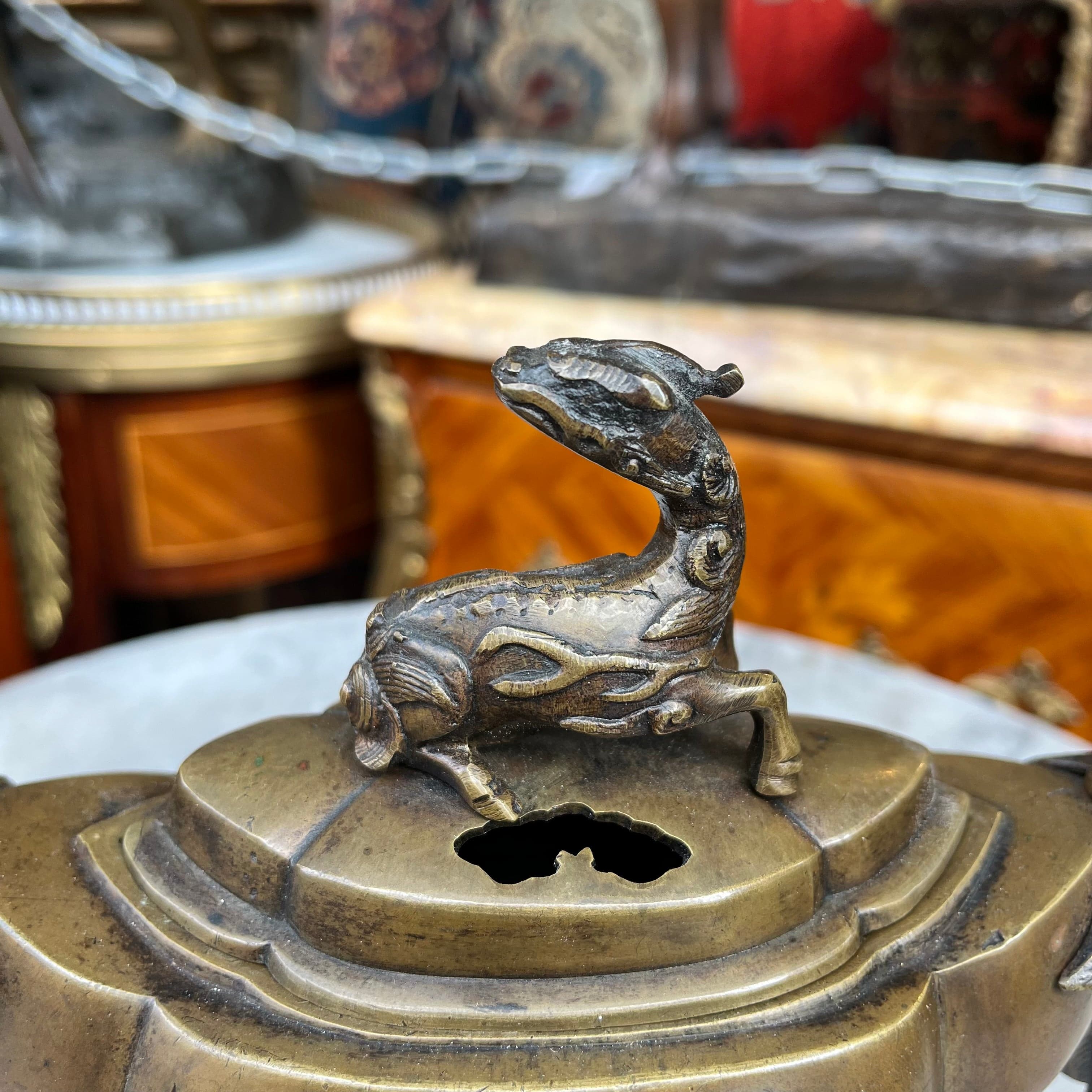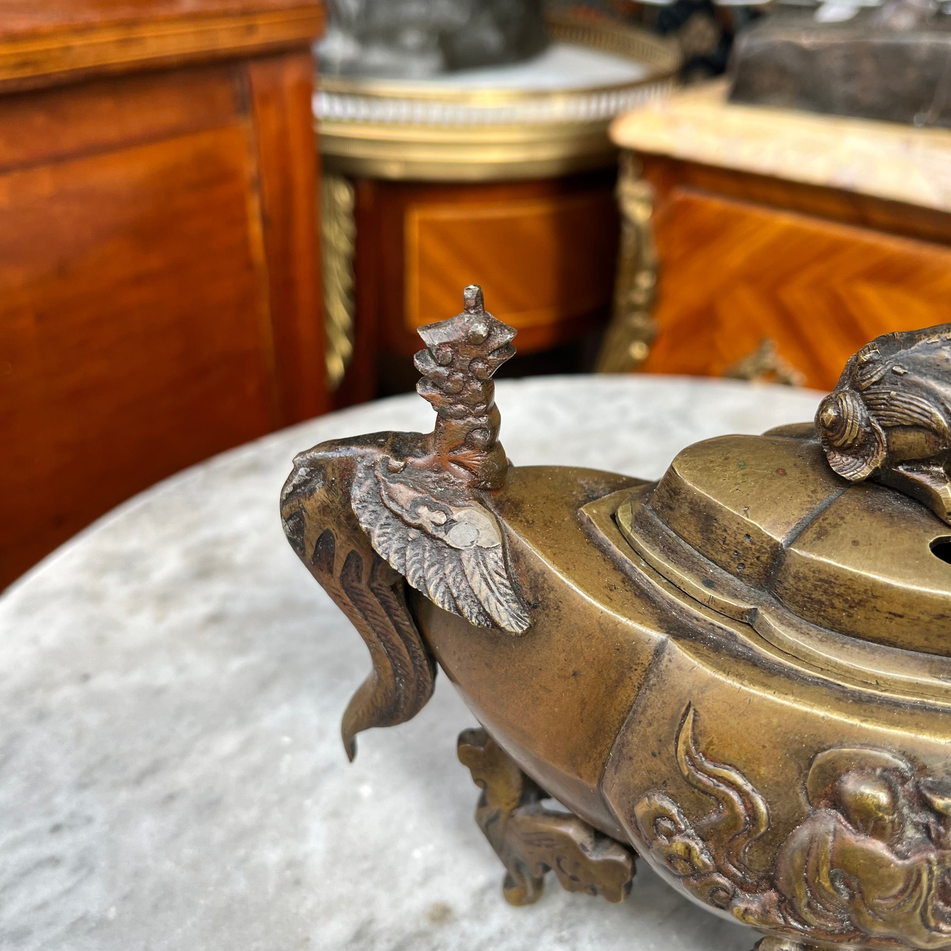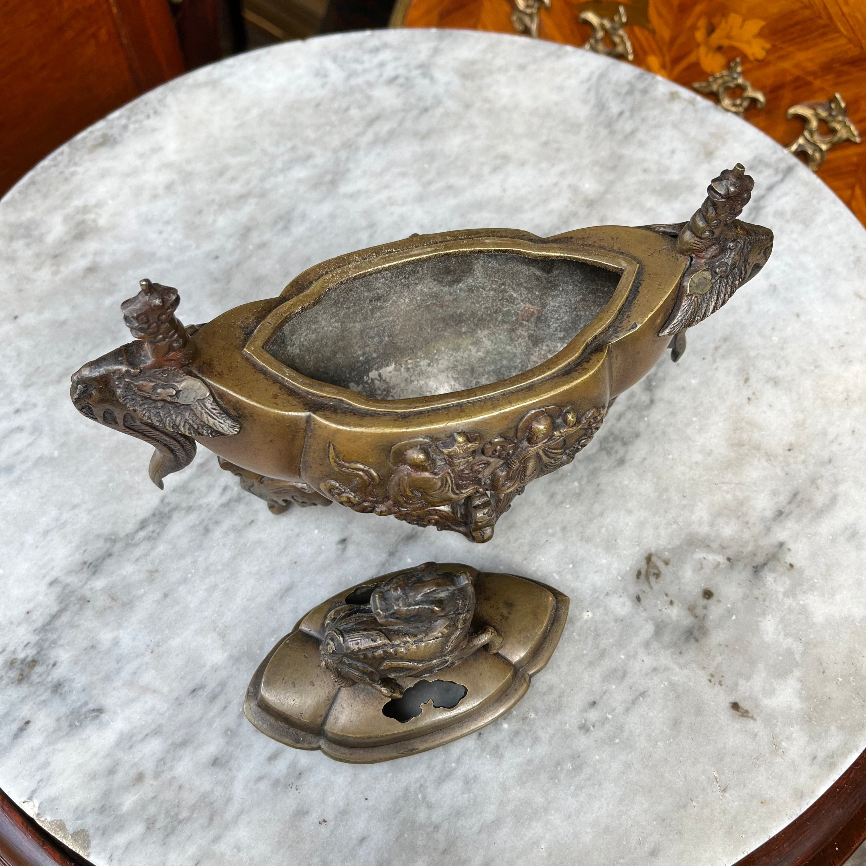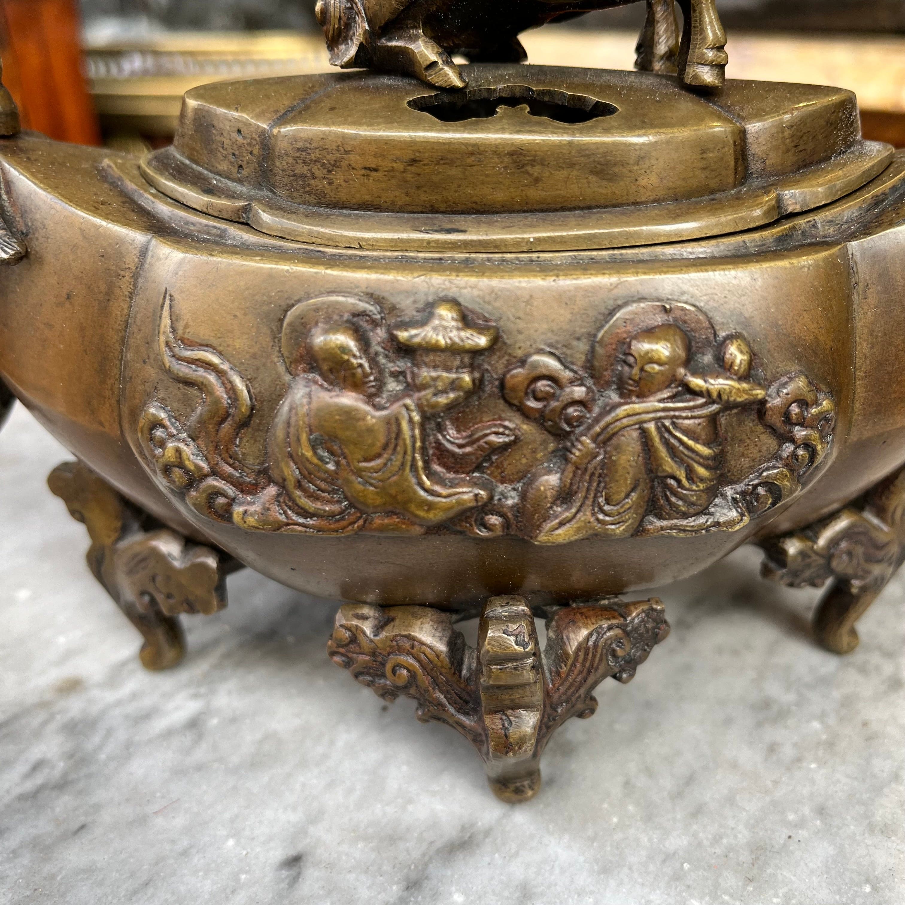 Sahumador de incienso en bronce de origen Japonés, con diseño de monjes y dragón en su tapa. Fines de s. XIX, estilo Meiji.