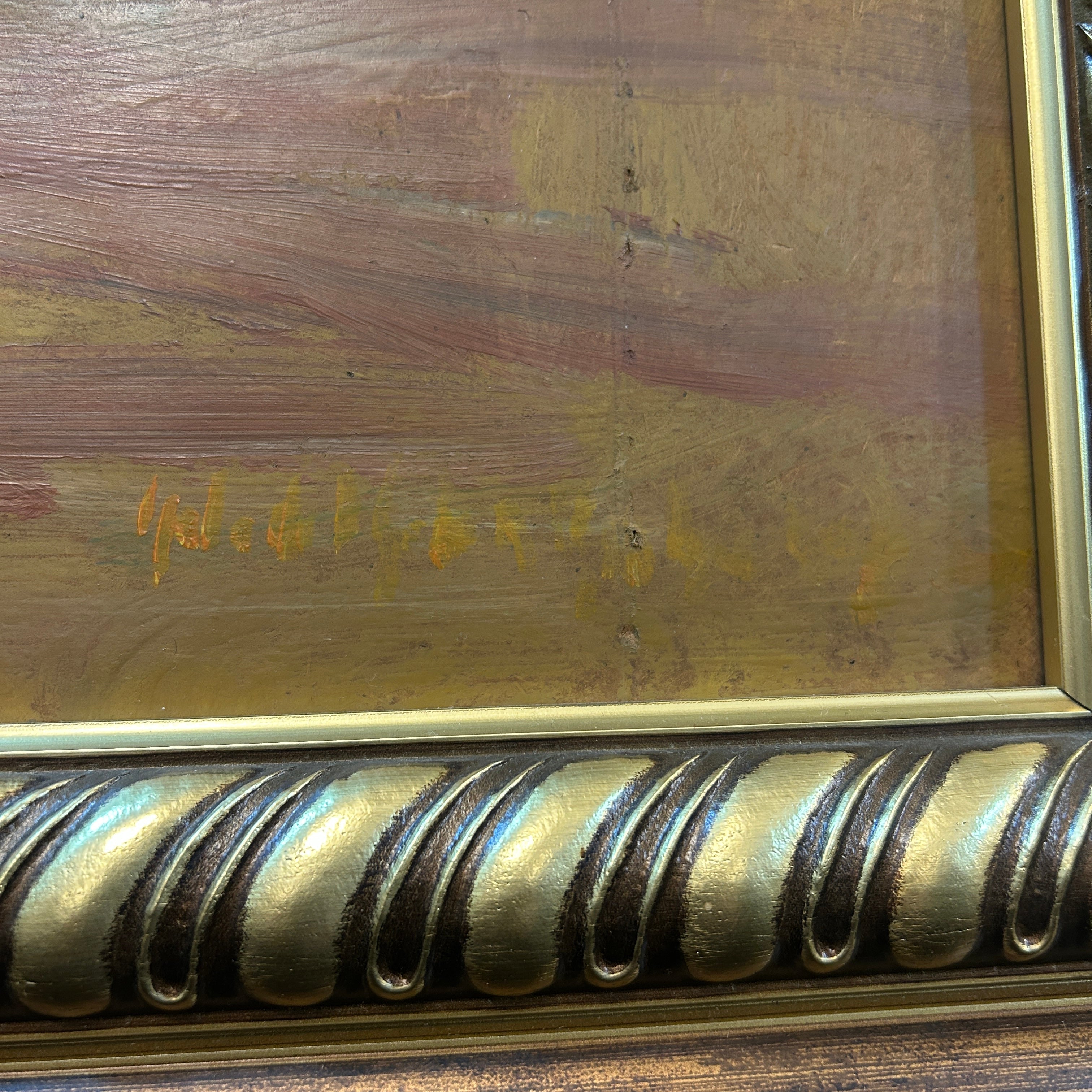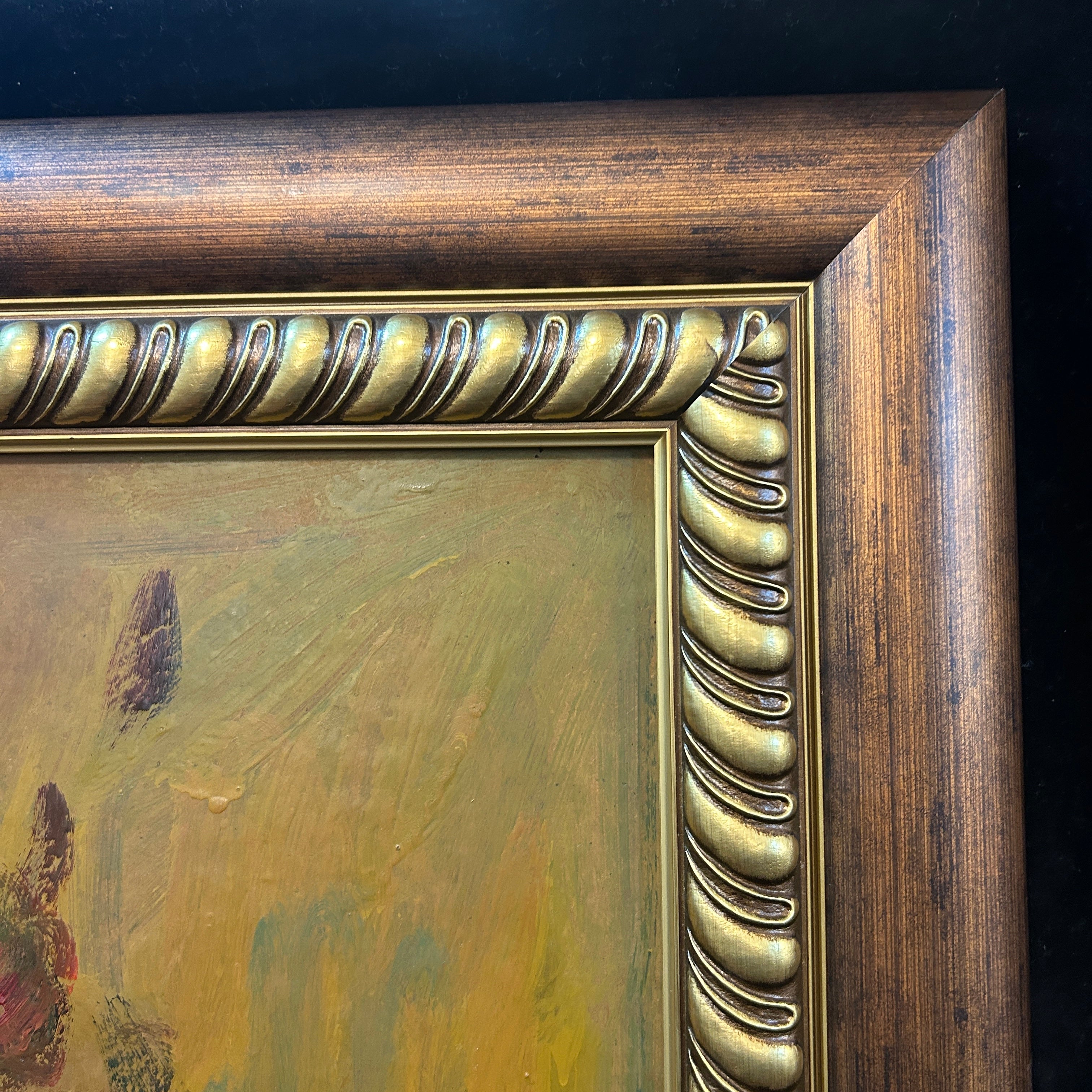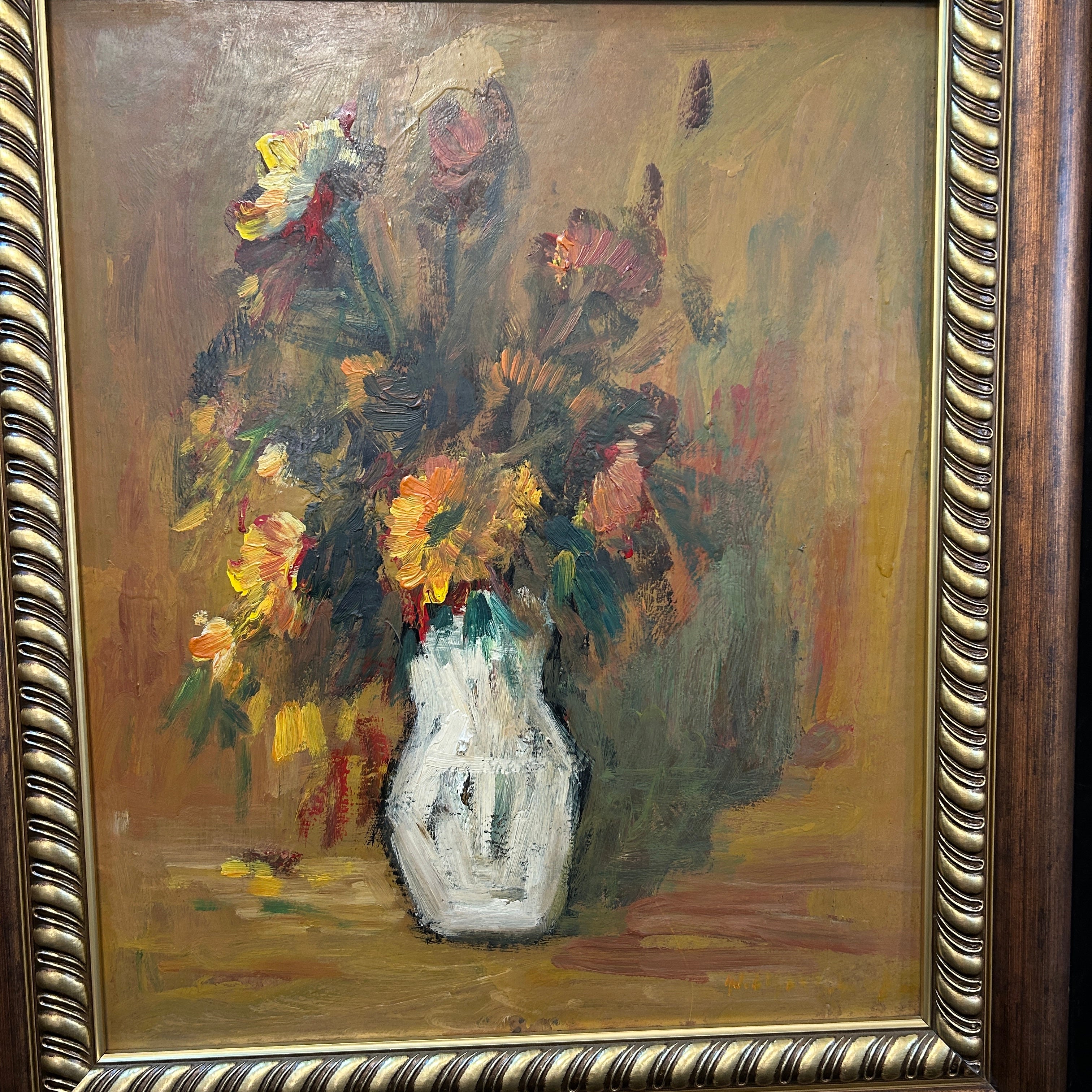Preciosa naturaleza muerta del talentoso pintos chileno Raúl Ulloa Burgos. La pintura nos entrega un jarrón blanco muy centrado con un buquet de flores multicolor rebalsándolo y algunos pétalos en el suelo. La pintura viene enmarcada con un marco sobrio de madera con una sutil decoración dorada que complementa perfectamente la composición.
