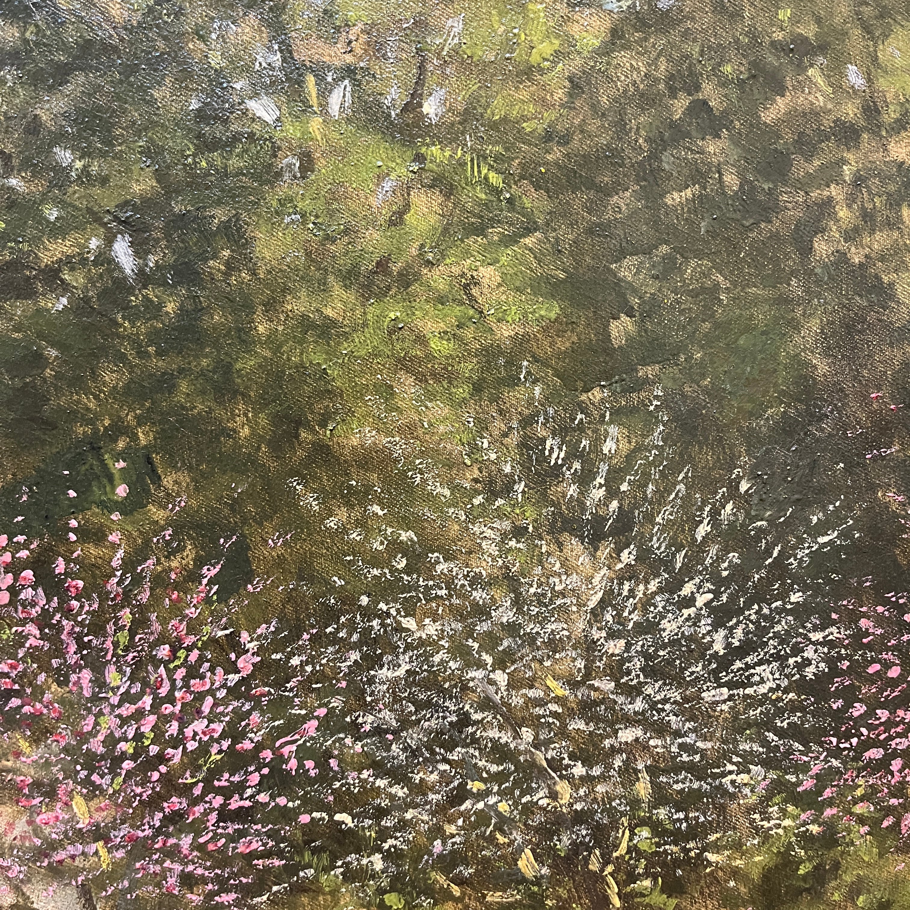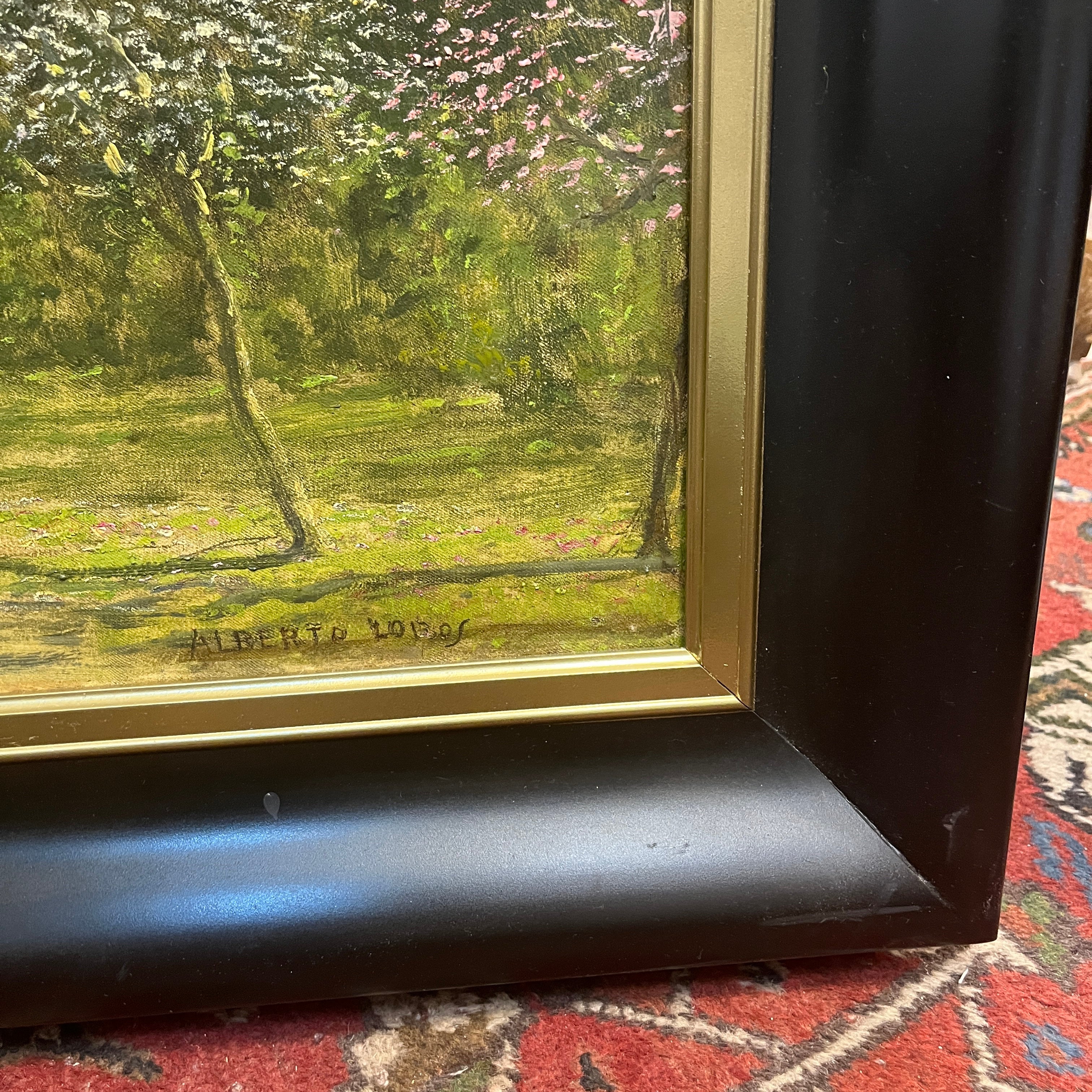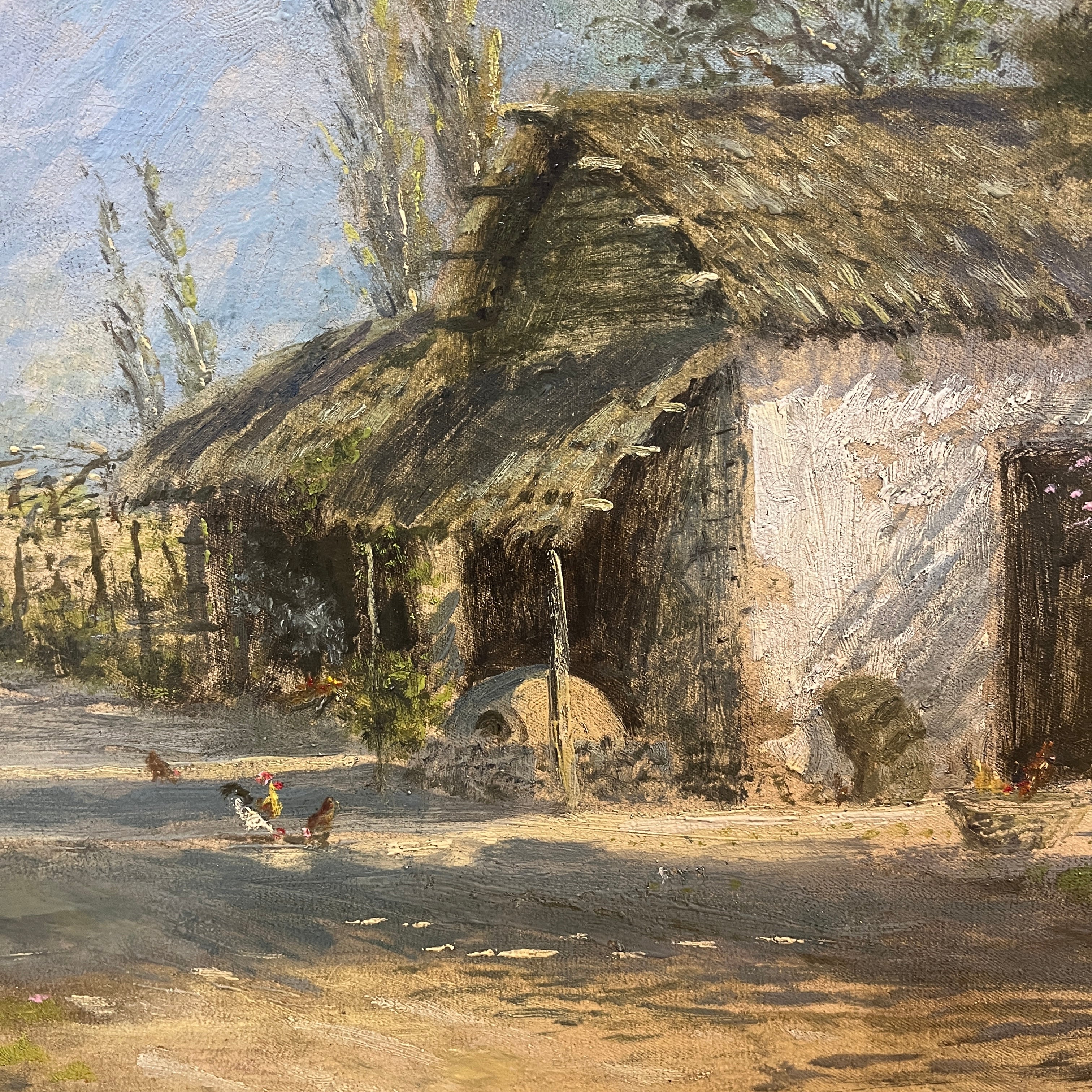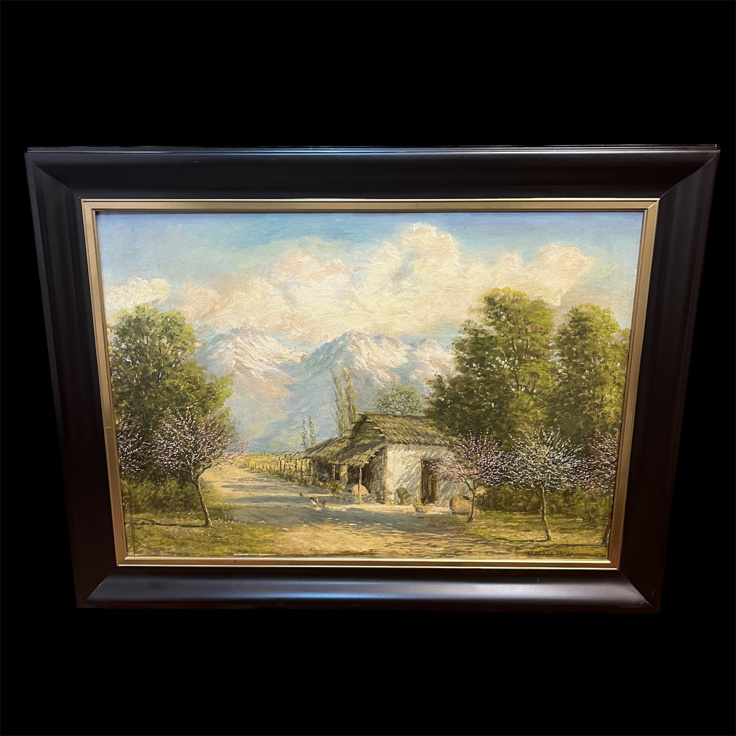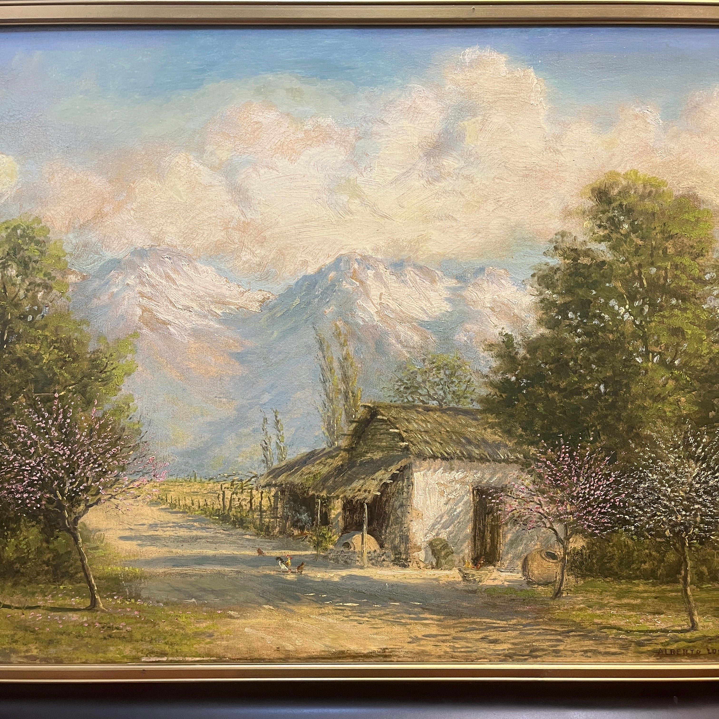 Oleo sobre tela del artista chileno Alberto Lobos, representando un paisaje rural anlos pies de la cordillera, en el que podelos ver un camino interior y la fachada de una casa de adobe, típica del campo chileno, con su techo de paja y alfareras en la entrada. El pintor llena de detalle y textura los árboles que la rodean, algunos ya florecidos y, mediante trazos sintéticos, representa unas pequeñas gallinas. De fondo la cordillera y el cielo con voluminosas nubes. La obra tiene un marco de madera lacada en negro, con cenefa interior dorada.