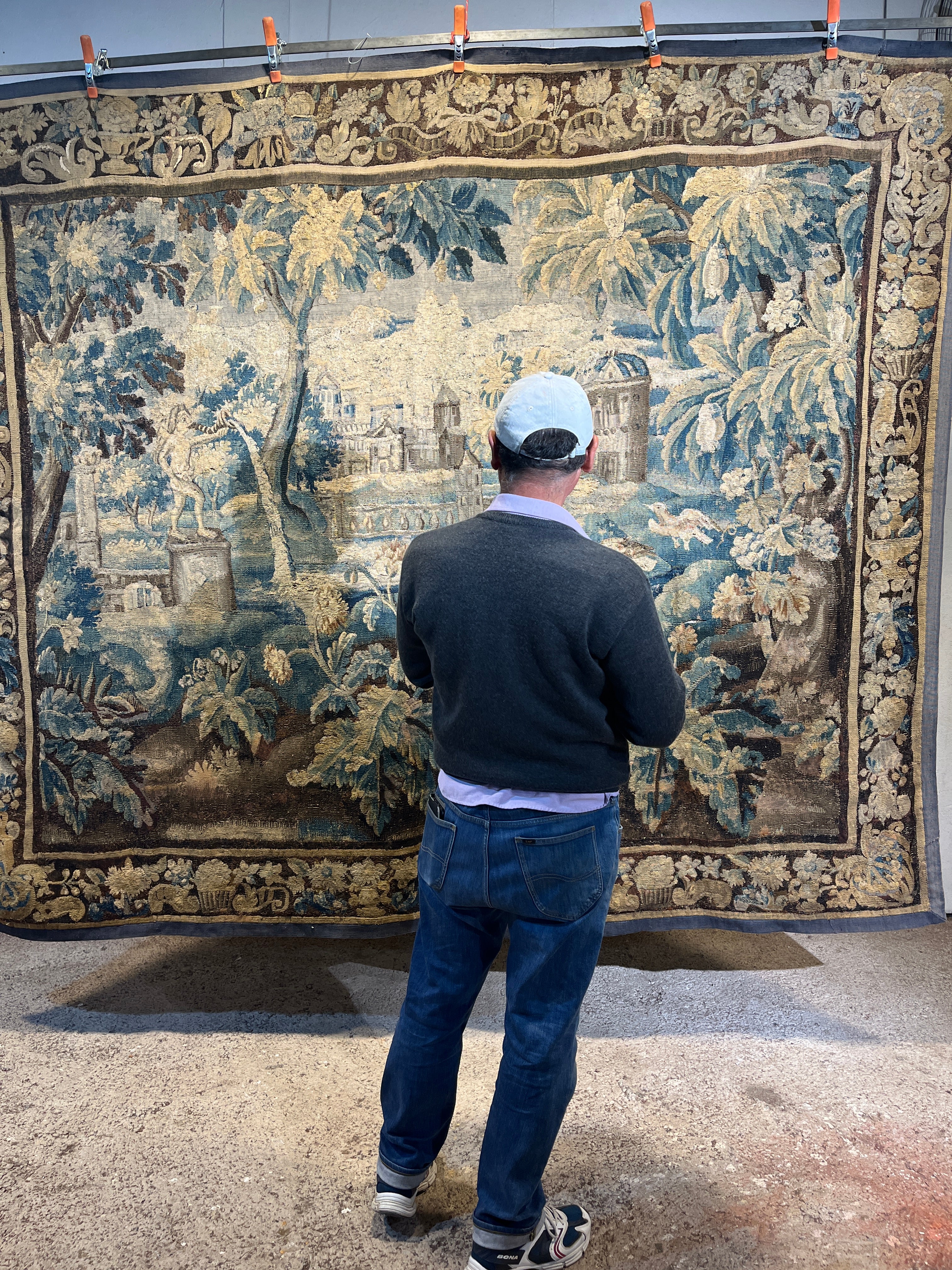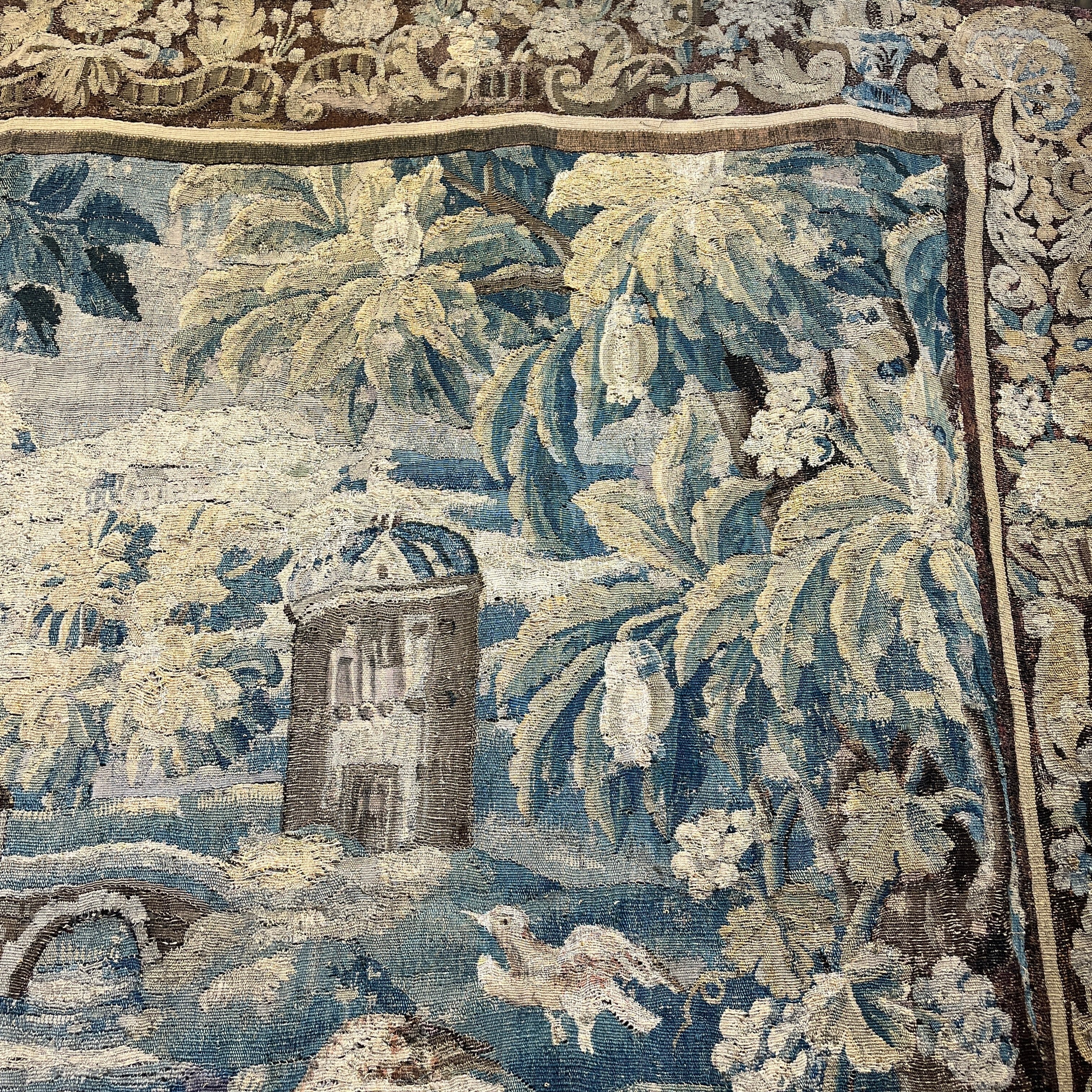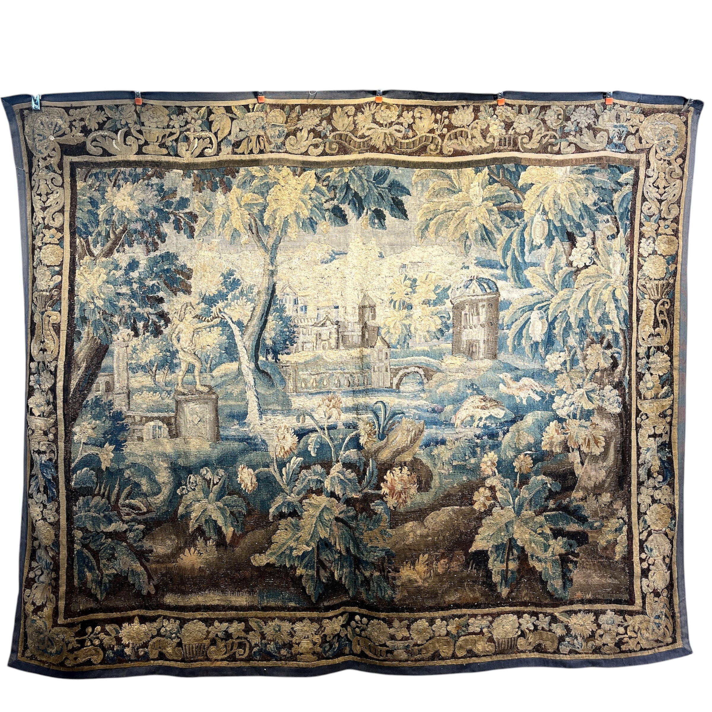 Espectacular tapicería francesa D'Aubbuson Verdure, de finales del siglo XVIII, tejida a mano en lana sobre algodón. La pieza tiene un precioso diseño representando un paisaje natural lleno de vegetación abundante, lo que le da la característica de Verdure. La composición nos sitúa dentro del frondoso follaje, con vista a un Chateau en el horizonte. El tipo de flora nos hace pensar que el paisaje no está en Francia, sino que en alguna de sus colonia, posiblemente el Caribe, dando cuenta de esta época de gran expansión para Francia. Su cenefa está decorada de un patrón con motivos florales.