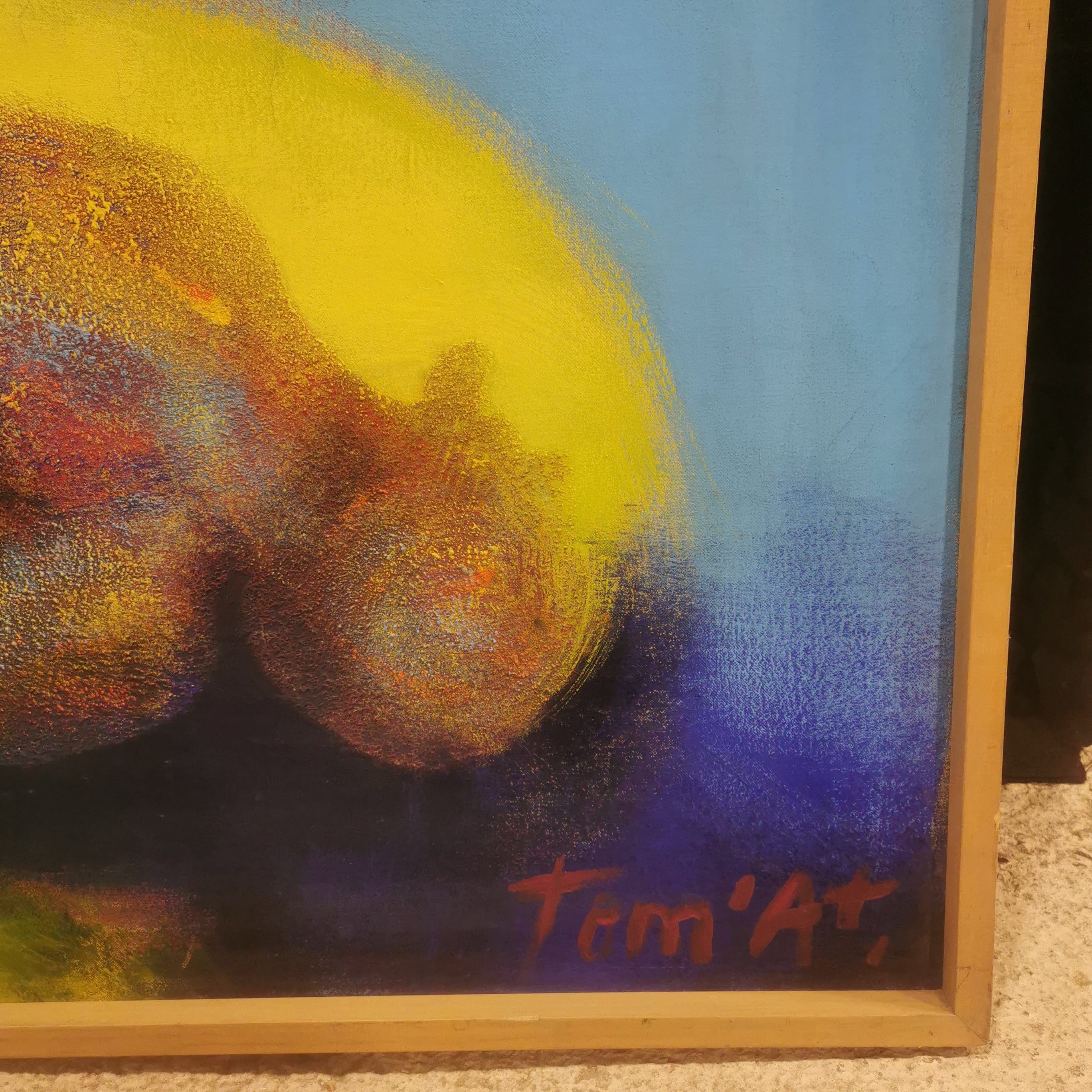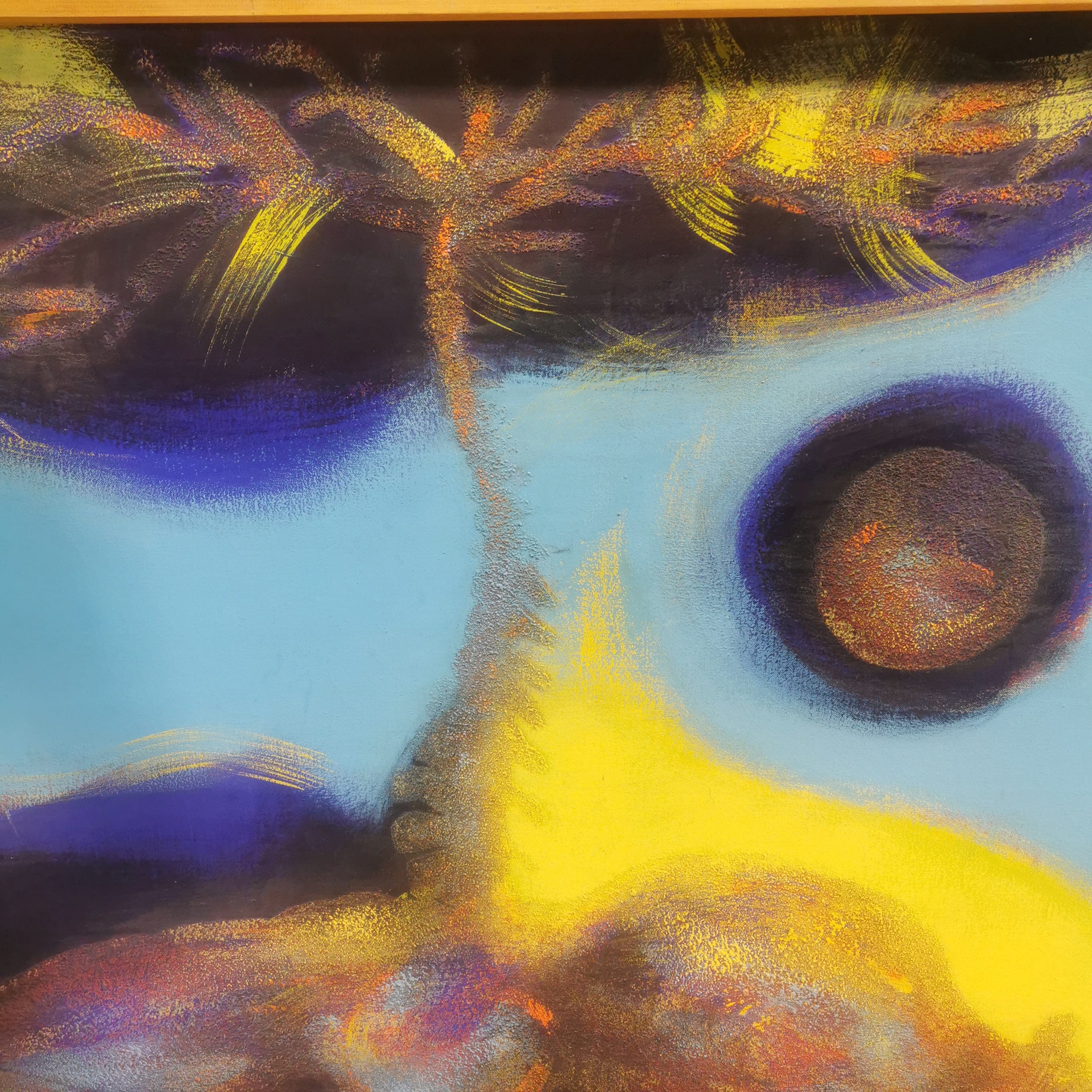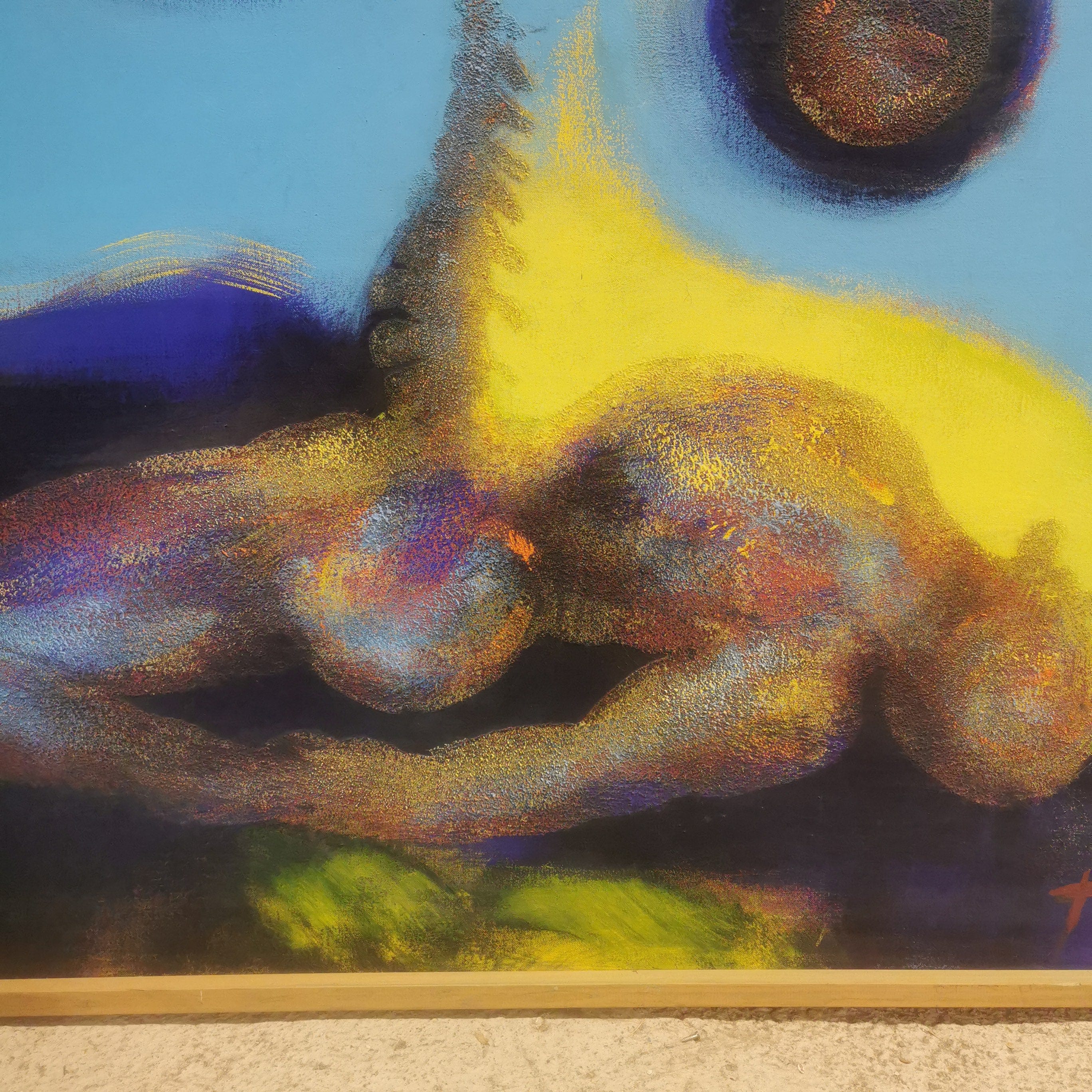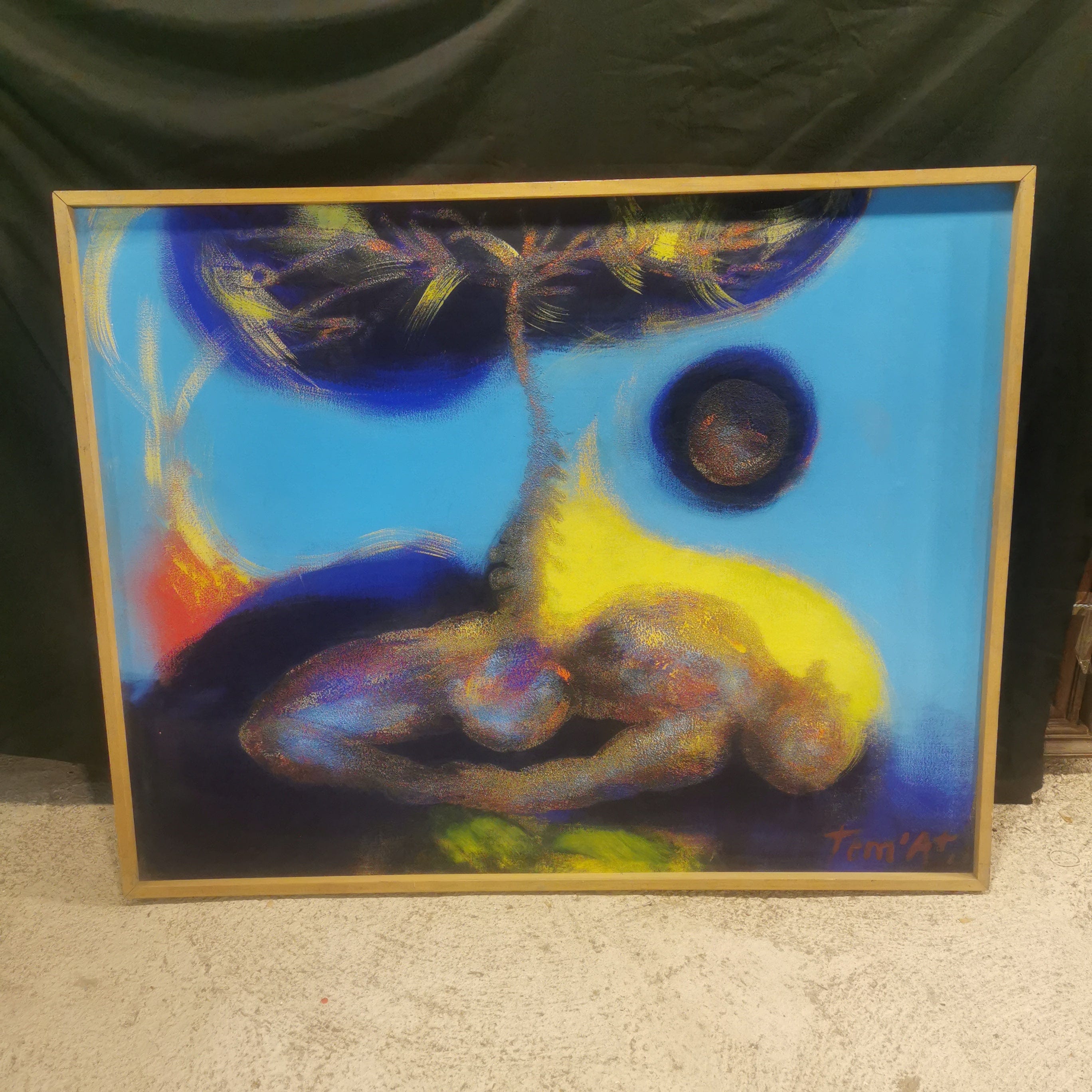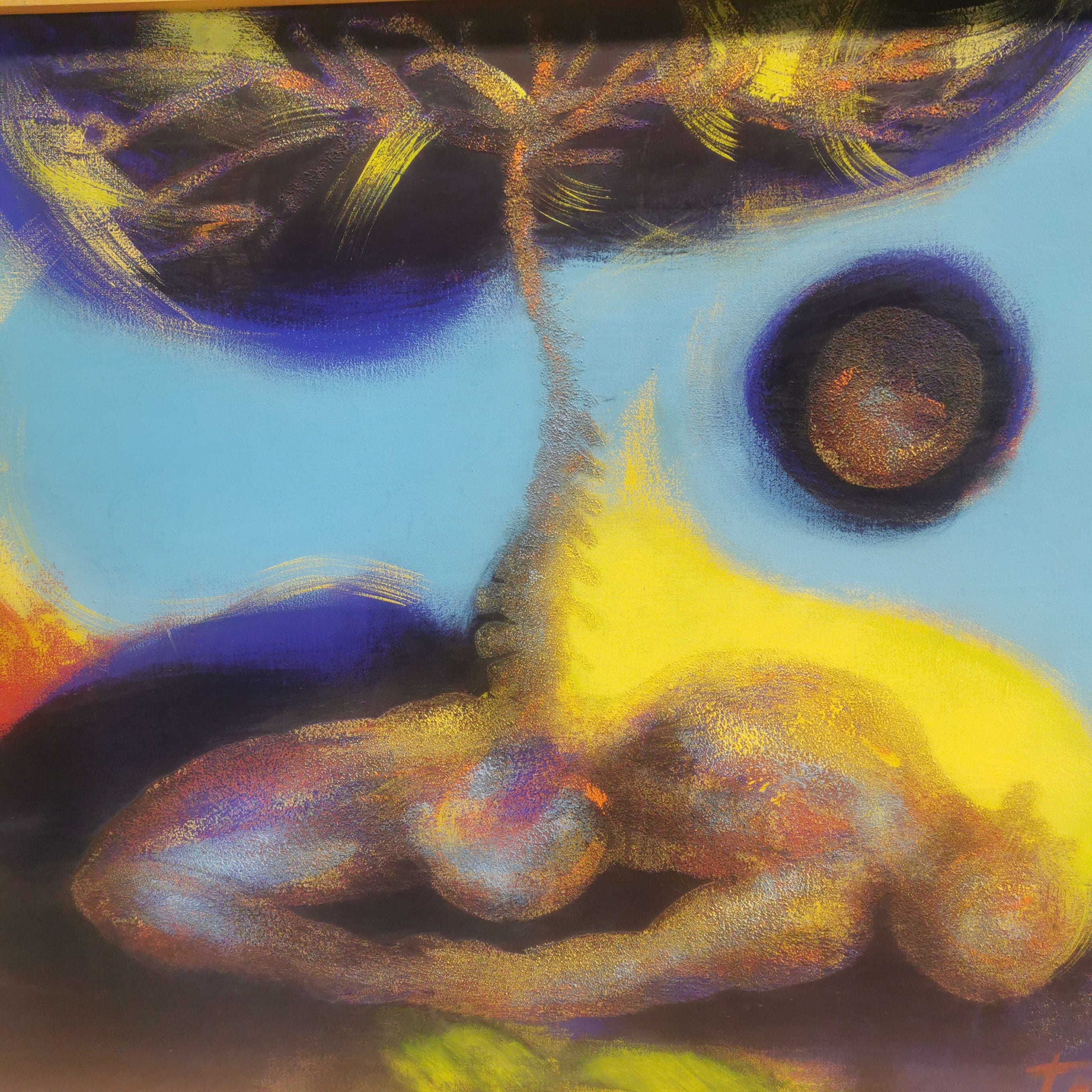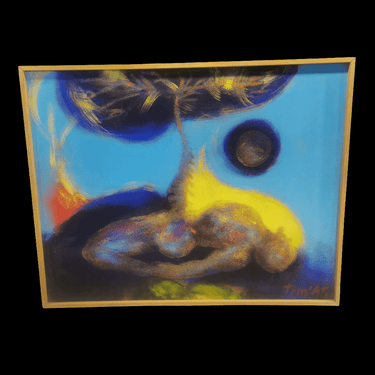 Imponente obra del artista chileno Tom Araya. La pintura se caracteriza por sus colores llamativos y las diferentes texturas que el pintor utilizó para llevar a cabo la obra. En ella se puede apreciar una mujer en el suelo y desde su vientre un árbol creciendo hacía el cielo. La obra está enmarcada con un sencillo marco de madera.