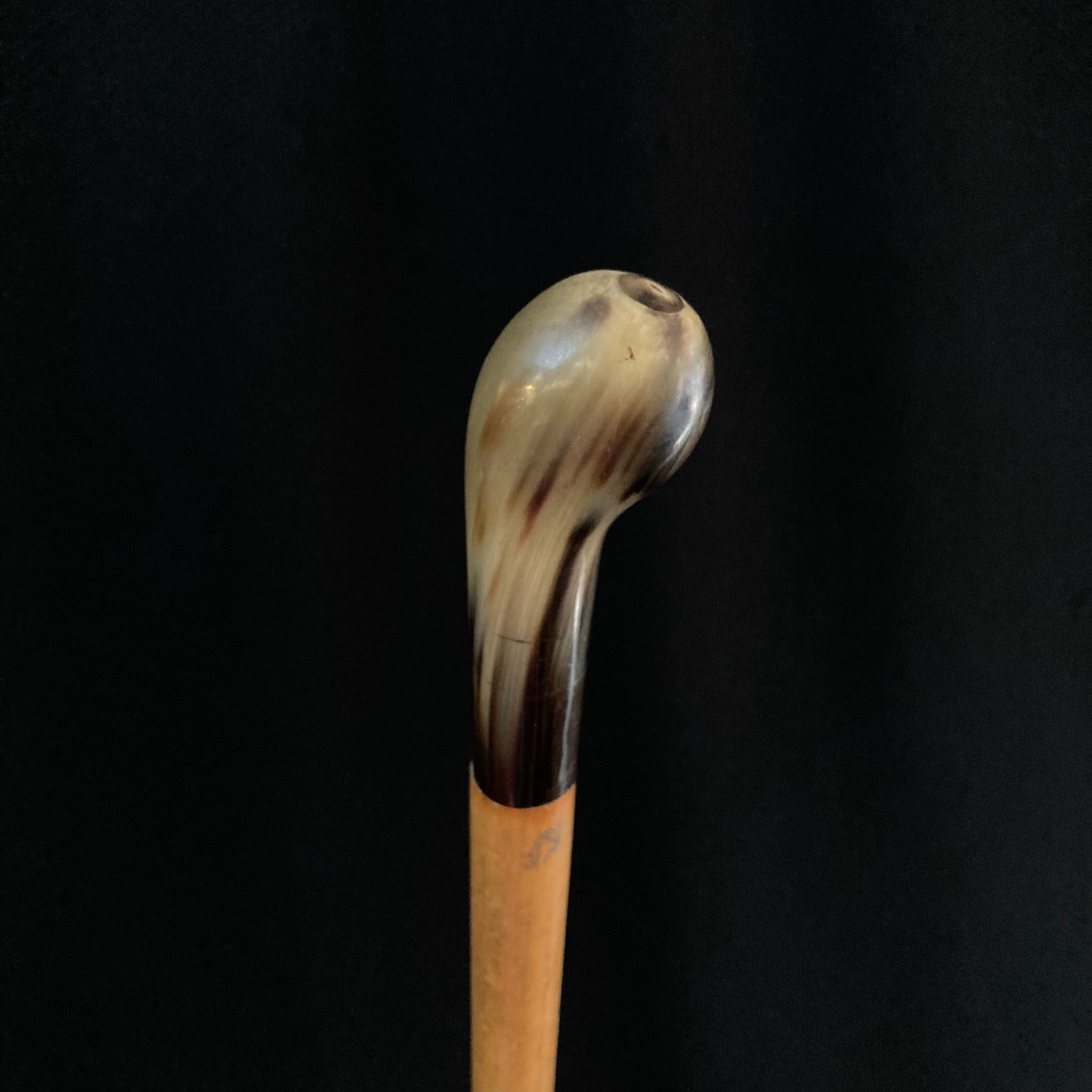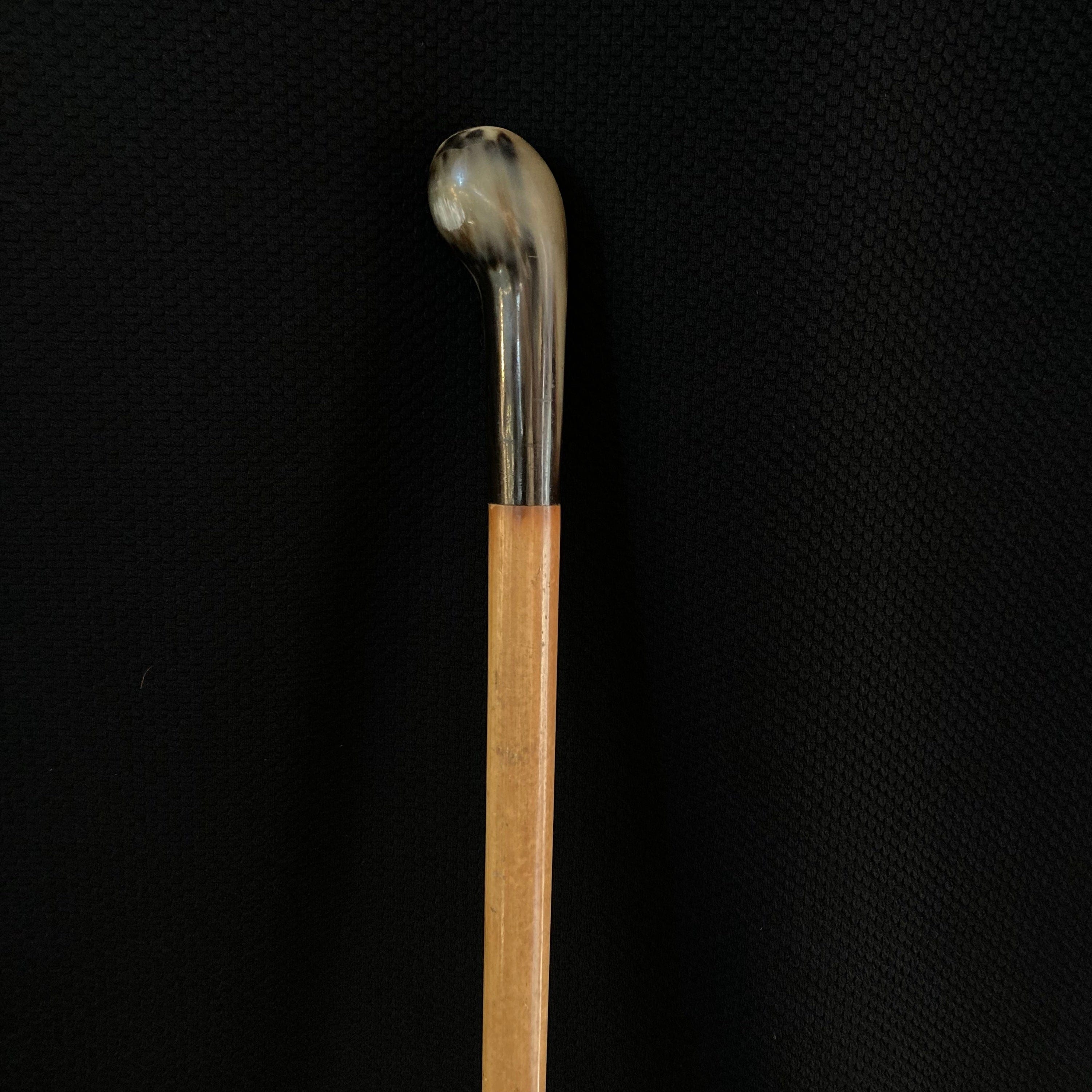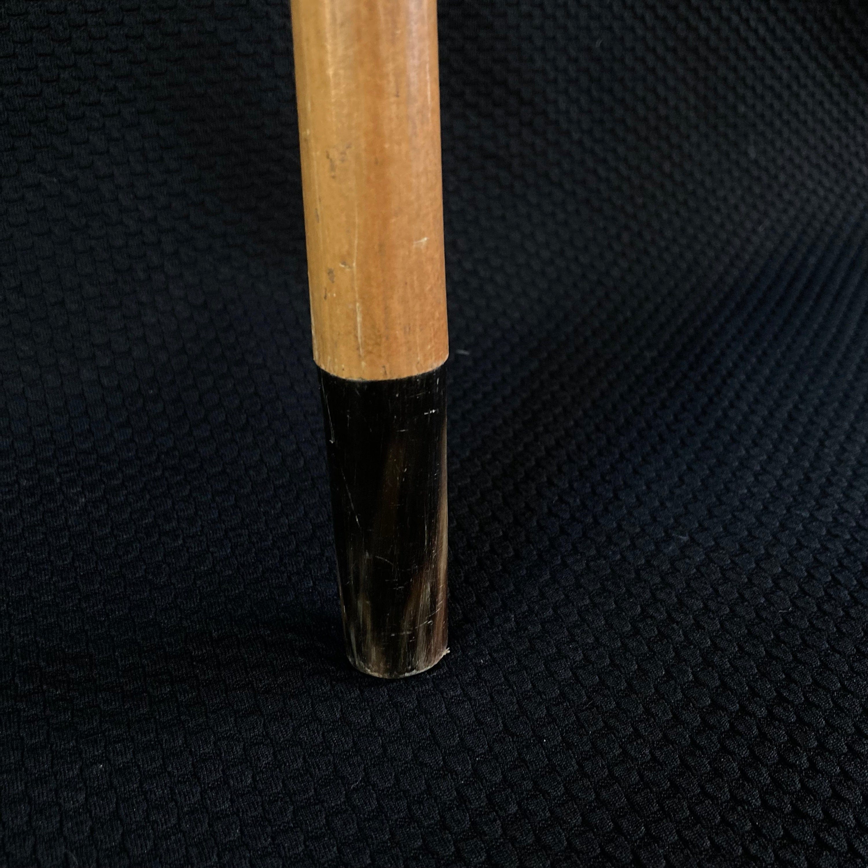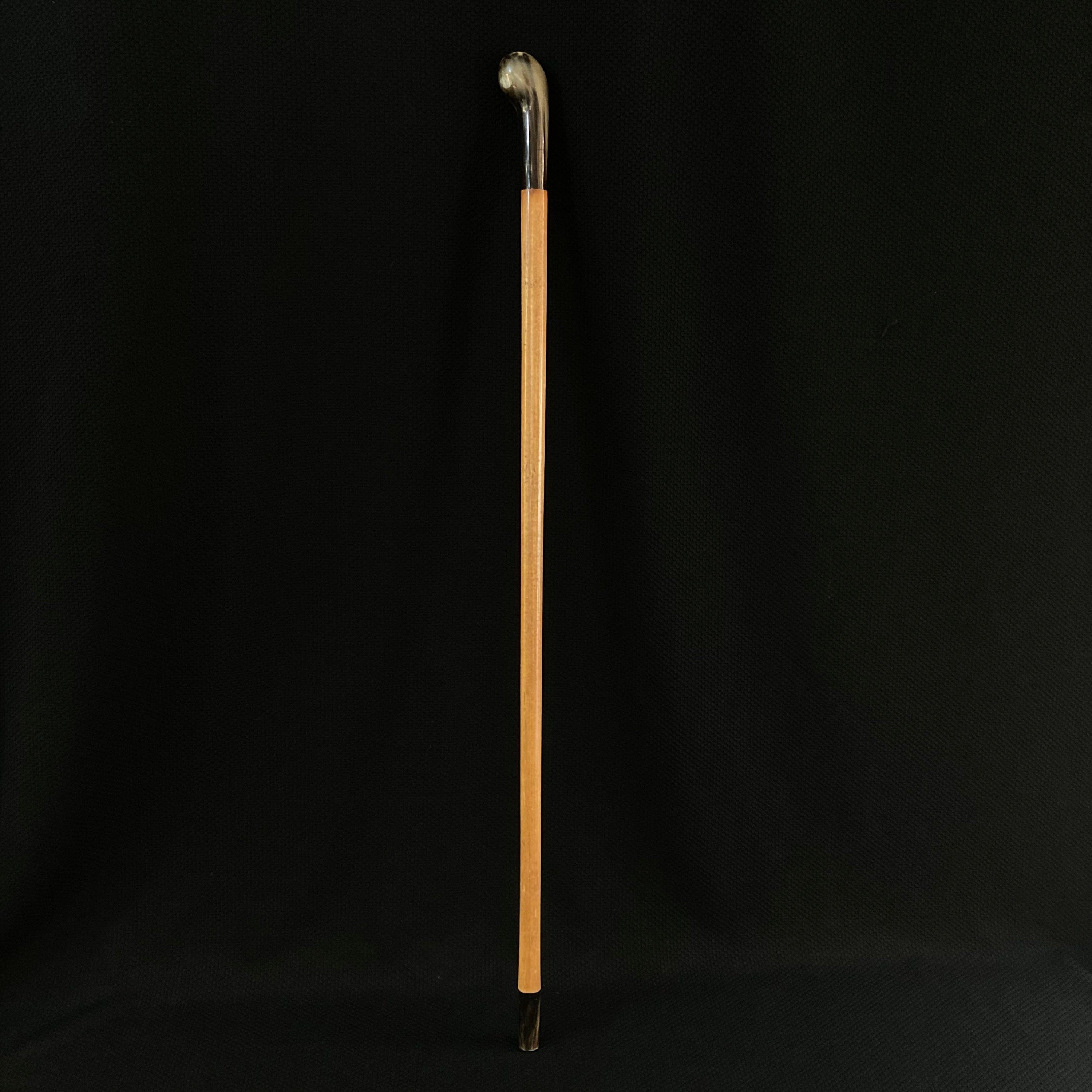 Elegante bastón de madera de malaca con mango y taco de ornamenta animal.
