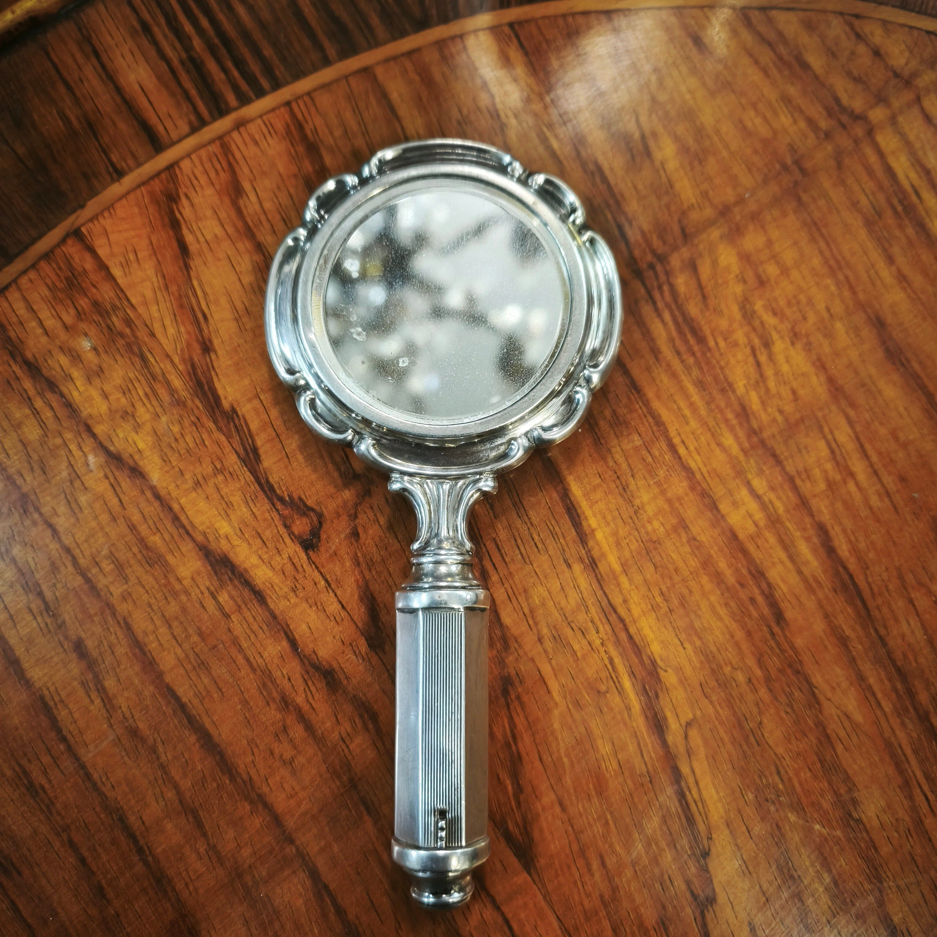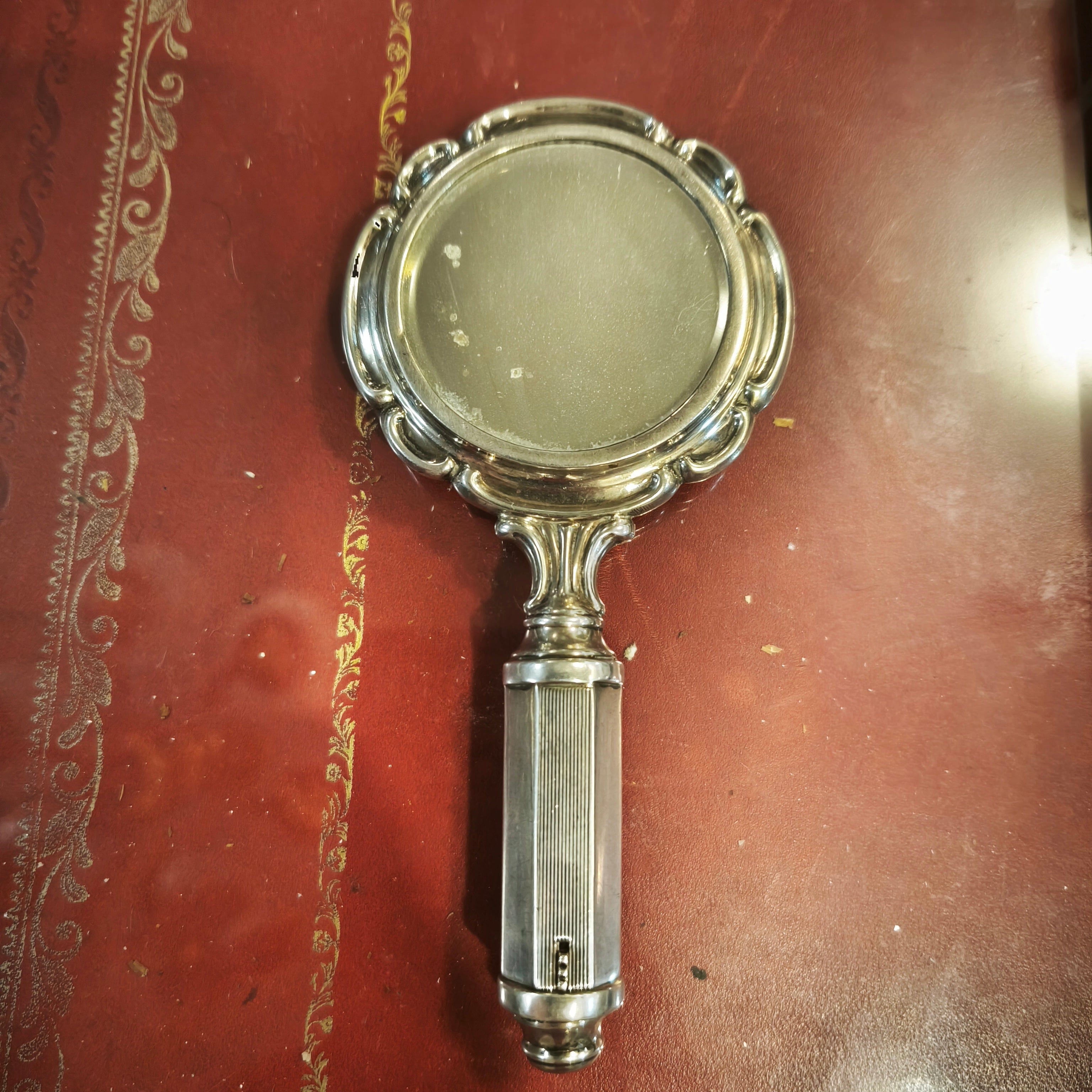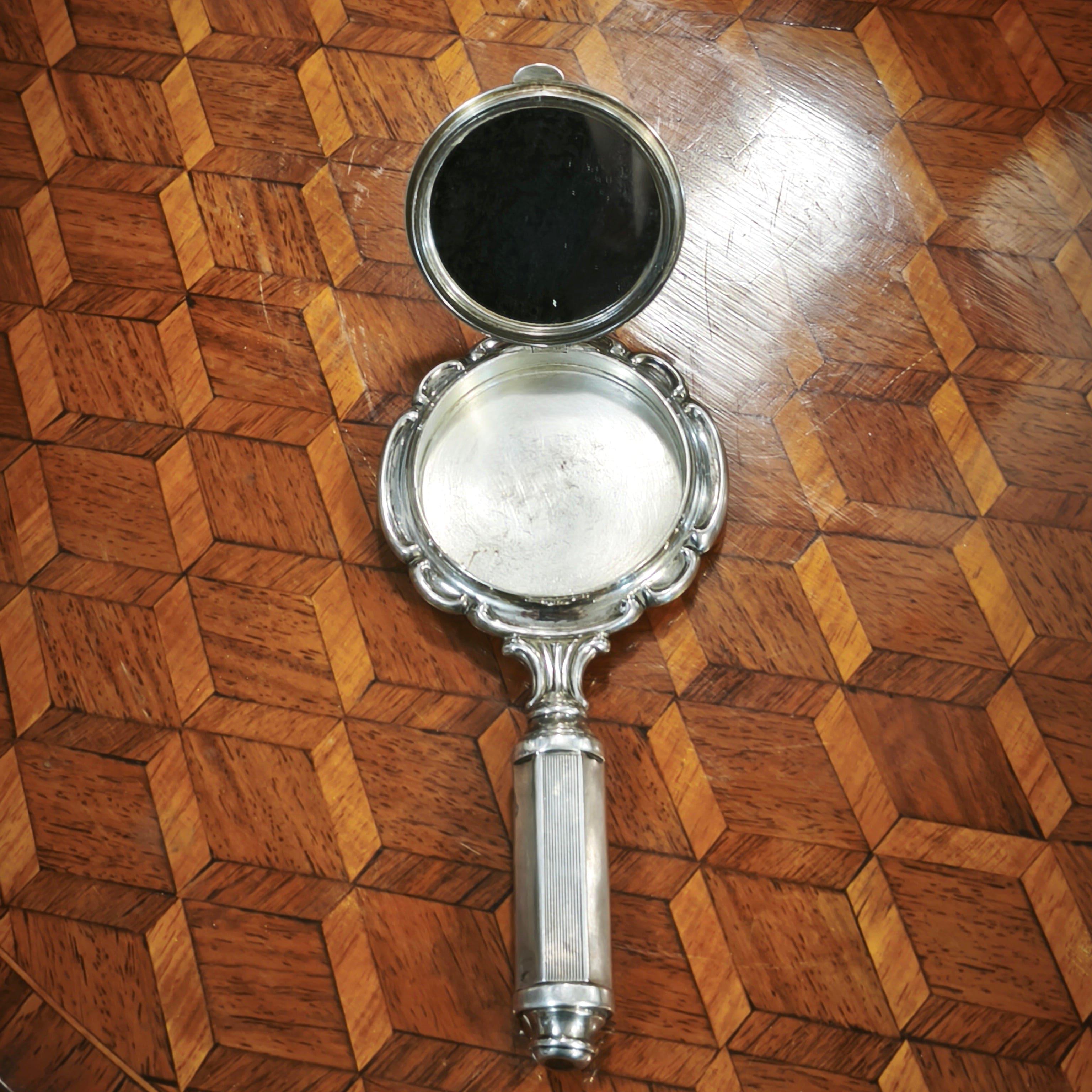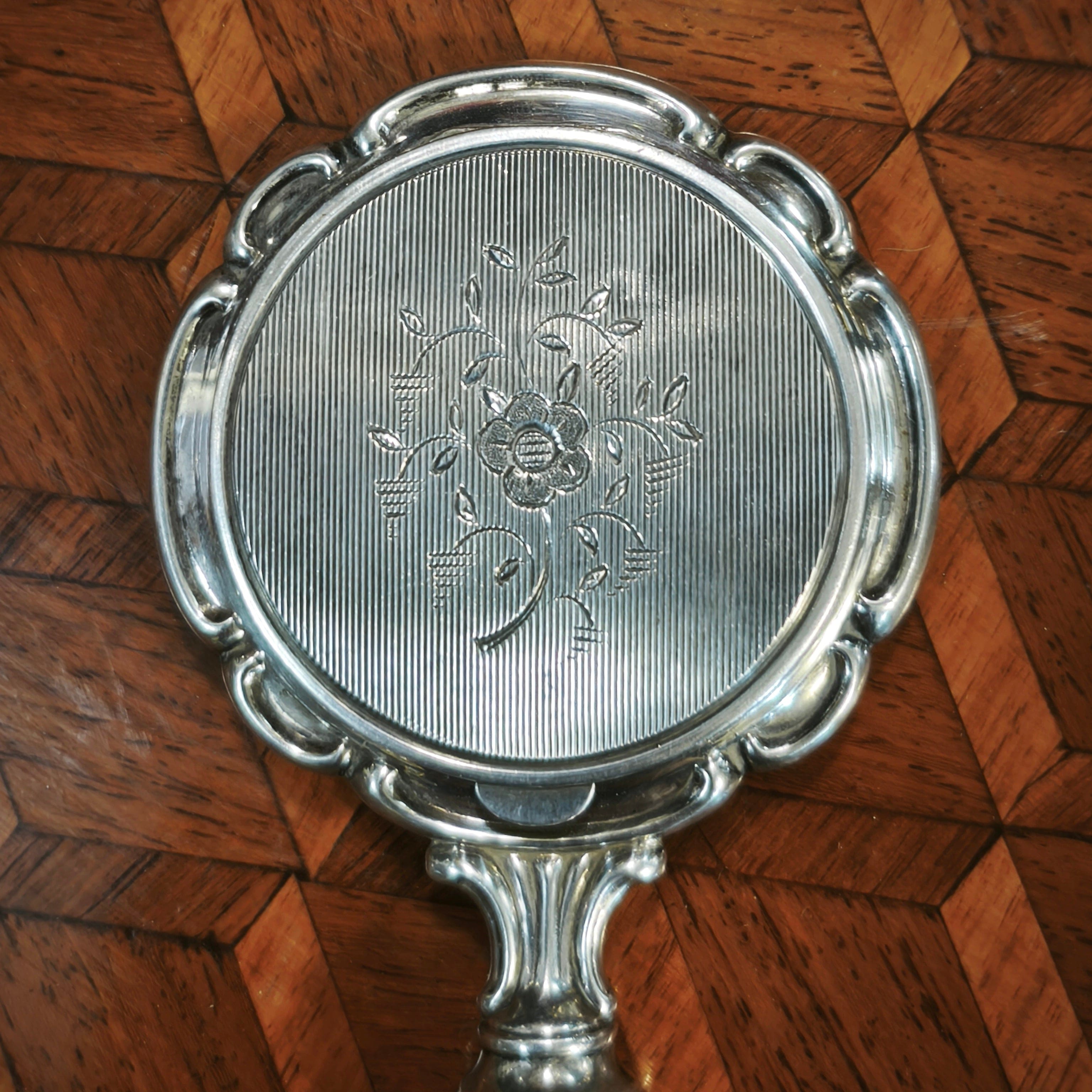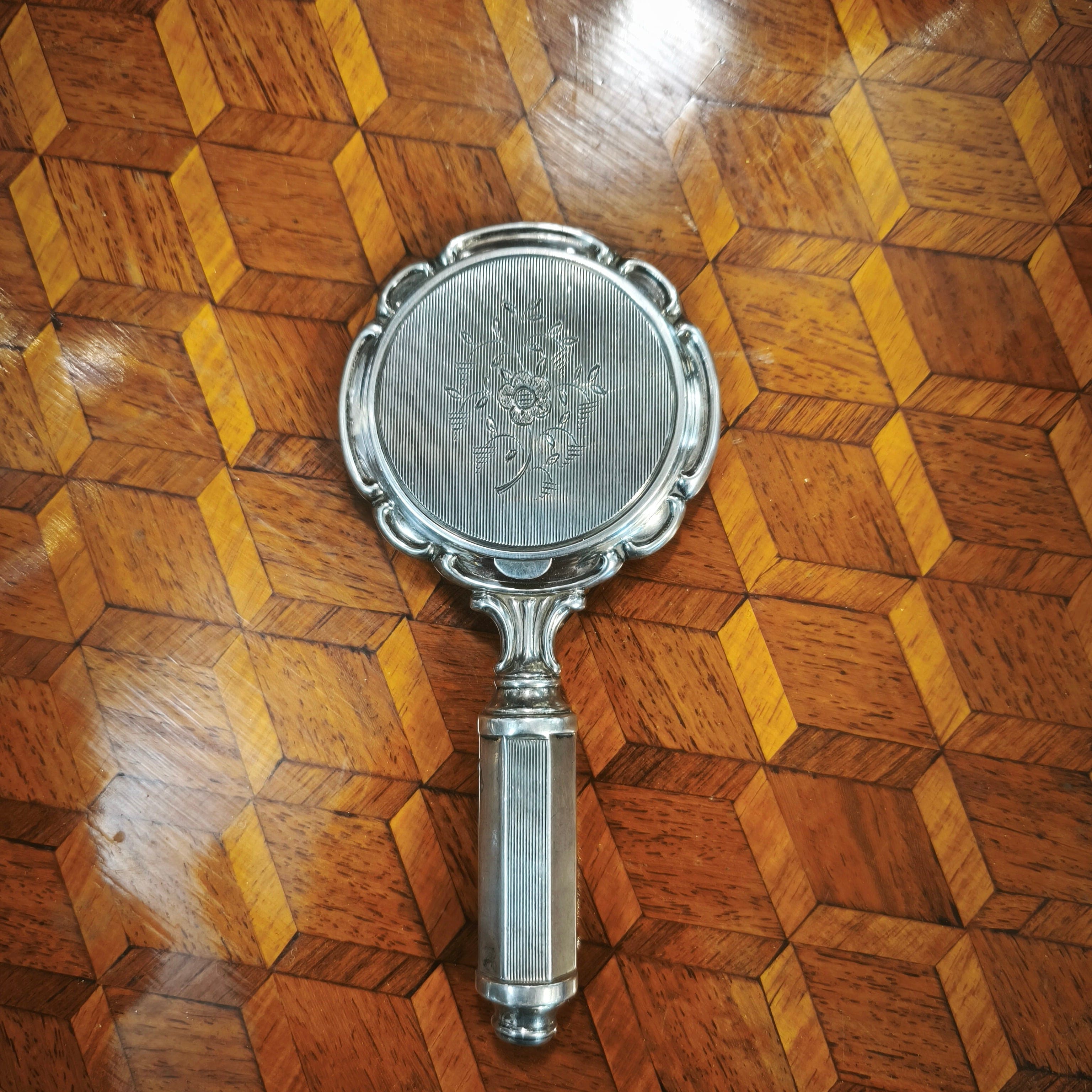 Hermoso y delicado espejo de mano, repujado con flores de plata. Cuenta con una tapa que deja abrir una polvera.