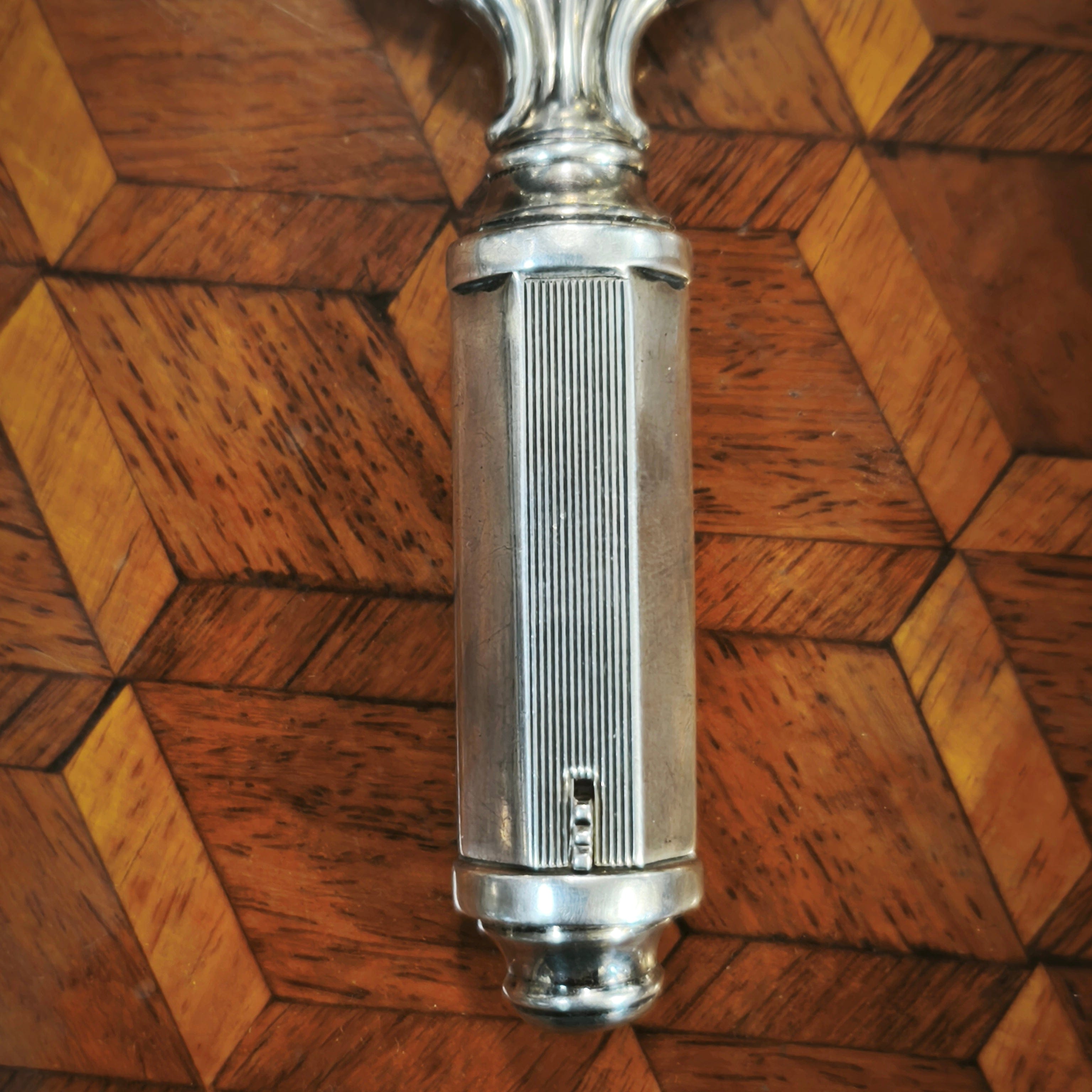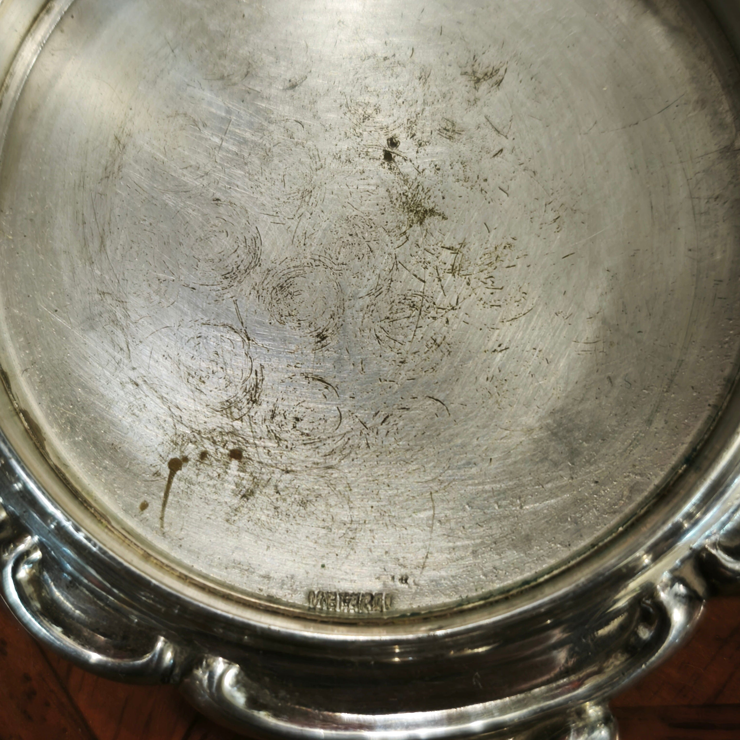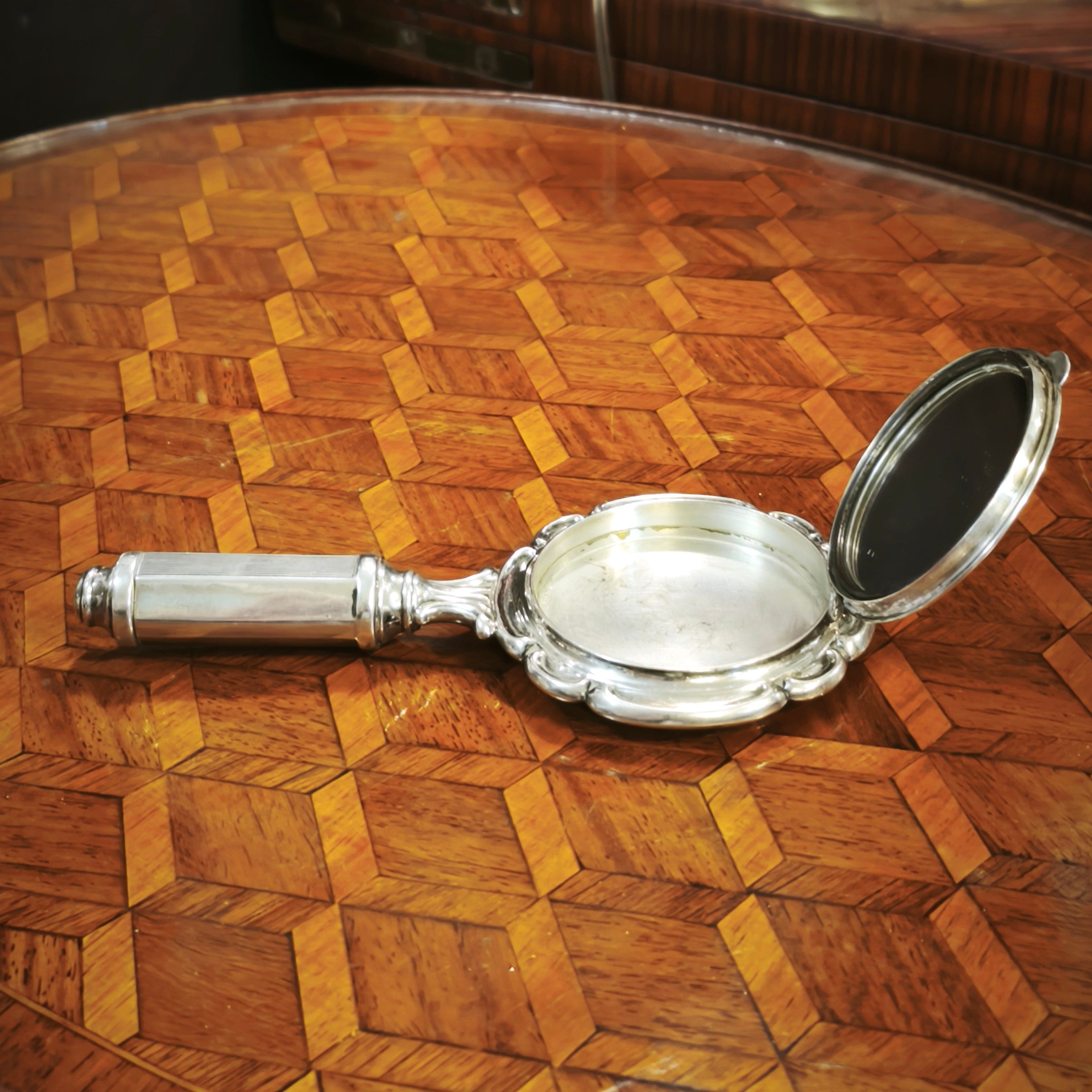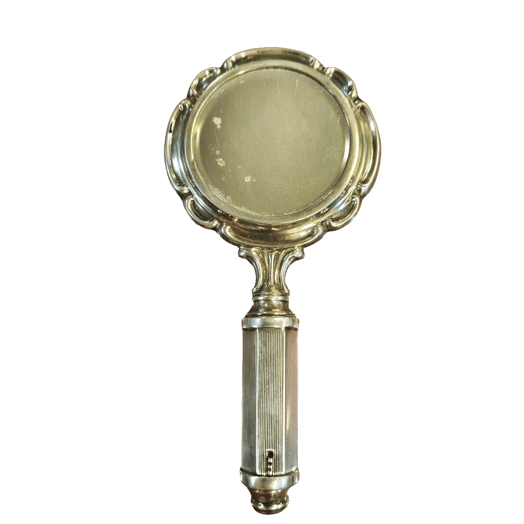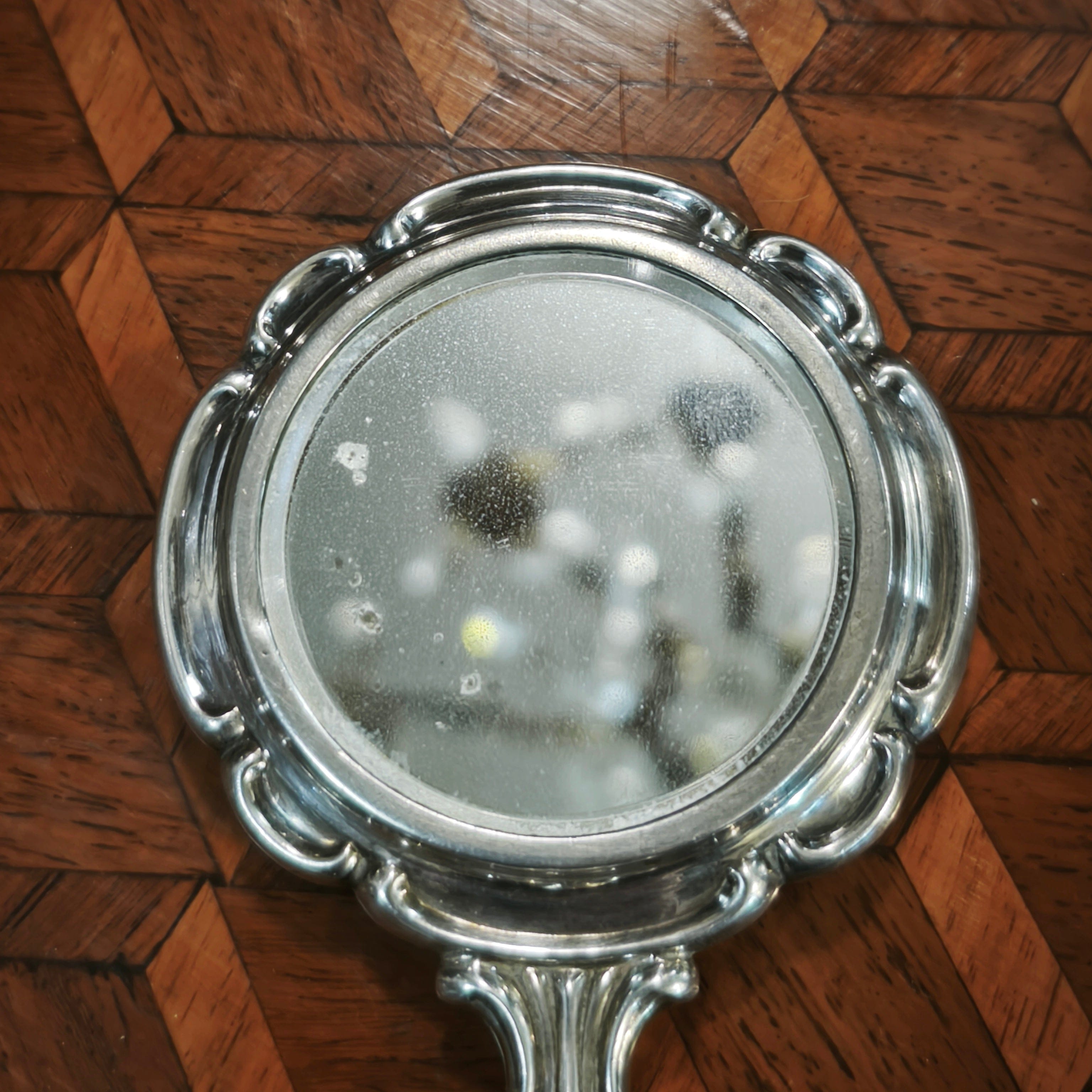 Hermoso y delicado espejo de mano, repujado con flores de plata. Cuenta con una tapa que deja abrir una polvera.