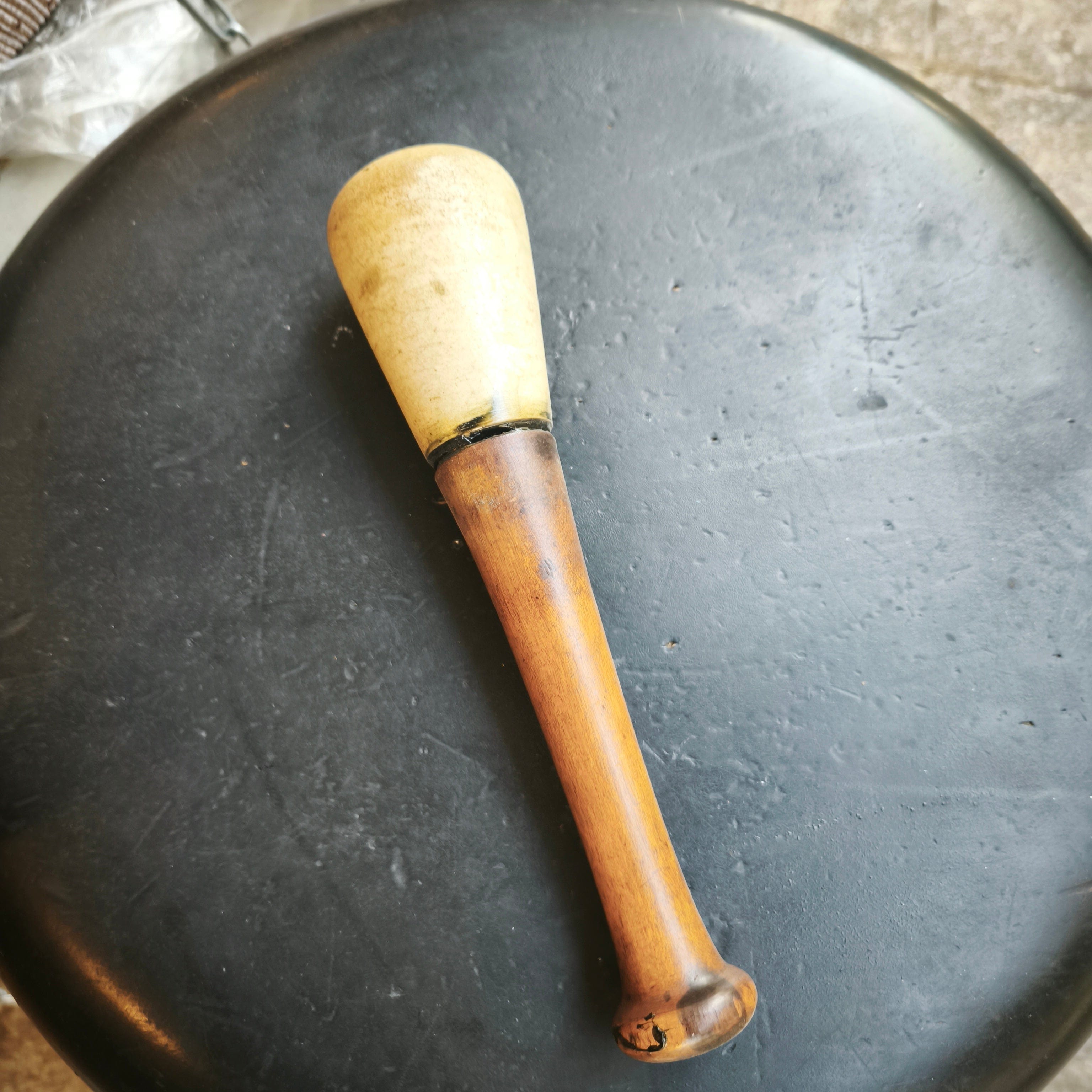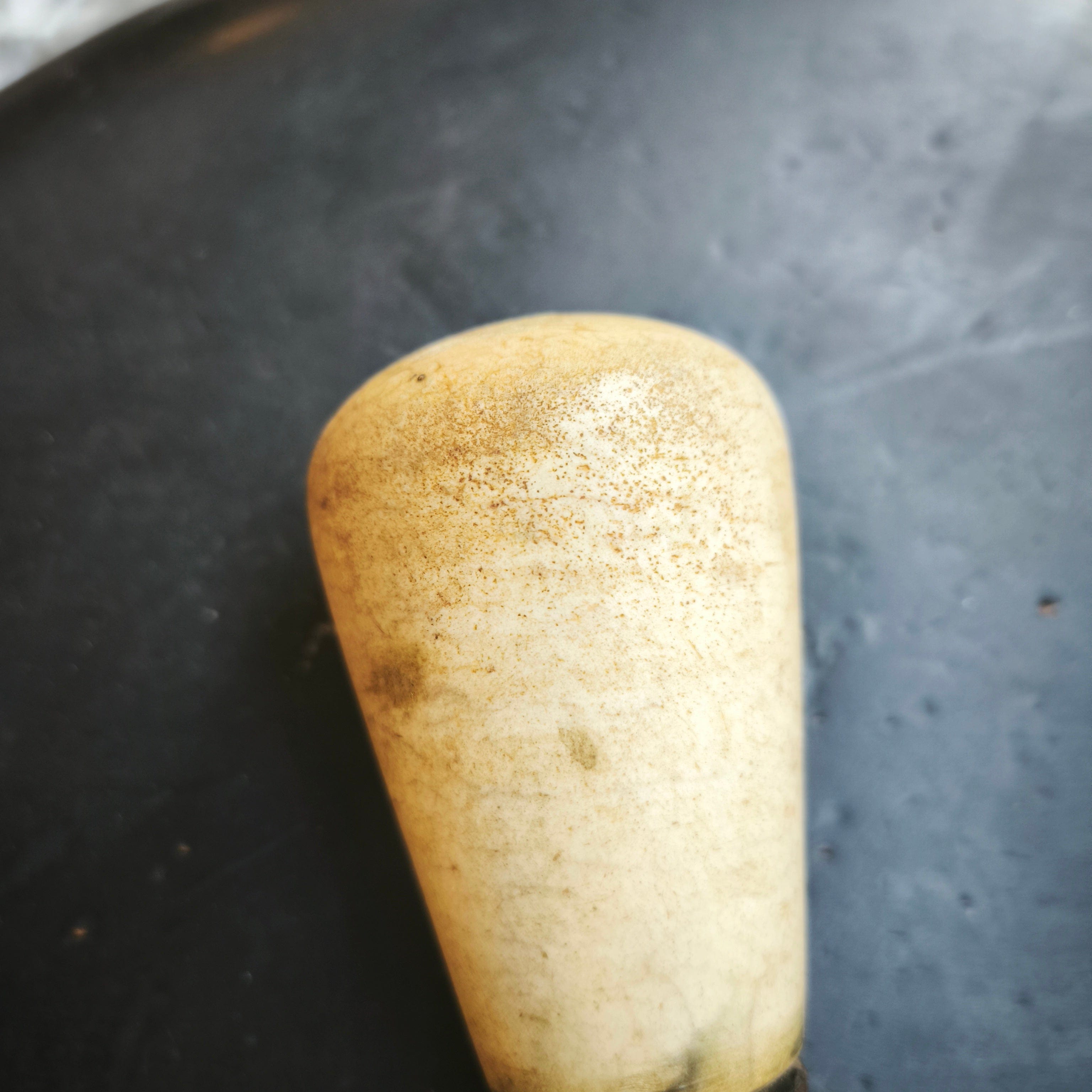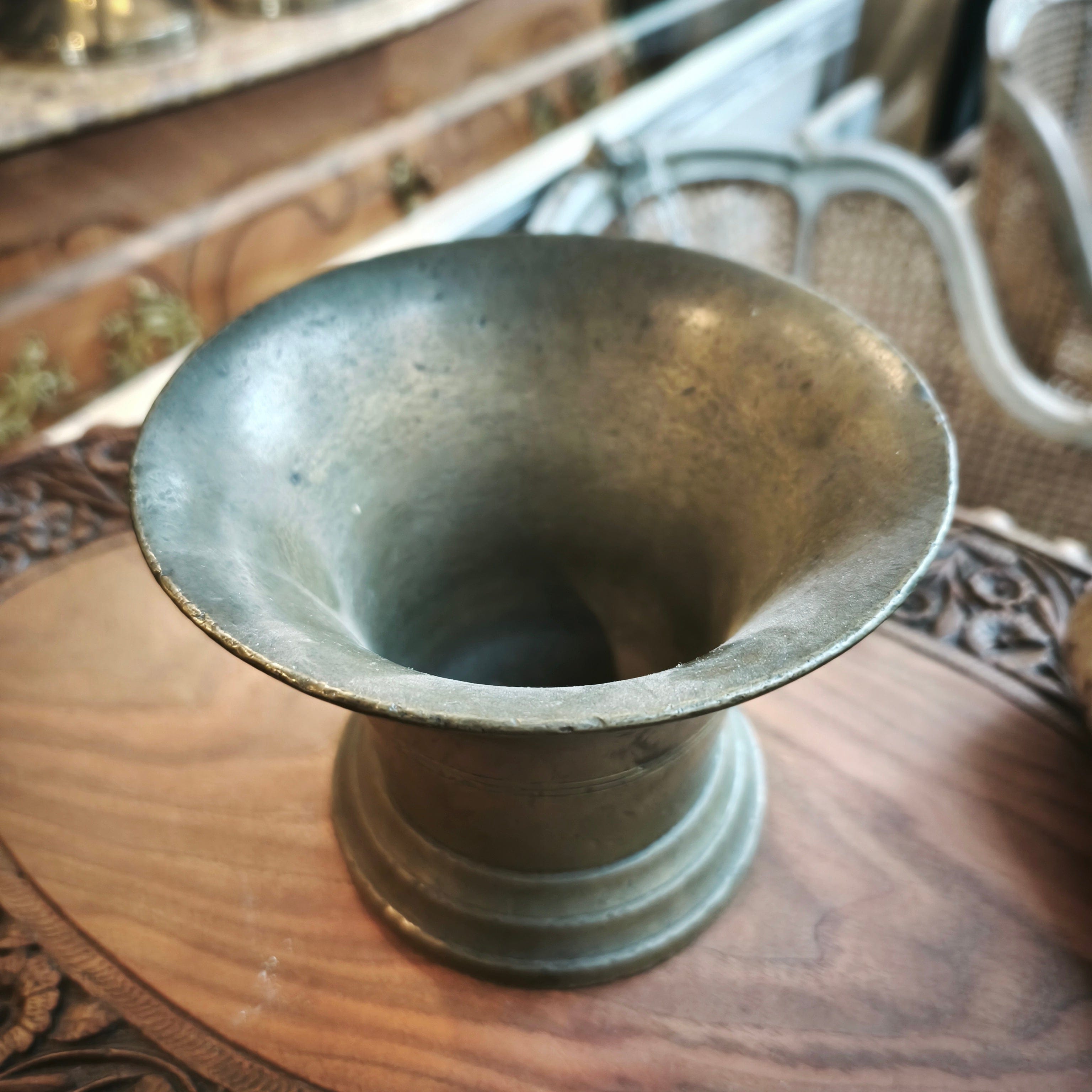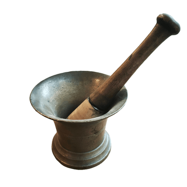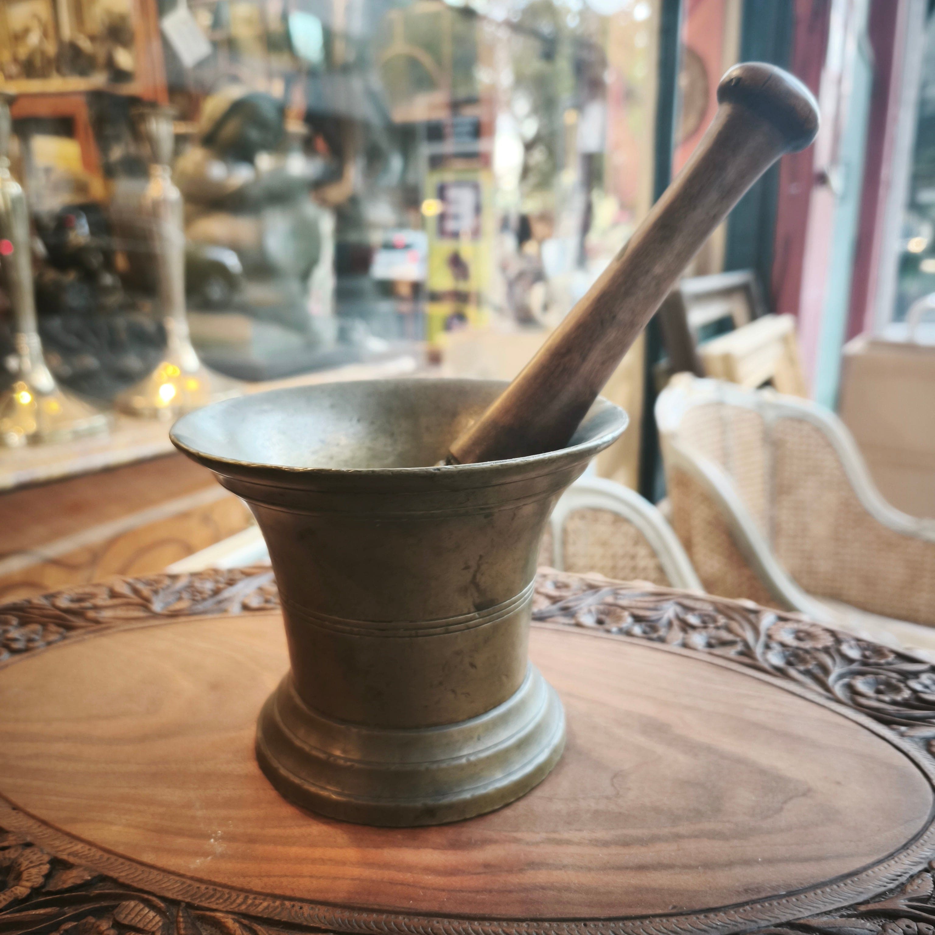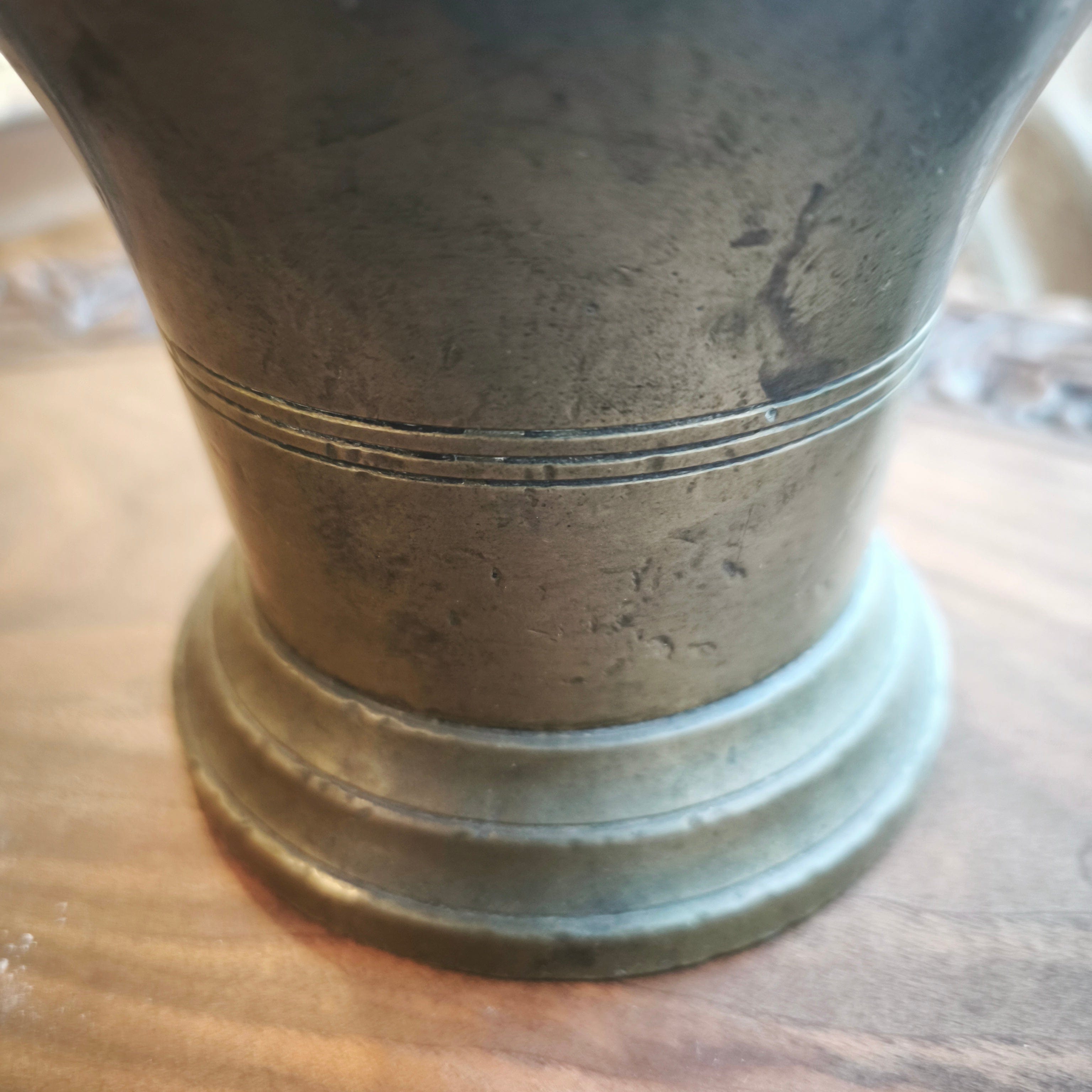 Bello mortero de bronce cincelado con líneas en su superficie y un diseño de cuello de trompeta. Tiene una herramienta de mango de madera y cabeza de piedra blanca.
