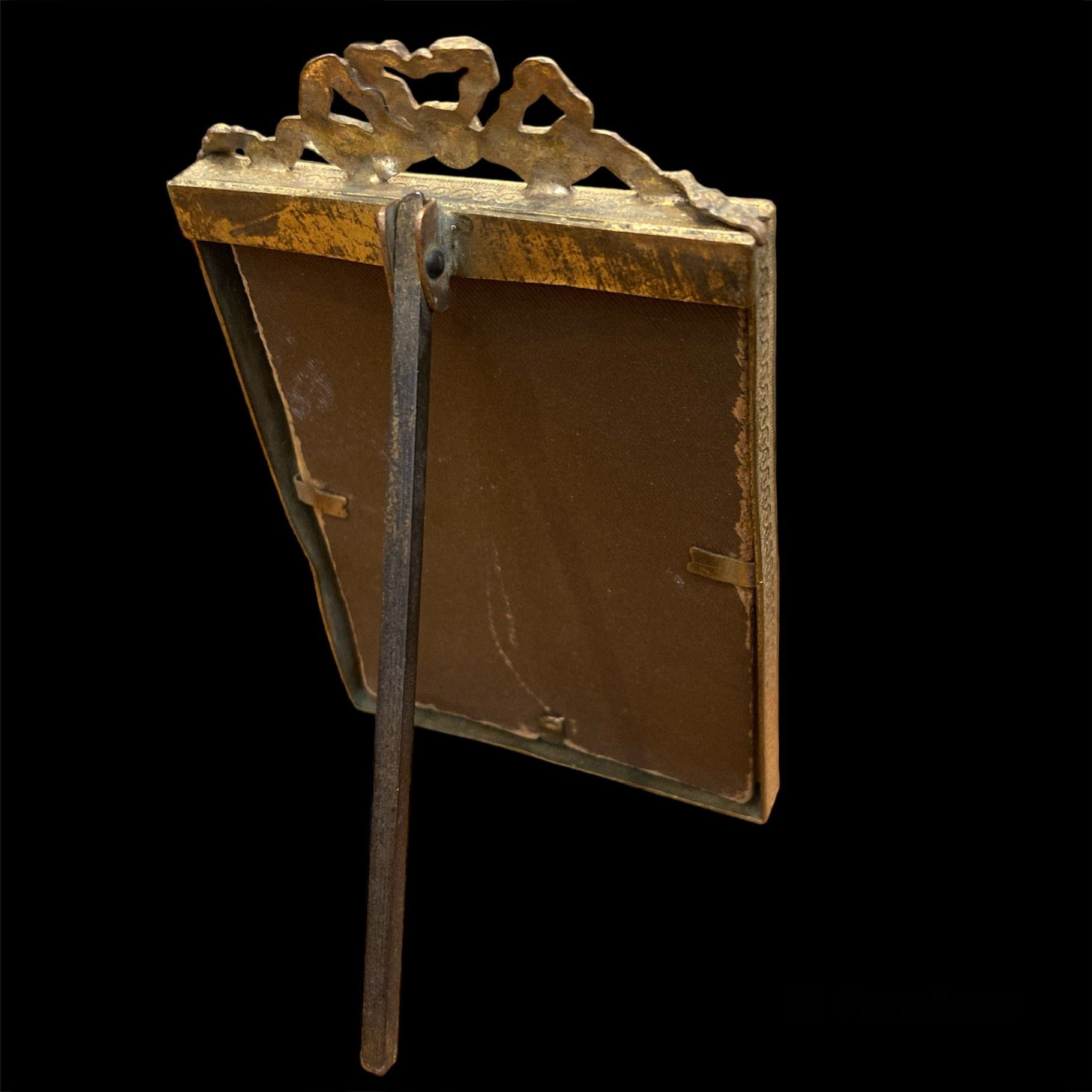 Hermoso y delicado portarretrato con estructura de bronce. Su diseño rectángulo y el rosetón en su centro, le brindan elegancia y un toque antiguo especial.