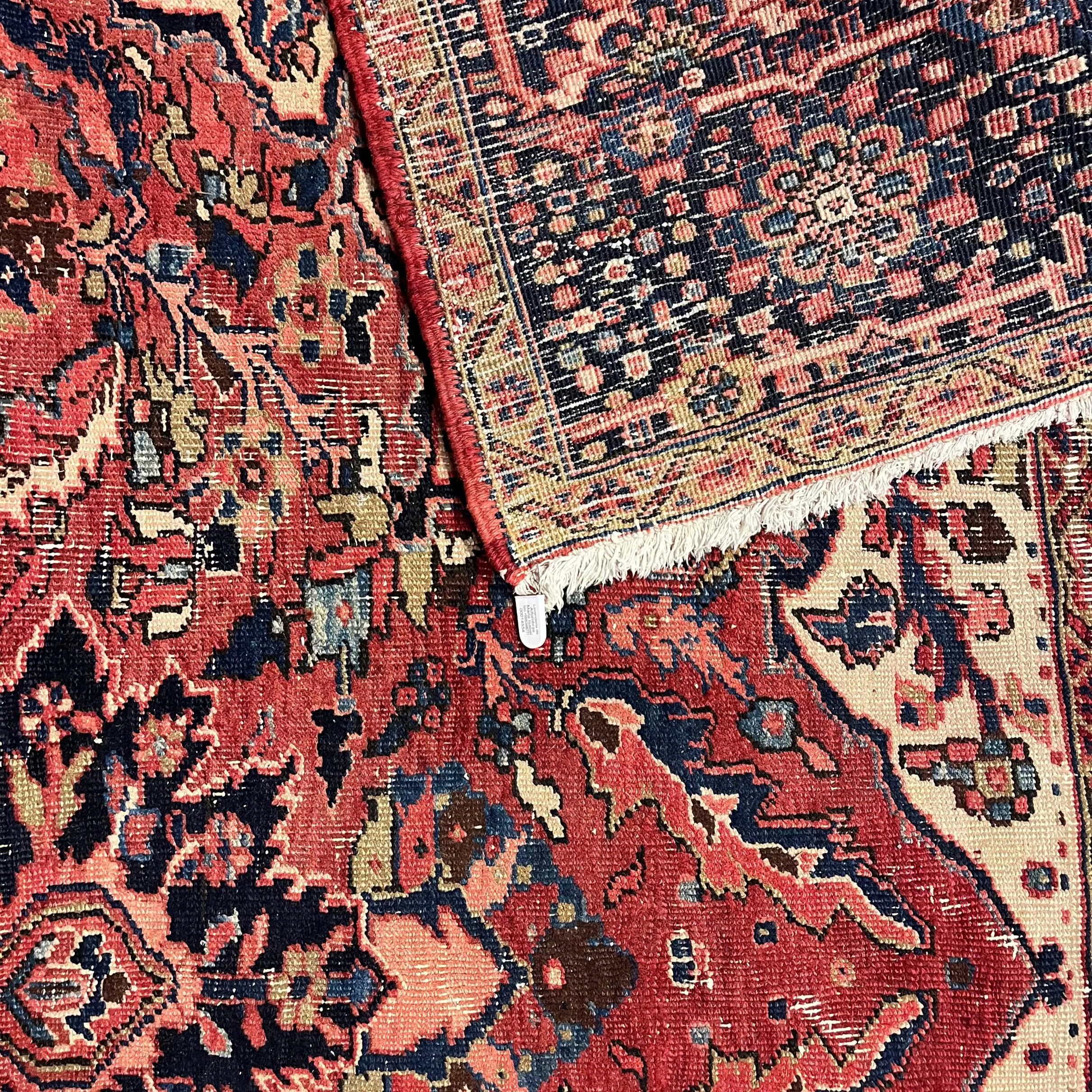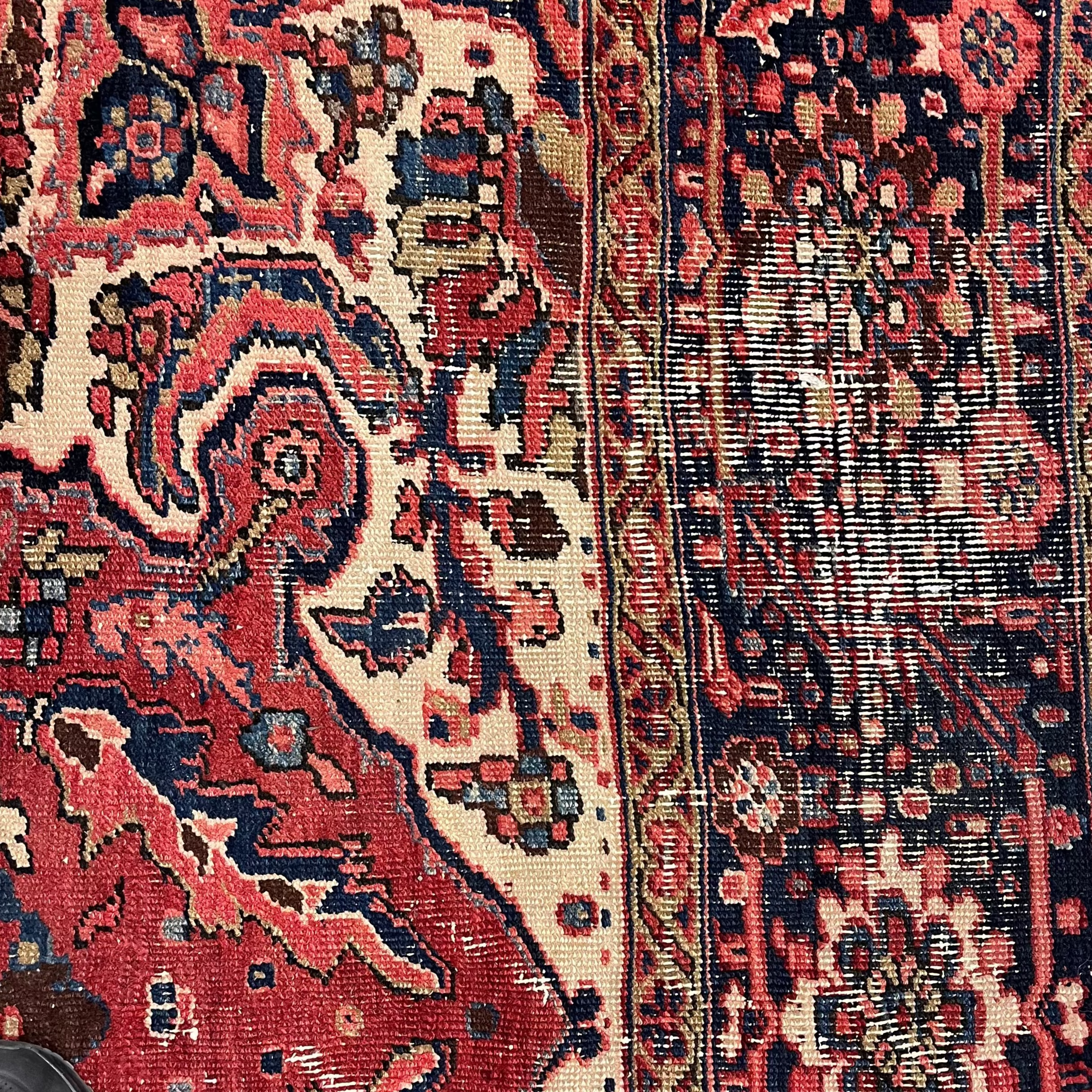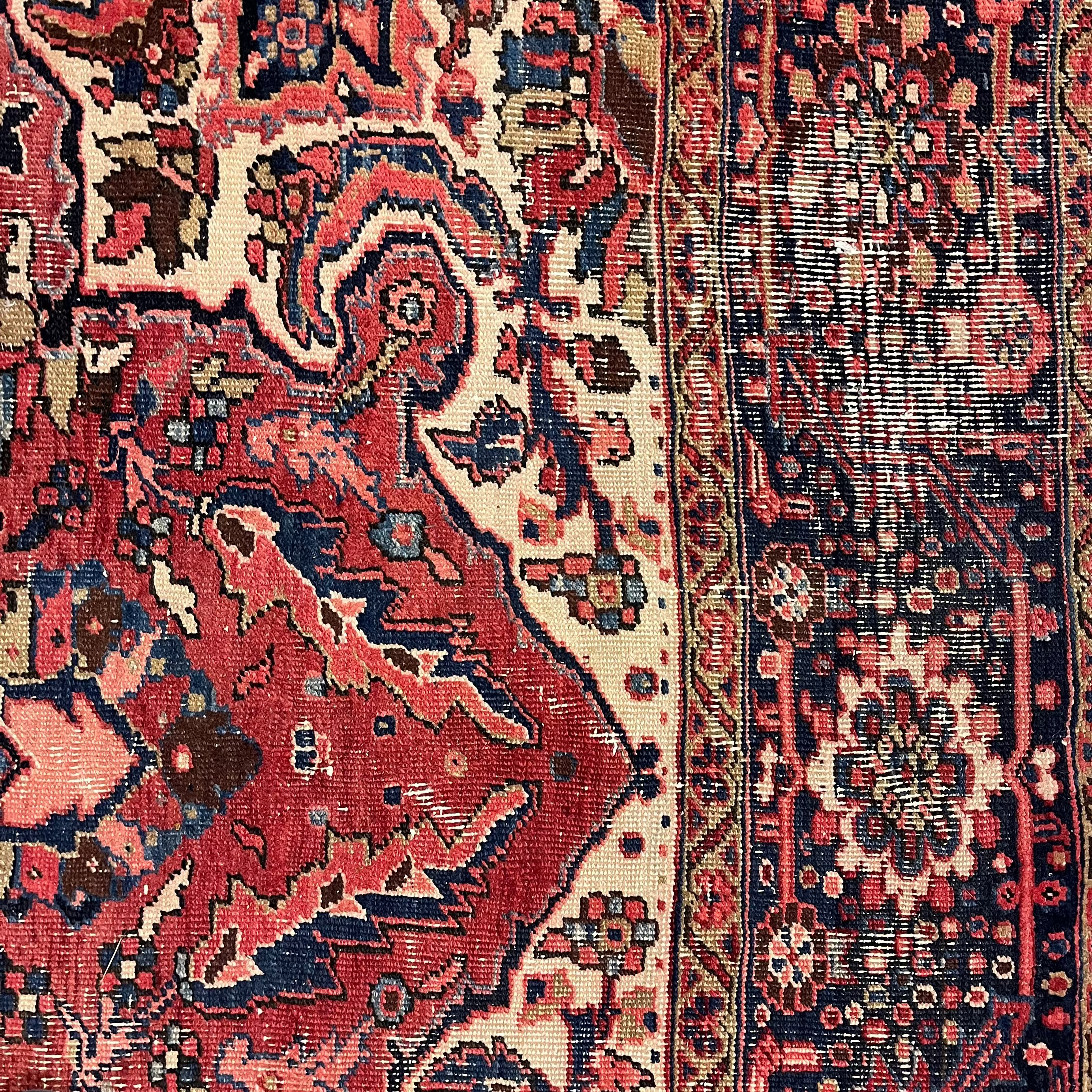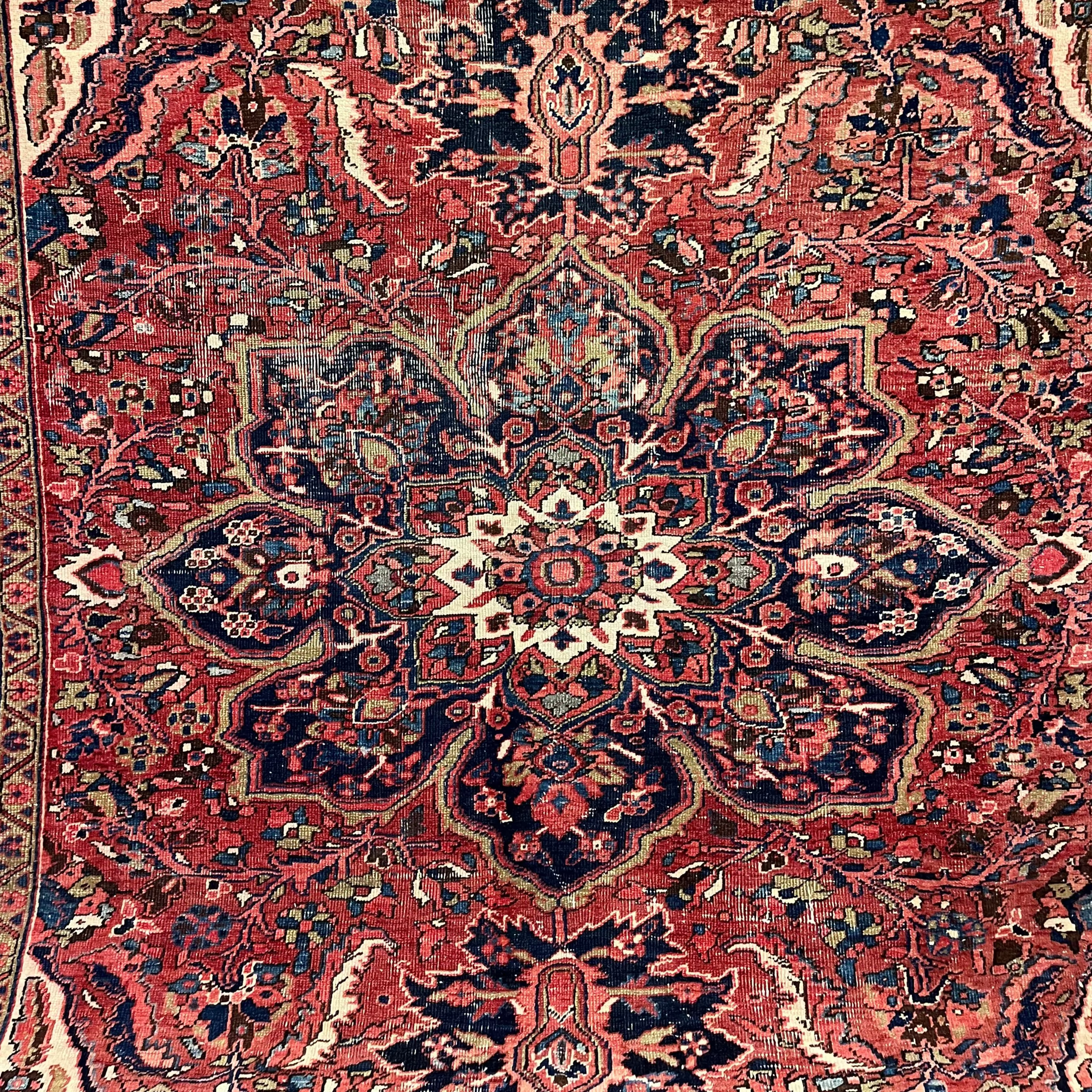 Hermosa alfombra iraní bajtiari de ochenta años de antigüedad conservada en excelentes condiciones. Destaca por su diseño tradicional con un gran medallón central rodeado de combinaciones de tonos rojizos.