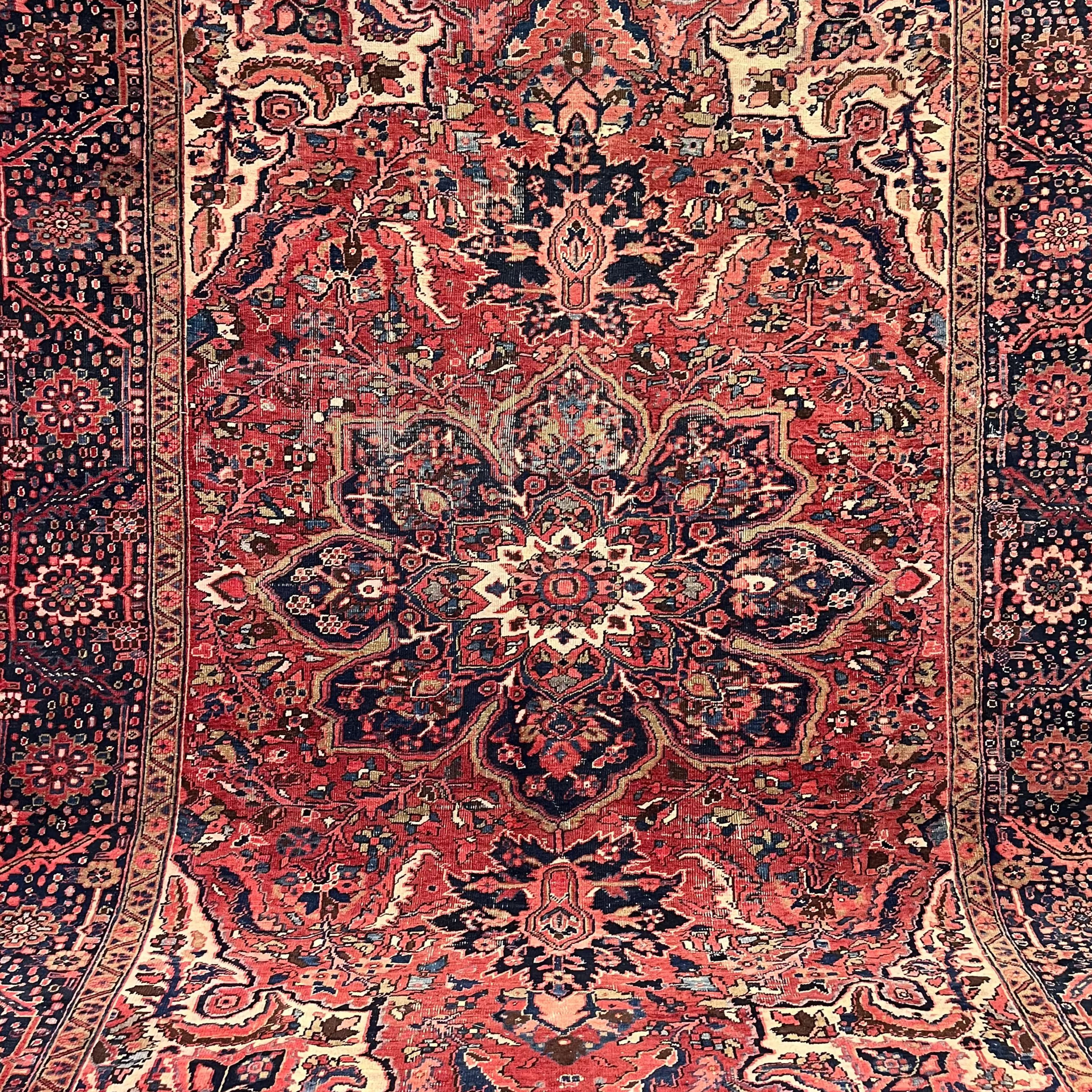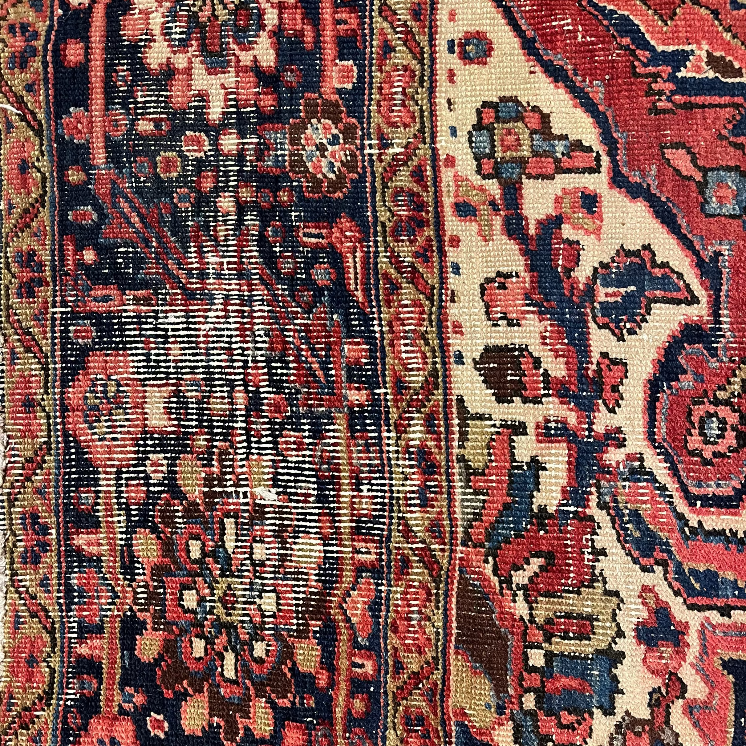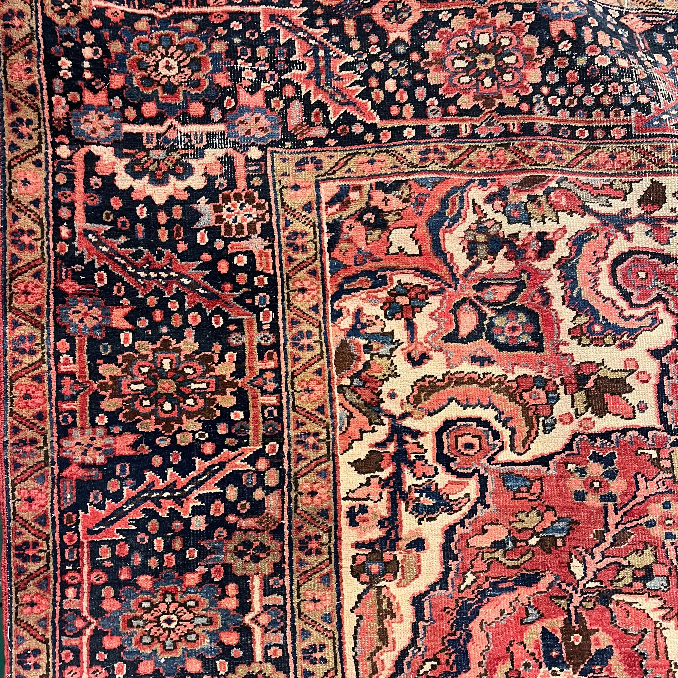 Hermosa alfombra iraní bajtiari de ochenta años de antigüedad conservada en excelentes condiciones. Destaca por su diseño tradicional con un gran medallón central rodeado de combinaciones de tonos rojizos.
