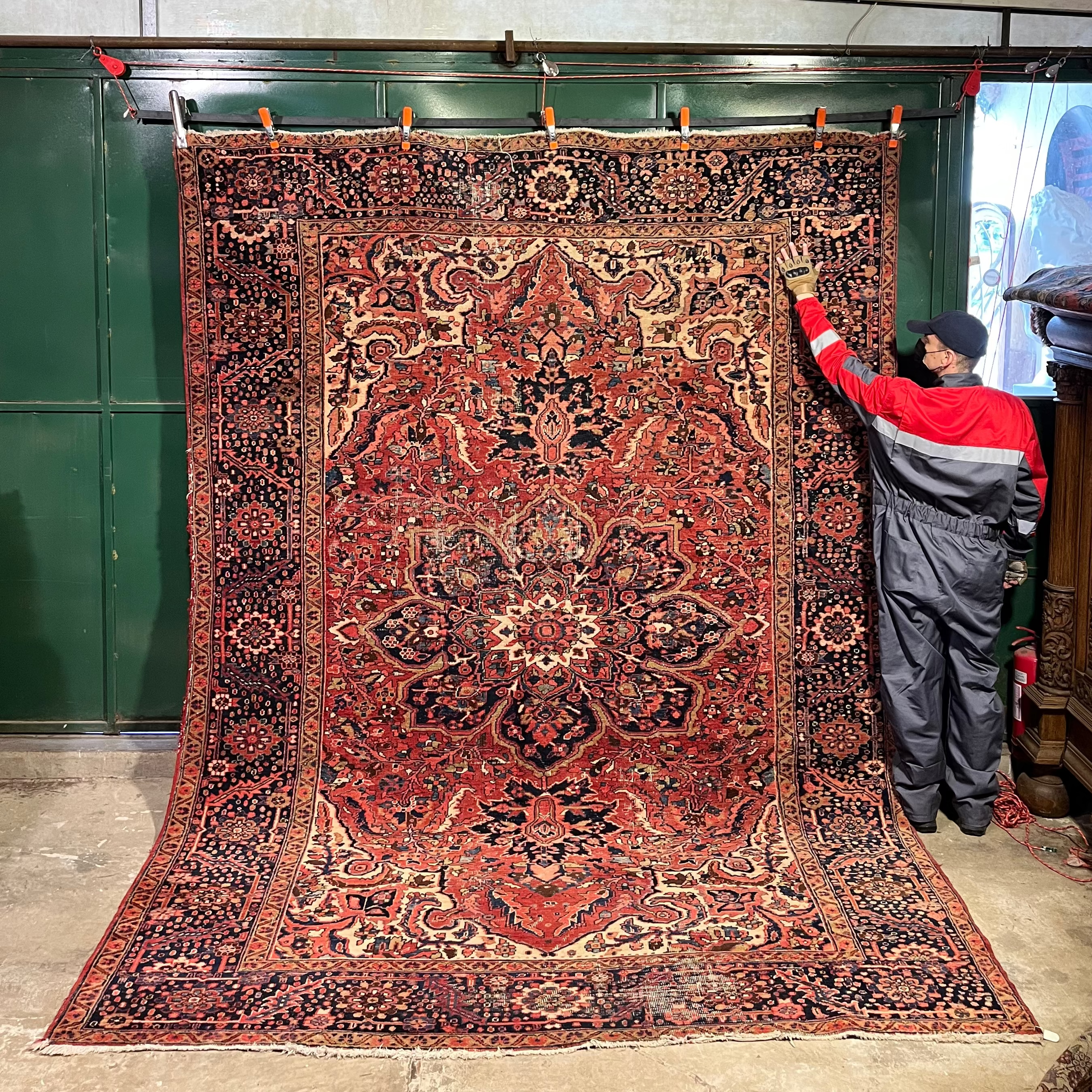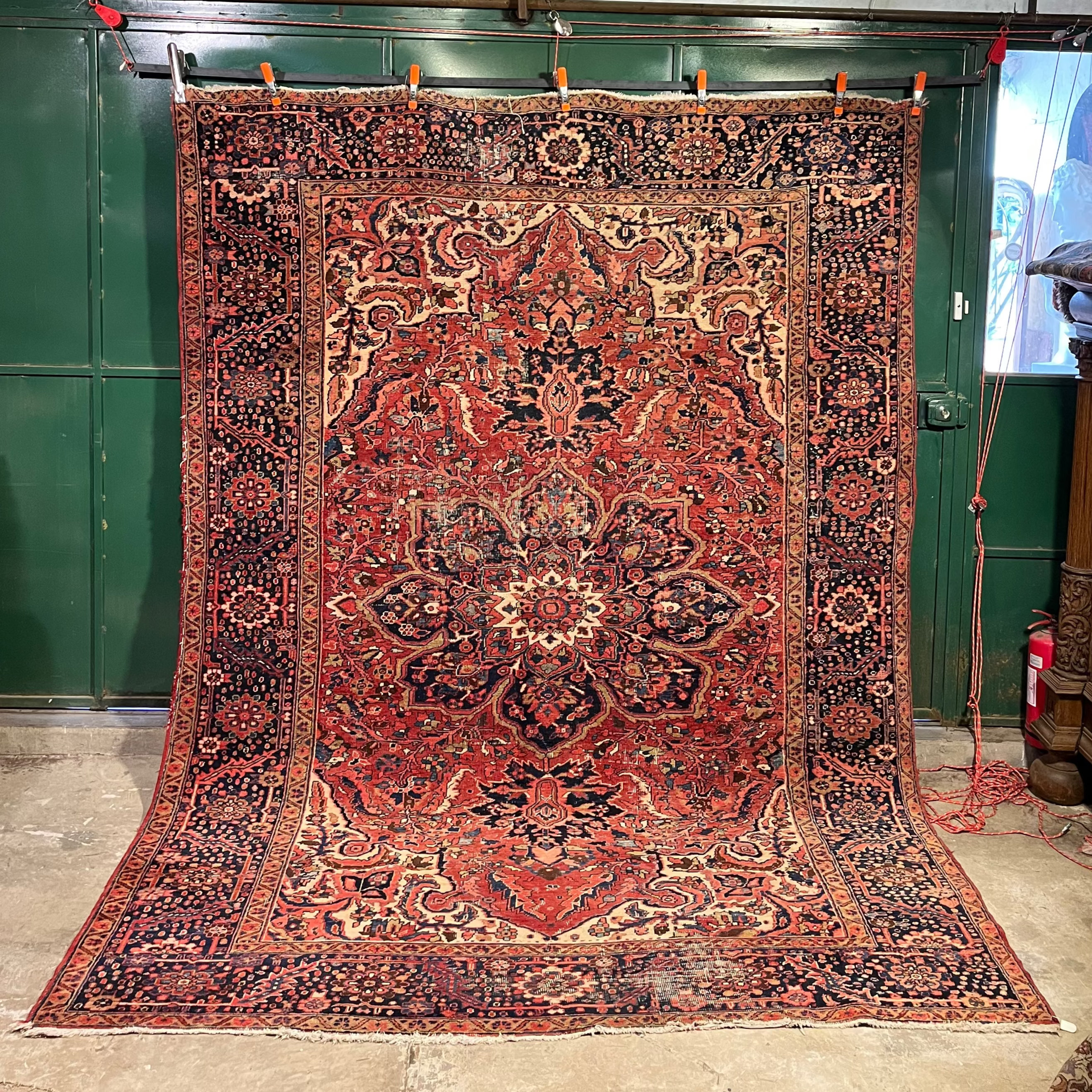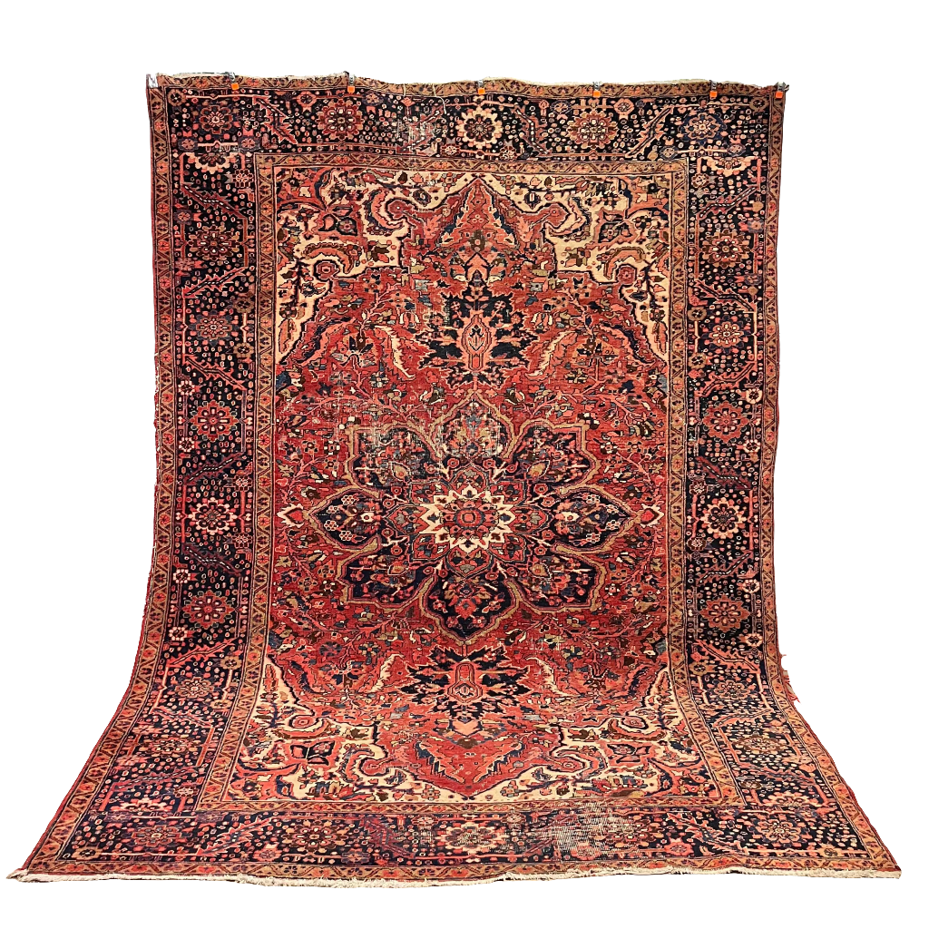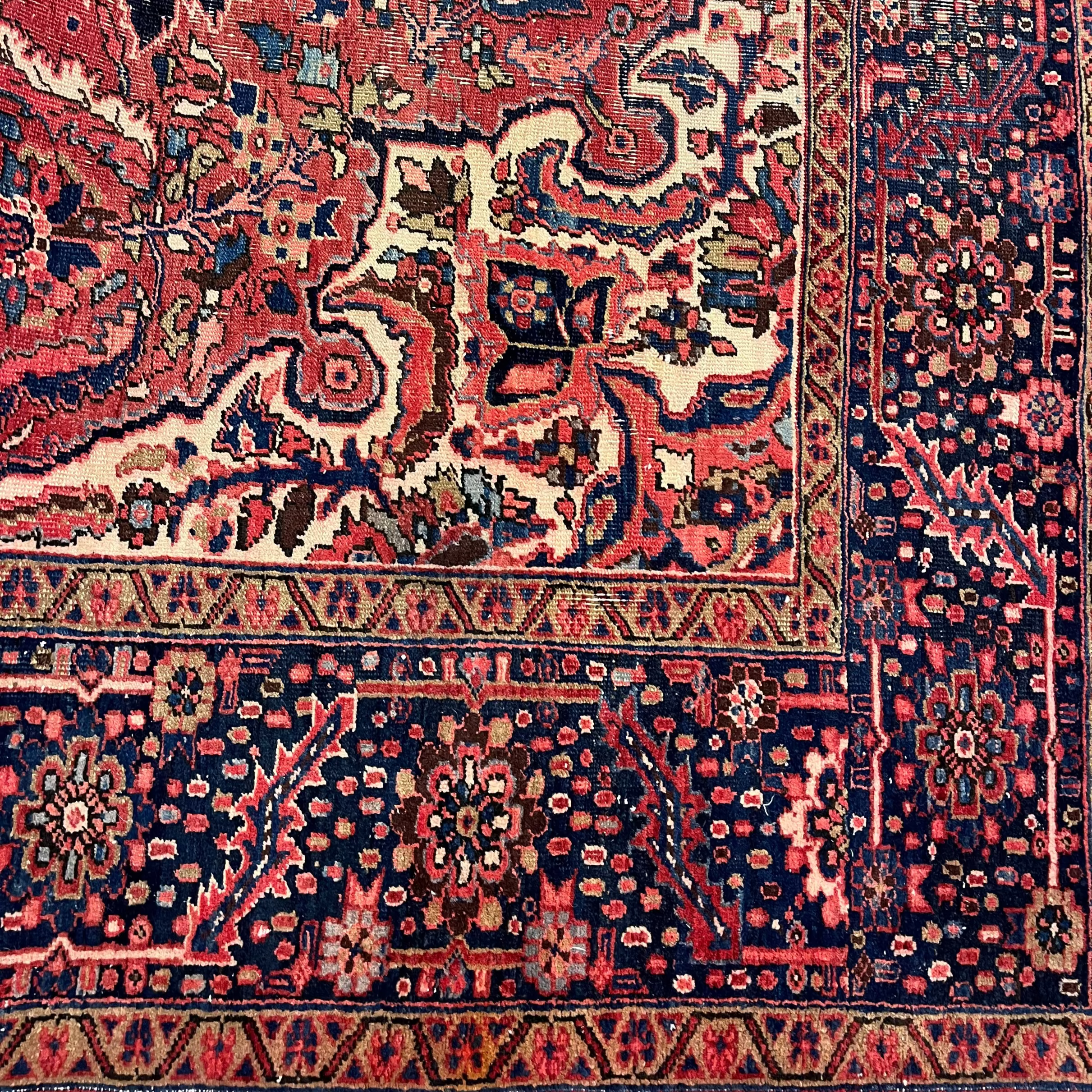 Hermosa alfombra iraní bajtiari de ochenta años de antigüedad conservada en excelentes condiciones. Destaca por su diseño tradicional con un gran medallón central rodeado de combinaciones de tonos rojizos.