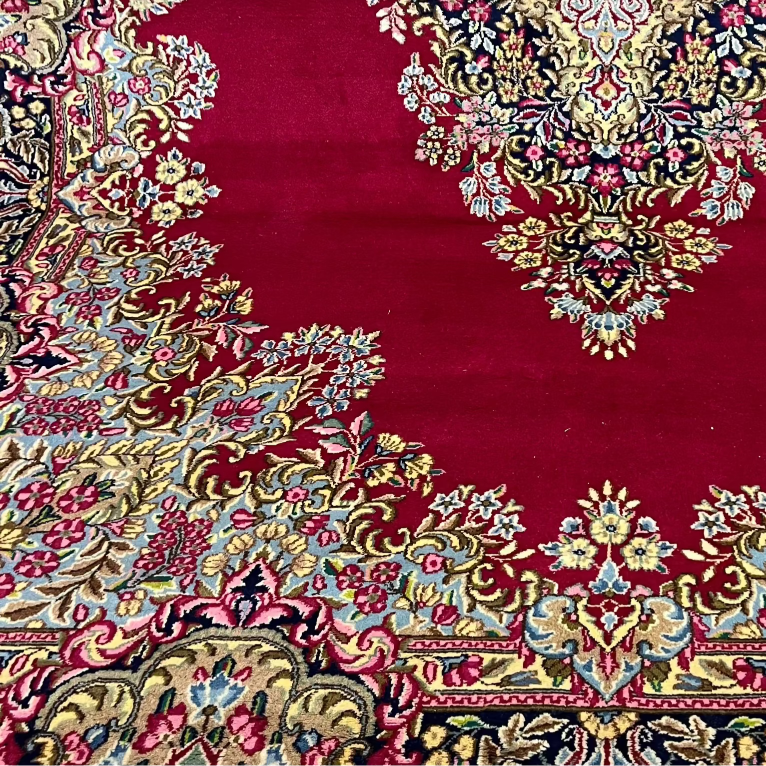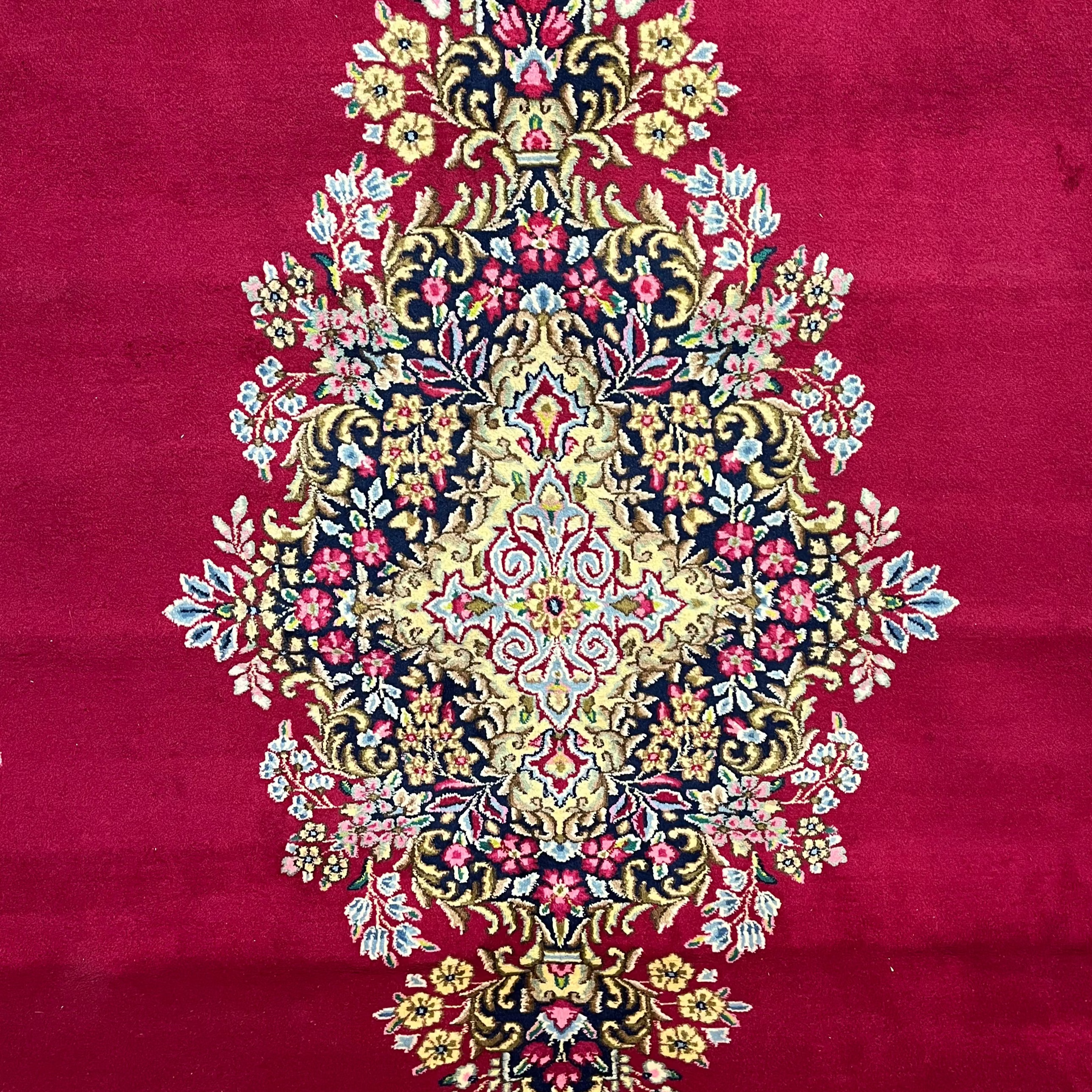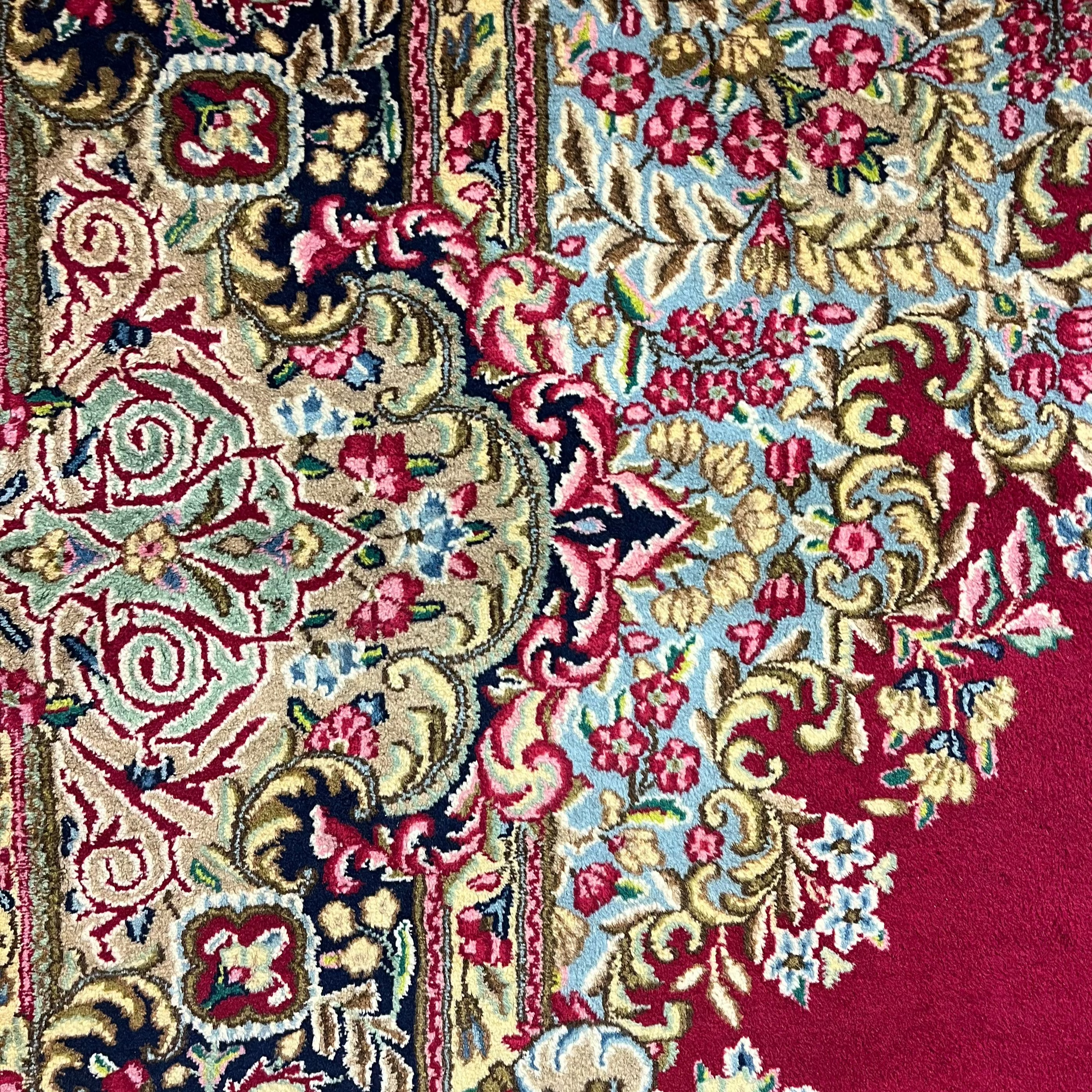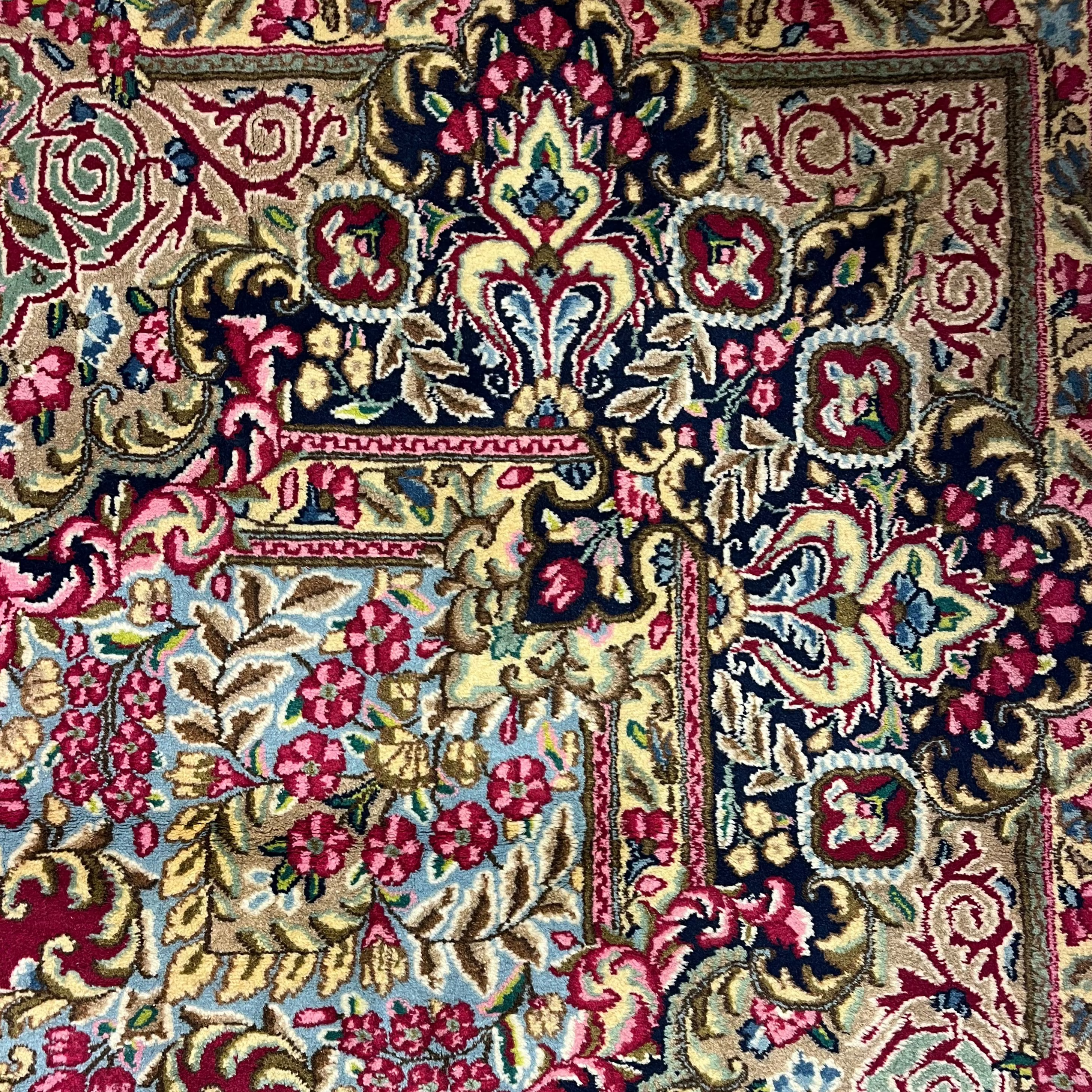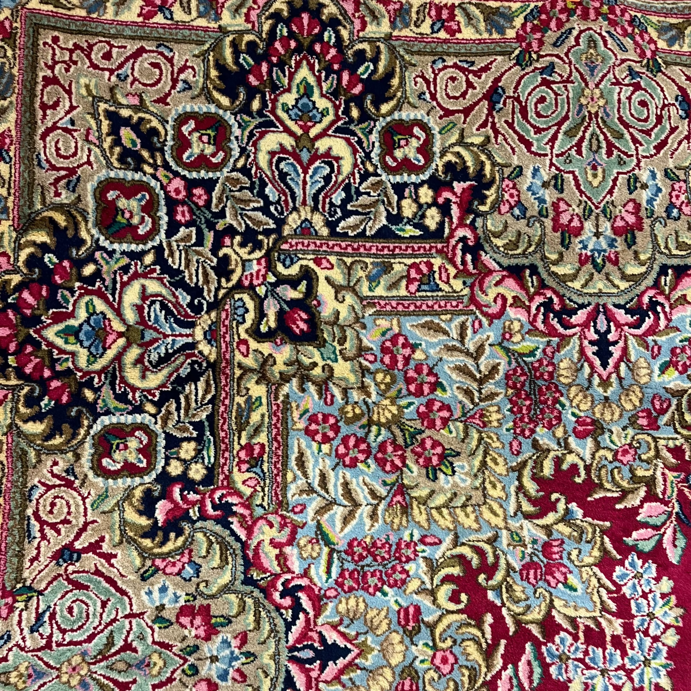 Maravillosa alfombra persa de Kirman de lana y seda de mediados del siglo XX. Hecha a mano, presenta hermosos detalles florales y patrones geométricos en llamativos tonos rojizos, azules y rosas que realzan su diseño gracias al contraste que genera. Se encuentra en perfecto estado.