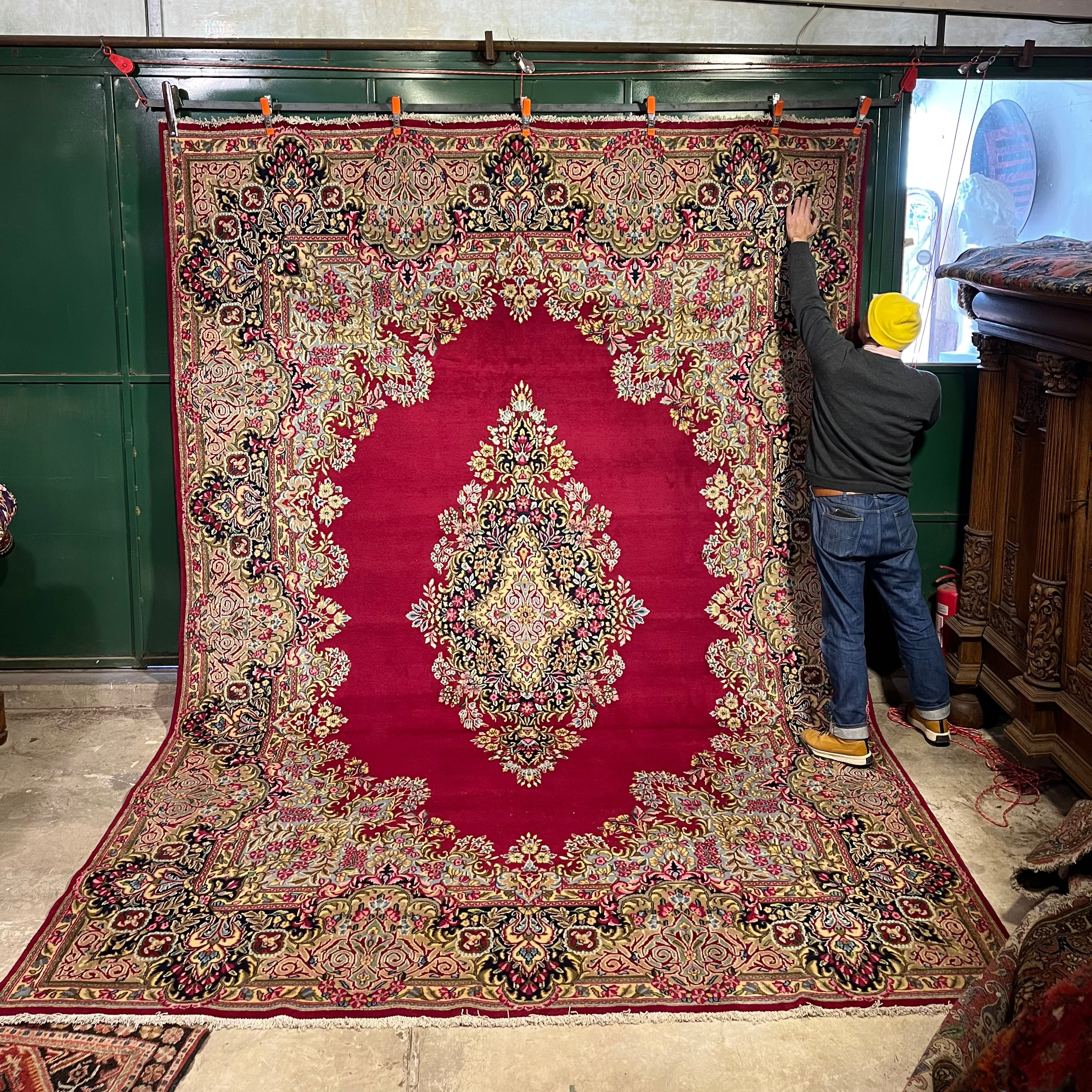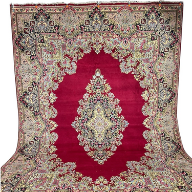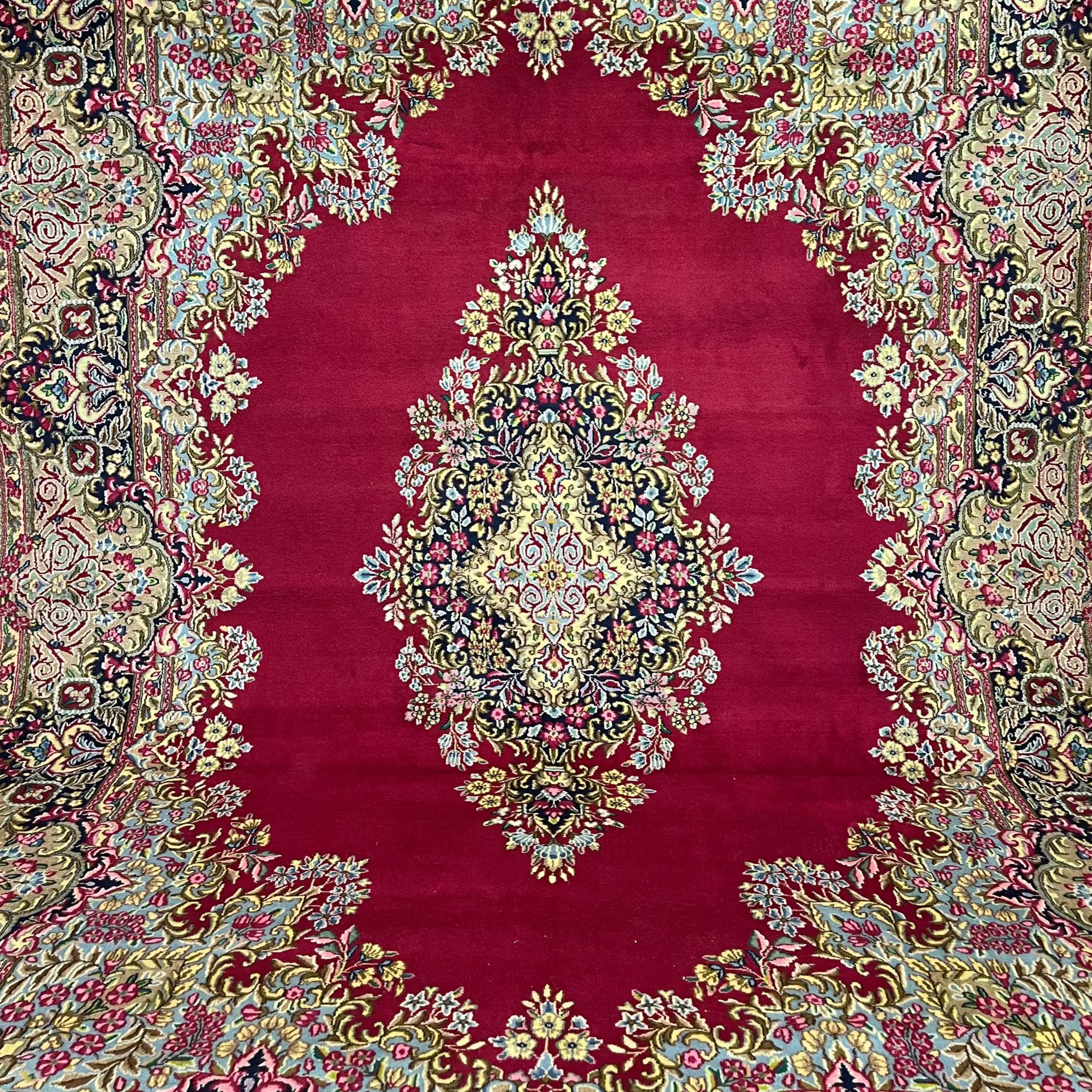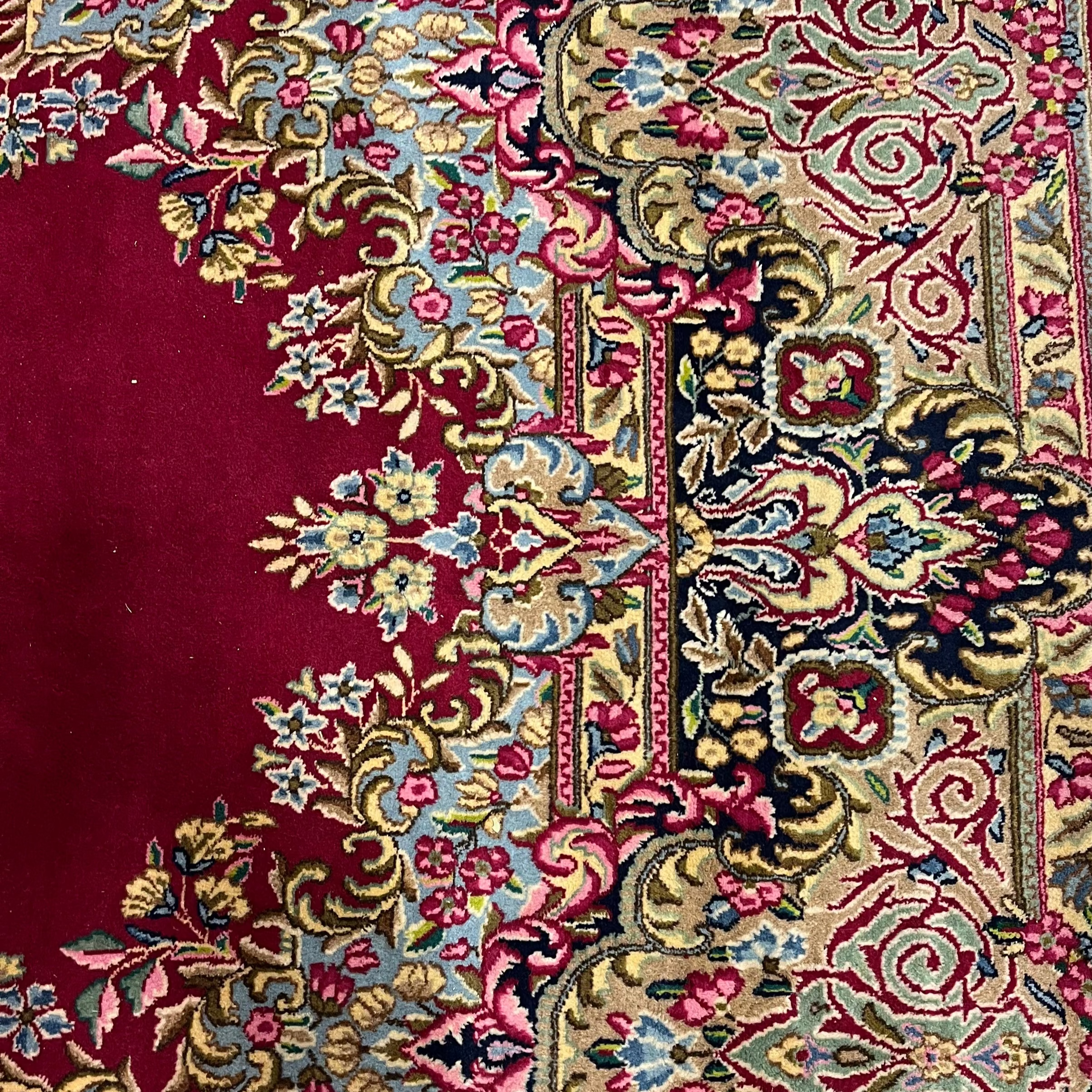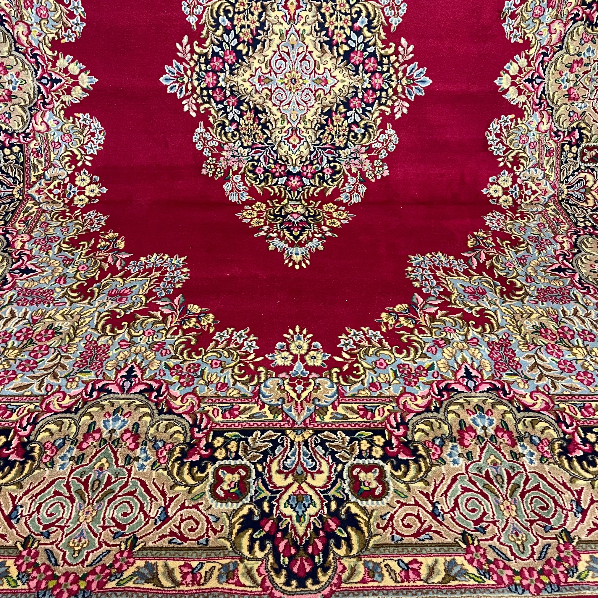 Maravillosa alfombra persa de Kirman de lana y seda de mediados del siglo XX. Hecha a mano, presenta hermosos detalles florales y patrones geométricos en llamativos tonos rojizos, azules y rosas que realzan su diseño gracias al contraste que genera. Se encuentra en perfecto estado.