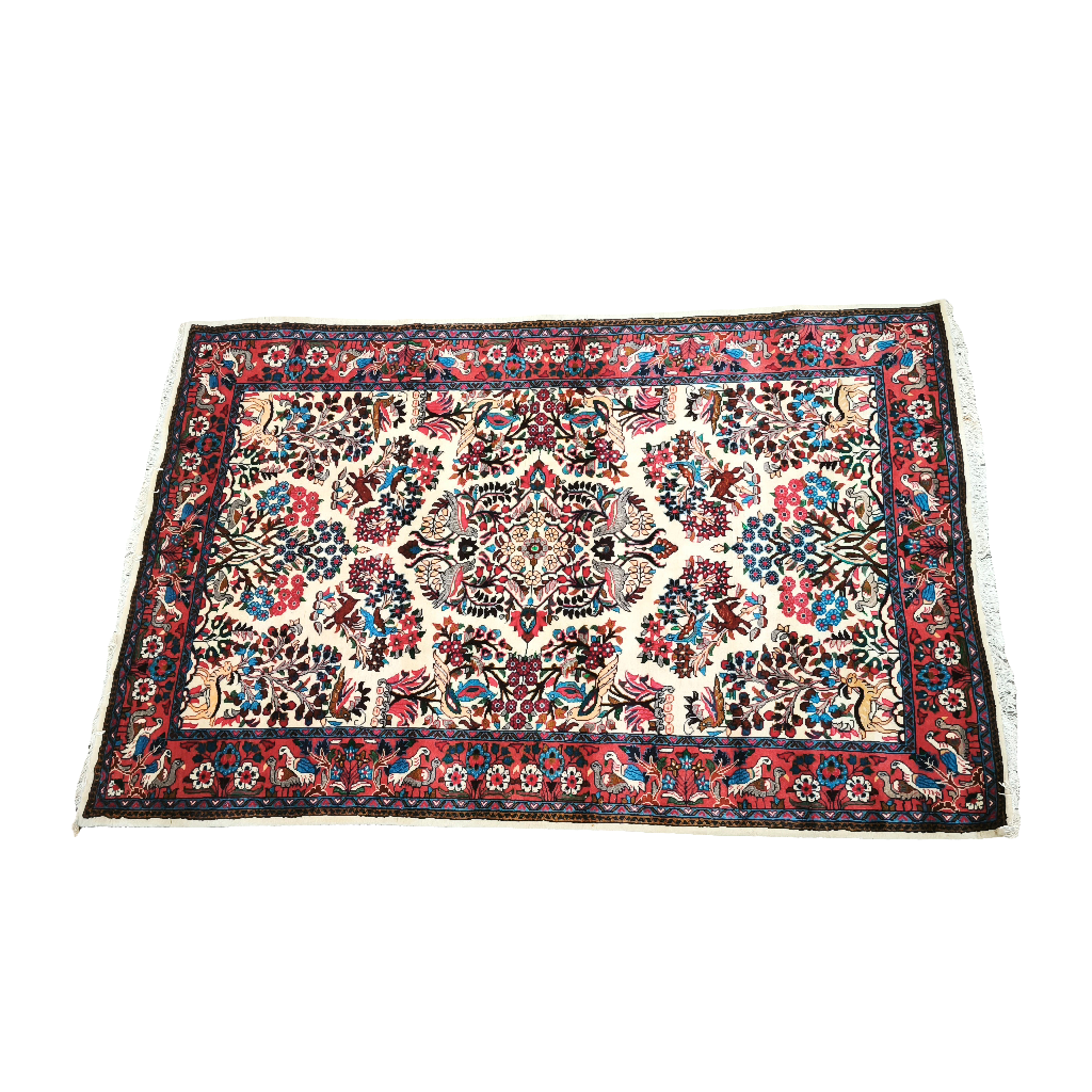 Hermosa alfombra anudada a mano con diseño floral y trazos de estilo clásico sobre fondo blanco que resaltan los tonos rojos y azules.