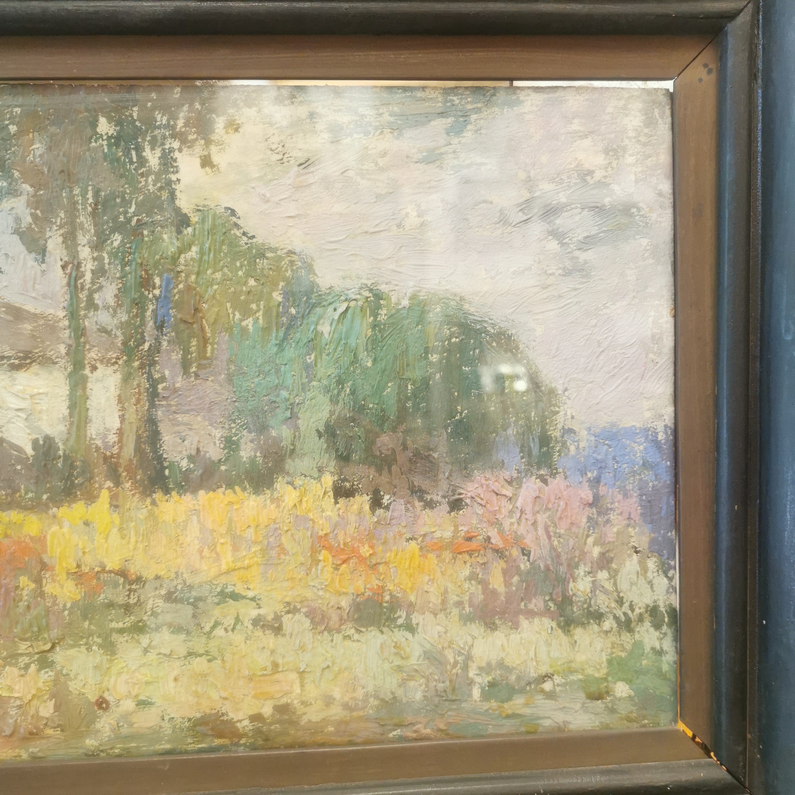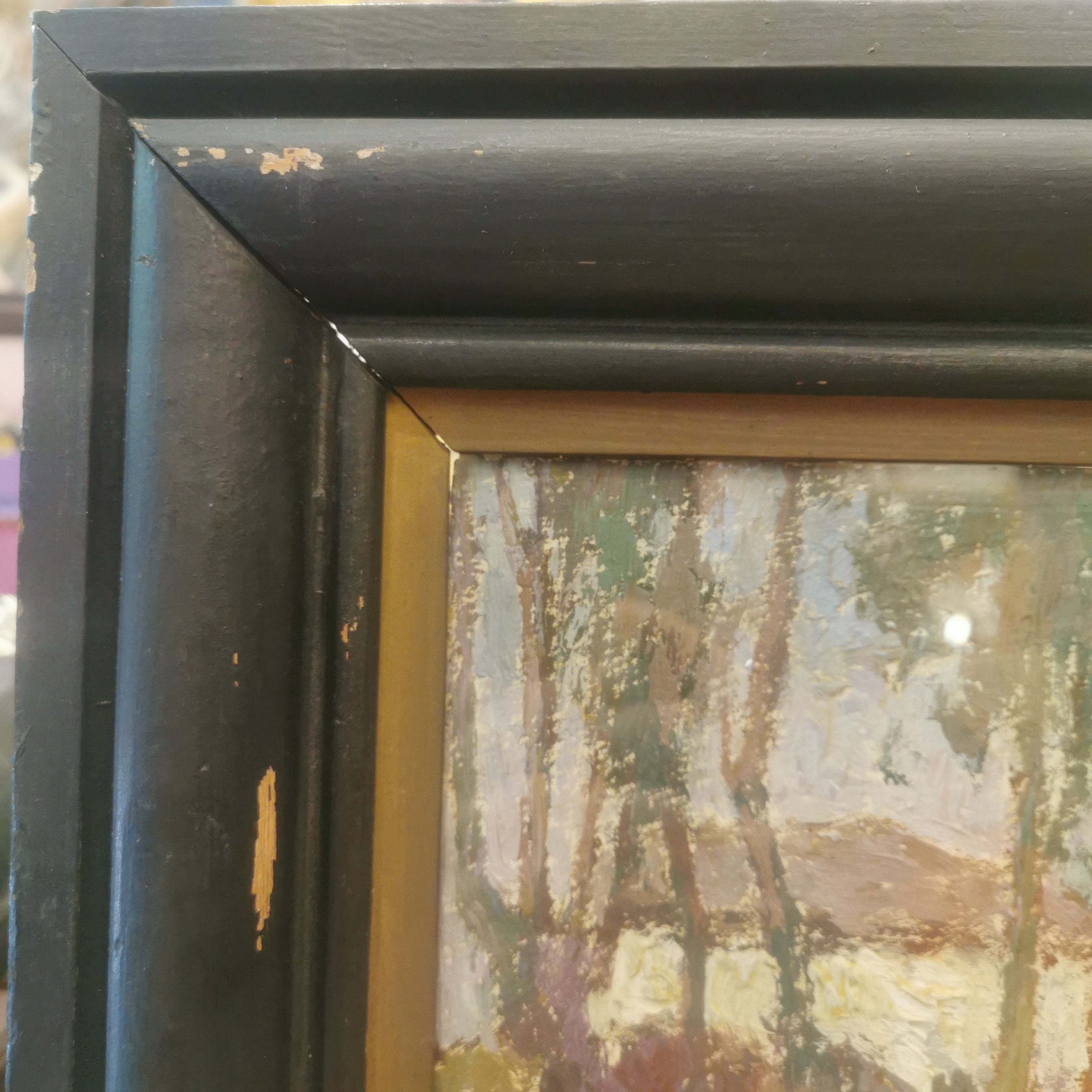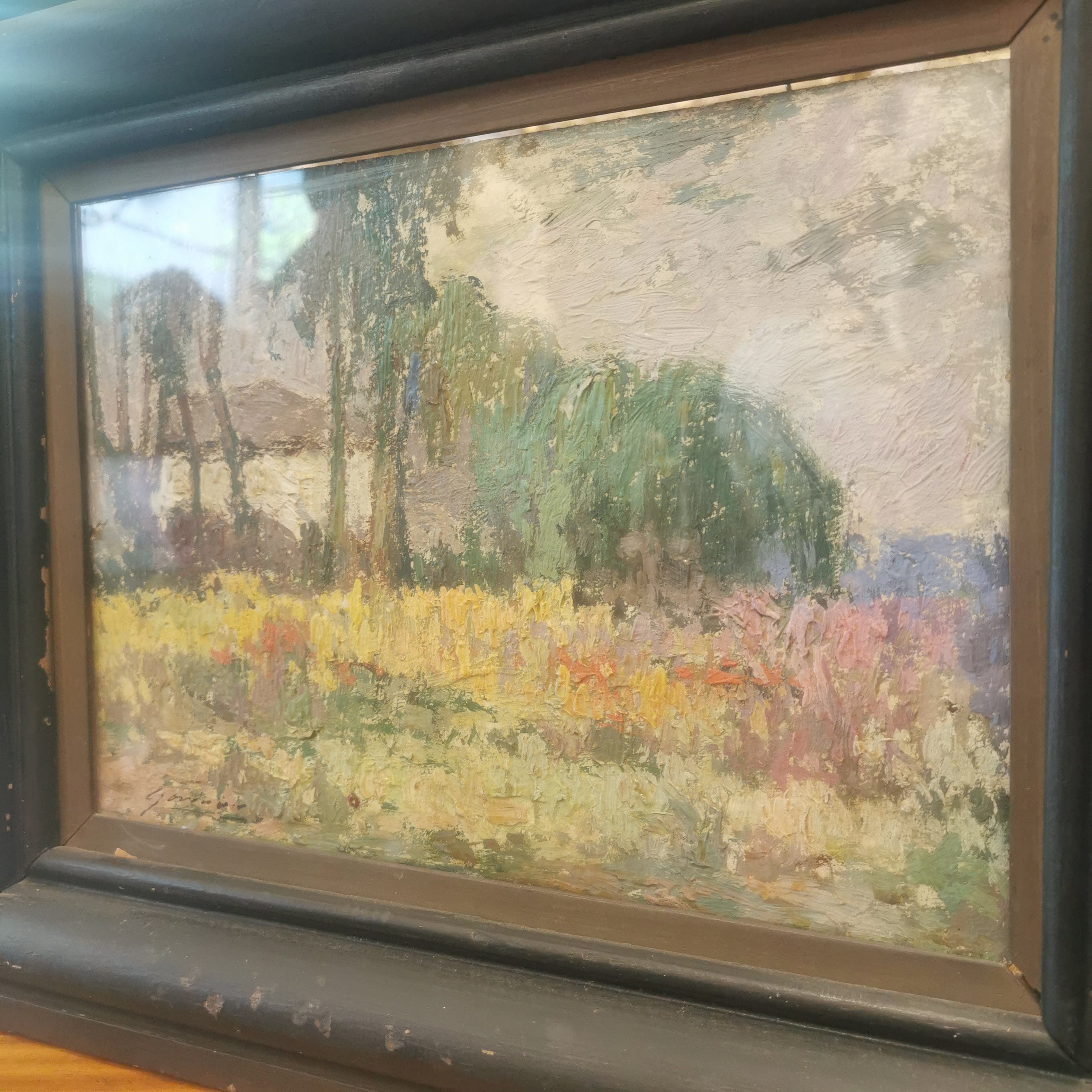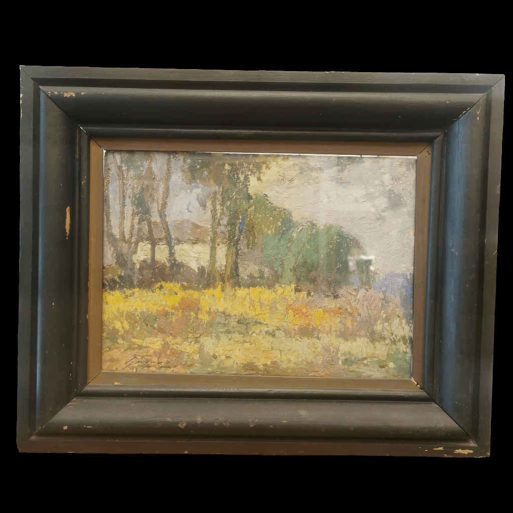 Óleo sobre cartón del artista chileno Arturo Gordon, representando un bello y tranquilo paisaje. . La obra está enmarcada en un marco de madera pintado negro con algunos desgastes y la obra está protegida con vidrio.