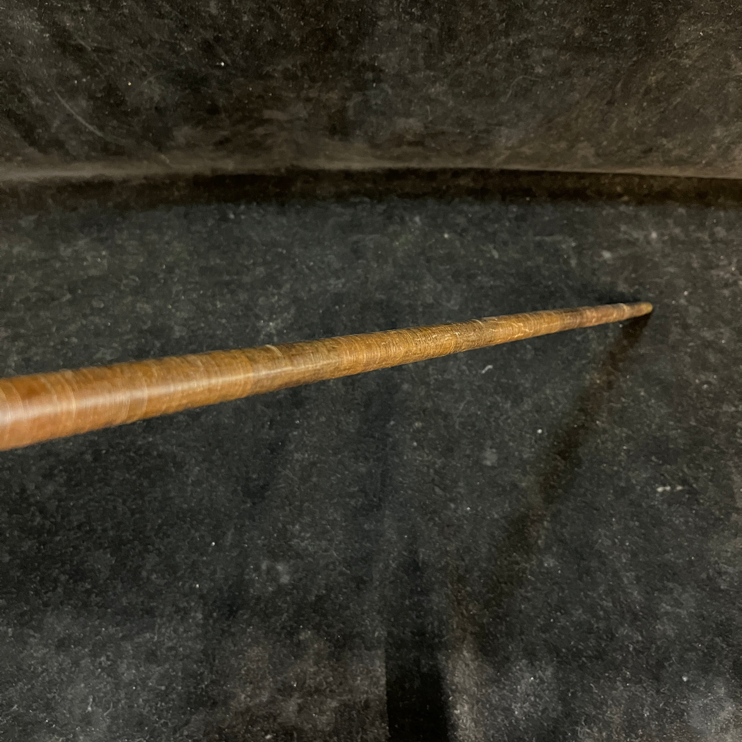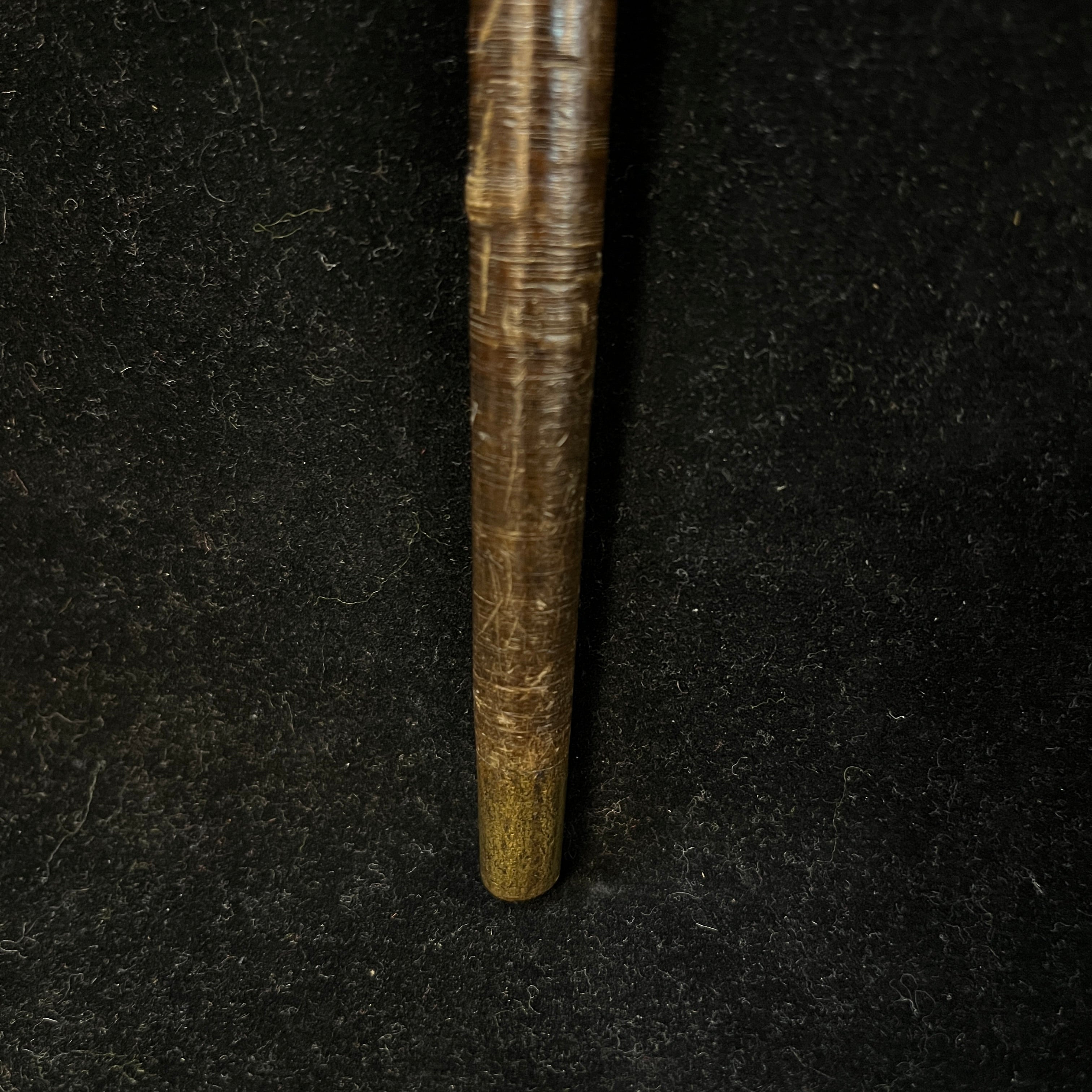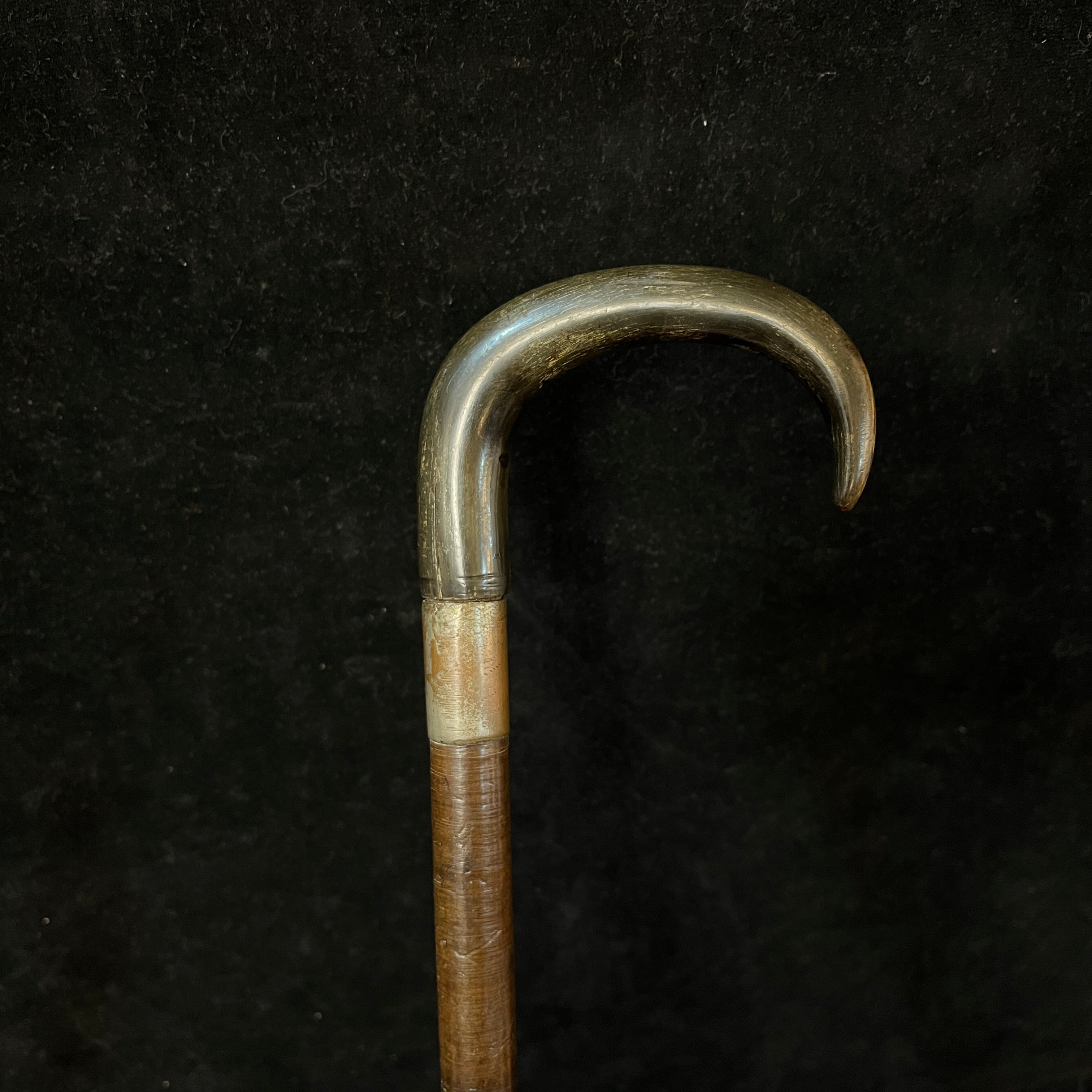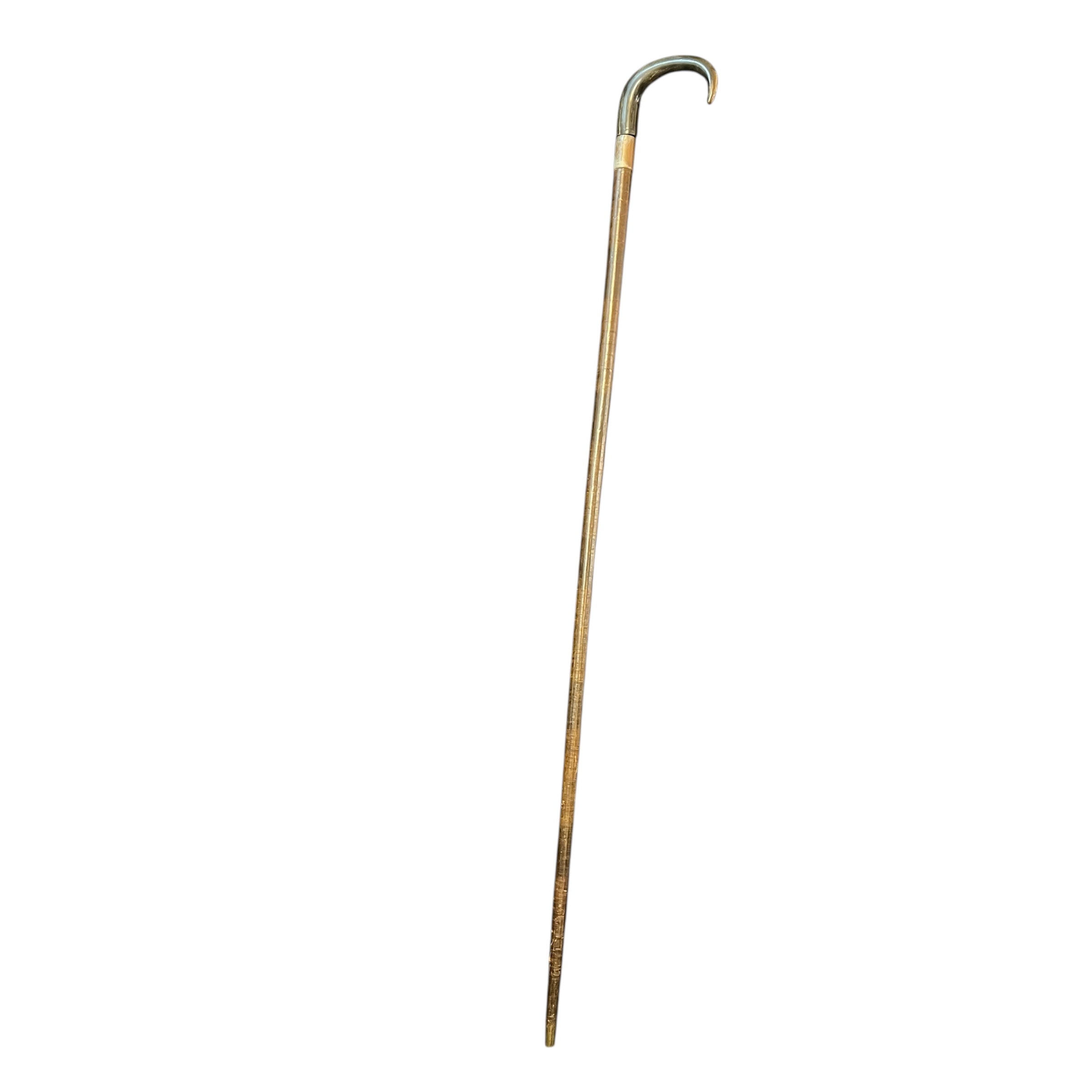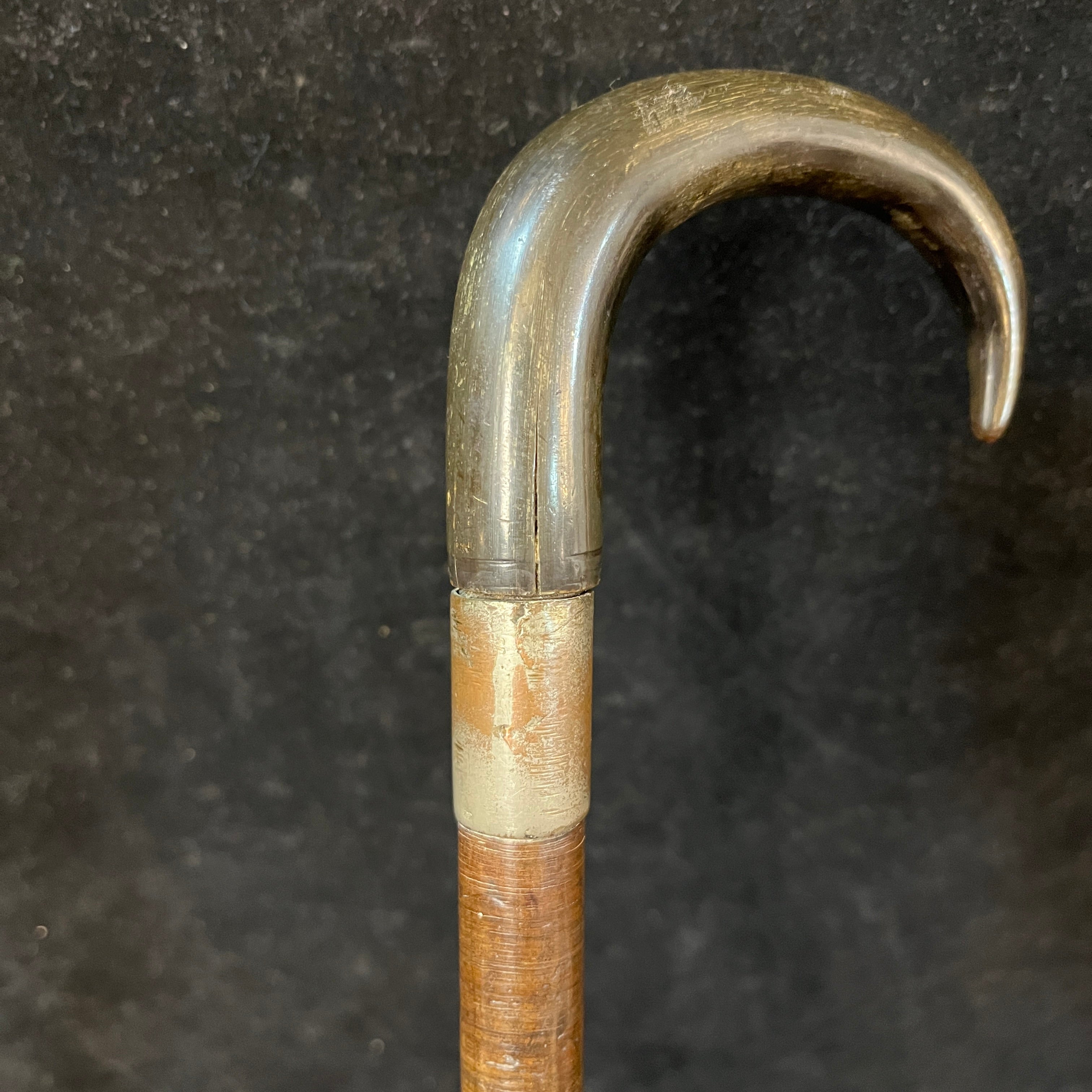Elegante bastón en madera de suela y mango de cornamenta animal oscura con aplicación metálica.