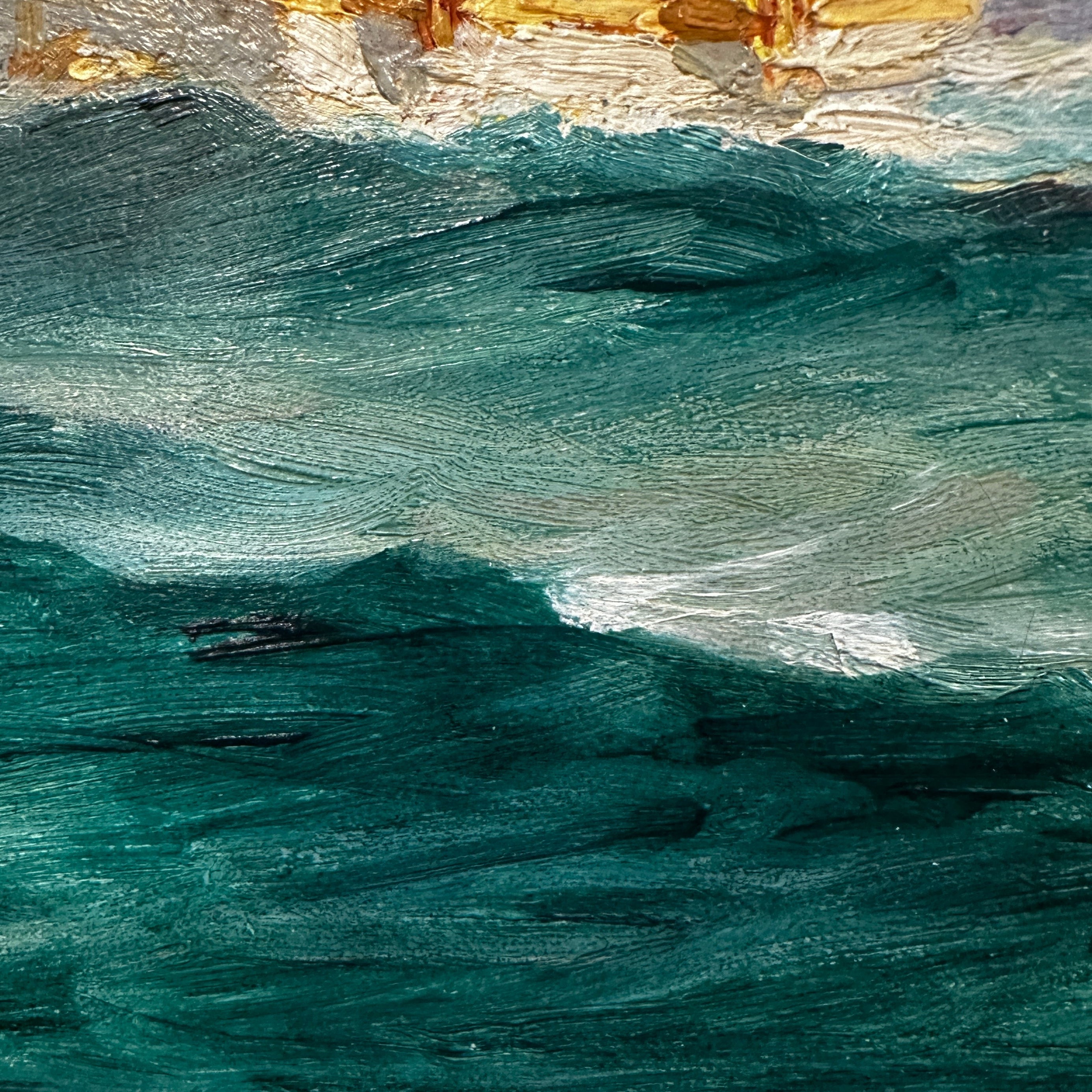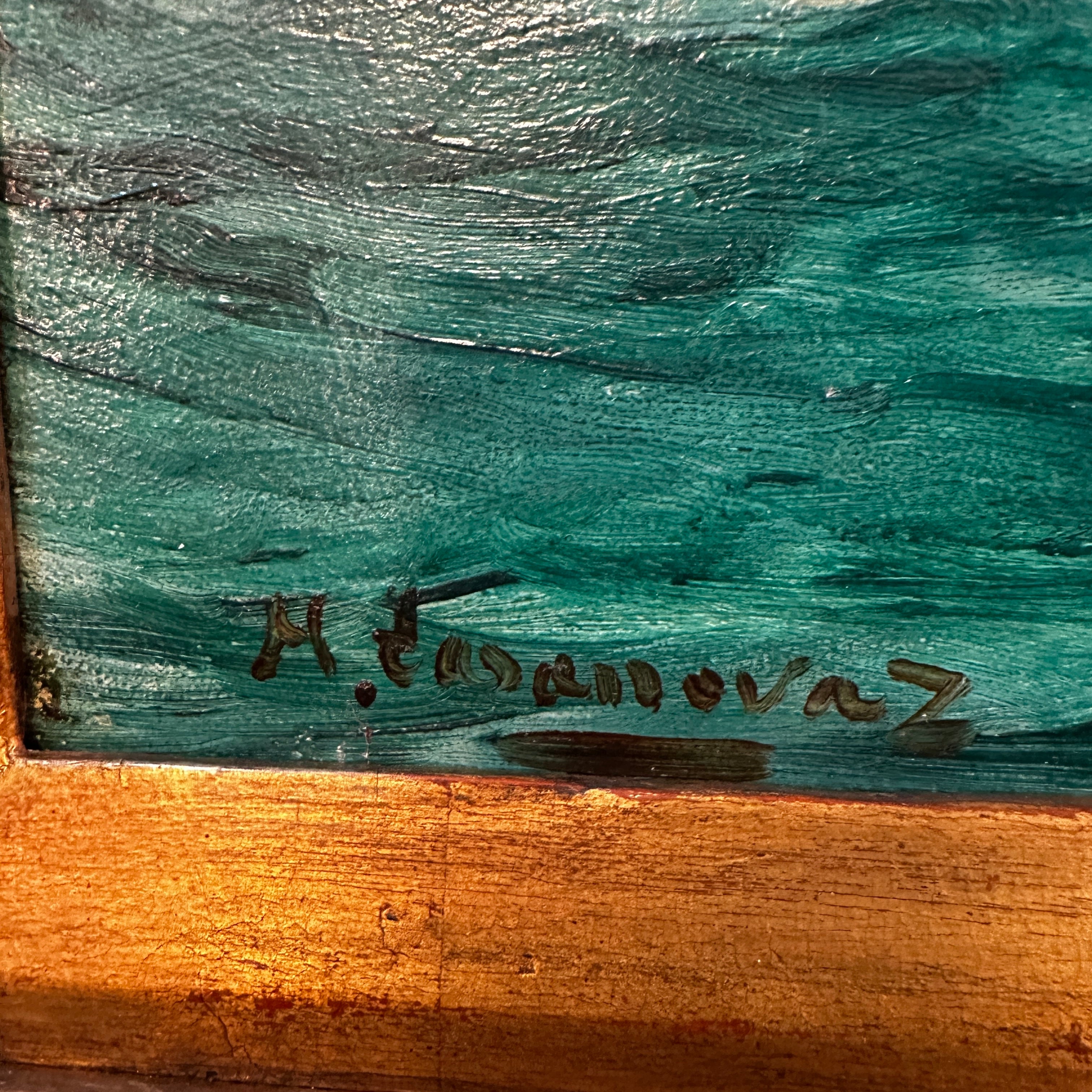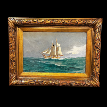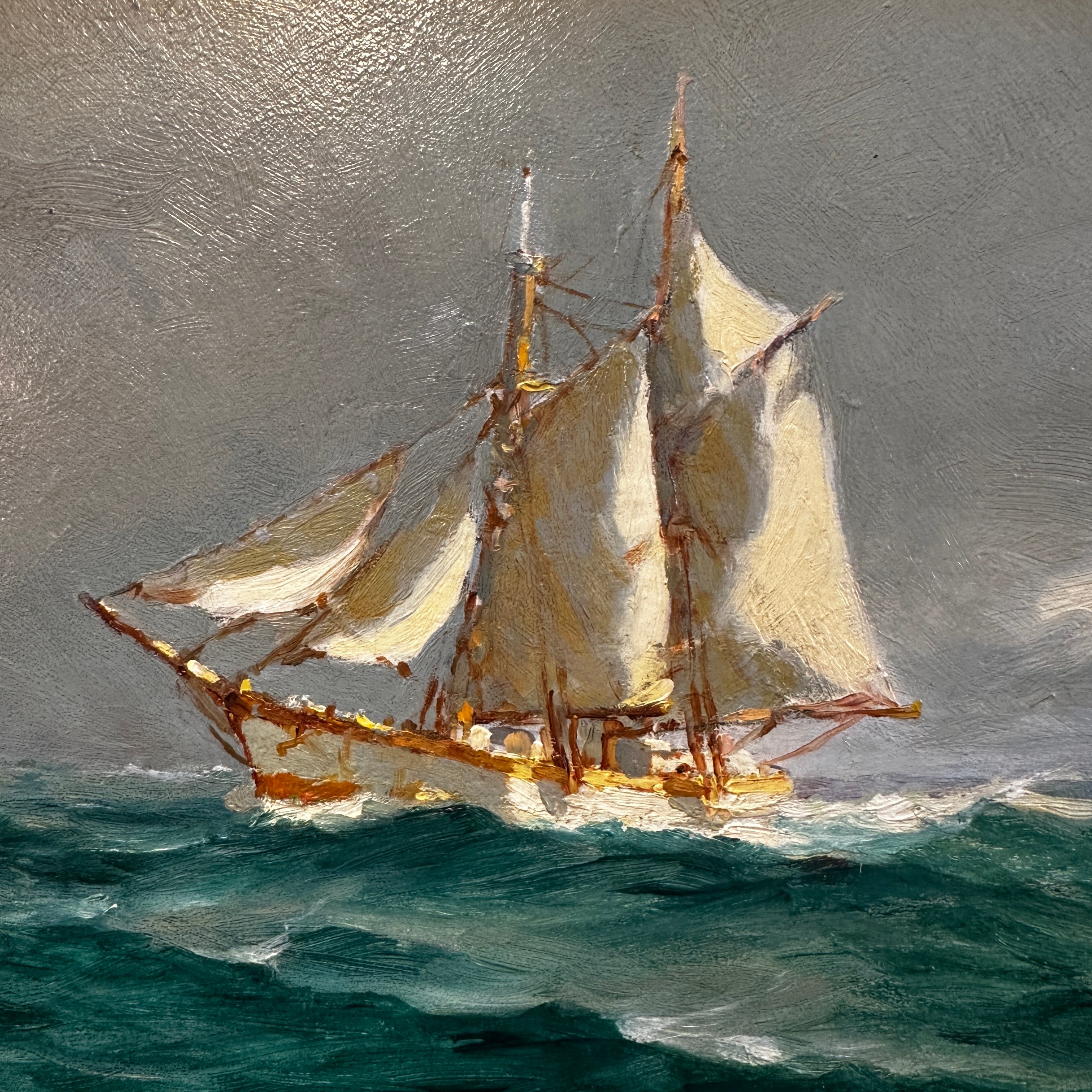 Pintura marina del pintor chileno Álvaro Casanova Zenteno (1857-1939). En el cuadro se retrata un velero de tres velas navegando en alta mar. La obra cuenta con un marco de madera tallada pintada de dorado.