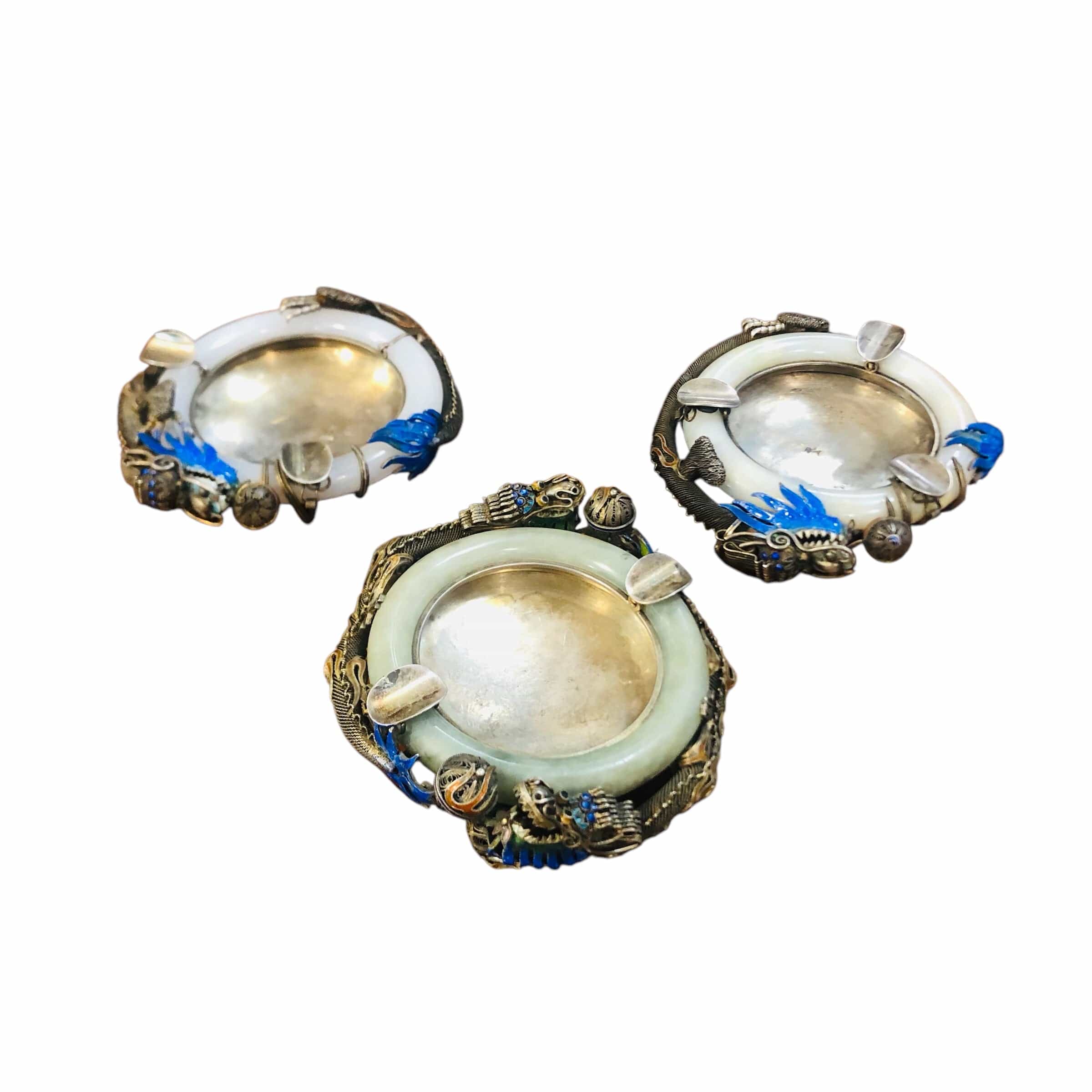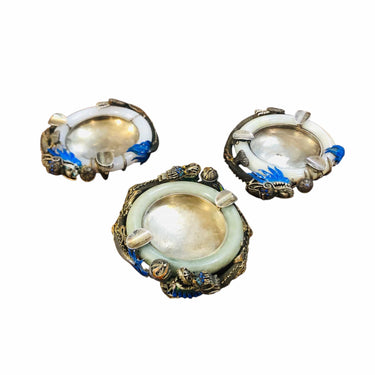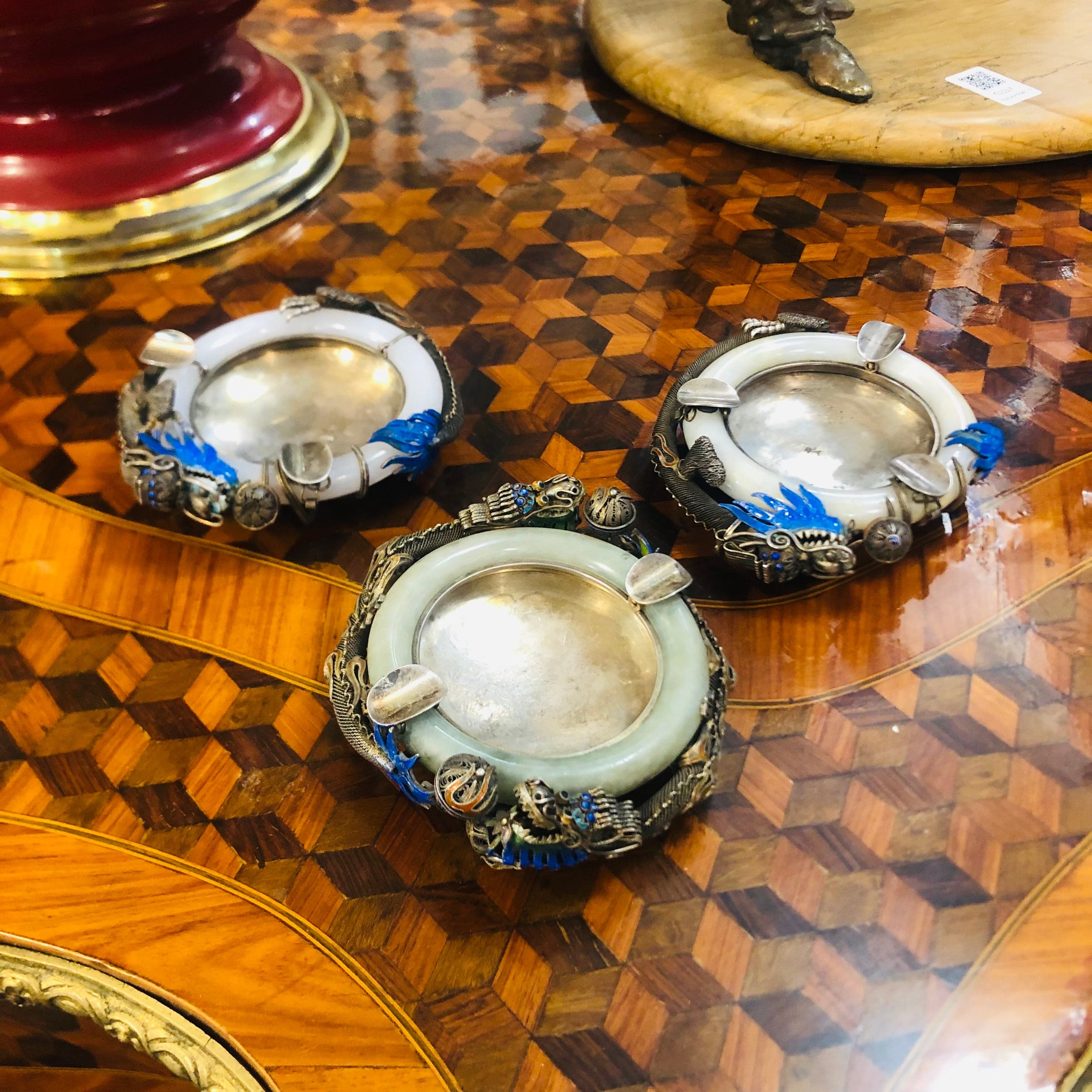 Hermosos y especiales ceniceros de metal plateado y jade, son tres, dos de ellos de igual diseño y un tercero similra pero con detalles diferentes, en el tallado y color.