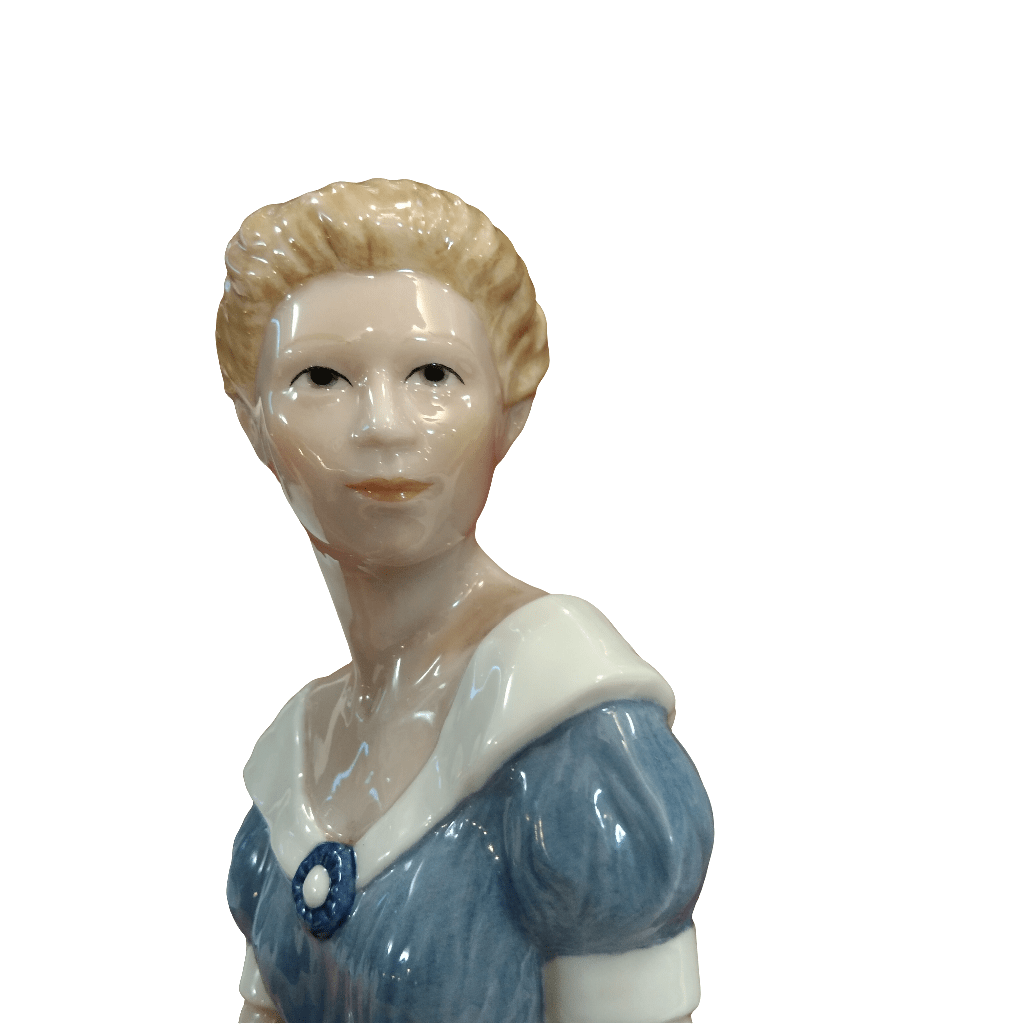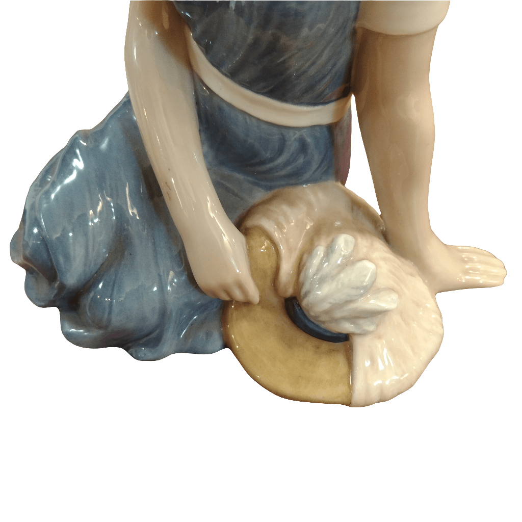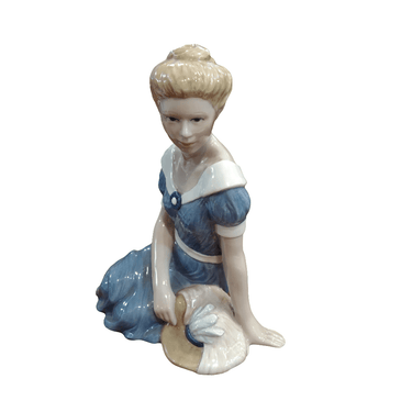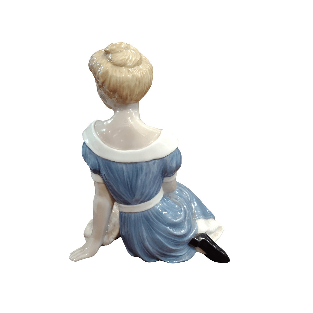 Bella figura de porcelana representando a una mujer descansado, recostada junto a su sombrero. La mujer tiene un vestido azul con detalles blancos todo pintado a mano.