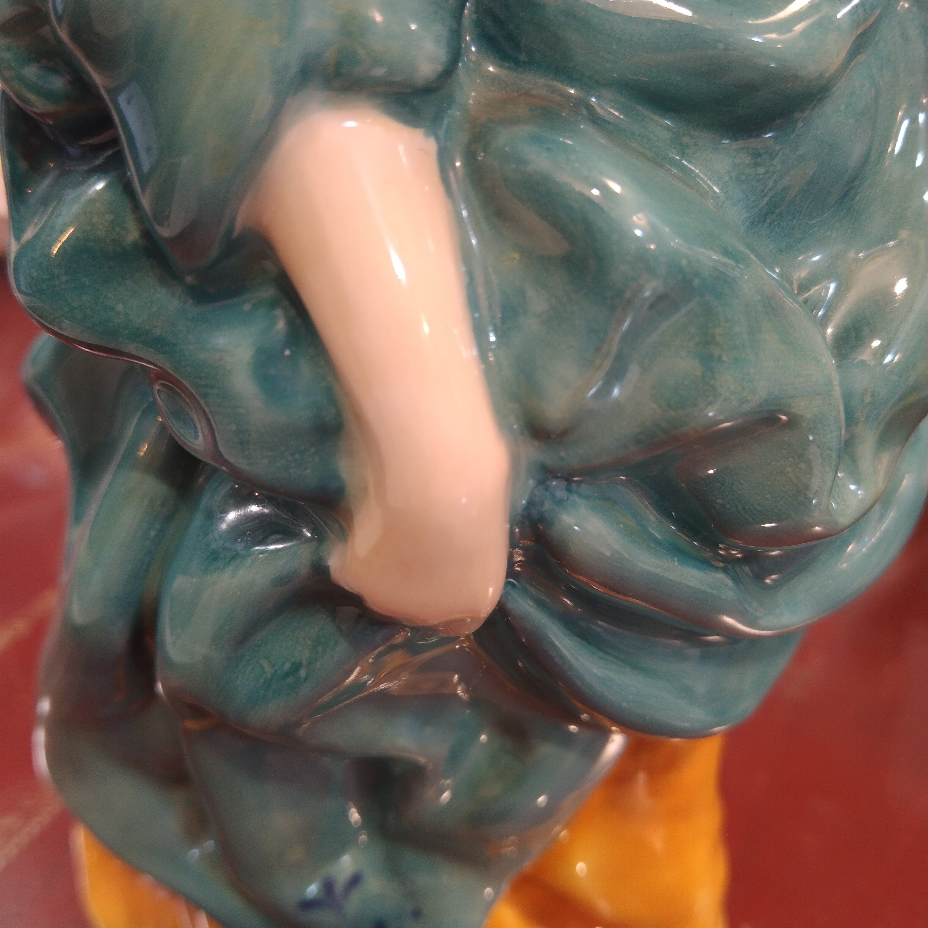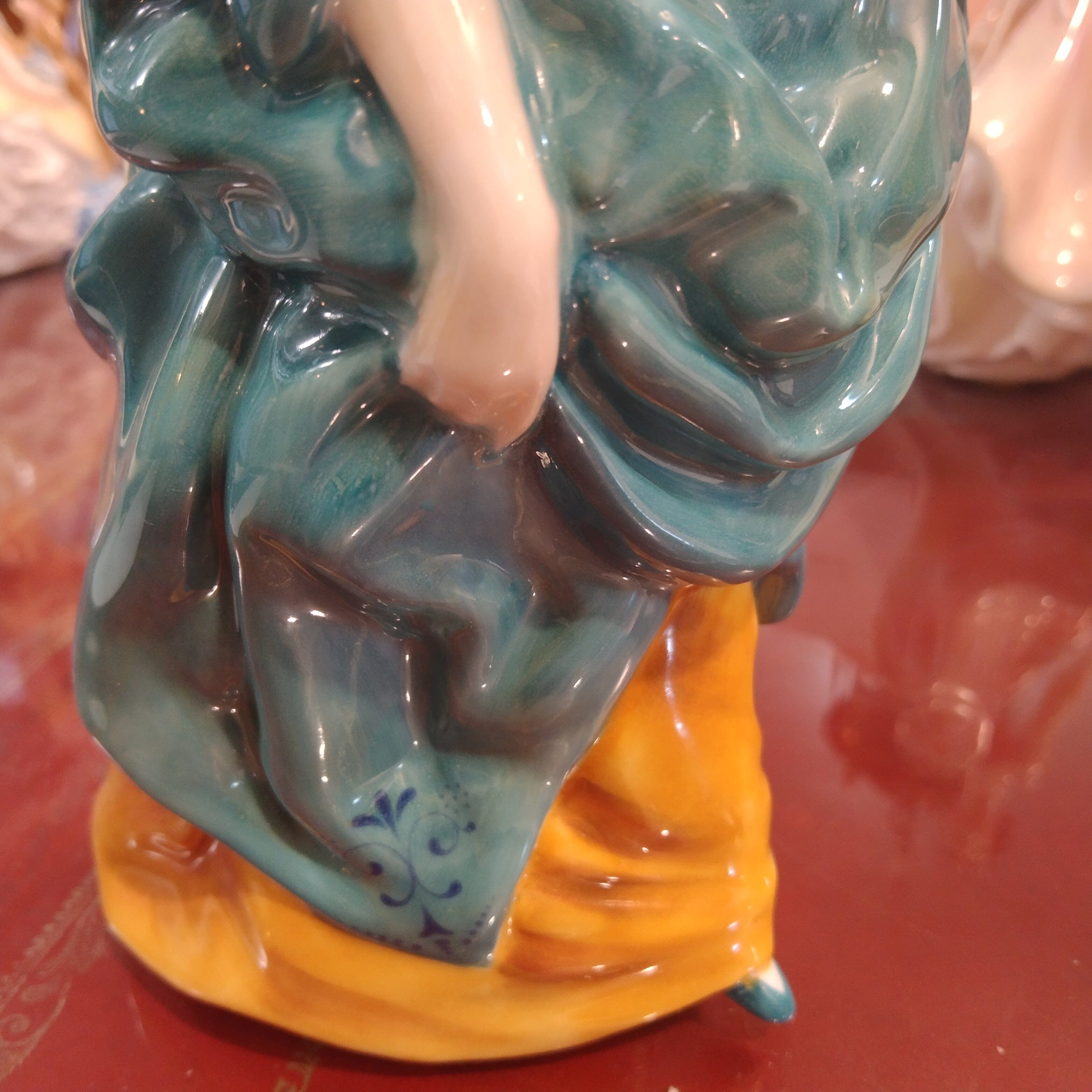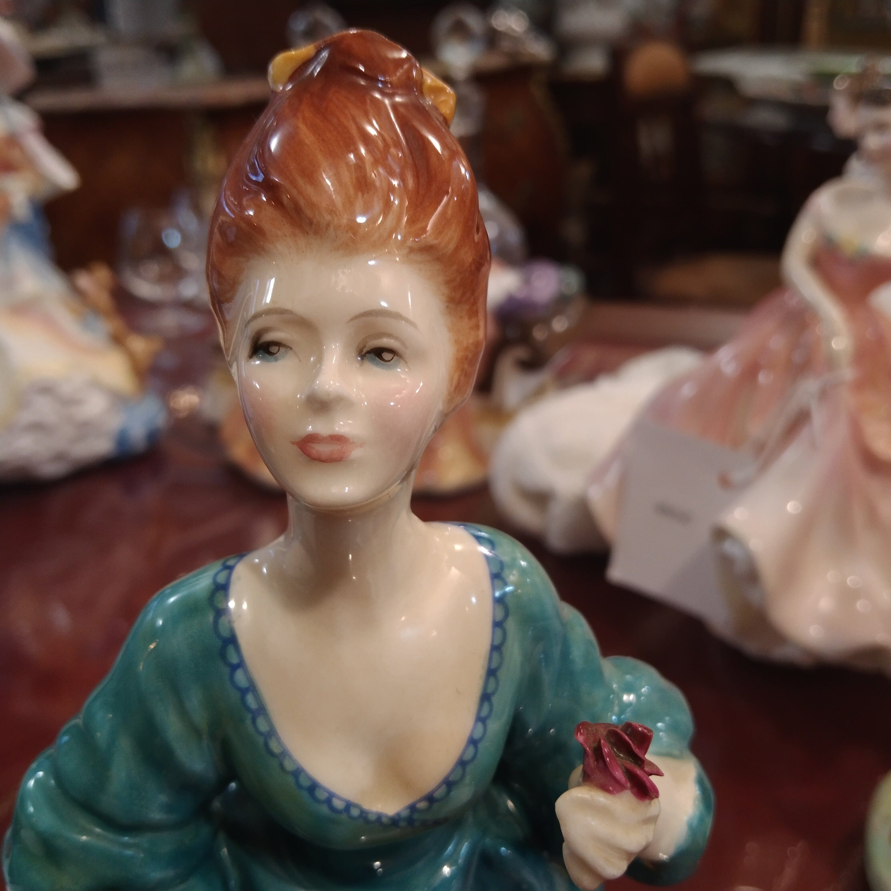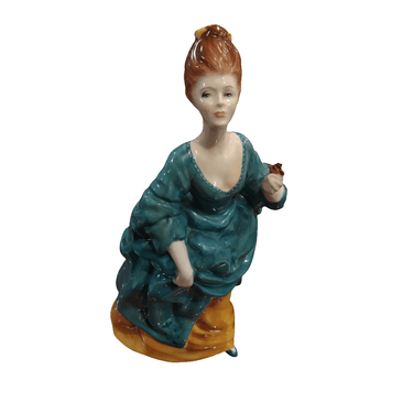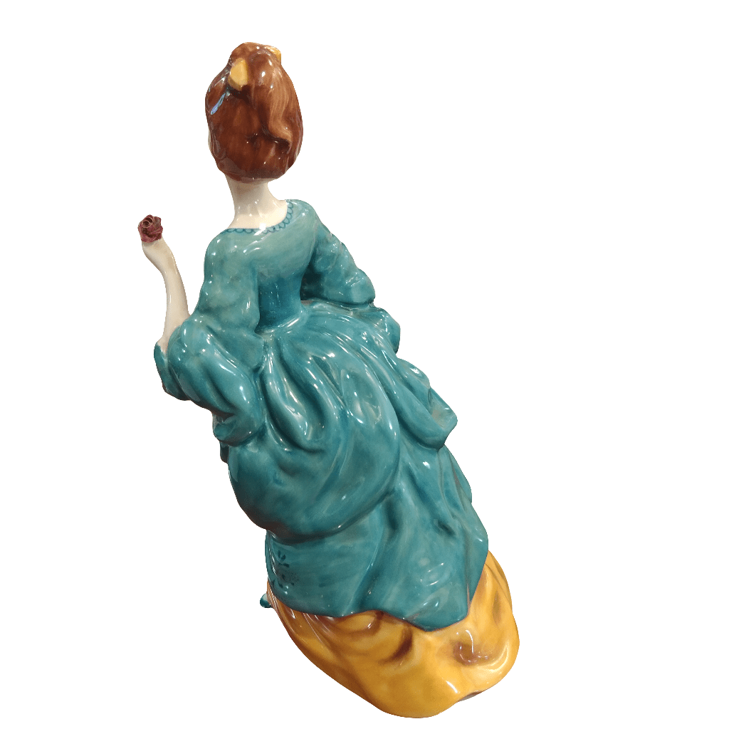 Linda figura de porcelana antigua de la marca inglesa Royal Doulton, fabricada y pintada a mano en 1971. La figura representa a una mujer noble con una rosa en la mano, vestido azul y naranja, y un peinado de época.