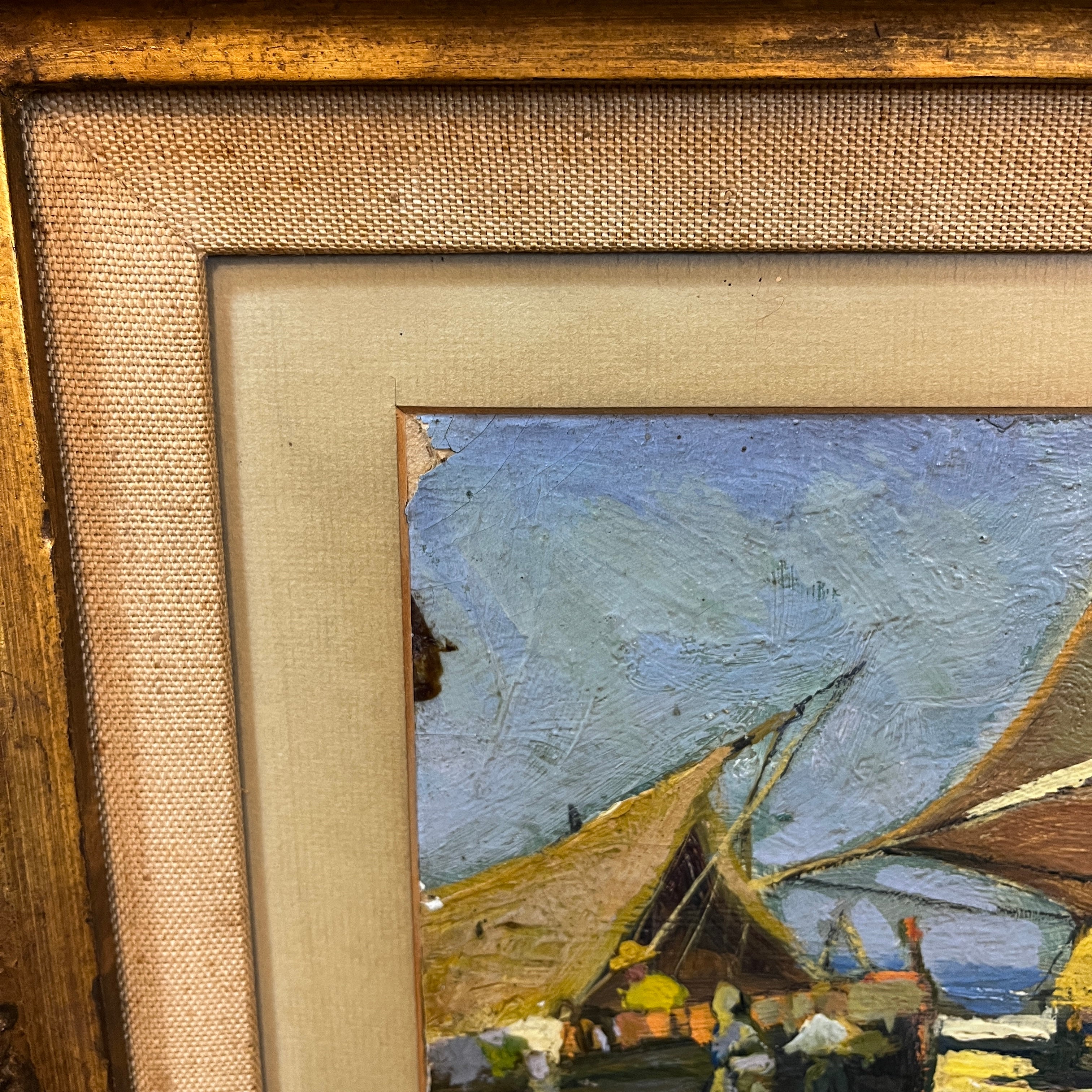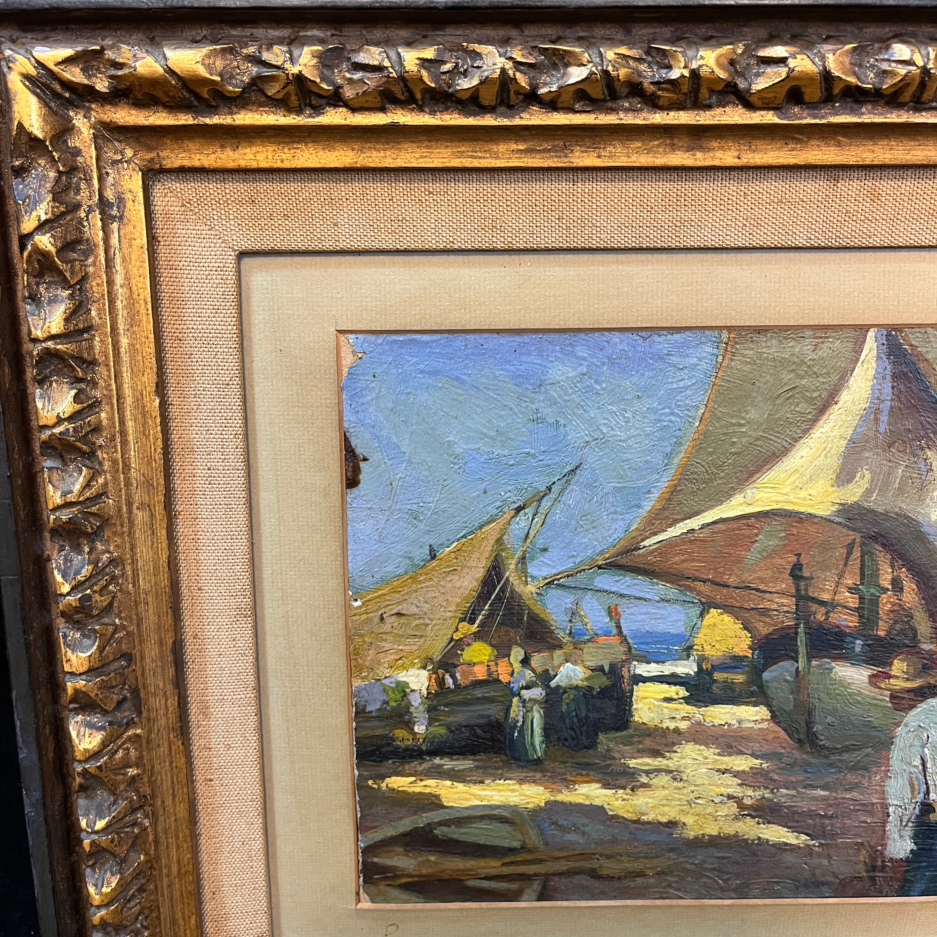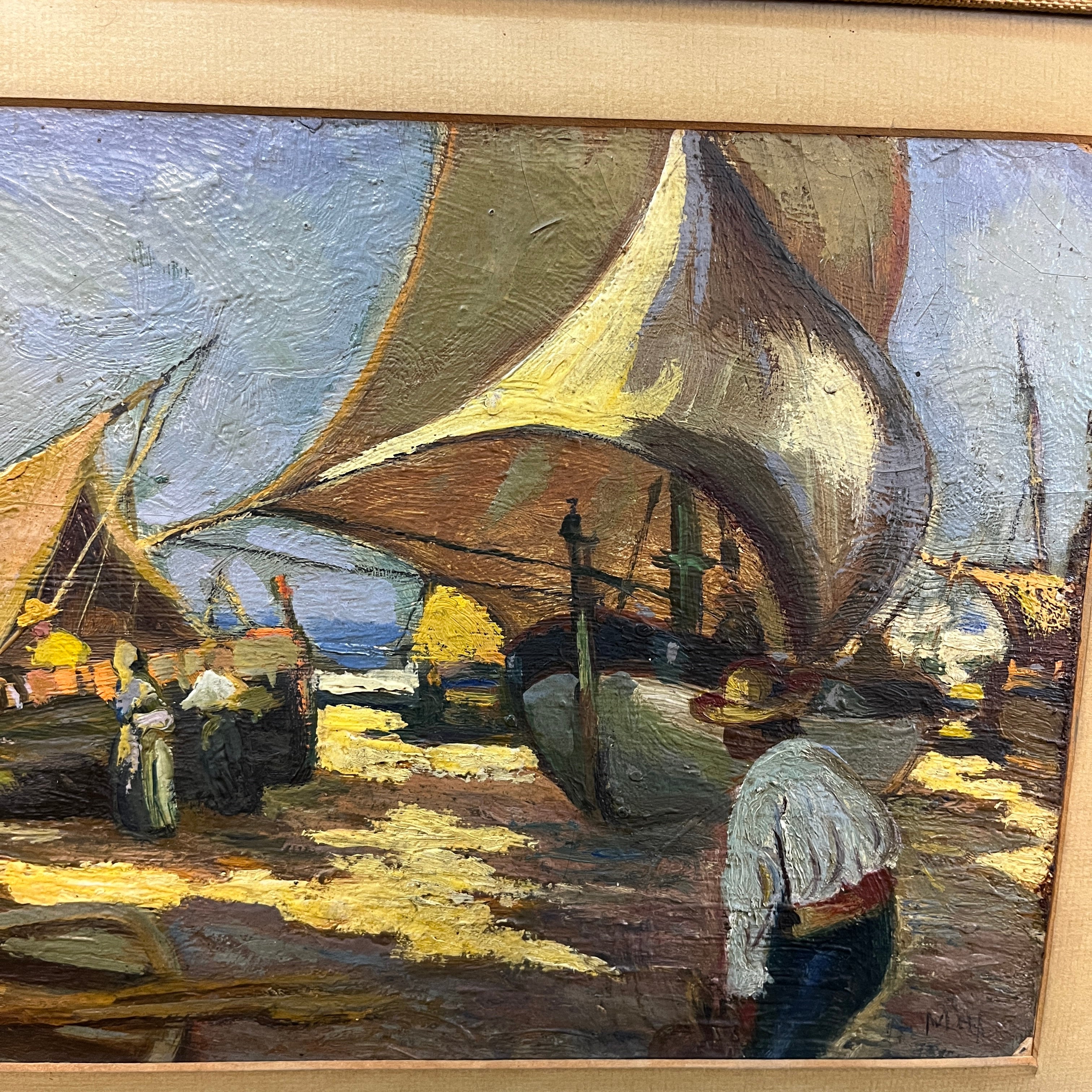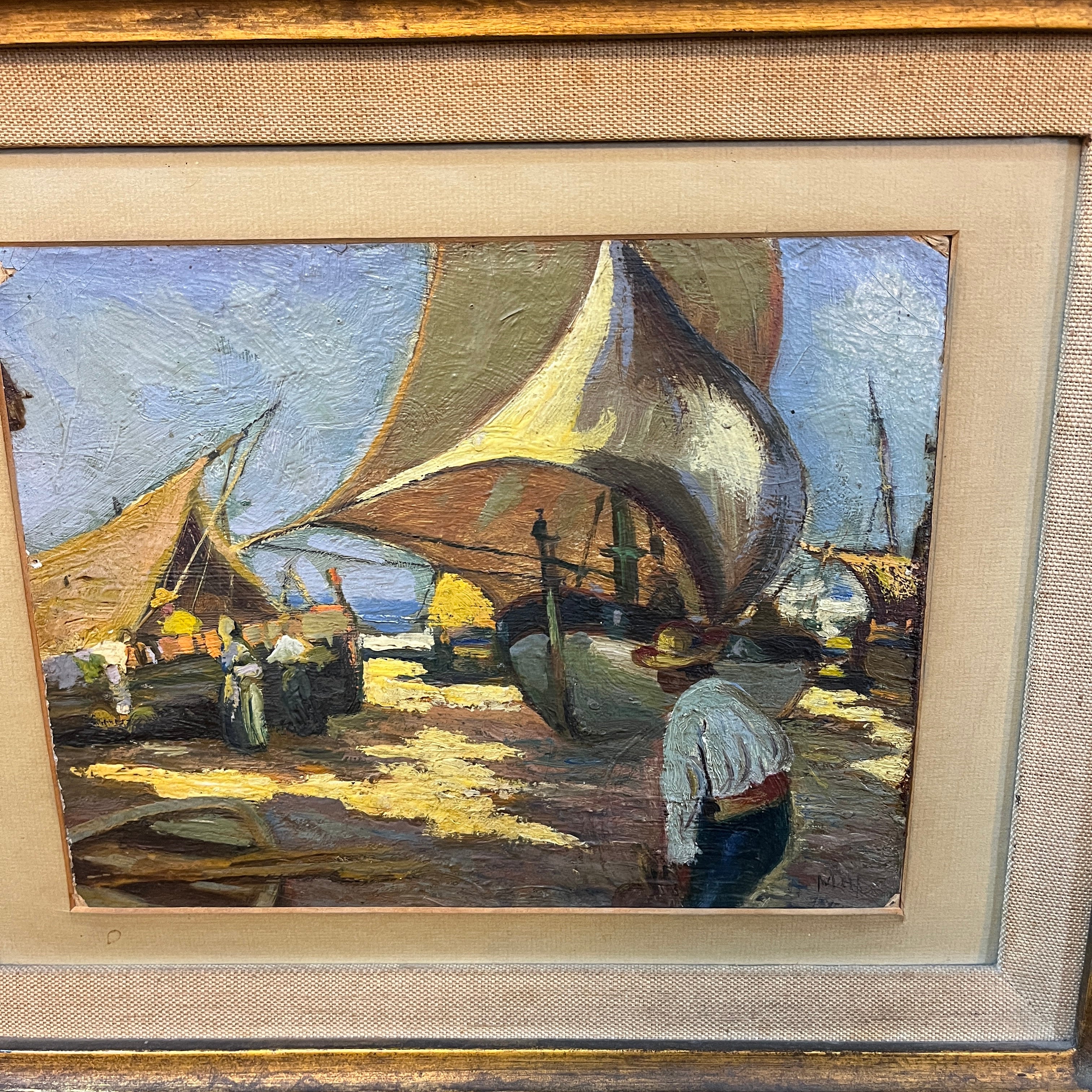Óleo sobre madera, de firma ilegible, representando una escena costera, en la que pescadores están descargando algunos veleros en una playa. Aunque hay algunos personajes e el cuadro, son las velas, una de ellas inclinada por el viento, las que se vuelven protagonistas de la obra. Se trata de una escena capturada con mucho movimiento, delicadeza y un agudo trabajo de luz. La obra tiene un elegante marco de madera tallada en relieves y terminada en un tono dorado.