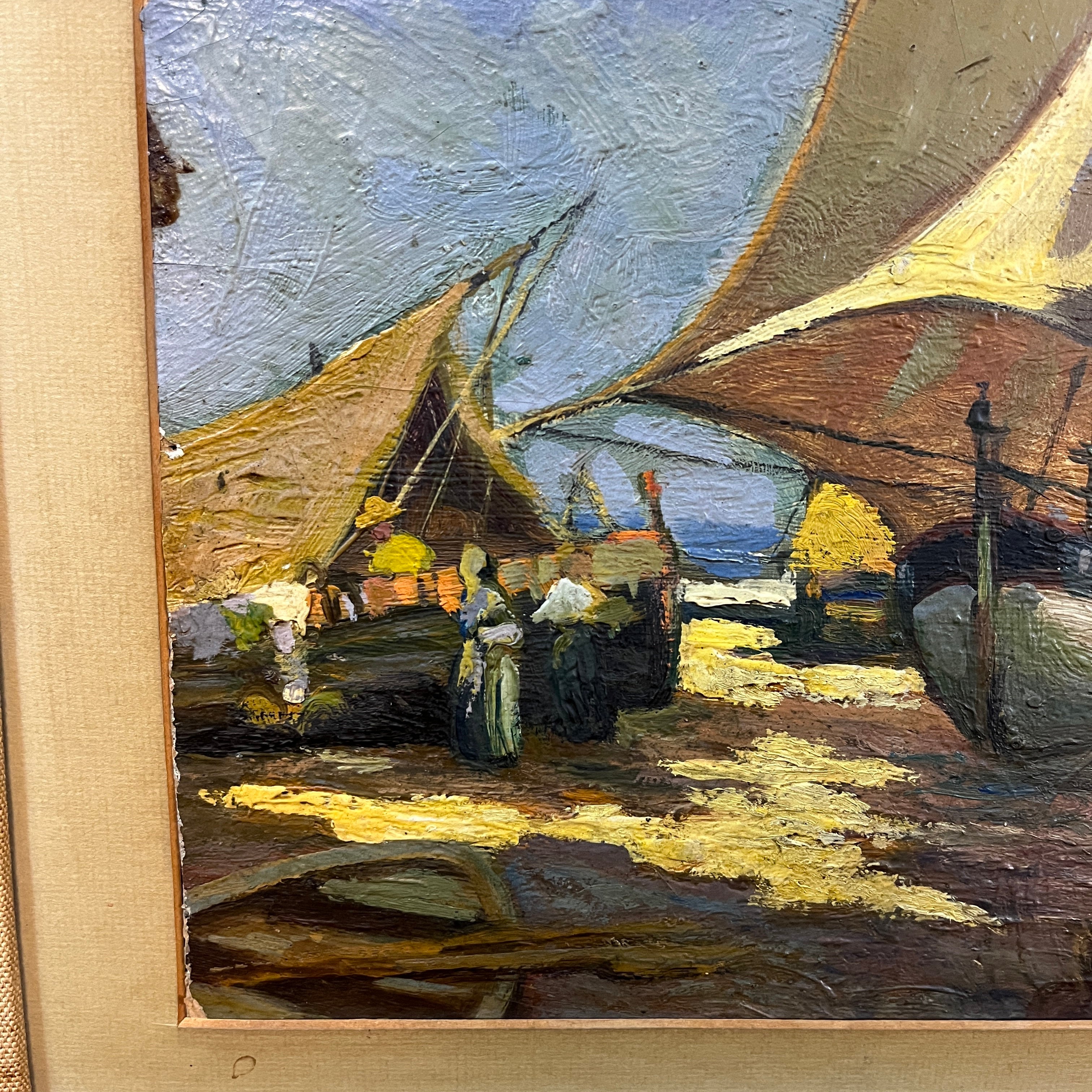 Firma ilegible - Óleo sobre madera ´Veleros en descarga`