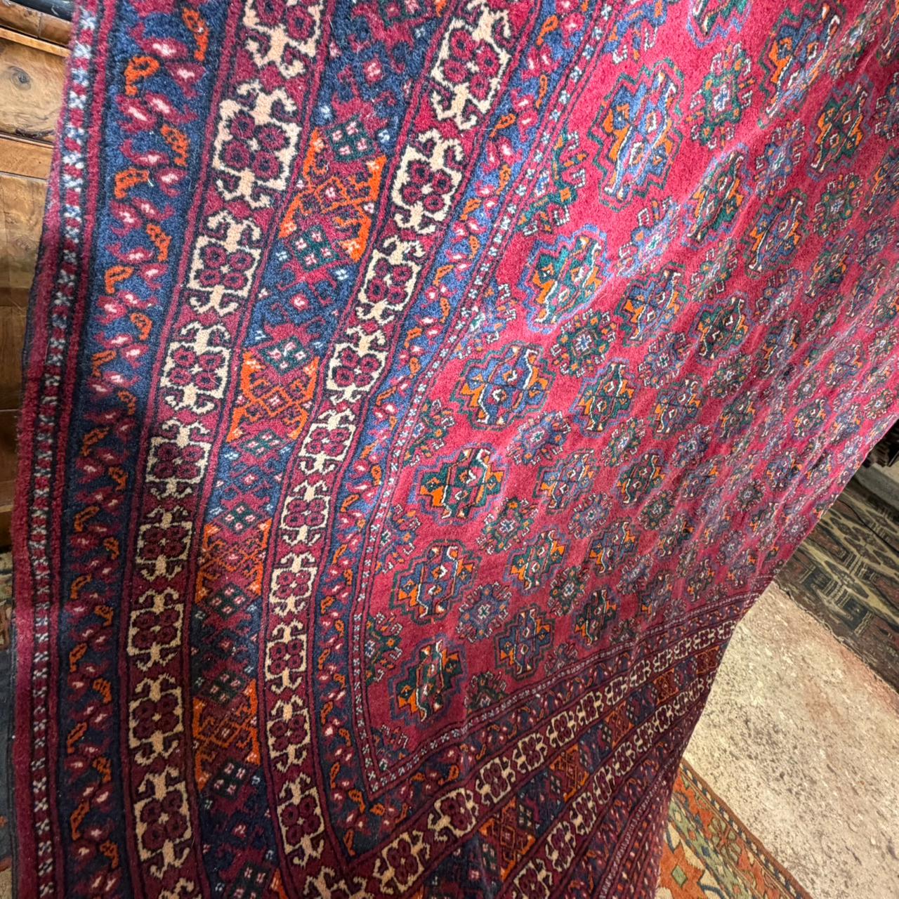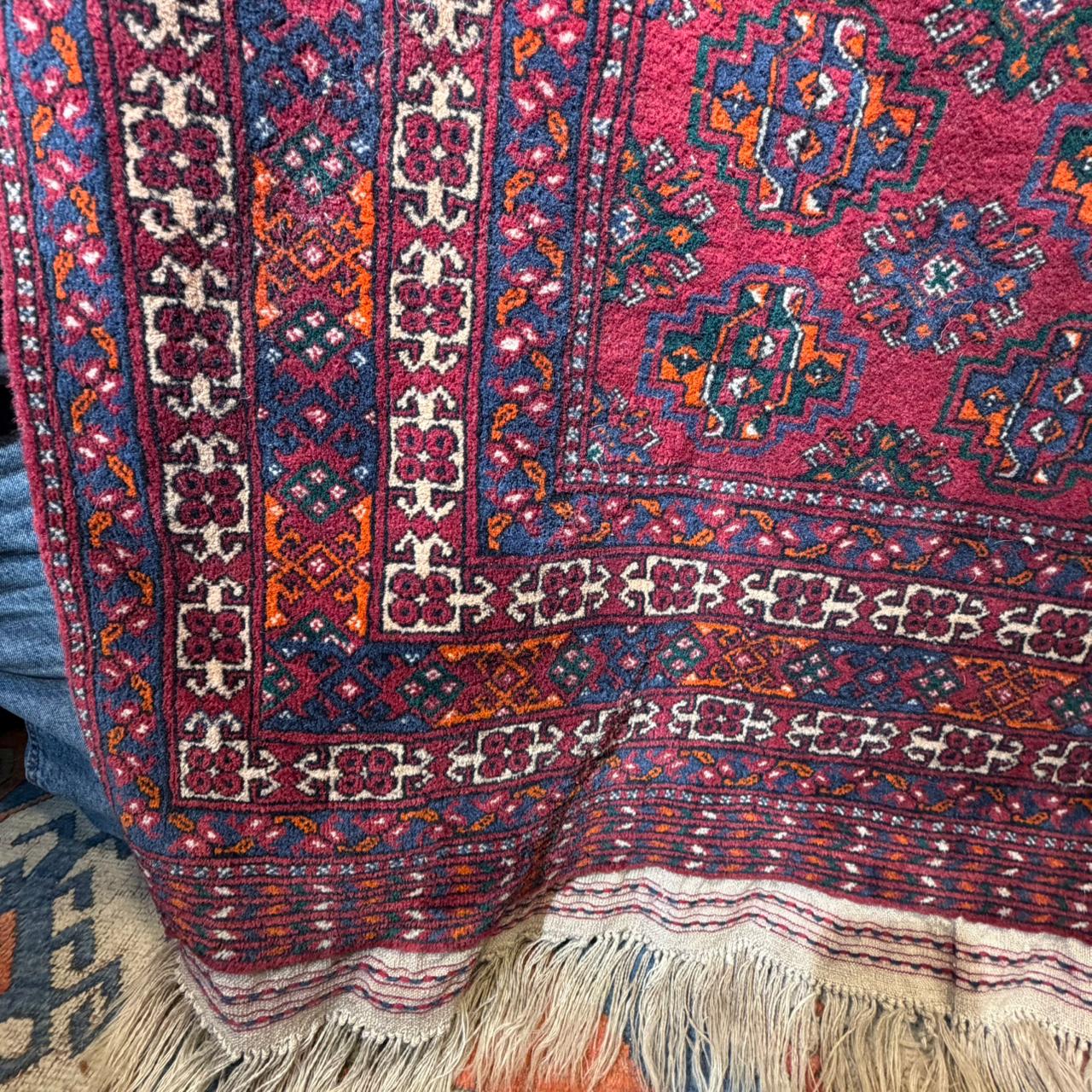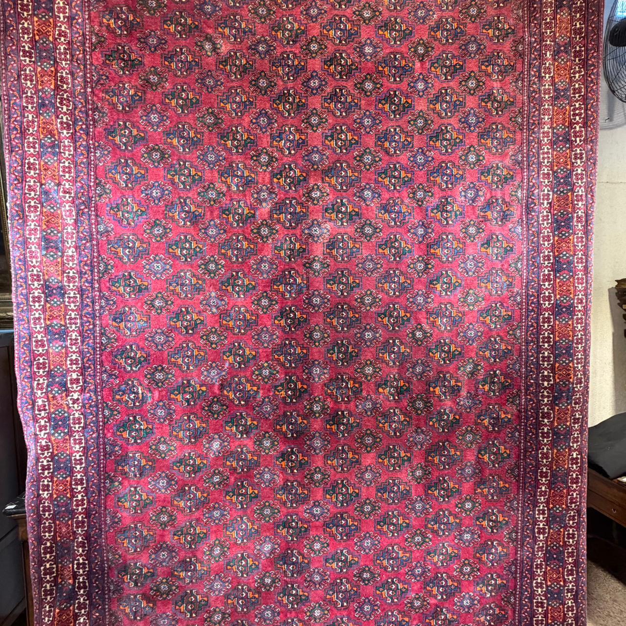 Hermosa alfombra de la tribu nómada Baluch (también se puede escribir Beluch, Balochi o Belochi) del noreste de Irán bordeando la frontera con Afganistán. Es una alfombra que se caracteriza por su especial suavidad debido a la técnica de nudaje particularmente compacto, lo que la vuelve más liviana y flexible. Se calcula que debe tener más de cuarenta años, sin embargo su excelente estado permite que pueda seguir utilizándose en salones y espacios amplios en general, donde se pueda apreciar su magnificencia. Es una pieza manufacturada, que destaca por el uso de pigmentos naturales, predominando el rojo y con pequeñas geometrías que acompañan todo el paño. La guarda juega con tonos azul cobalto y otros terrosos.