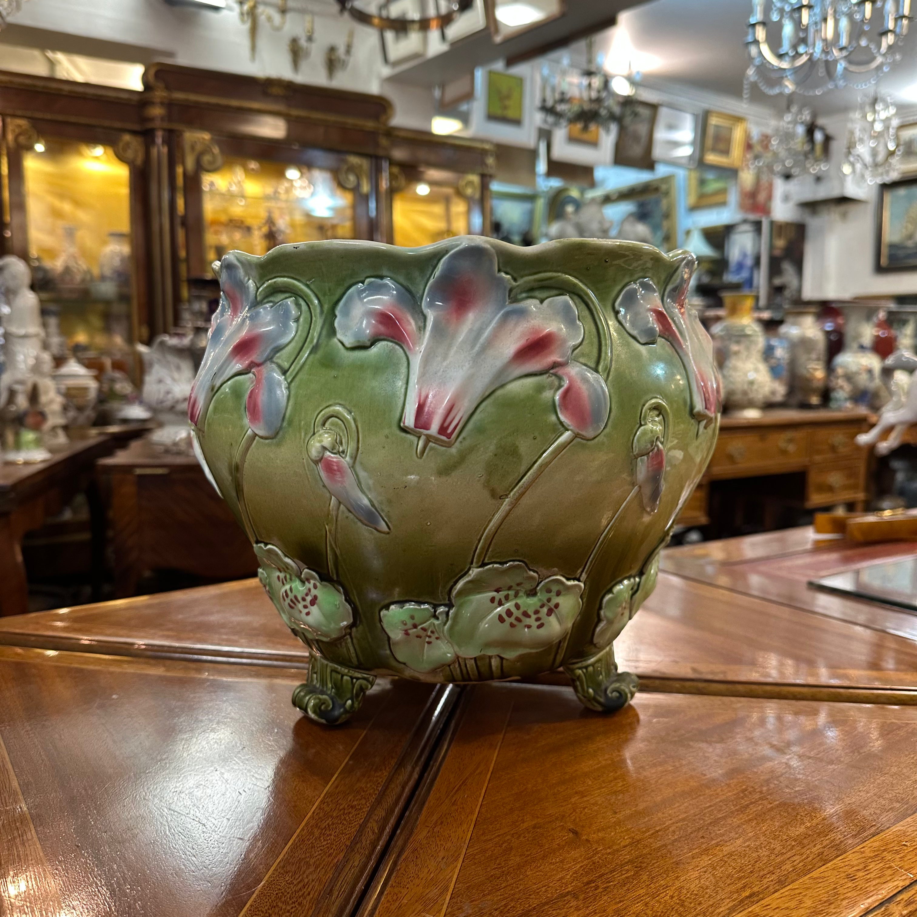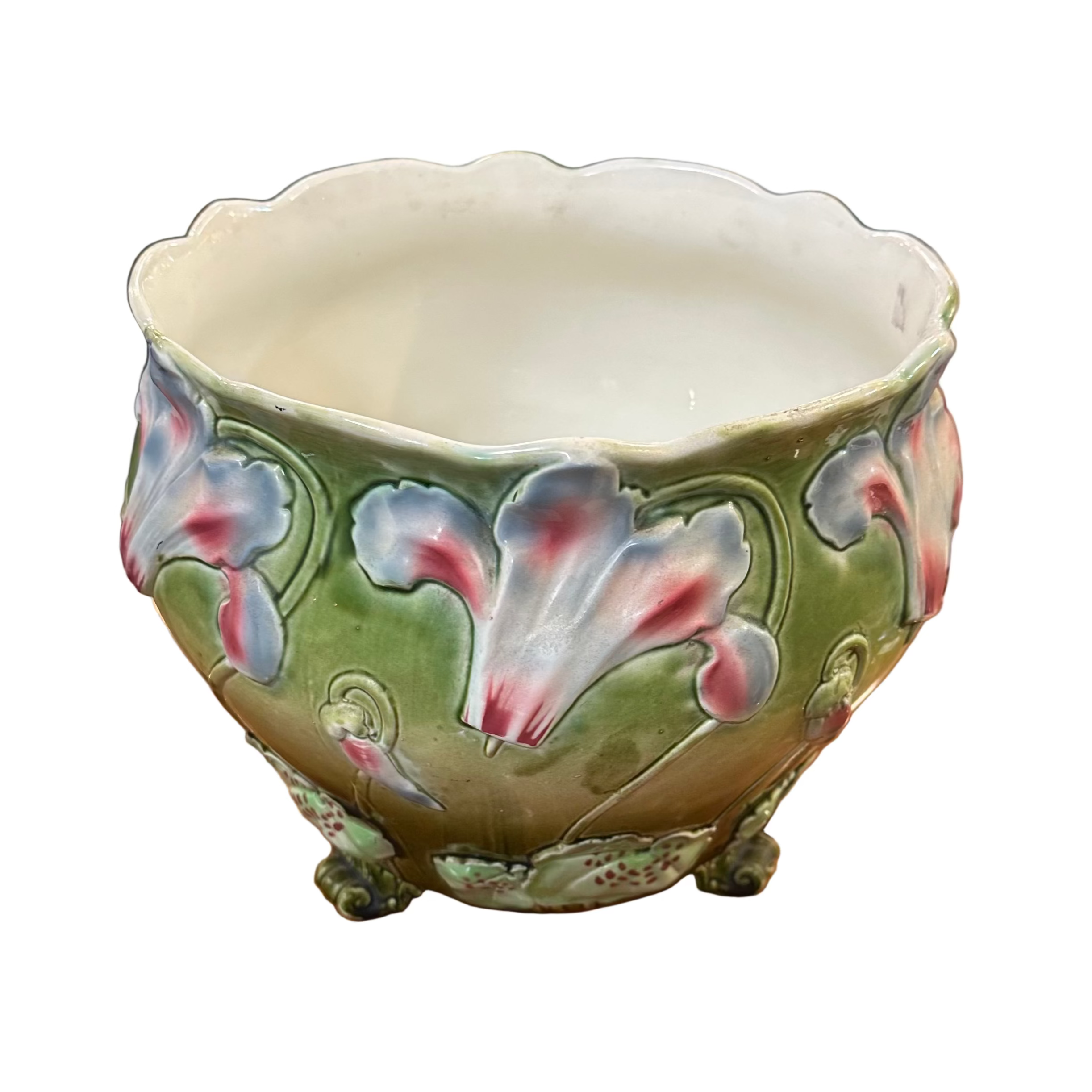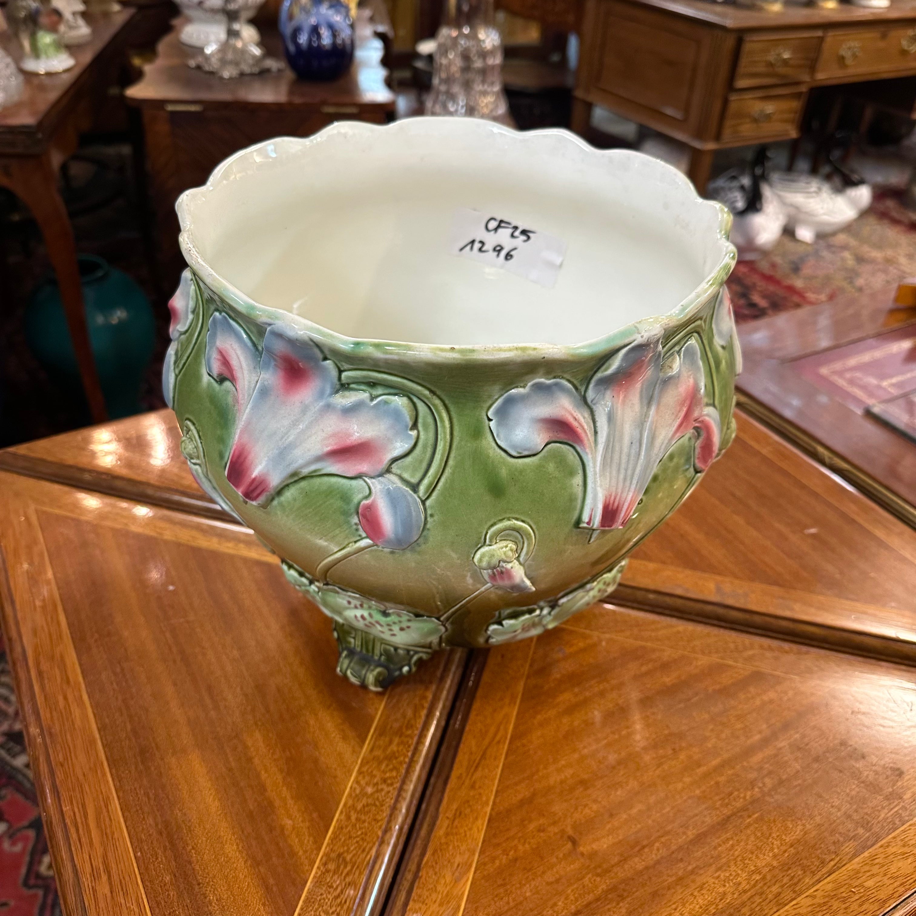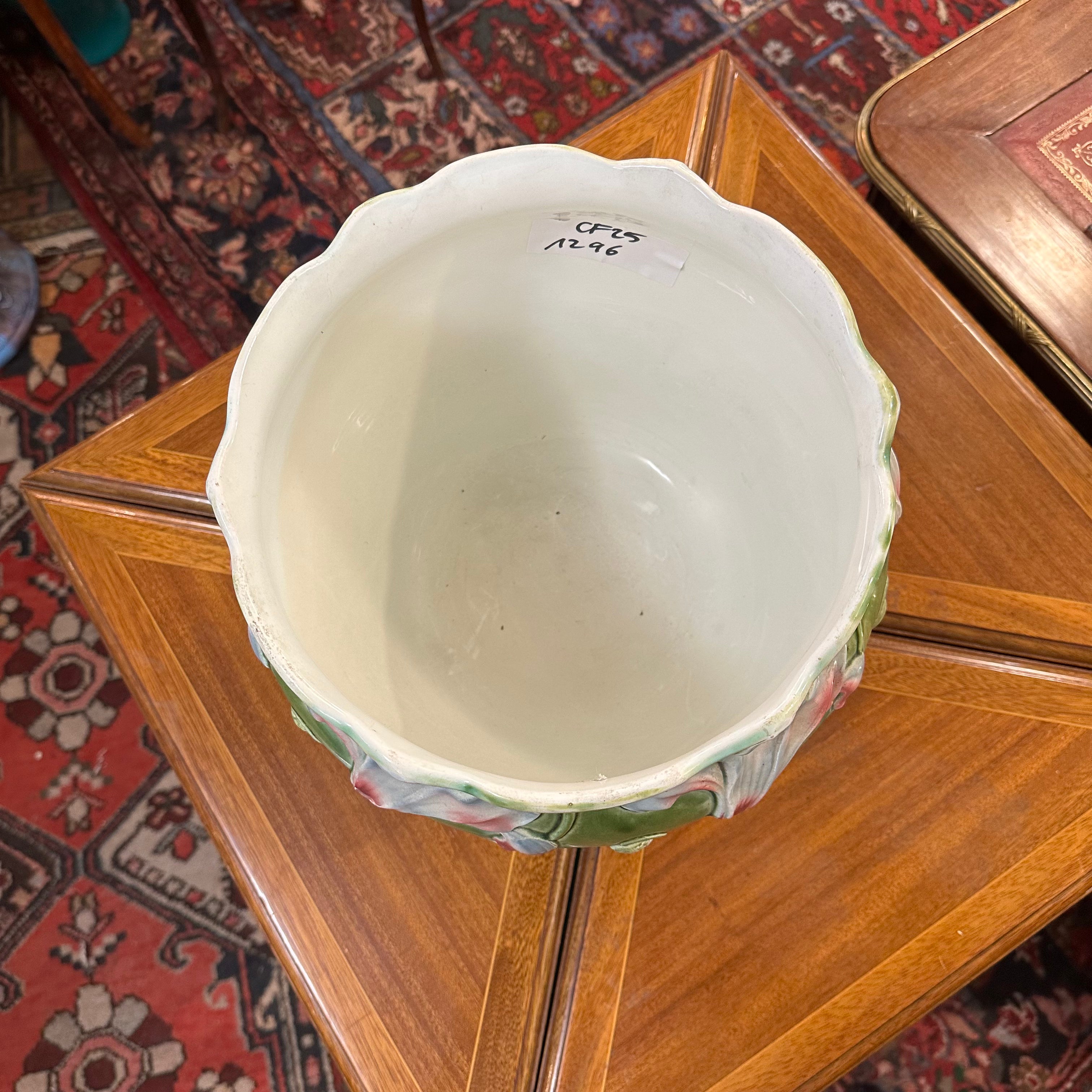 Bella jardinera de porcelana de origen francés en mayolica, con un delicado diseño de flores en tonos lavanda, rosa, turquesa y detalles en rojo, sobre un fondo verde. La pieza tiene sus figuras en relieve, dándole volúmen a las flores y tres patas con decorados y una terminación curva. El interior de la jardinera es de color blanco.