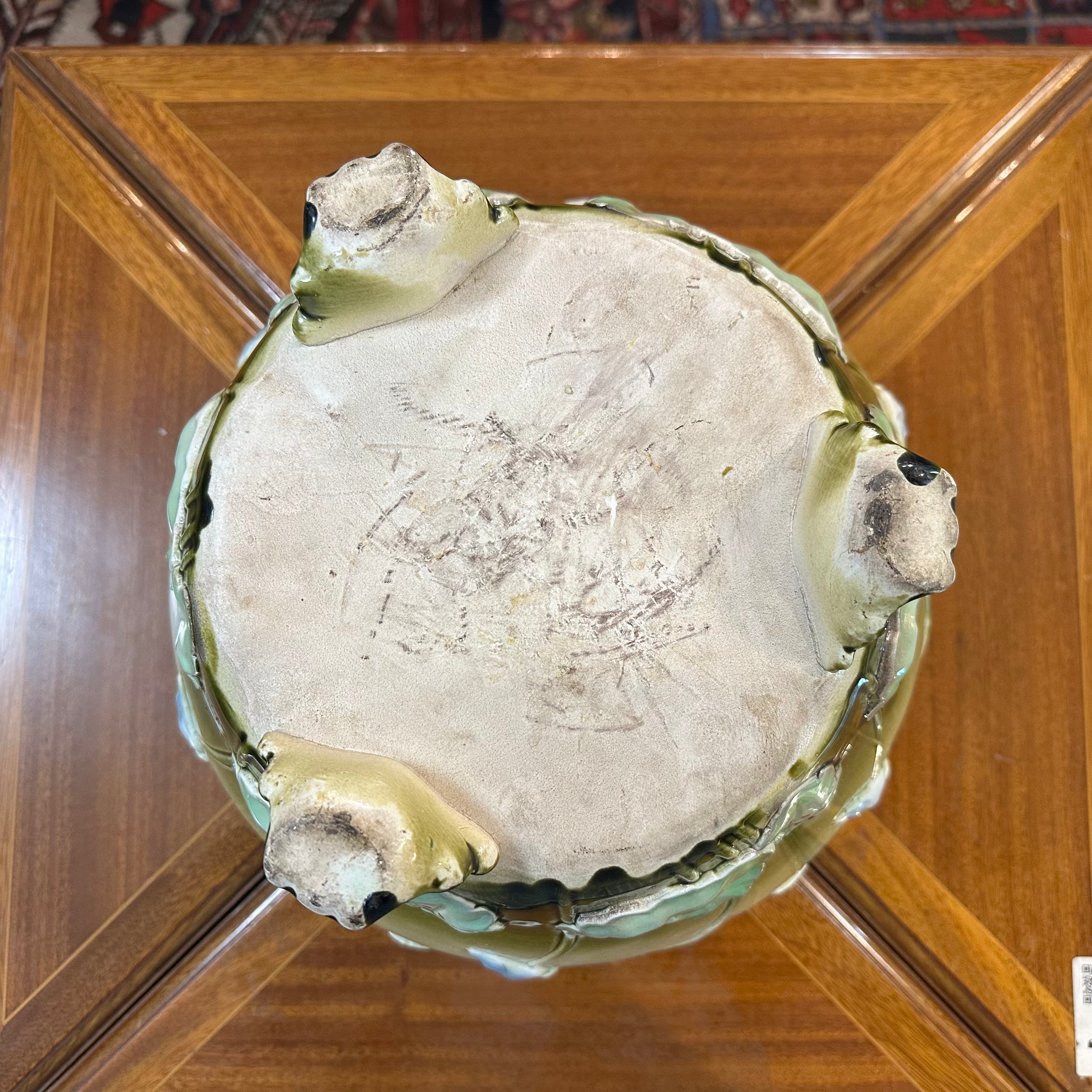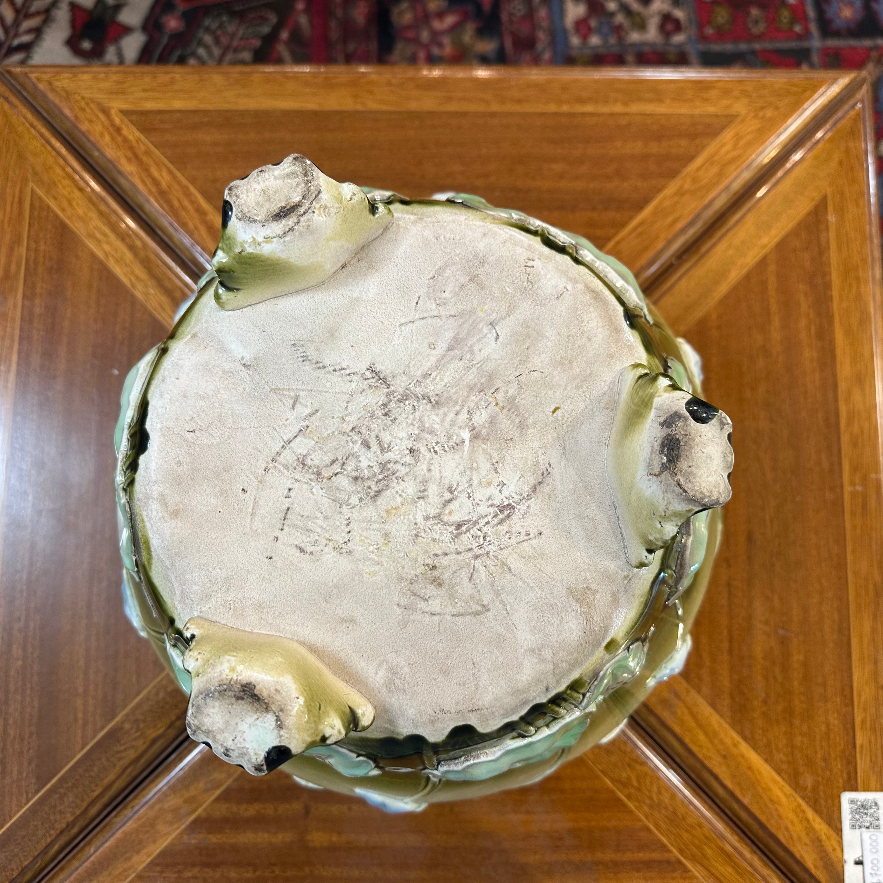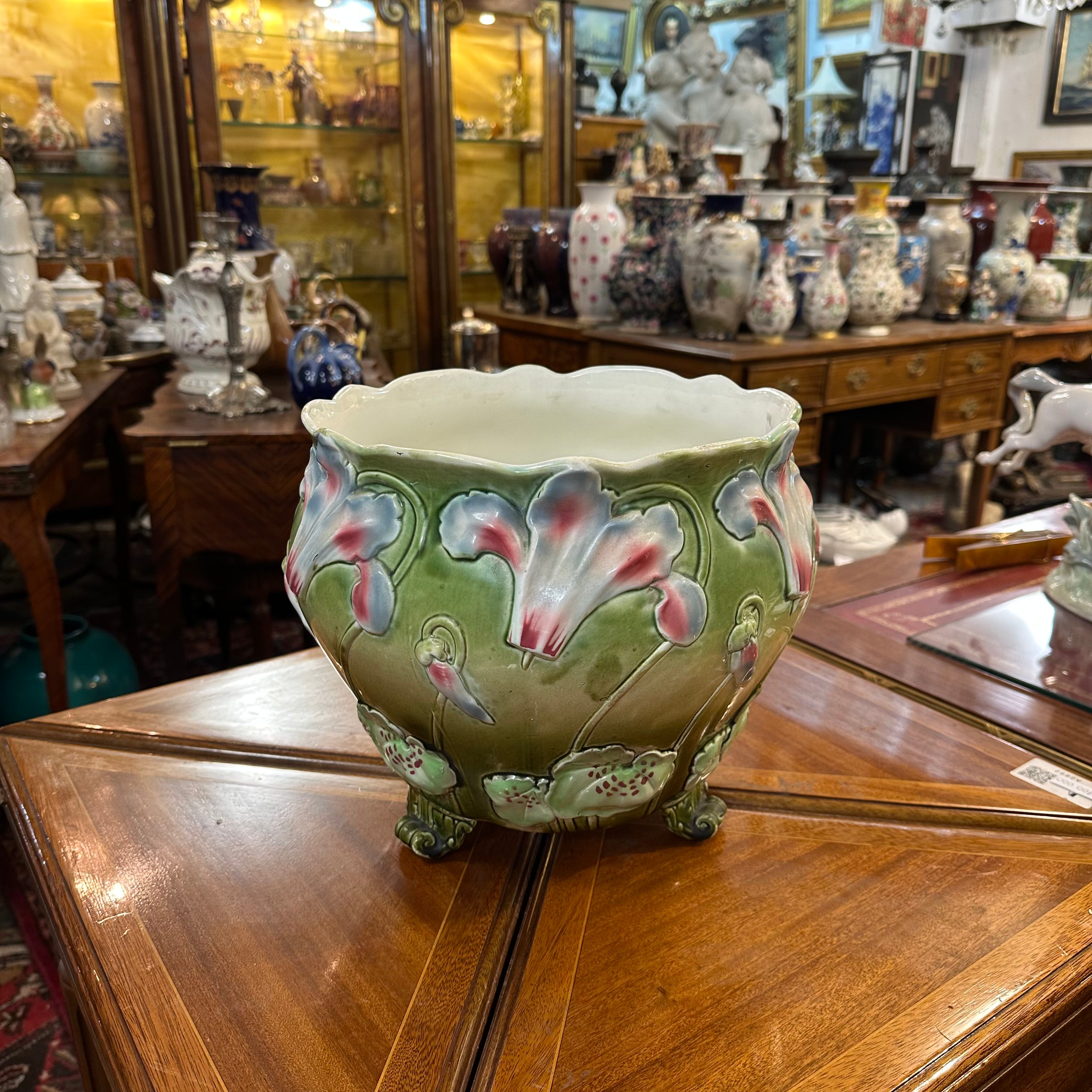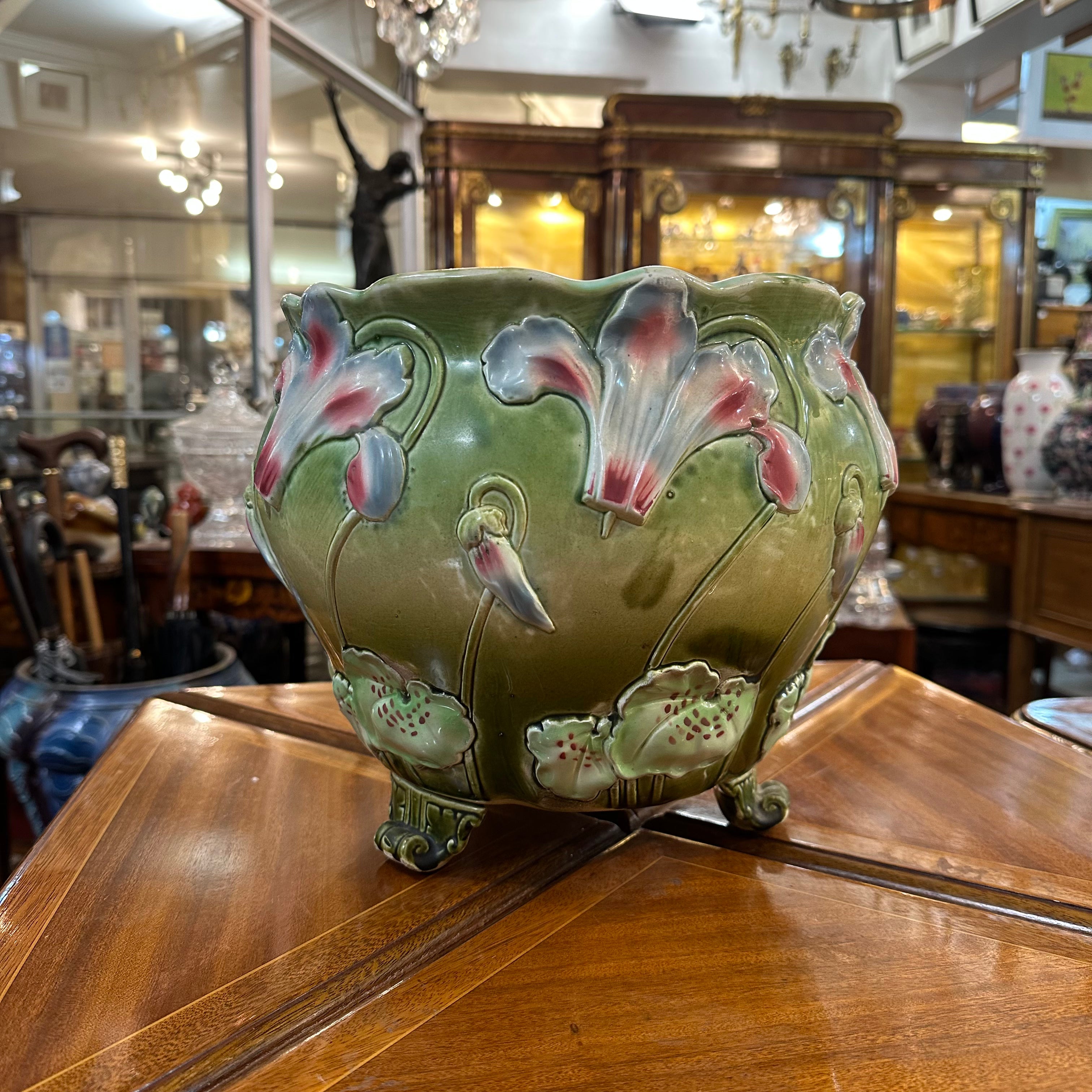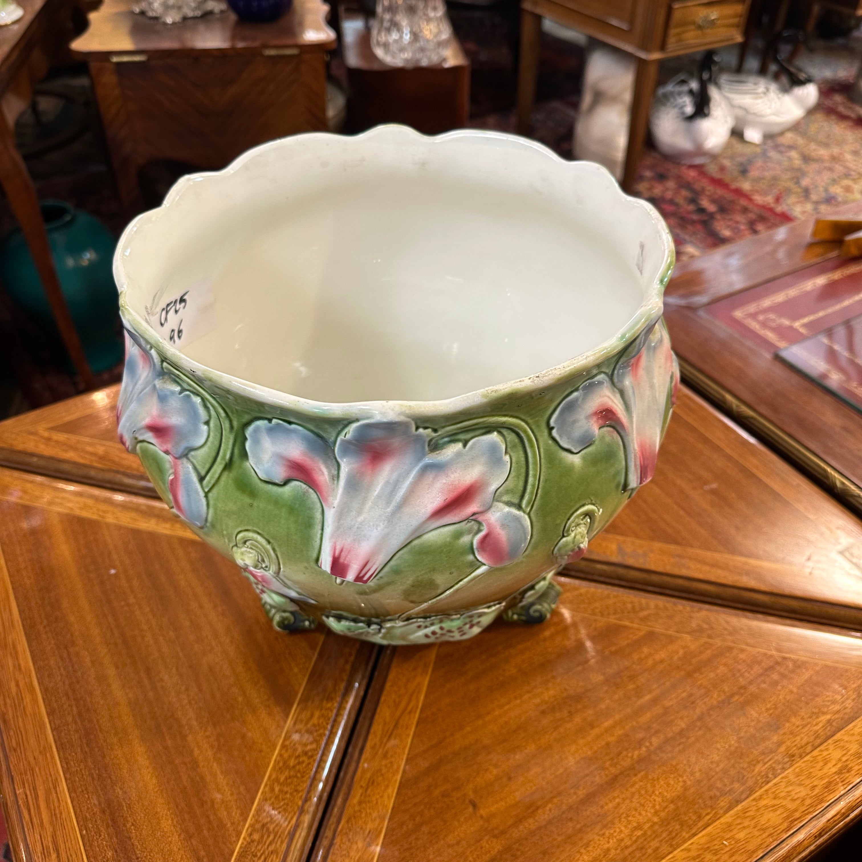 Bella jardinera de porcelana de origen francés en mayolica, con un delicado diseño de flores en tonos lavanda, rosa, turquesa y detalles en rojo, sobre un fondo verde. La pieza tiene sus figuras en relieve, dándole volúmen a las flores y tres patas con decorados y una terminación curva. El interior de la jardinera es de color blanco.