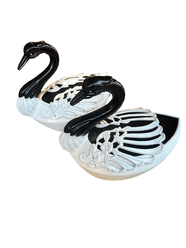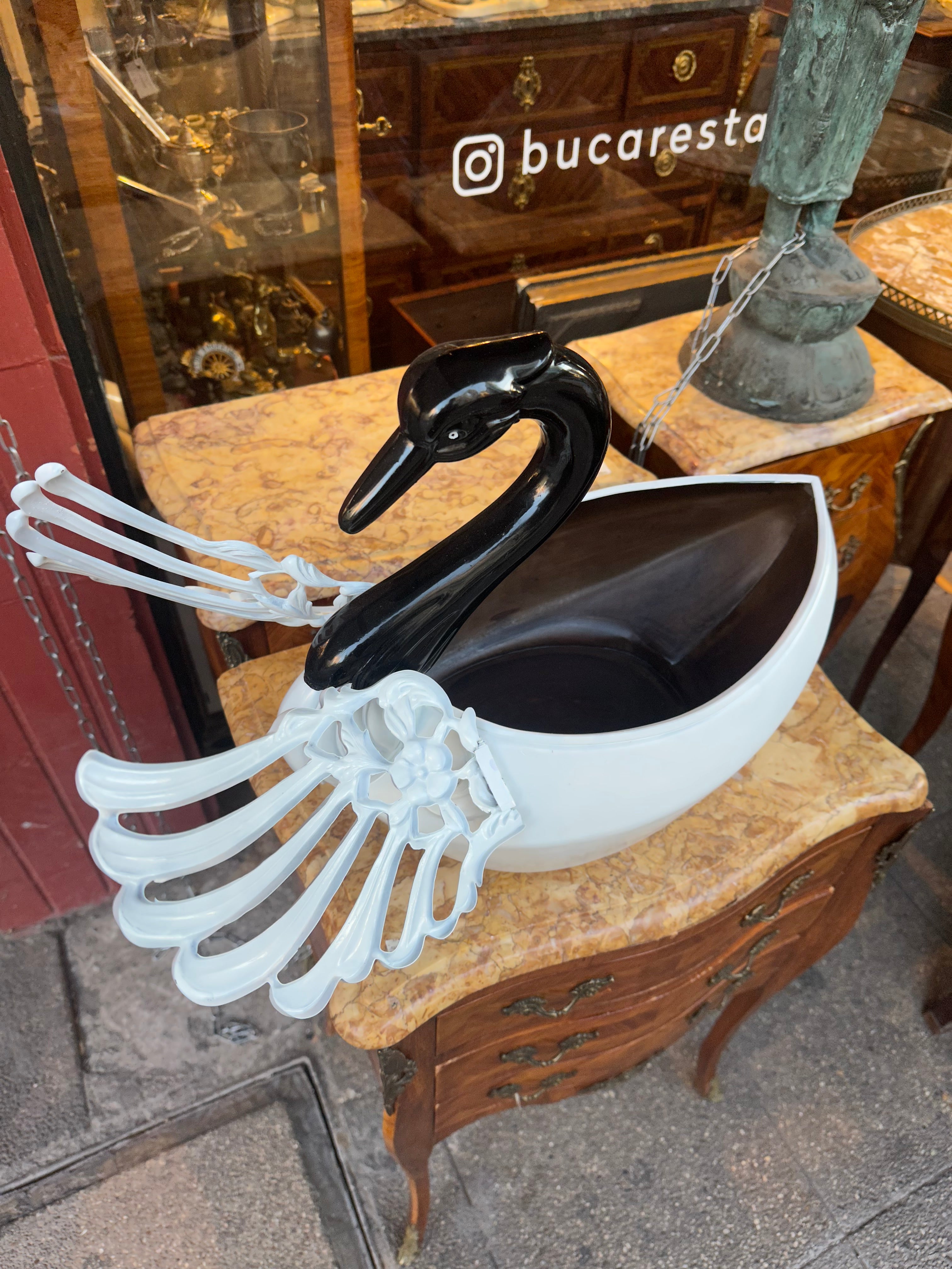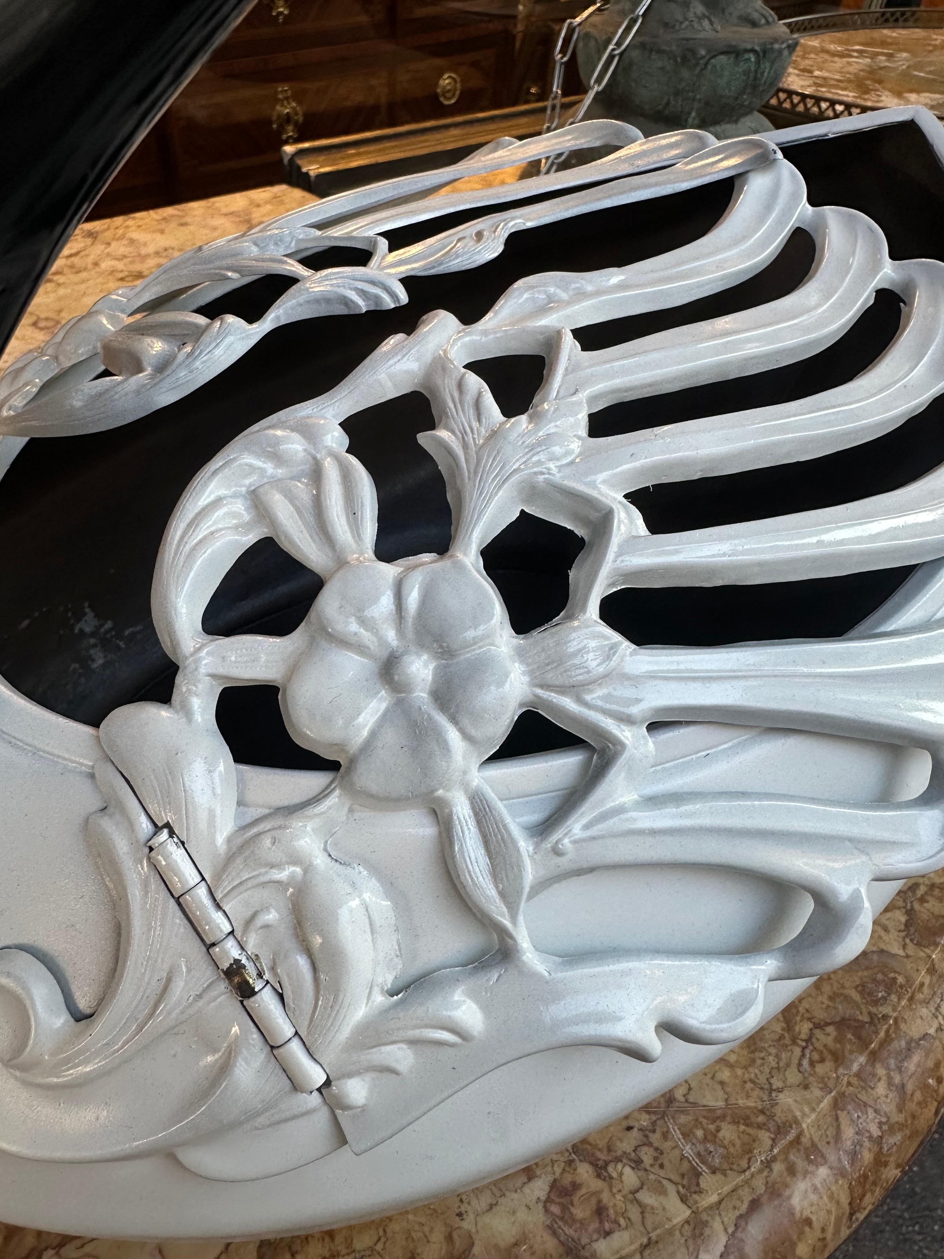 Bello y llamativo juego de dos jardineras de estaño con forma de cisnes. Las alas de cada cisne, con bellas decoraciones florales, tienen bisagras,, convirtiéndolas en rejillas que pueden tapar y destapar el interior de la pieza. Las piezas están pintadas en blanco y negro satinados.