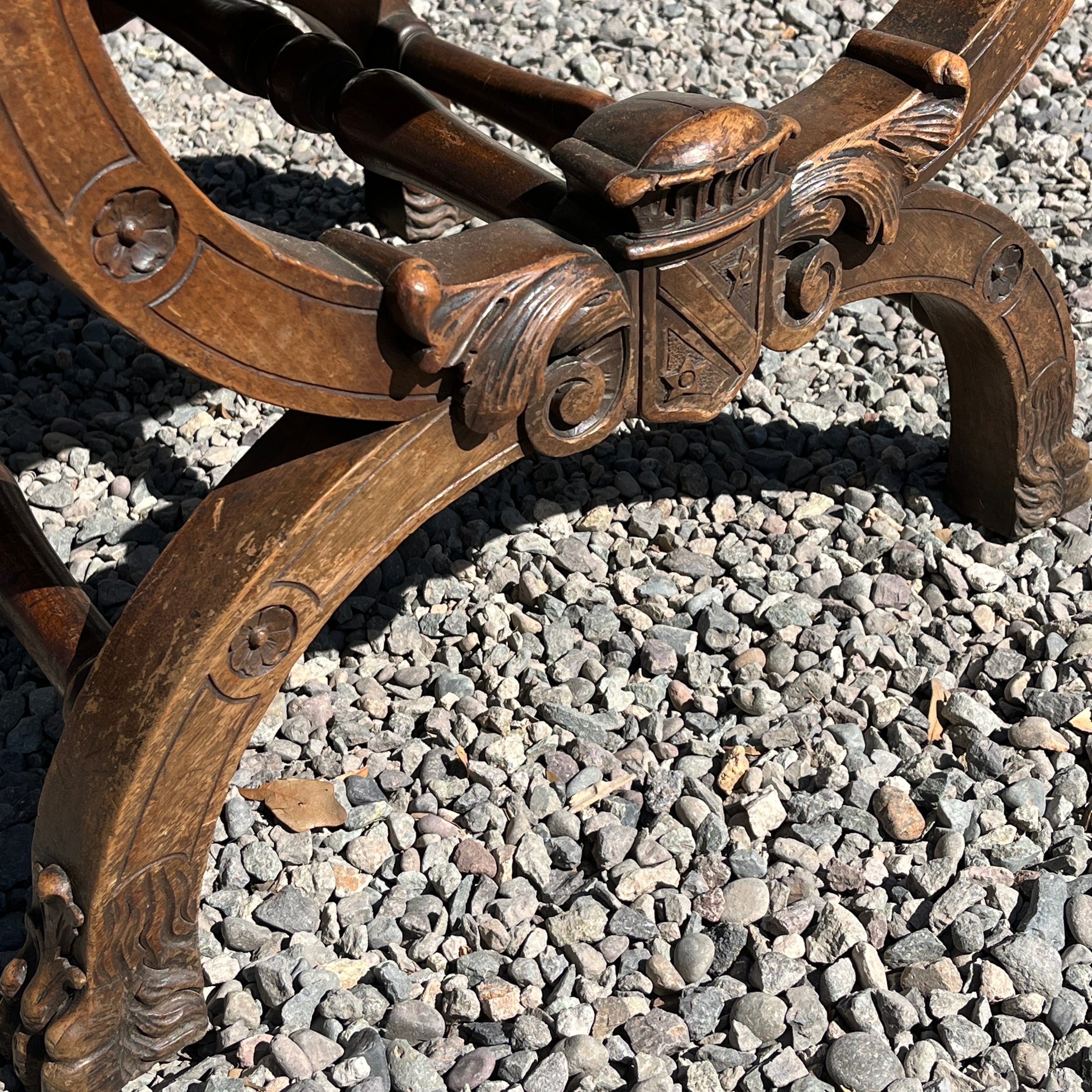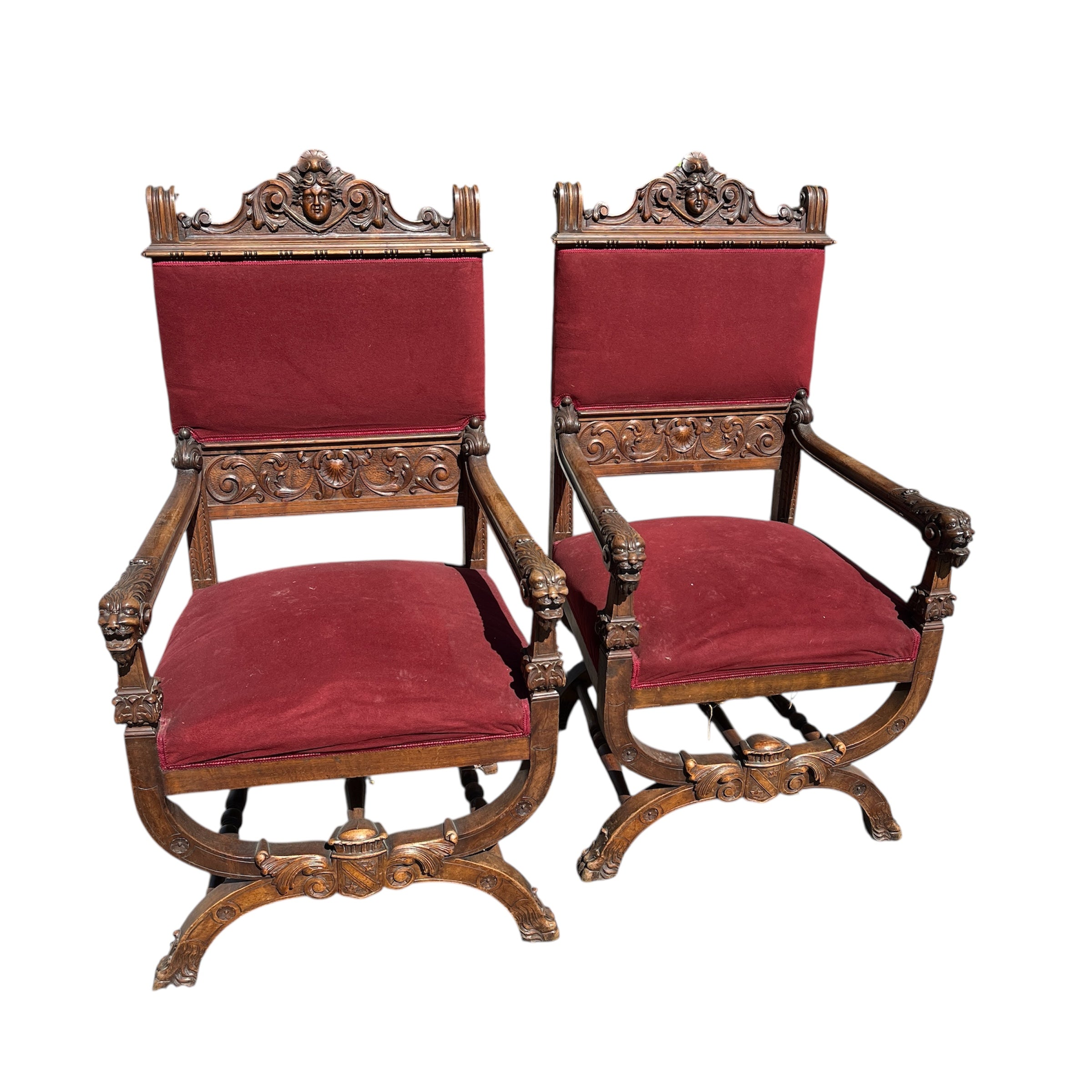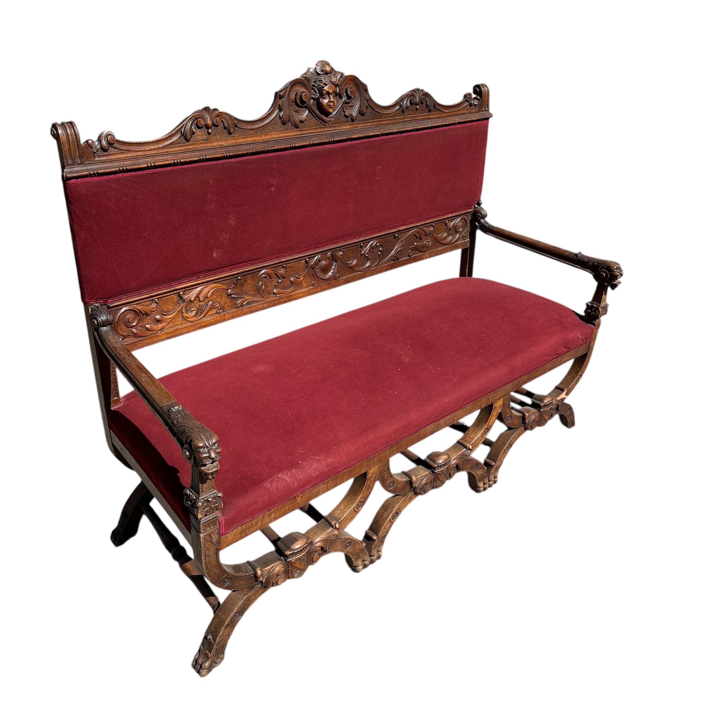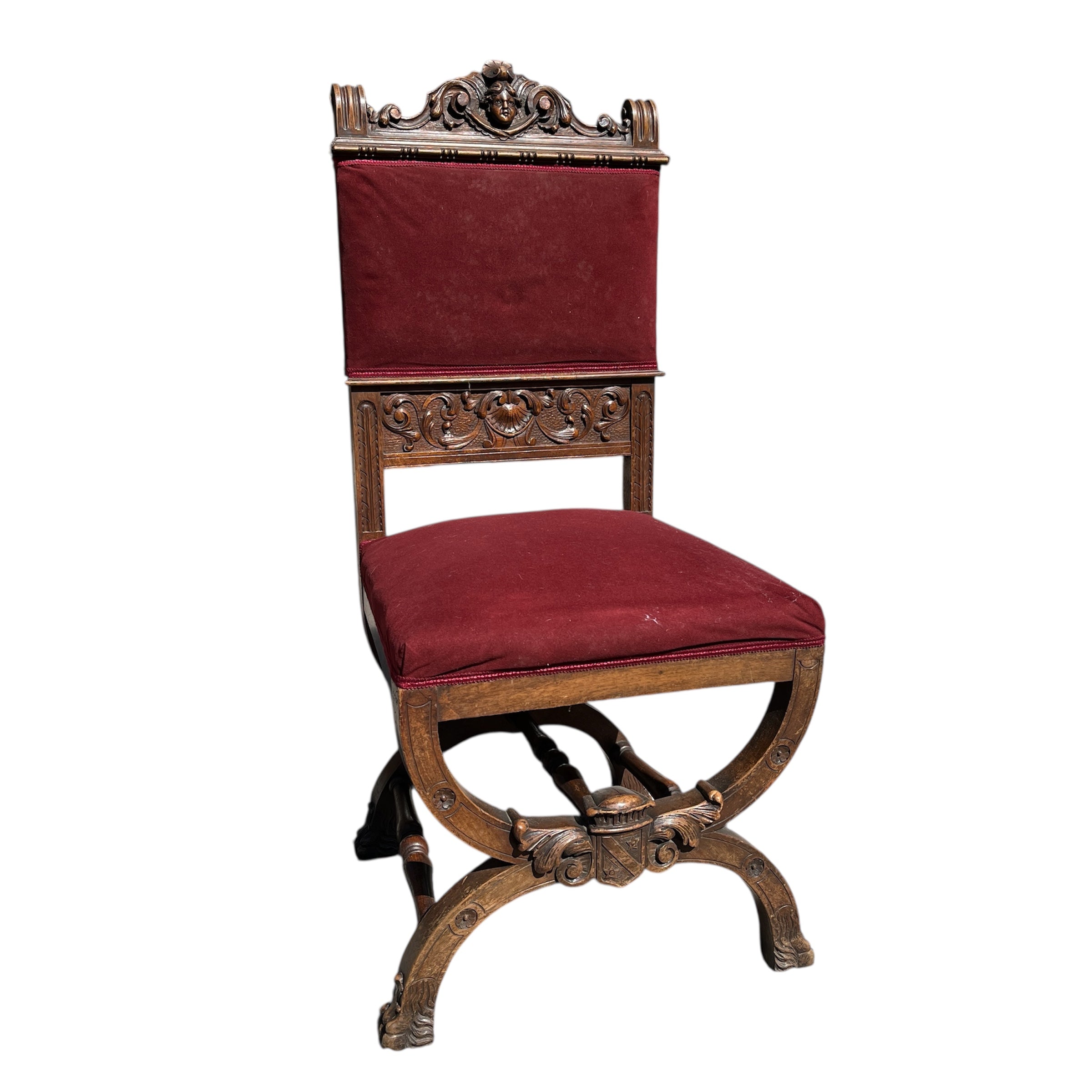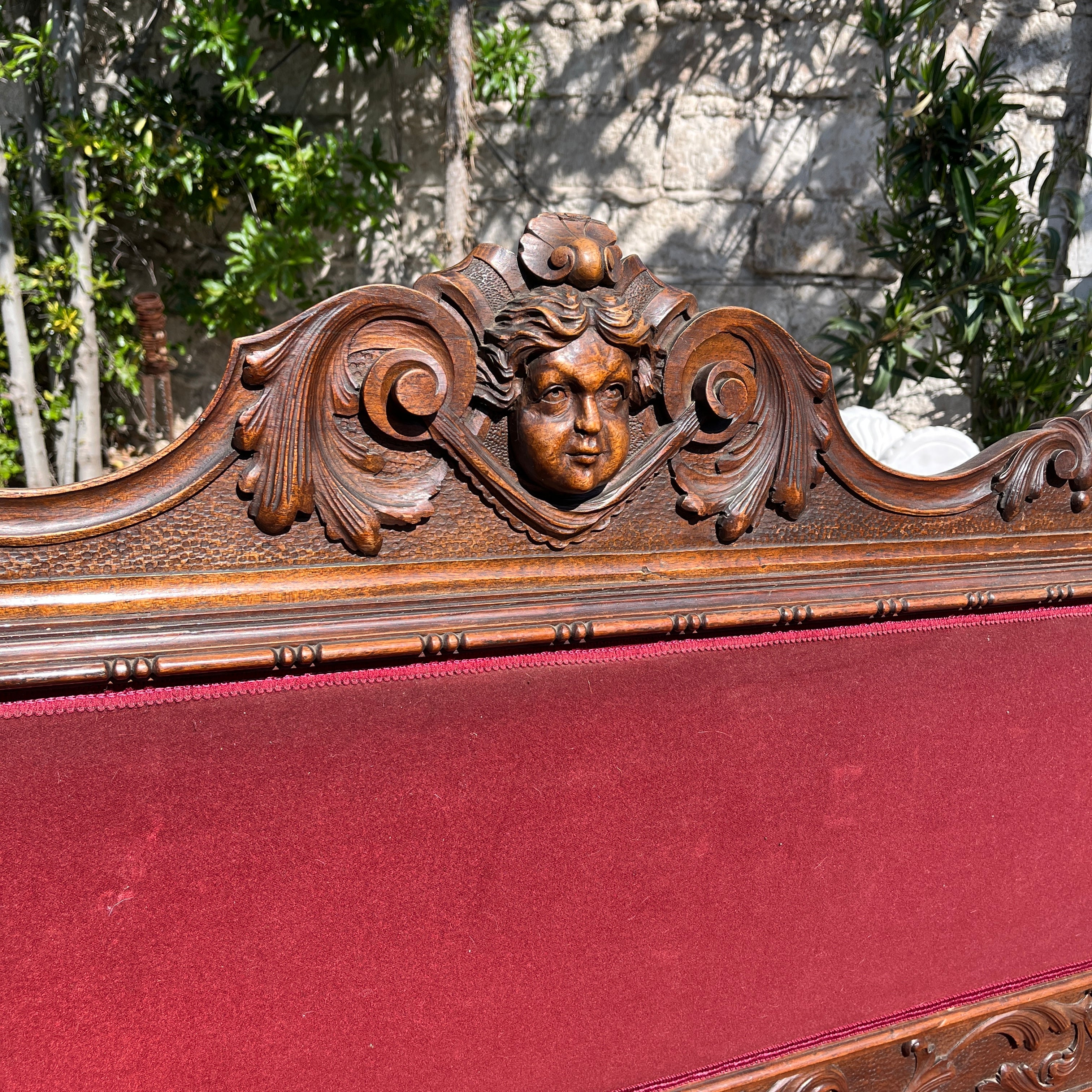 Gran juego de salón de origen francés y estilo renacentista compuesto de 9 piezas: un sillón de tres cuerpos, dos sitiales y seis sillas, todas con estructura de madera tallada en relieves decorados y tapizadas en un llamativo terciopelo rojo. Podemos identificar el estilo renacentista de estas piezas por sus patas de cruceta tallada y los motivos de ángeles en su respaldo.