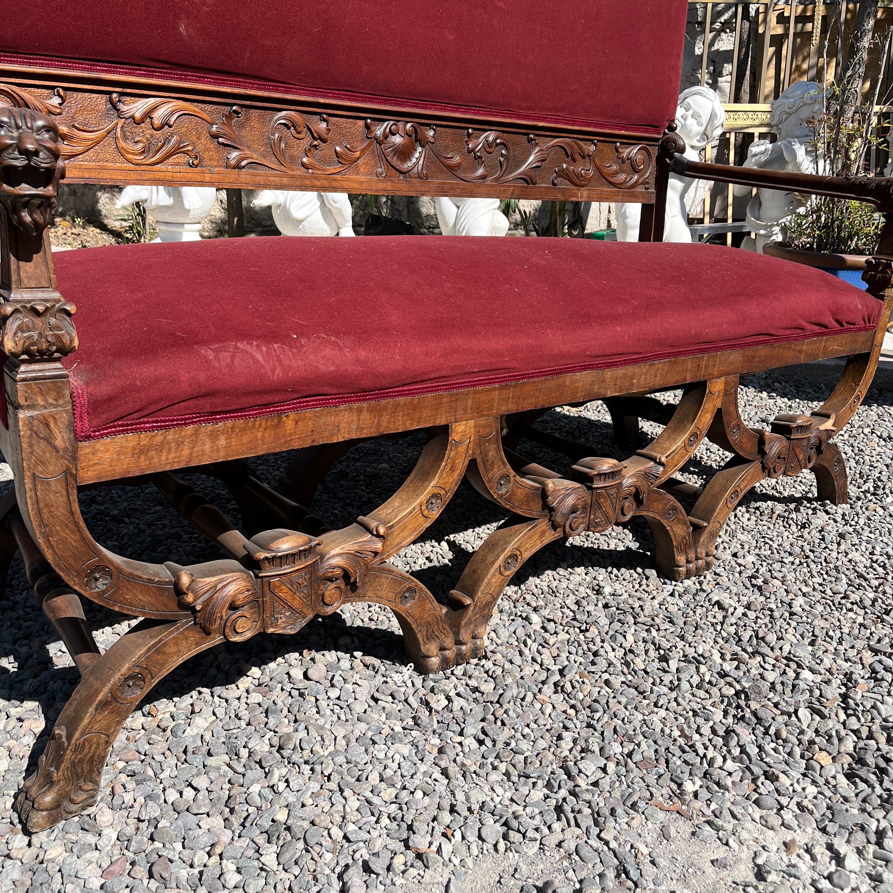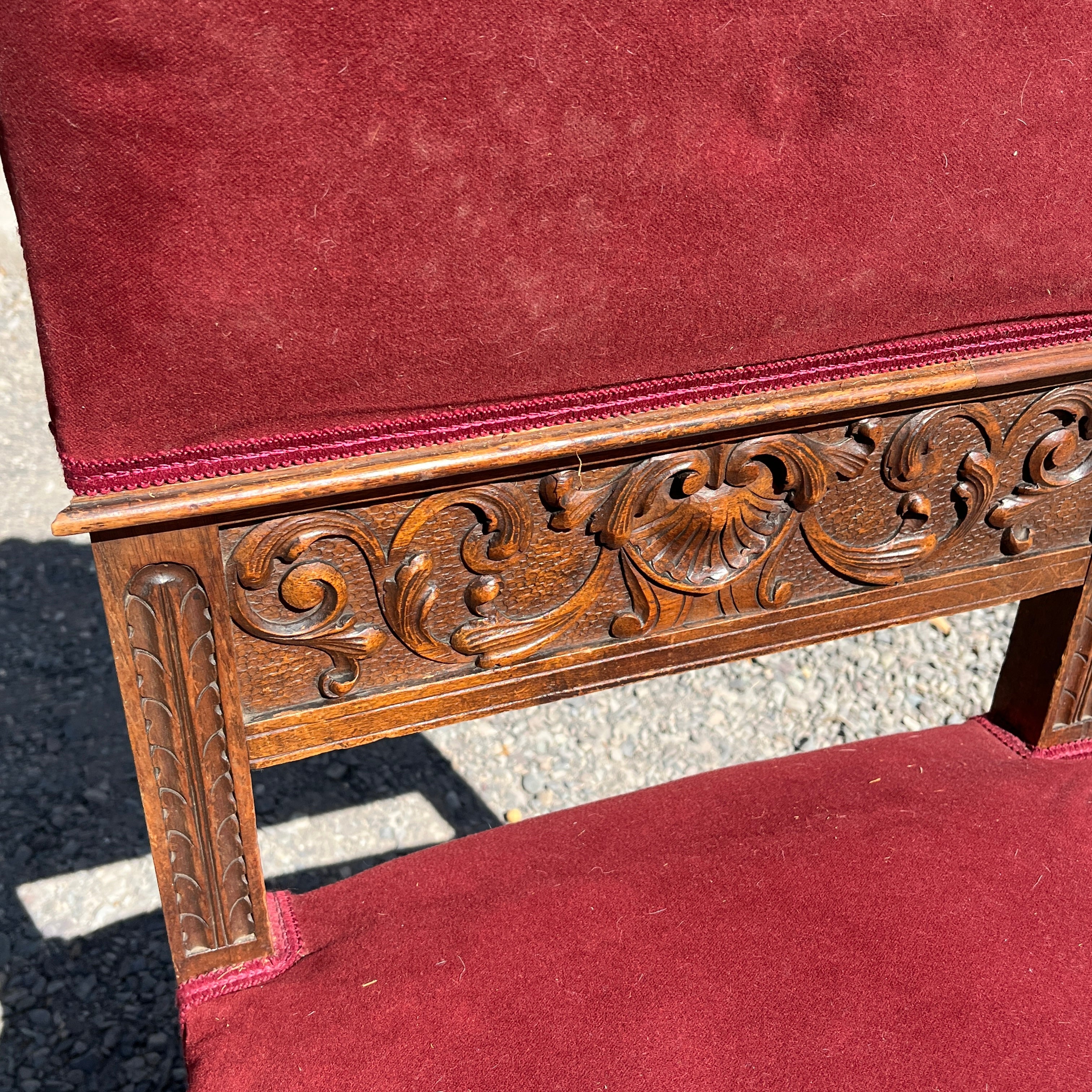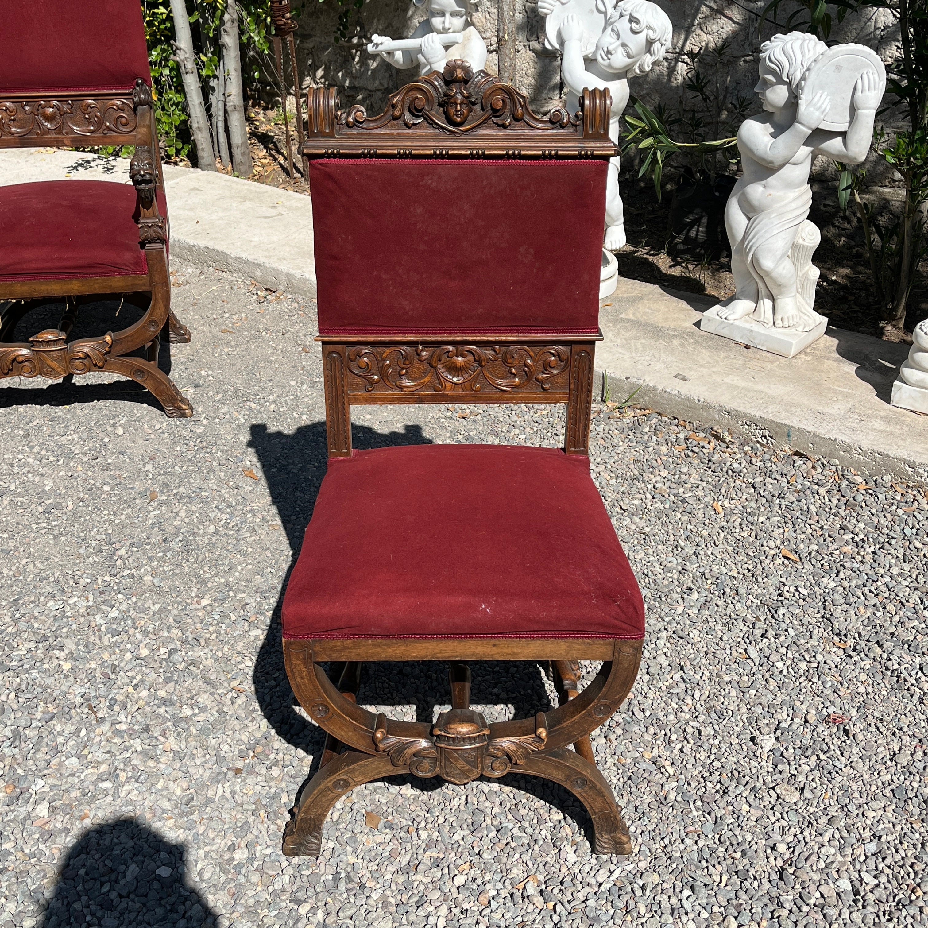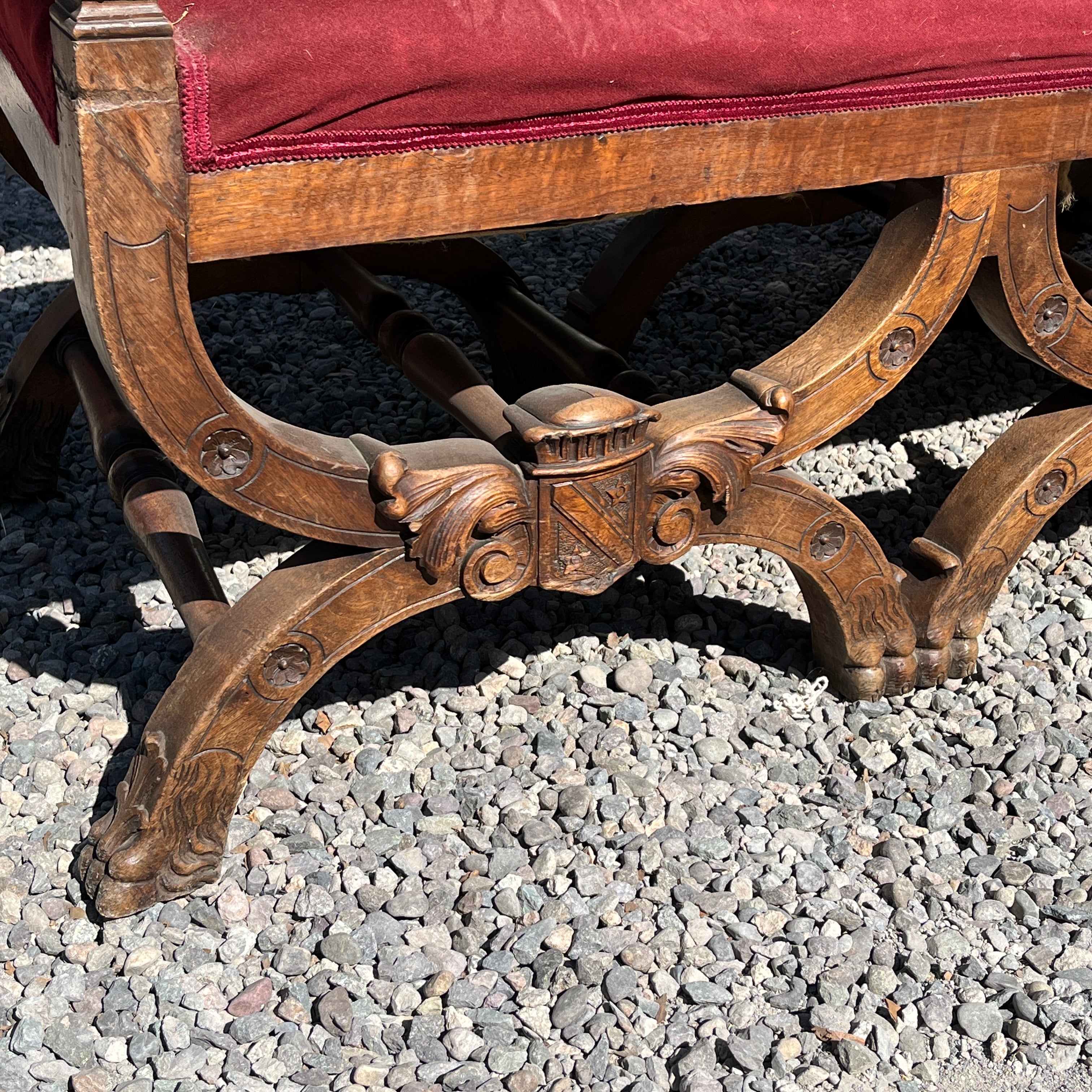 Juego de salón francés estilo Renacentista 9 piezas madera tallada y tapiz terciopelo rojo
