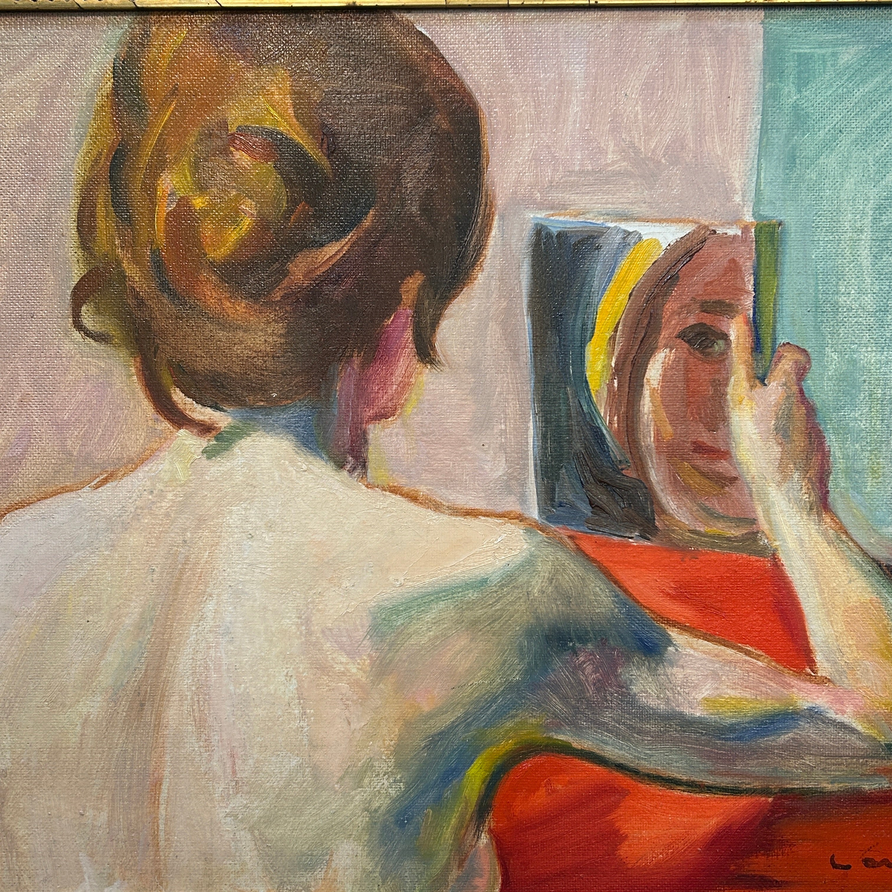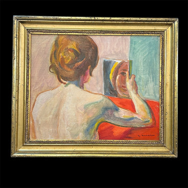 Íntimo cuadro de Larraín (1899-1994) que muestra una mujer de espalda desnuda a quien se le ve su rostro a partir de un espejo que sostiene en la mano.