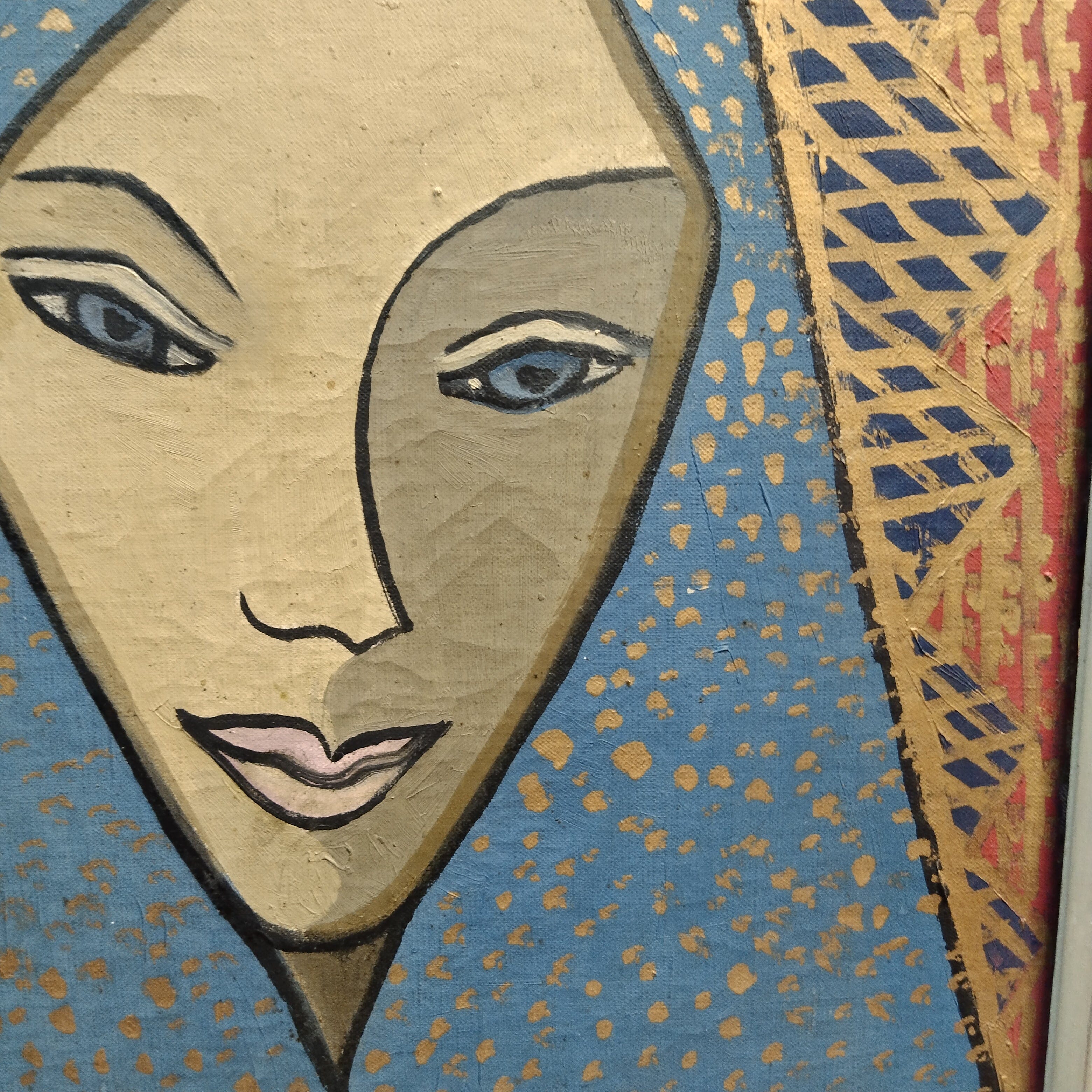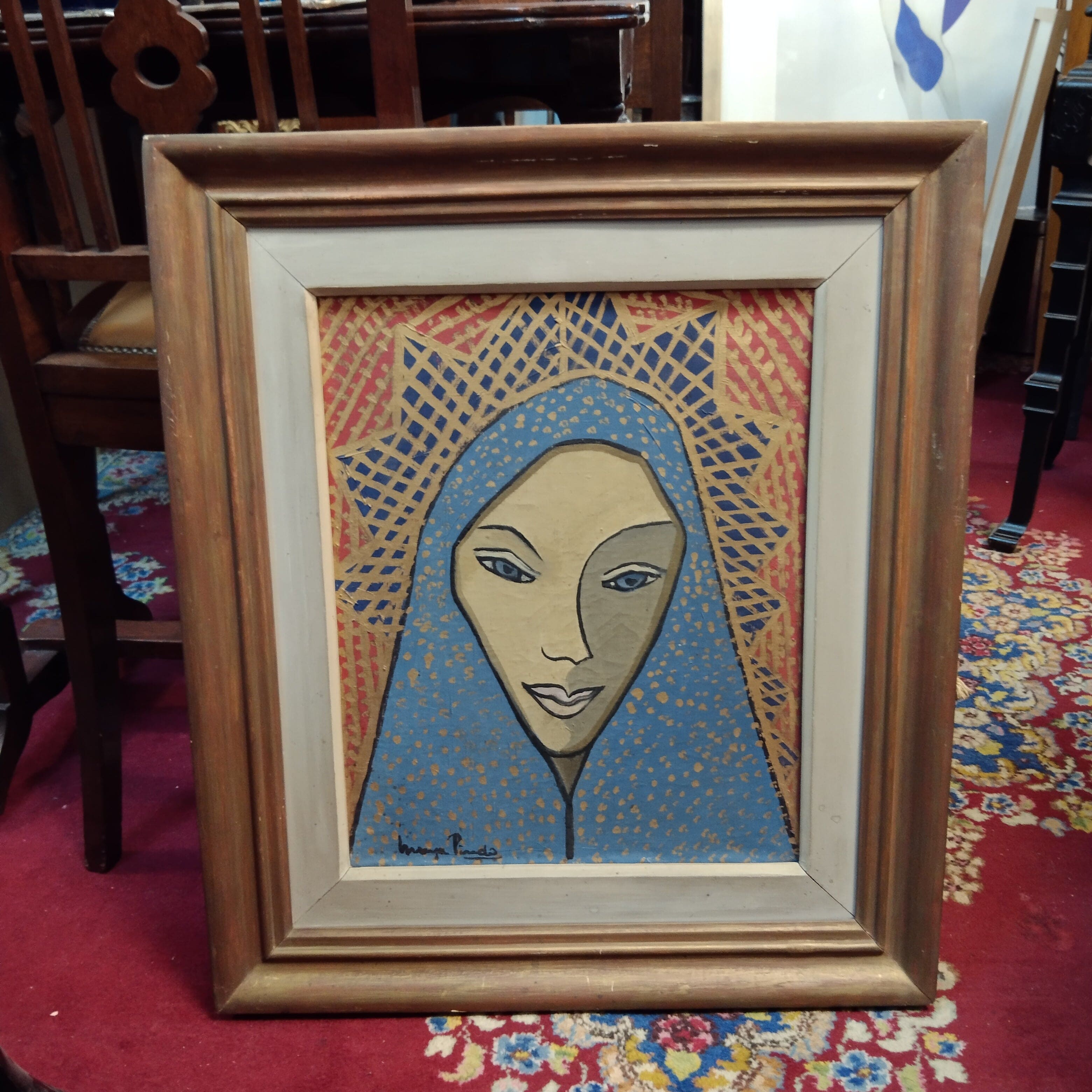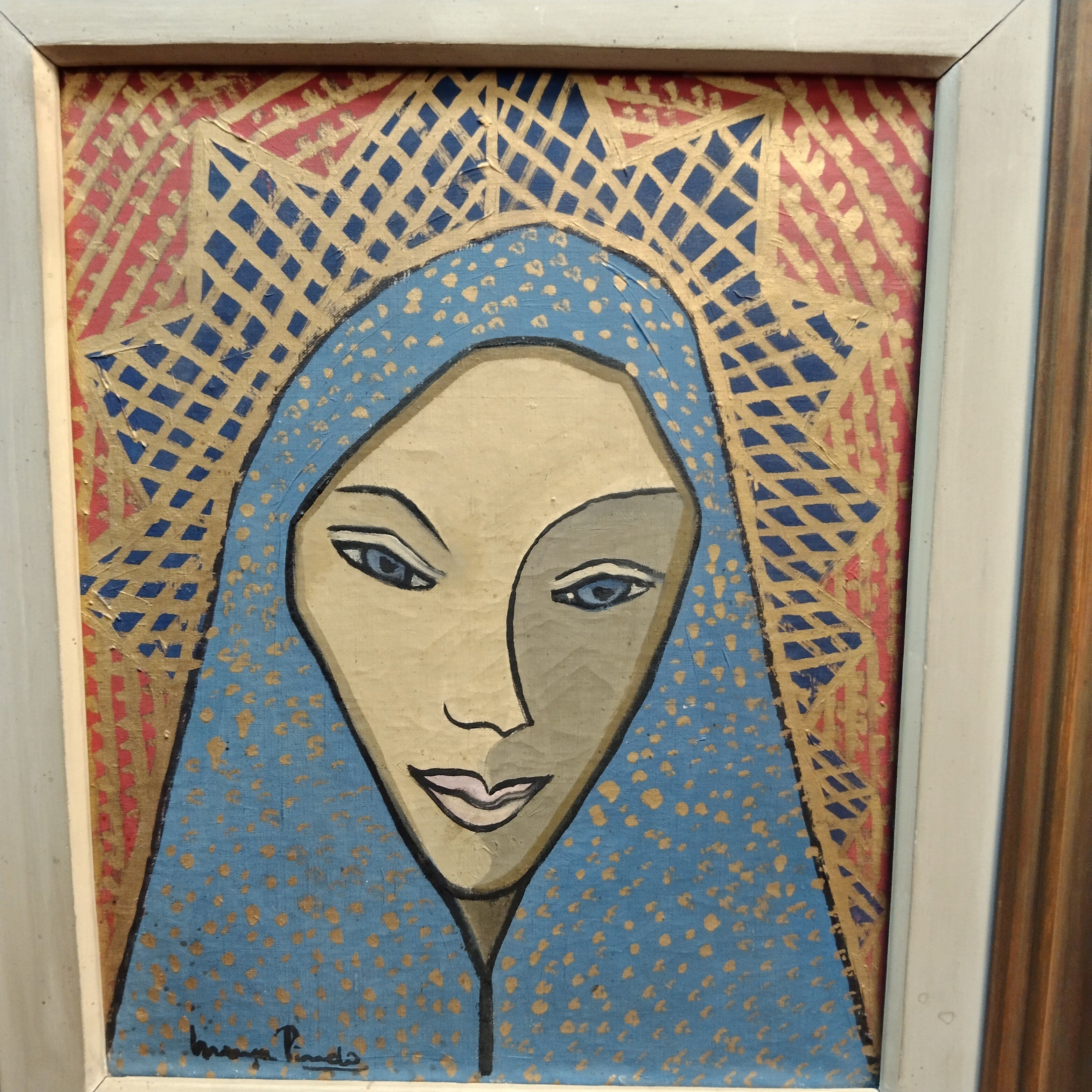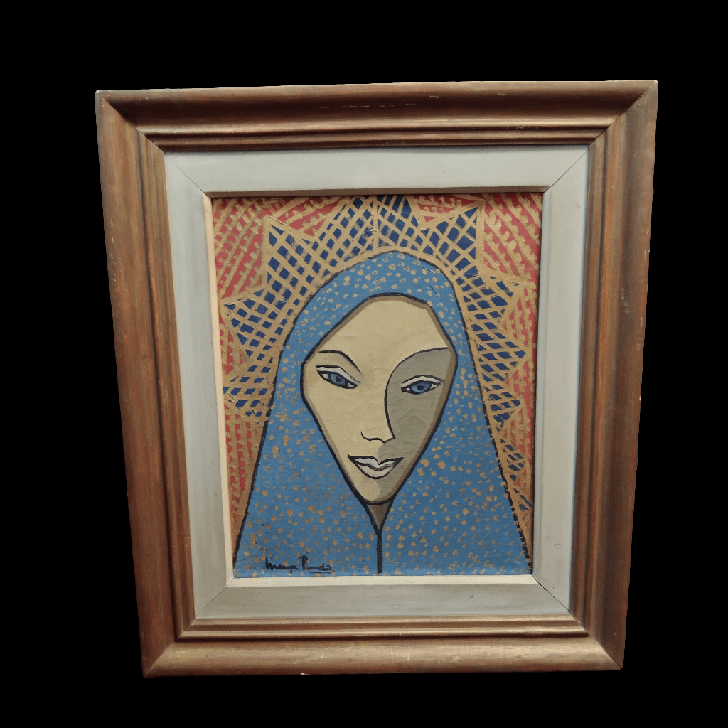 Óleo sobre tela de la artista chilena María Pinedo representando el rostro de una vírgen con su corona, en tonos azules, dorados y naranjos. La obra tiene un marco de madera con un tratamiento de pintura cobrizo.