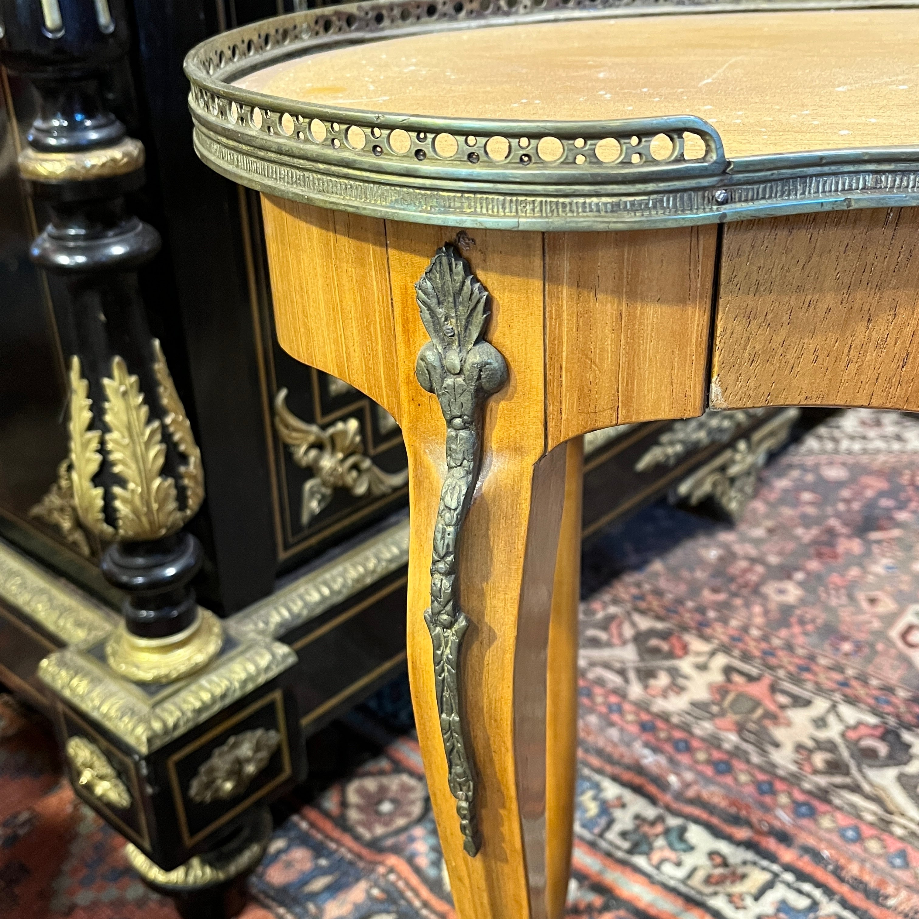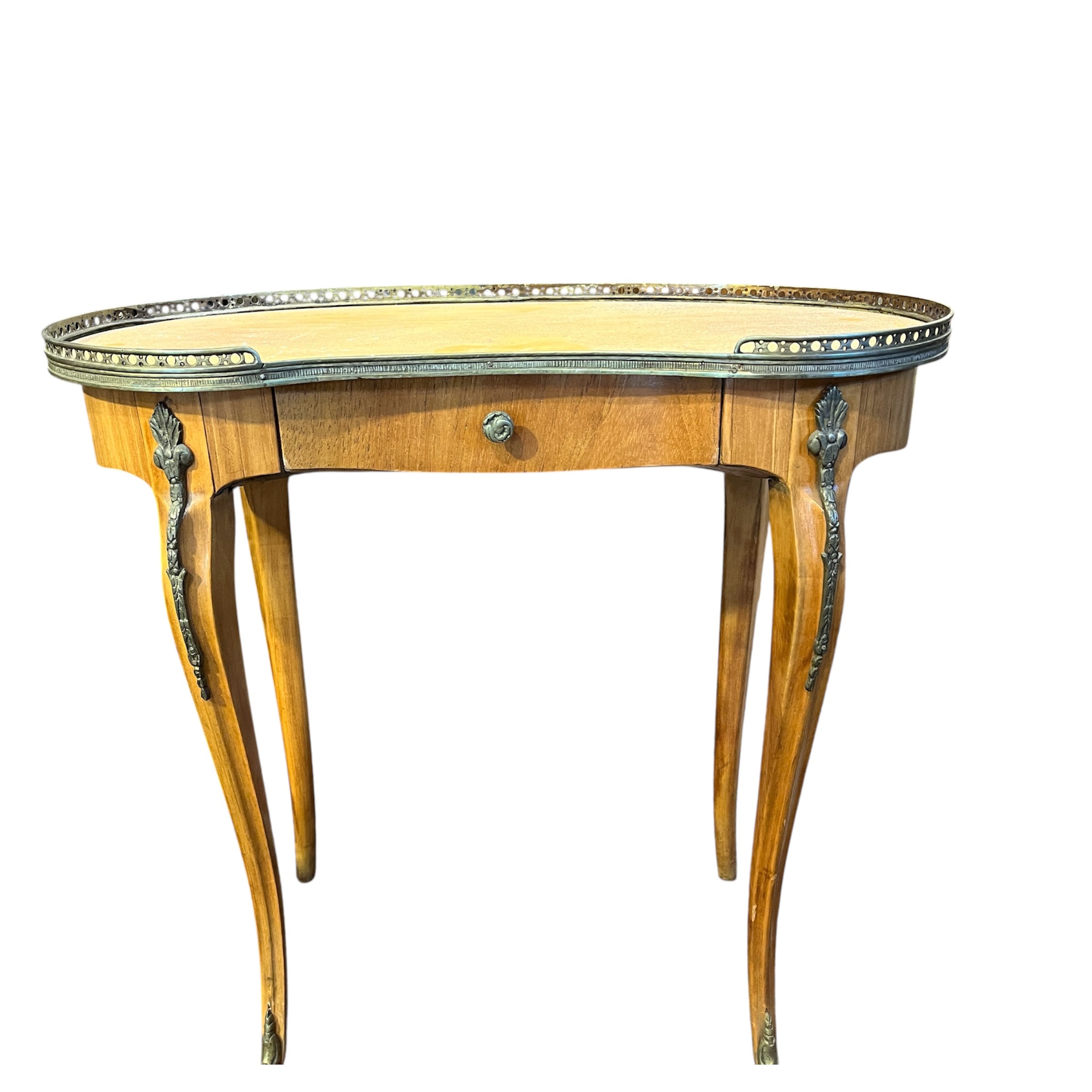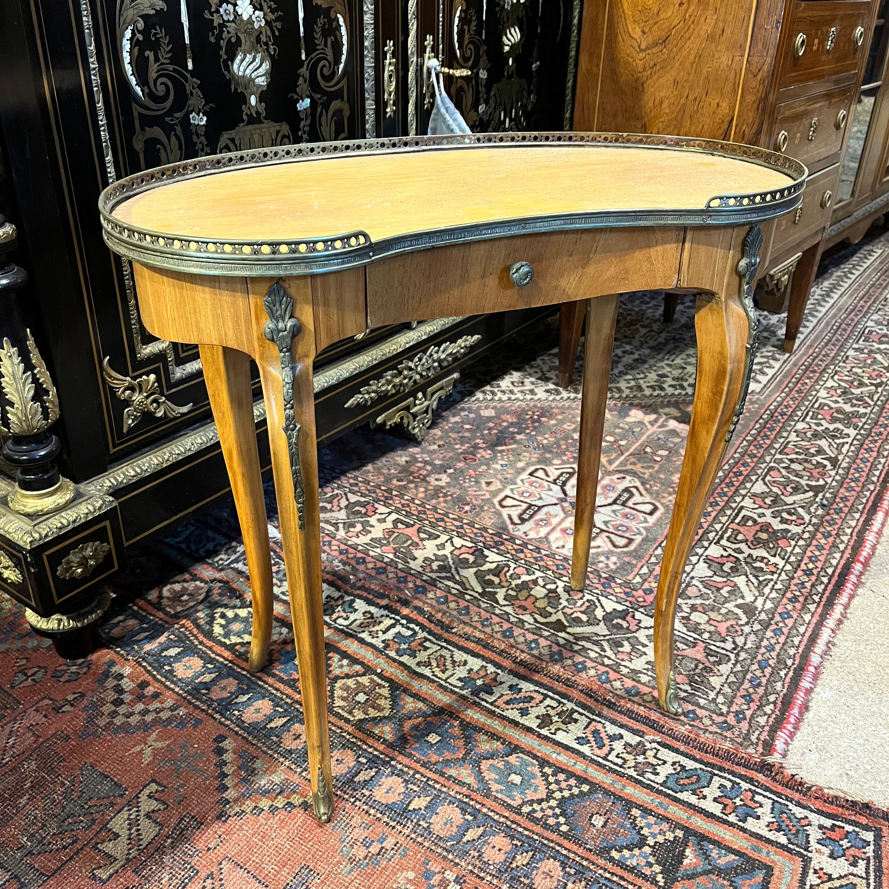 Bella mesa de apoyo de origen francés estilo Luis XVI en forma de riñón, hecha de madera frutal, con patas curvas, aplicaciones y cintillo de bronce. La mesa tiene un cajón.
