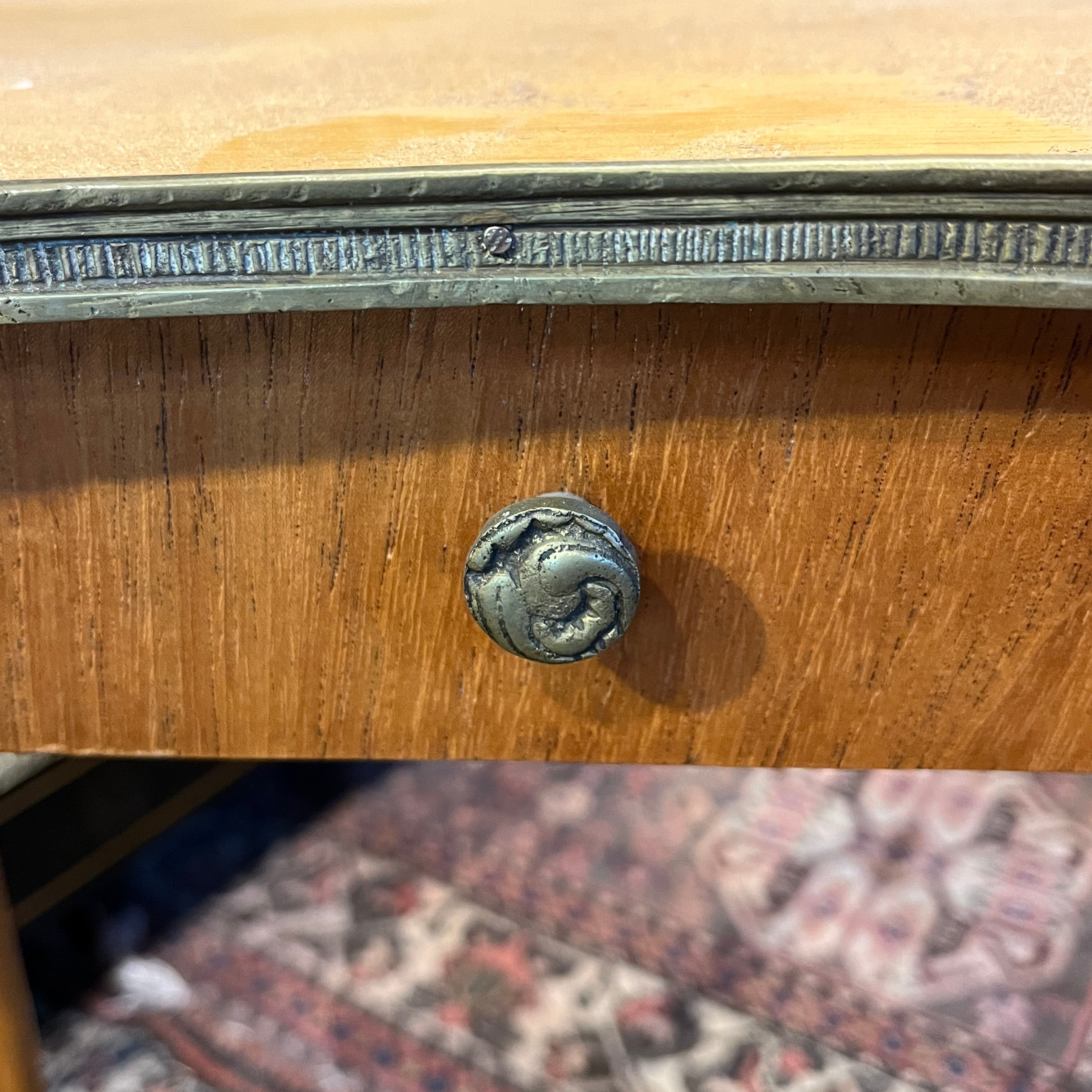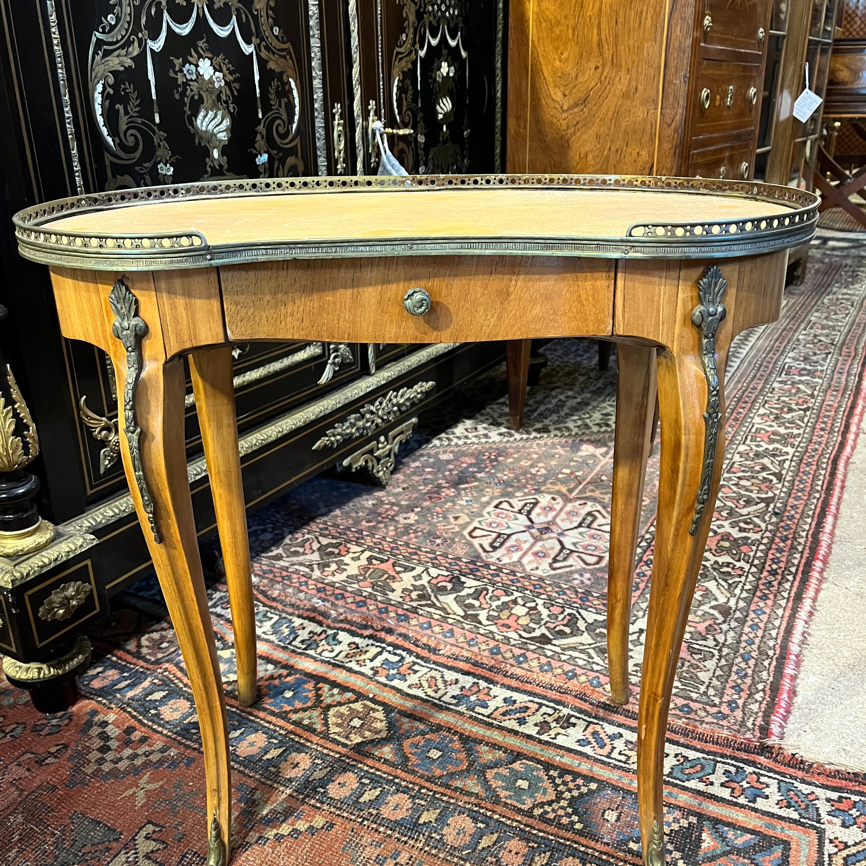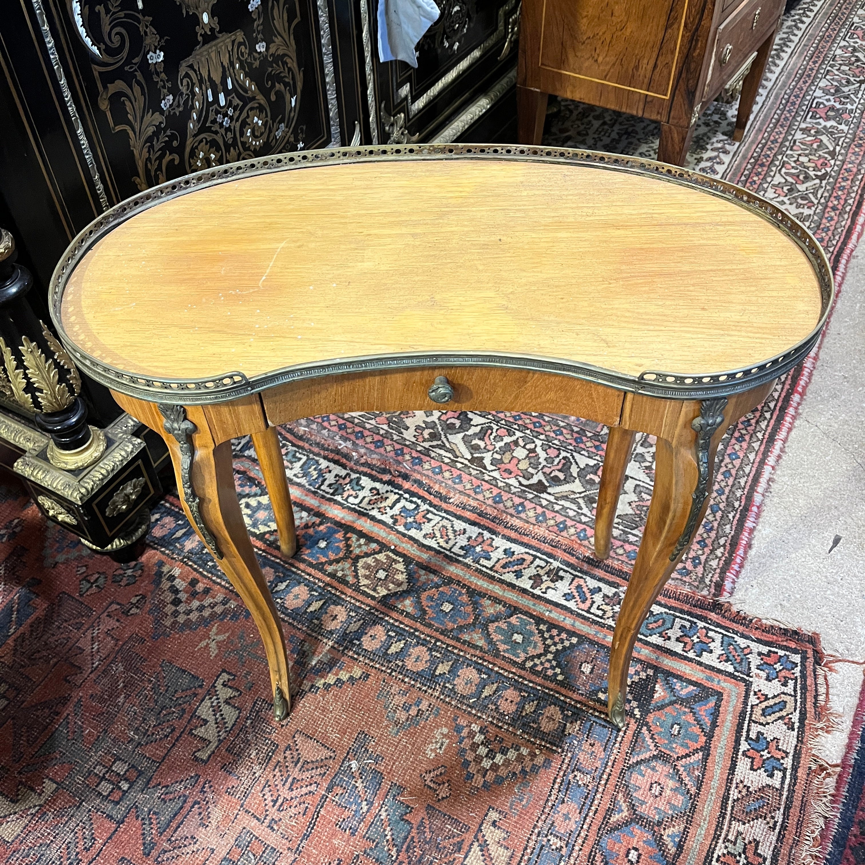 Bella mesa de apoyo de origen francés estilo Luis XVI en forma de riñón, hecha de madera frutal, con patas curvas, aplicaciones y cintillo de bronce. La mesa tiene un cajón.
