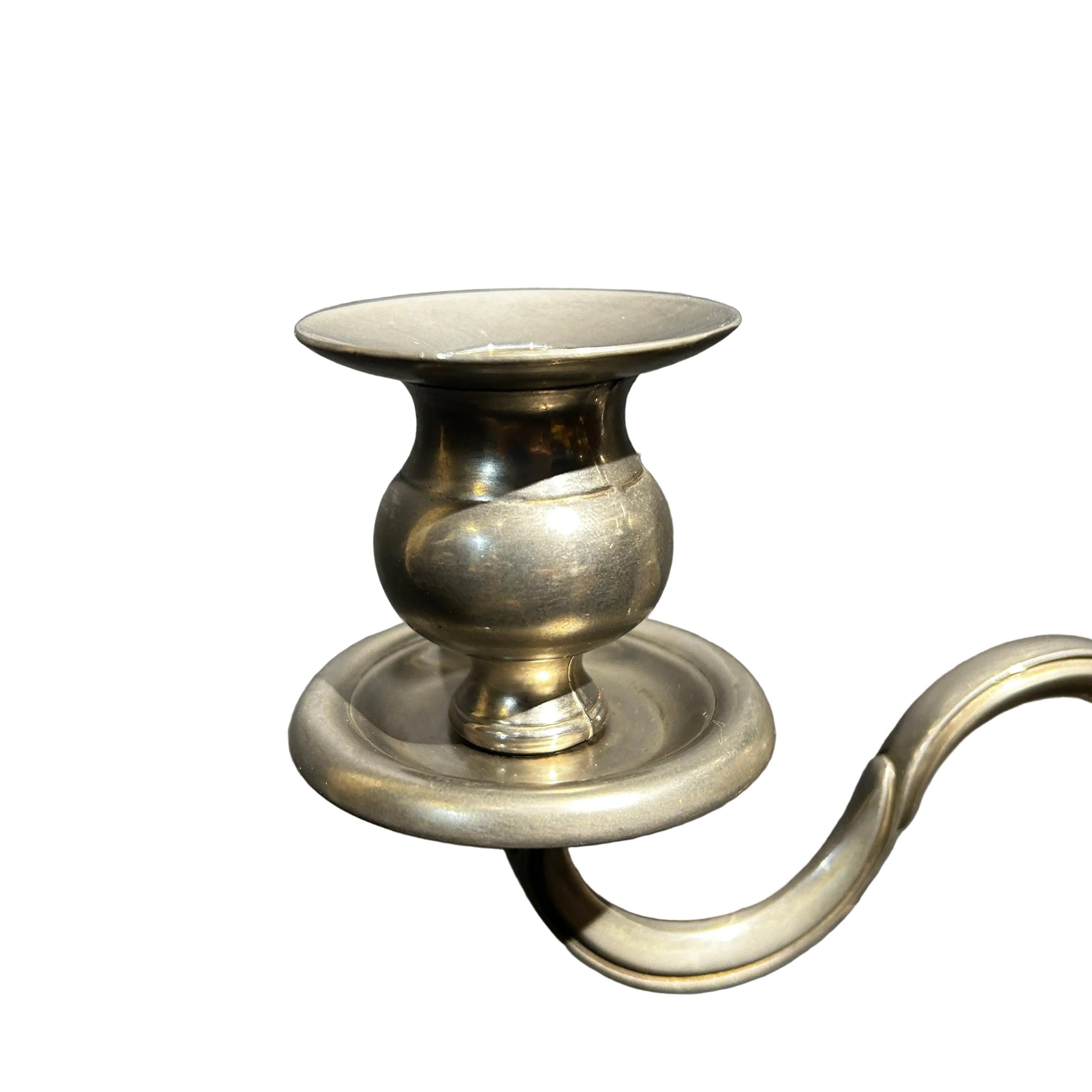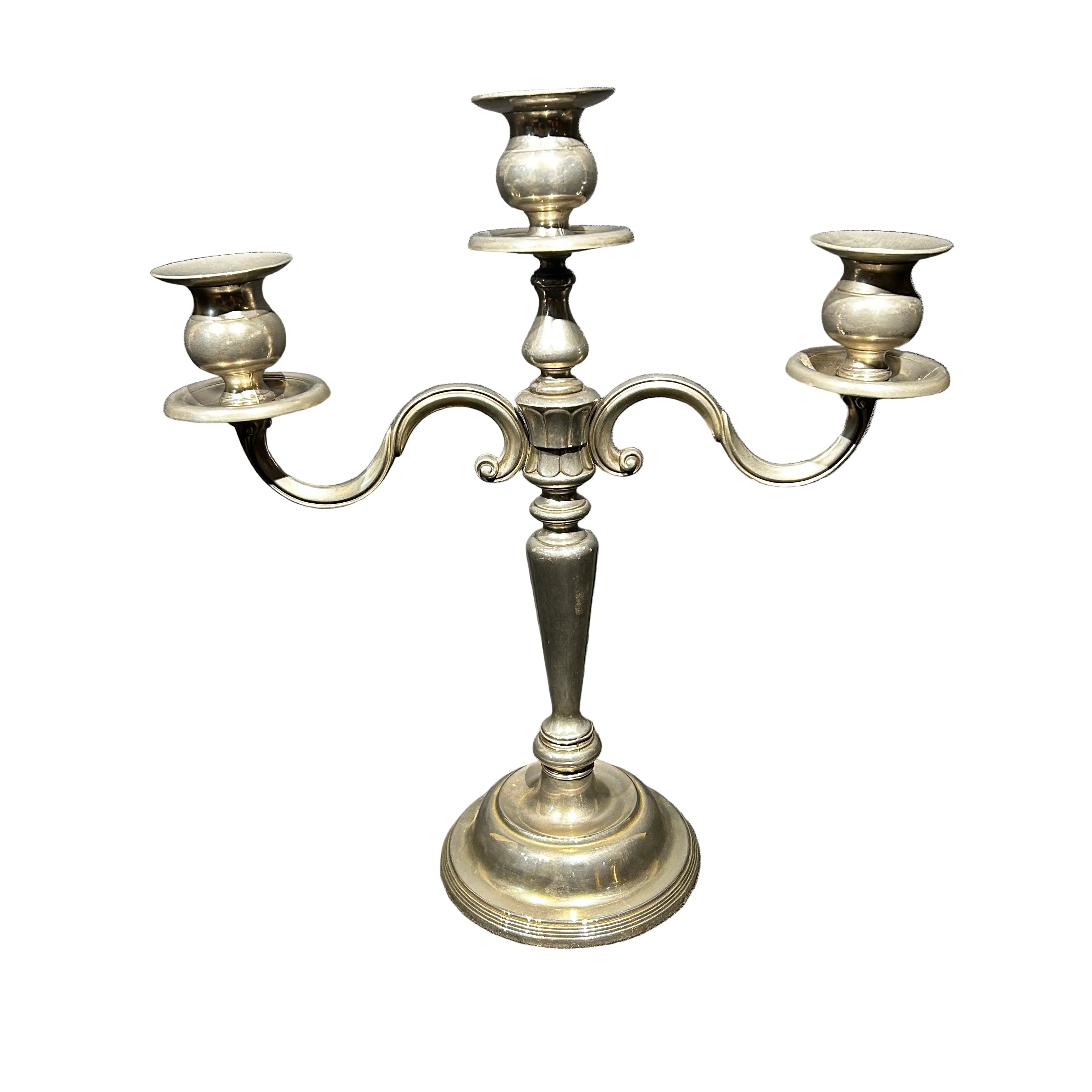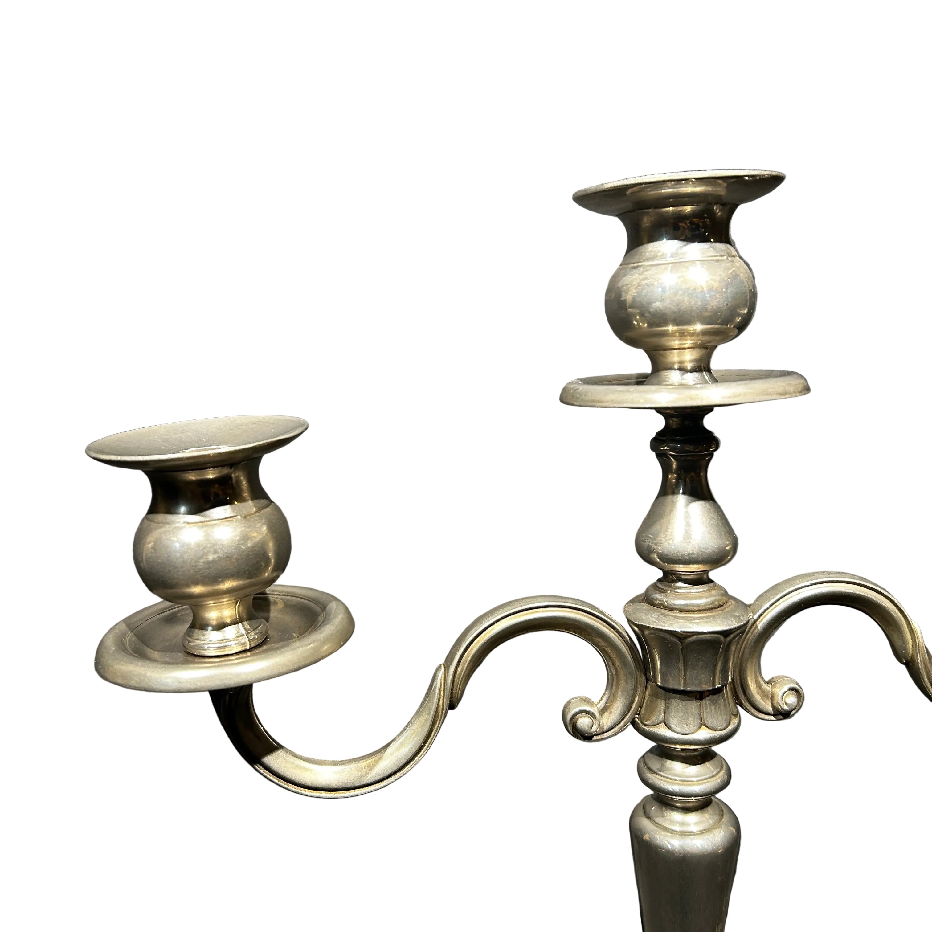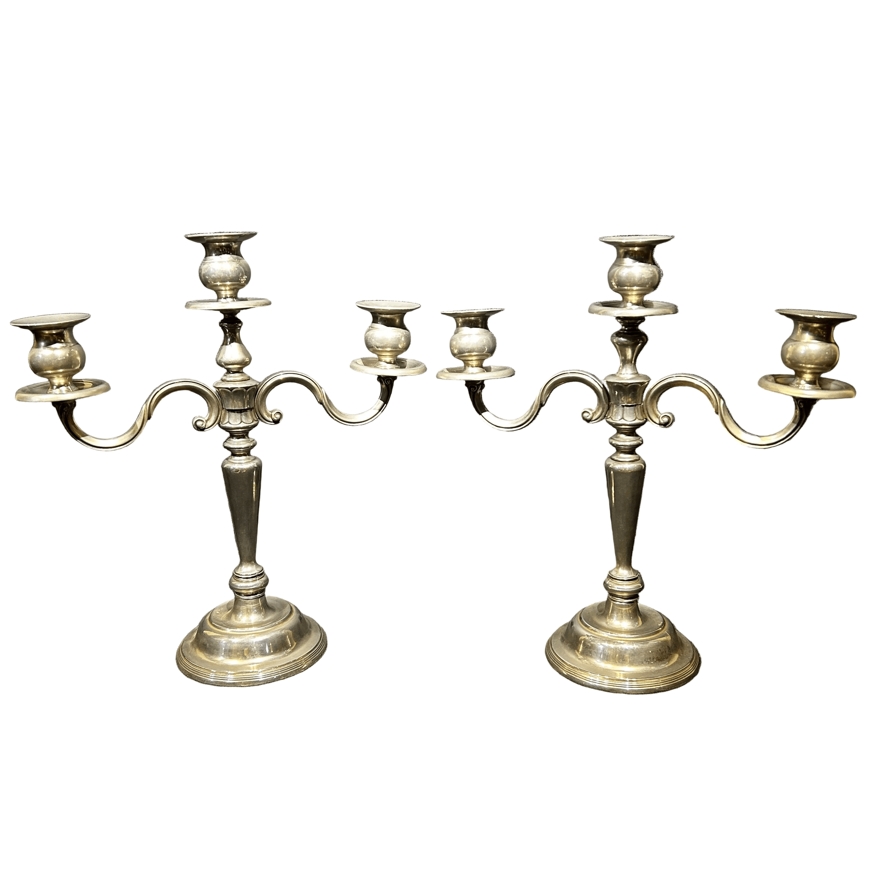 Bella pareja de candelabros de plaque con un diseño en decoraciones curvas de tres luces y base redonda.