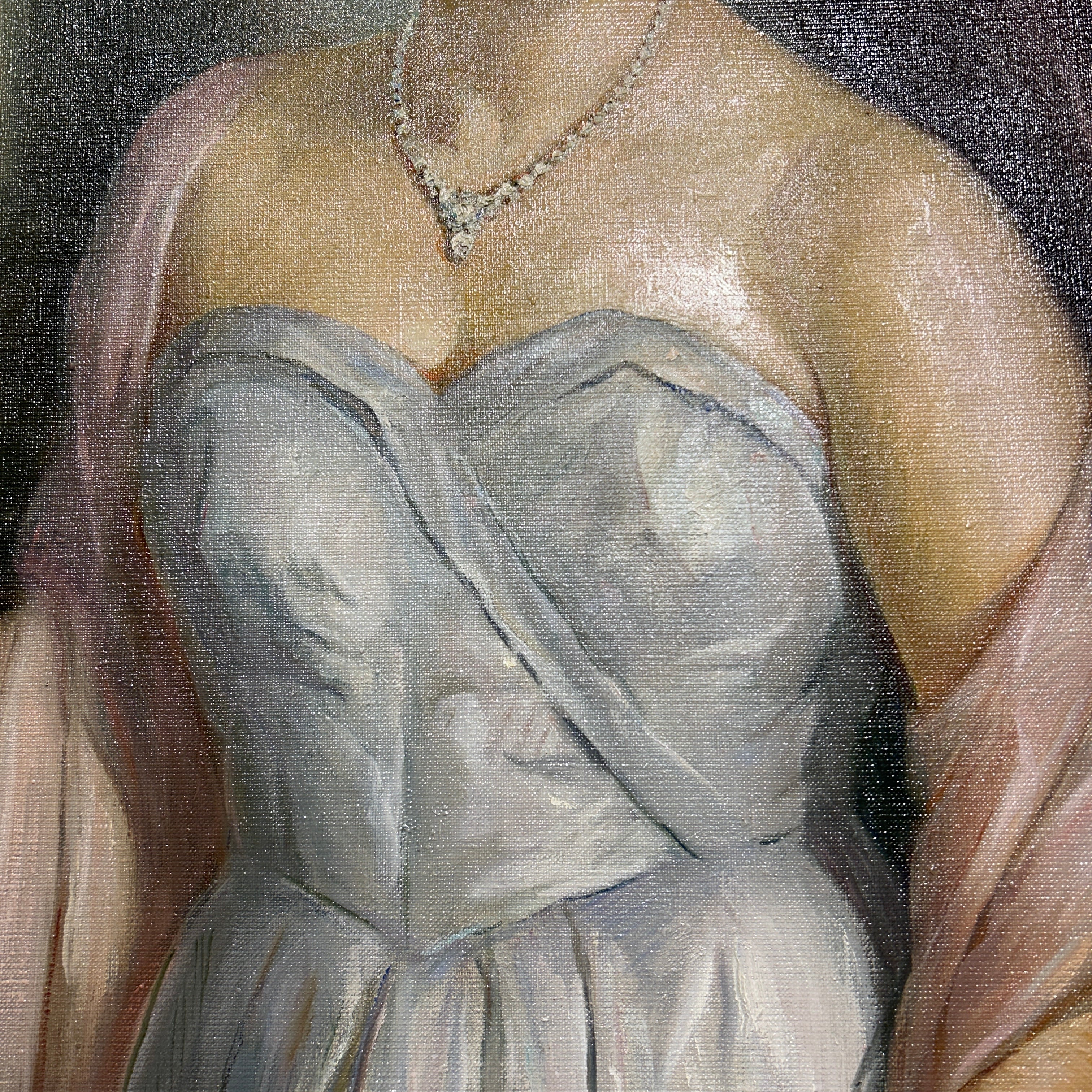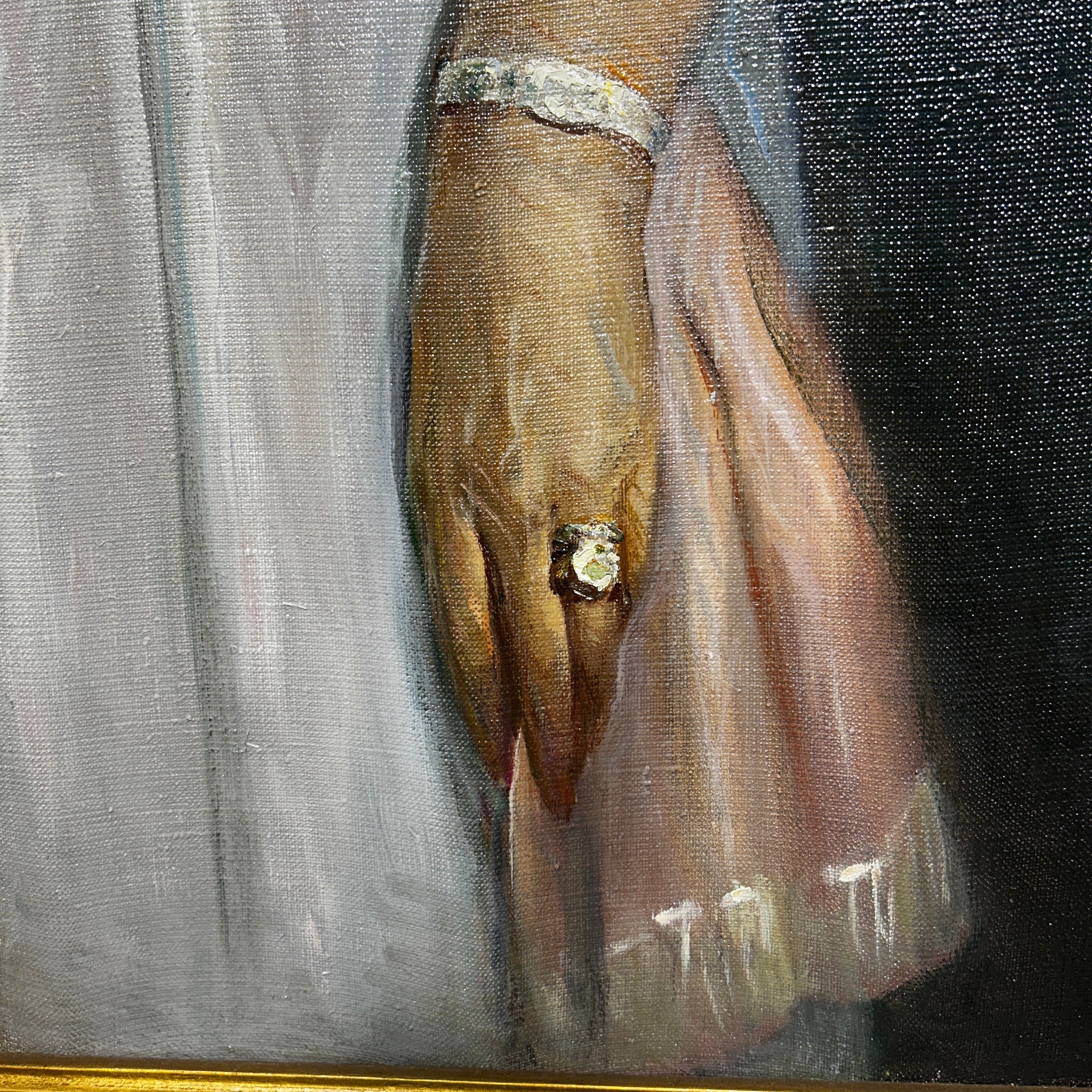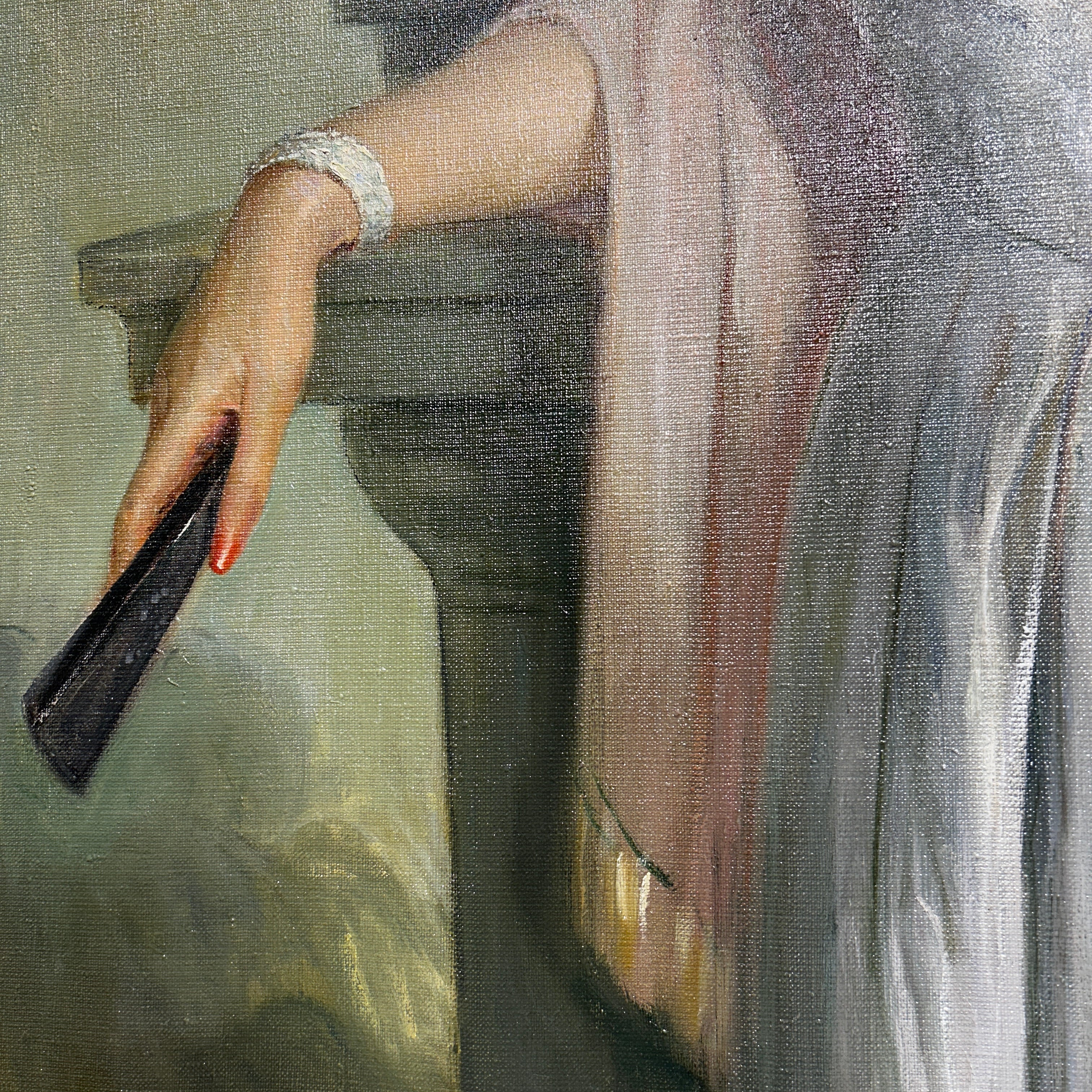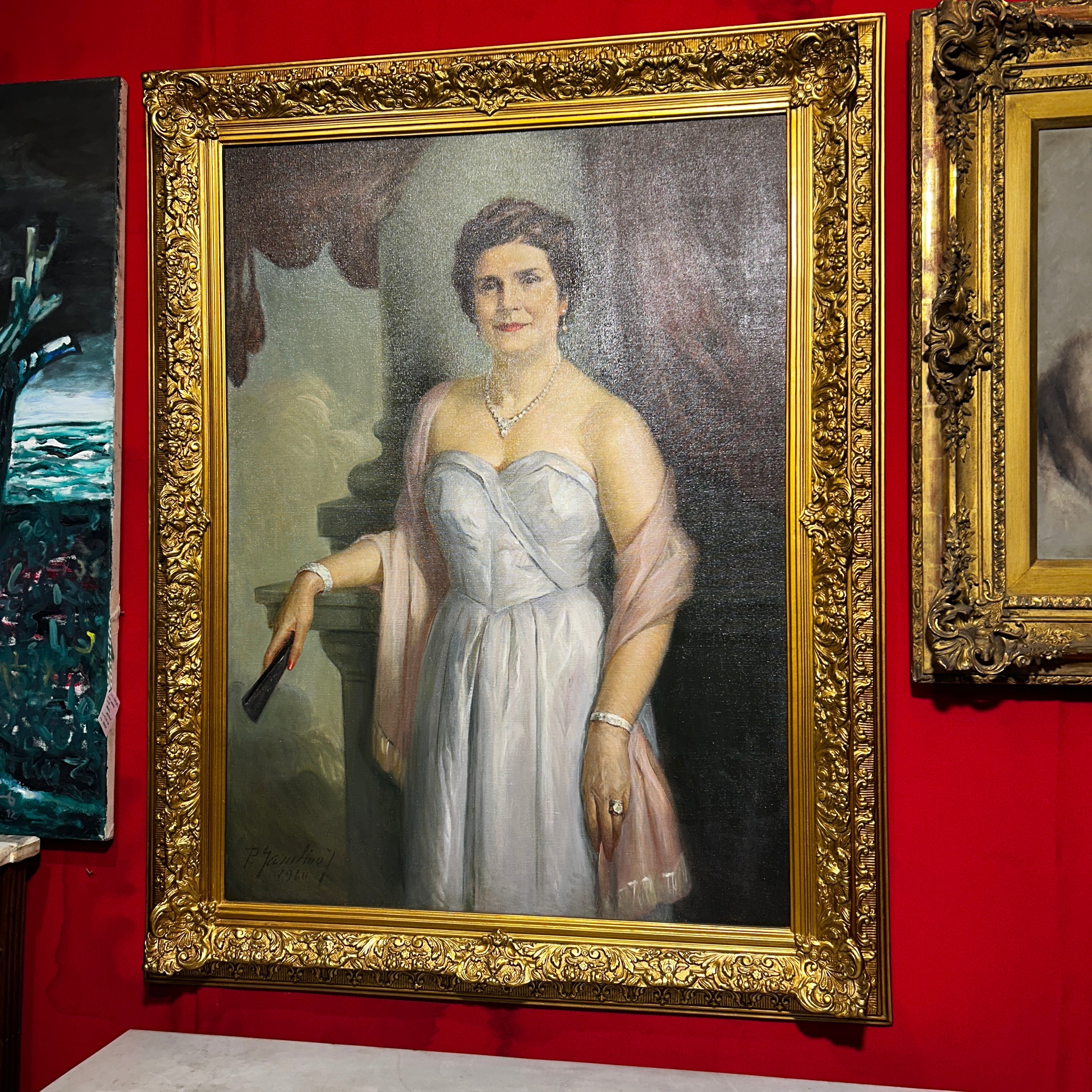 Óleo sobre tela del pintor chileno Pascual Gambino, representado a una dama de una elegancia sobria, vestida de fiesta. La señora tiene un gesto que esboza una leve sonrisa y un gesto relajado, con un abanico cerrado en una de sus manos, que sugiere un contexto formal, pero de celebración. Se trata de un retrato que muestra el gran oficio del pintor, con un bello juego de luces y detalles en la caída de las telas, la textura de la piel, su peinado y los brillantes de su joyería. Además, al ser pintado en 1960, se convierte en una pieza que en pocos elementos permite leer mucho acerca de la aristocracia de la época, su estética y, por lo tanto, sus valores. La obra tiene un marco de madera tallada en intrincados decorados de relieves y está terminada de un luminoso dorado.