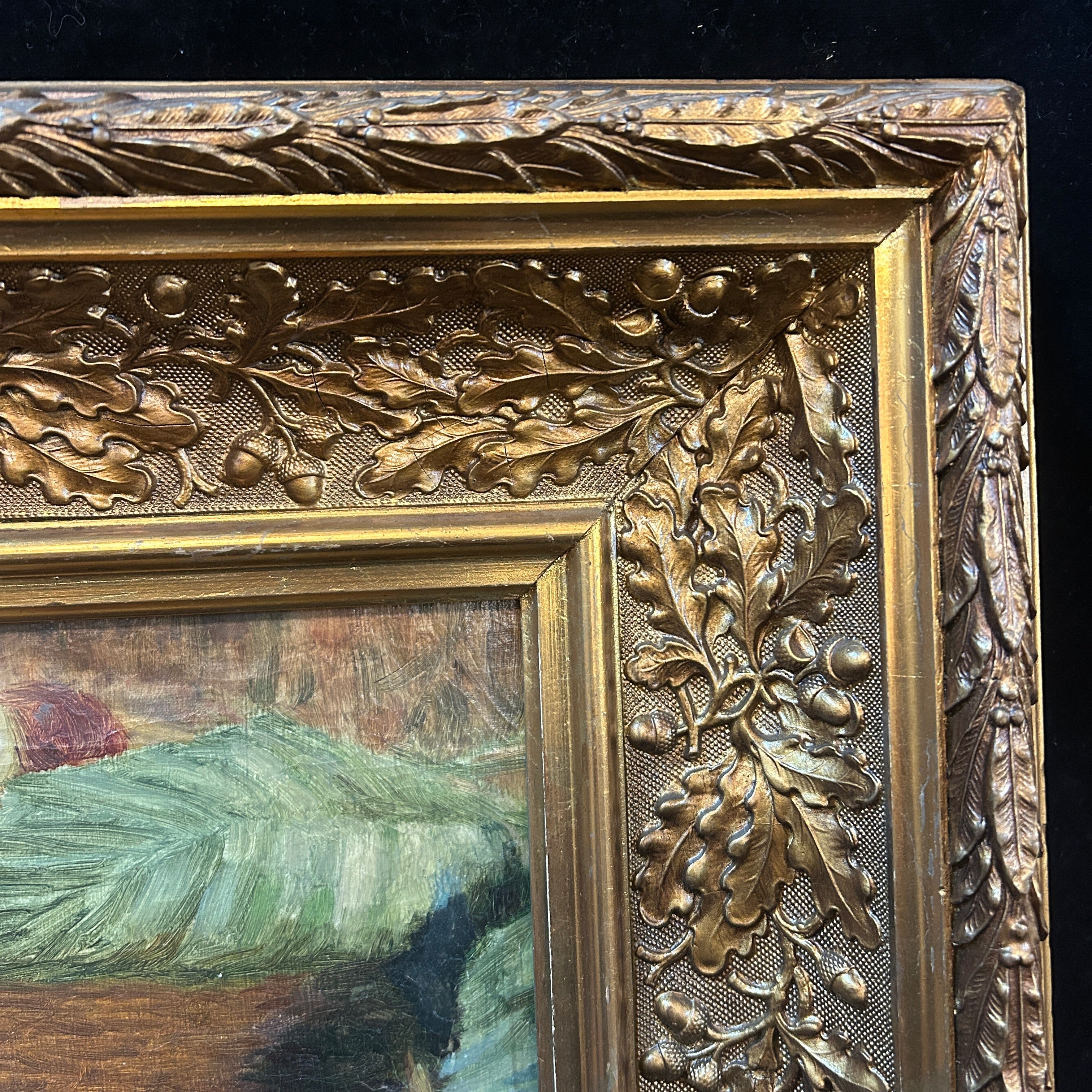 Óleo sobre tela del artista chileno Demetrio Reveco (1862-1920), representando un bodegón de duraznos  sobre una mesa, con algunas hojas y nísperos. En el fondo se ve un canasto con más fruta. El cuadro está enmarcado en madera tallada en relieves y terminada de un elegante dorado.