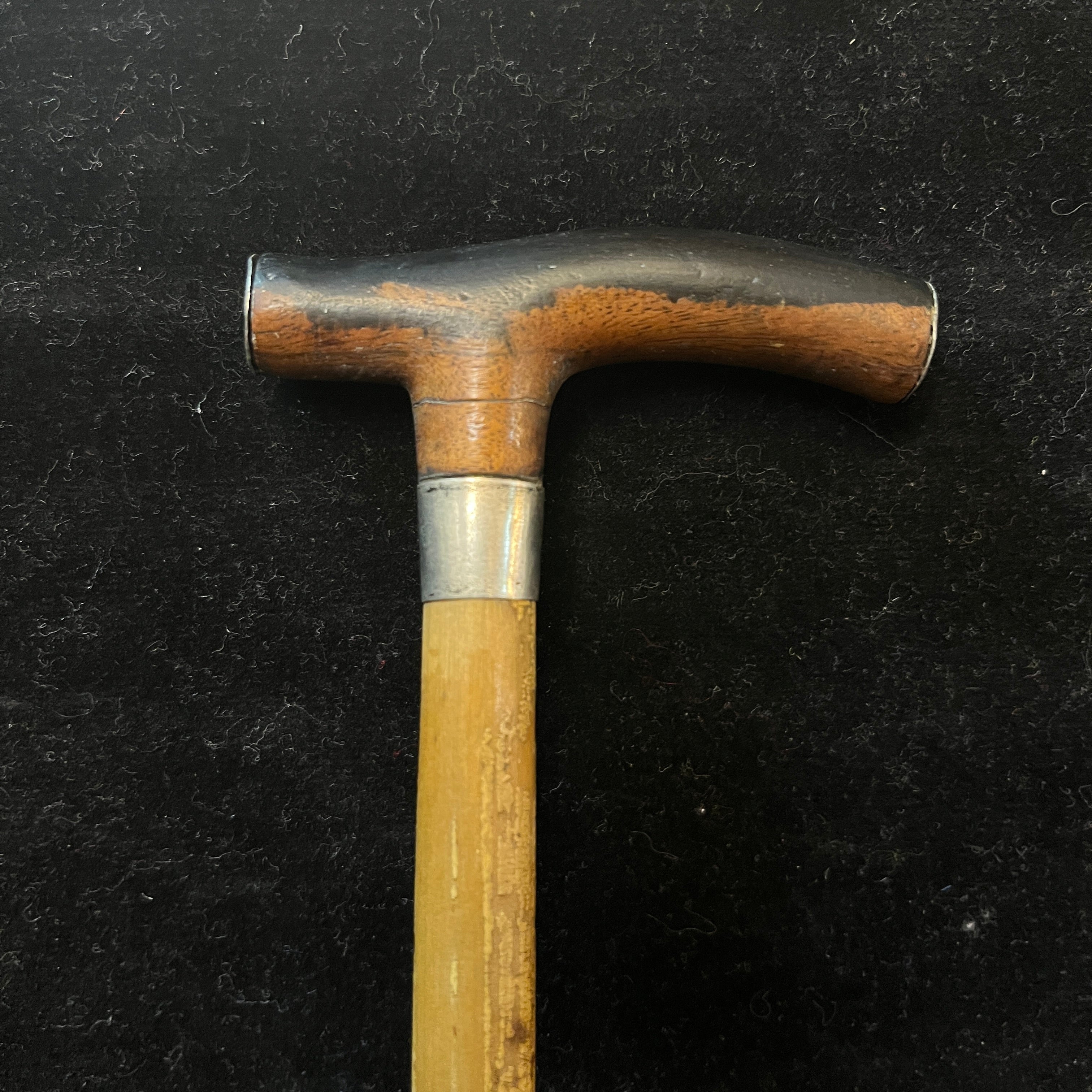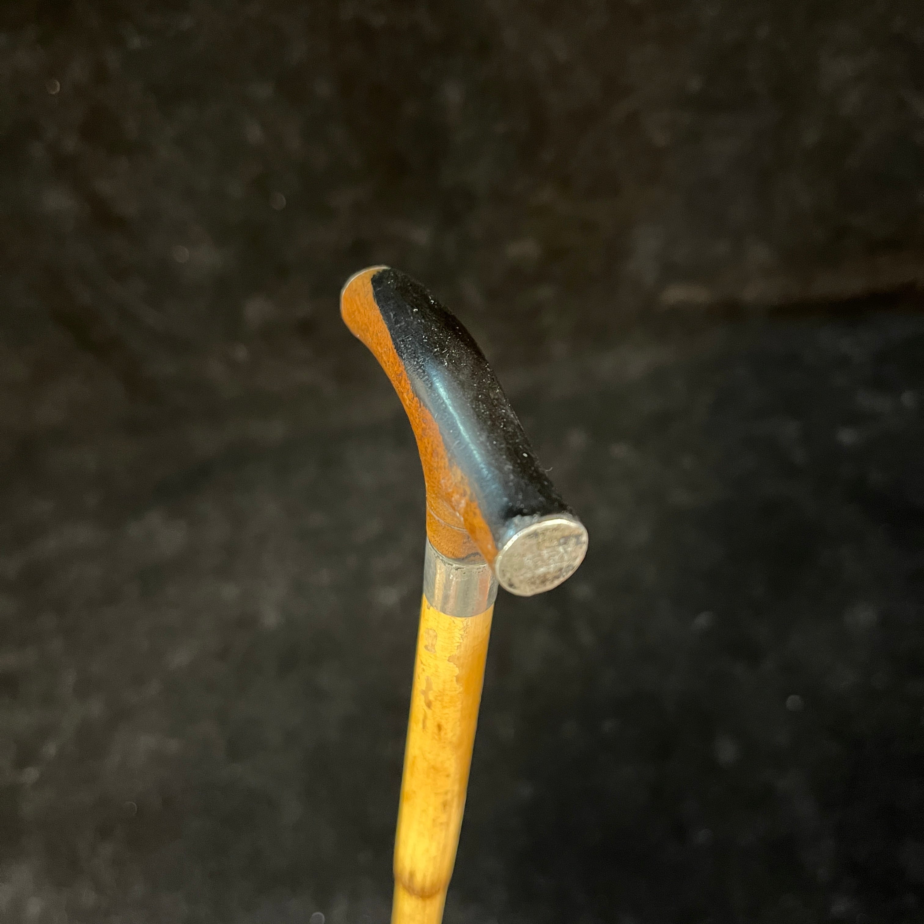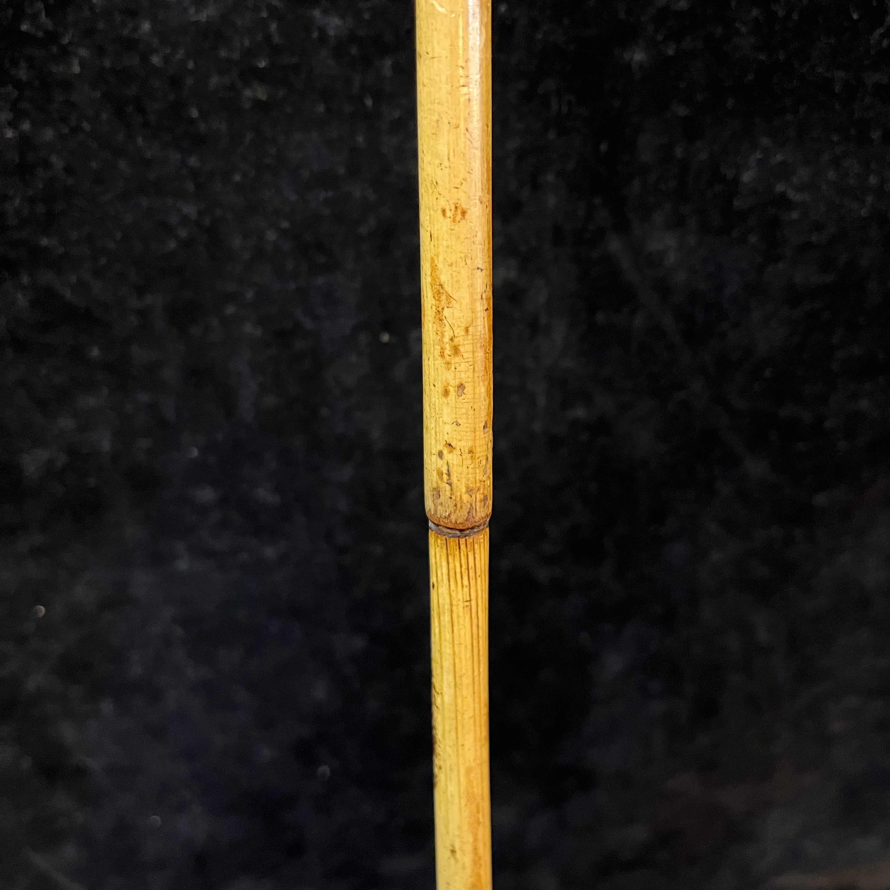 Elegante bastón de dama hecho de bambú con mango de madera y aplicaciones en metal. En su mango también una de. susaplicaciones metálicas tiene un selli con una corona.