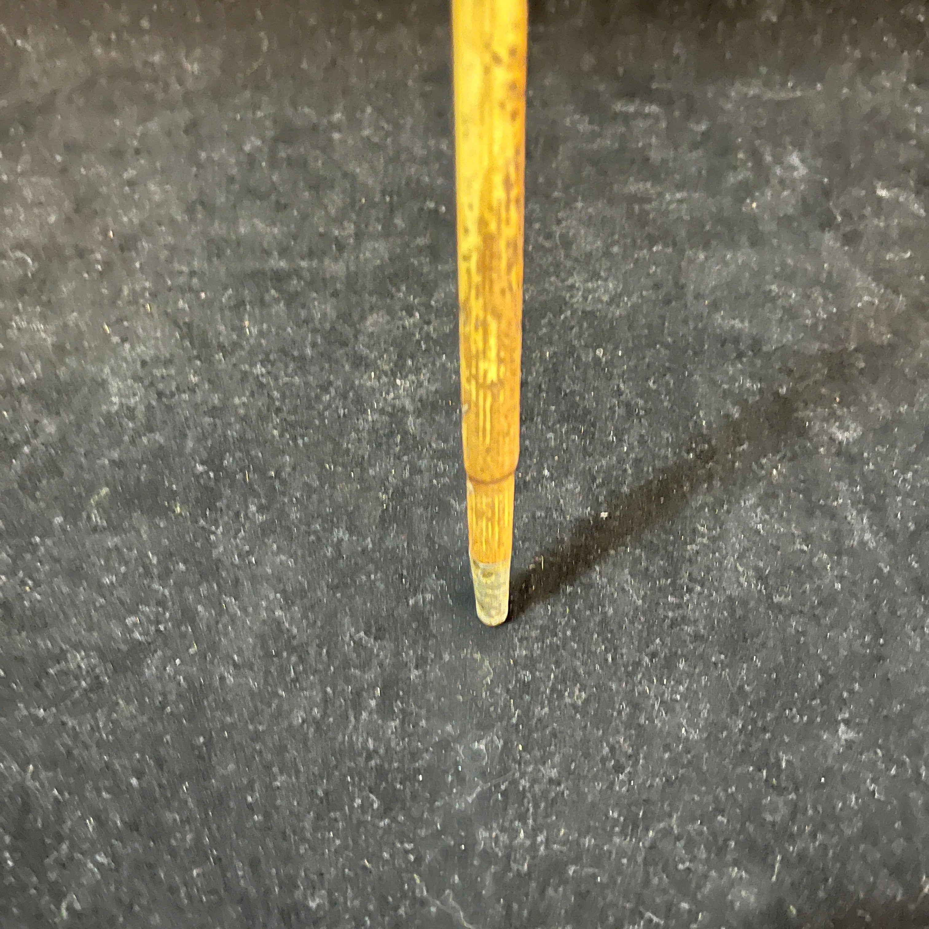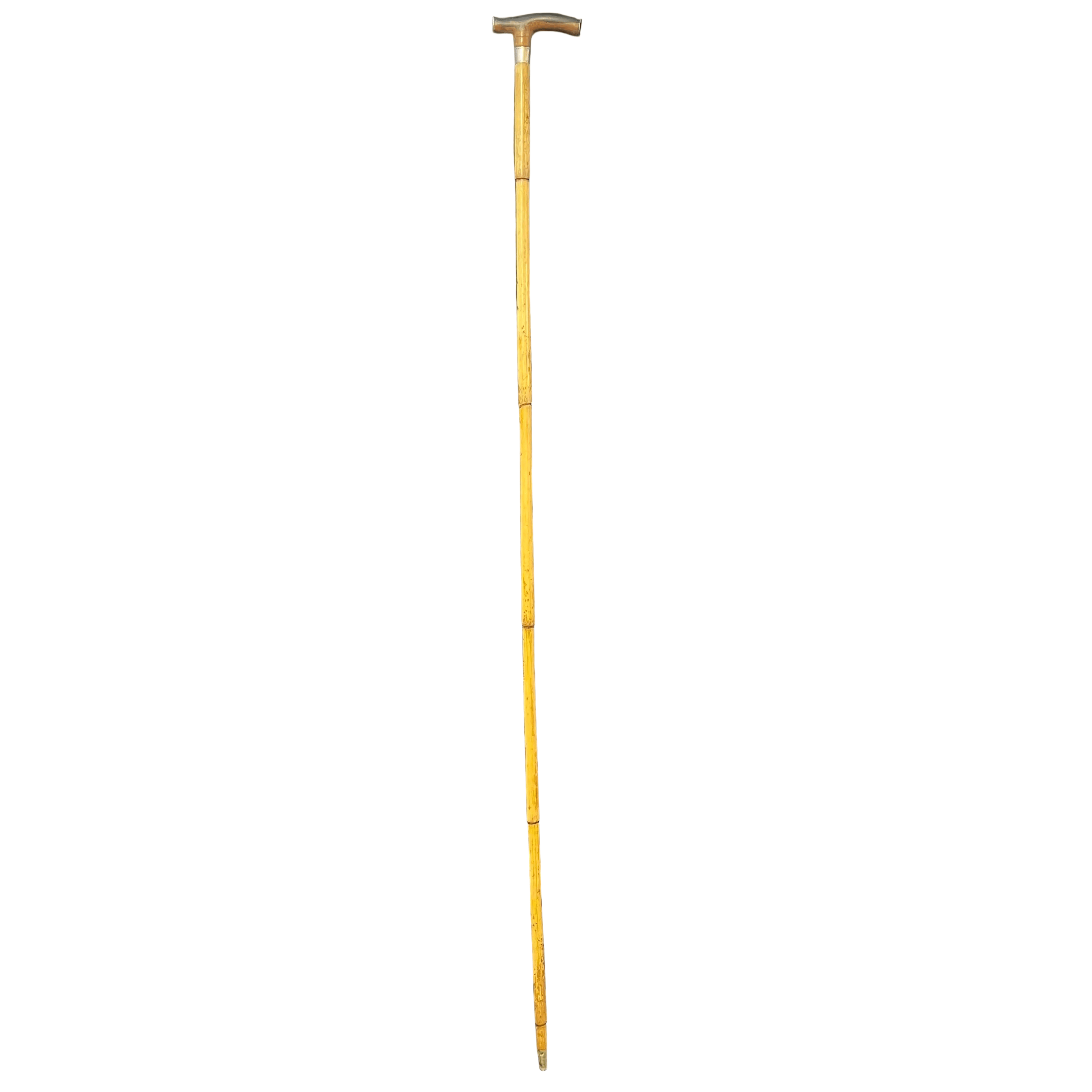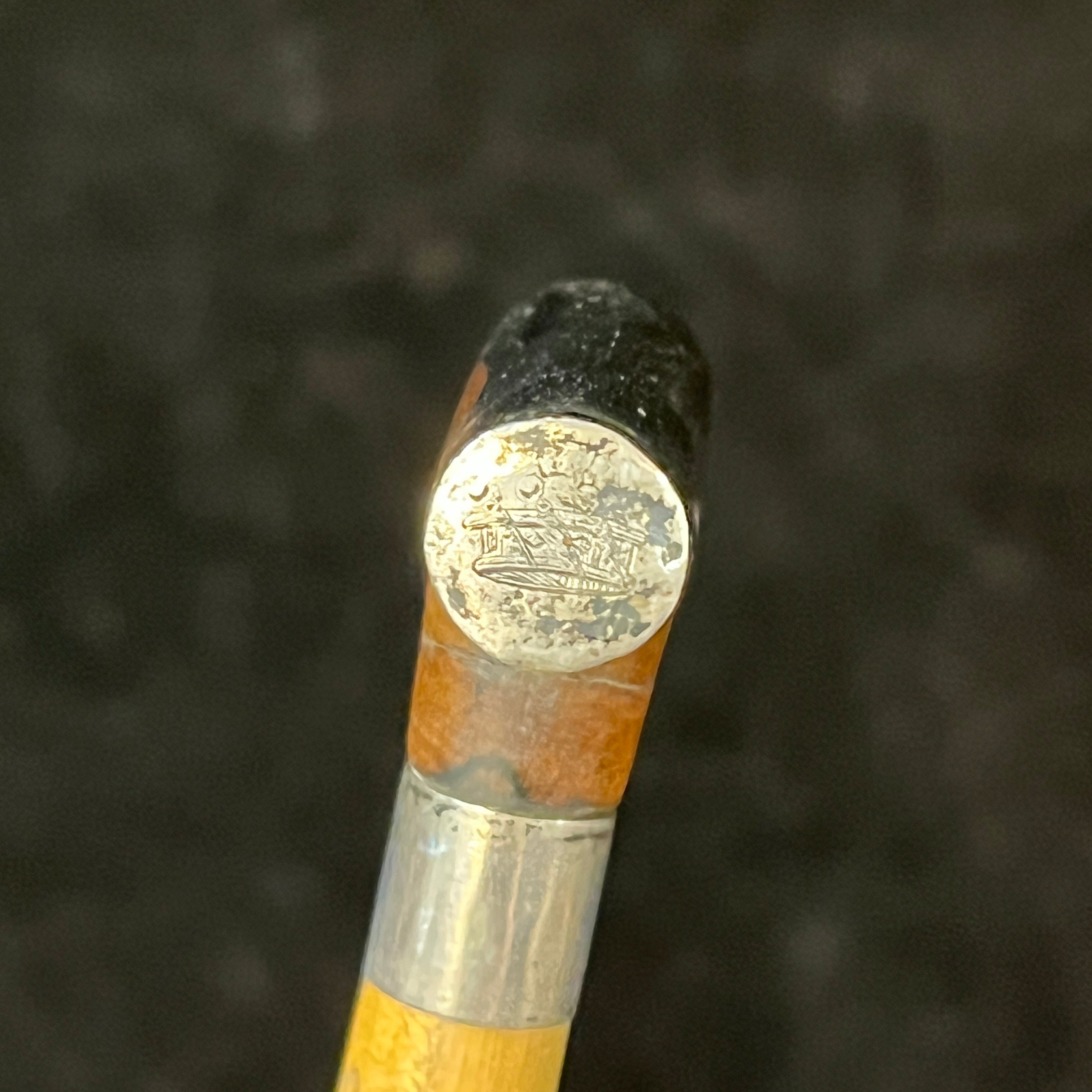 Elegante bastón de dama hecho de bambú con mango de madera y aplicaciones en metal. En su mango también una de. susaplicaciones metálicas tiene un selli con una corona.