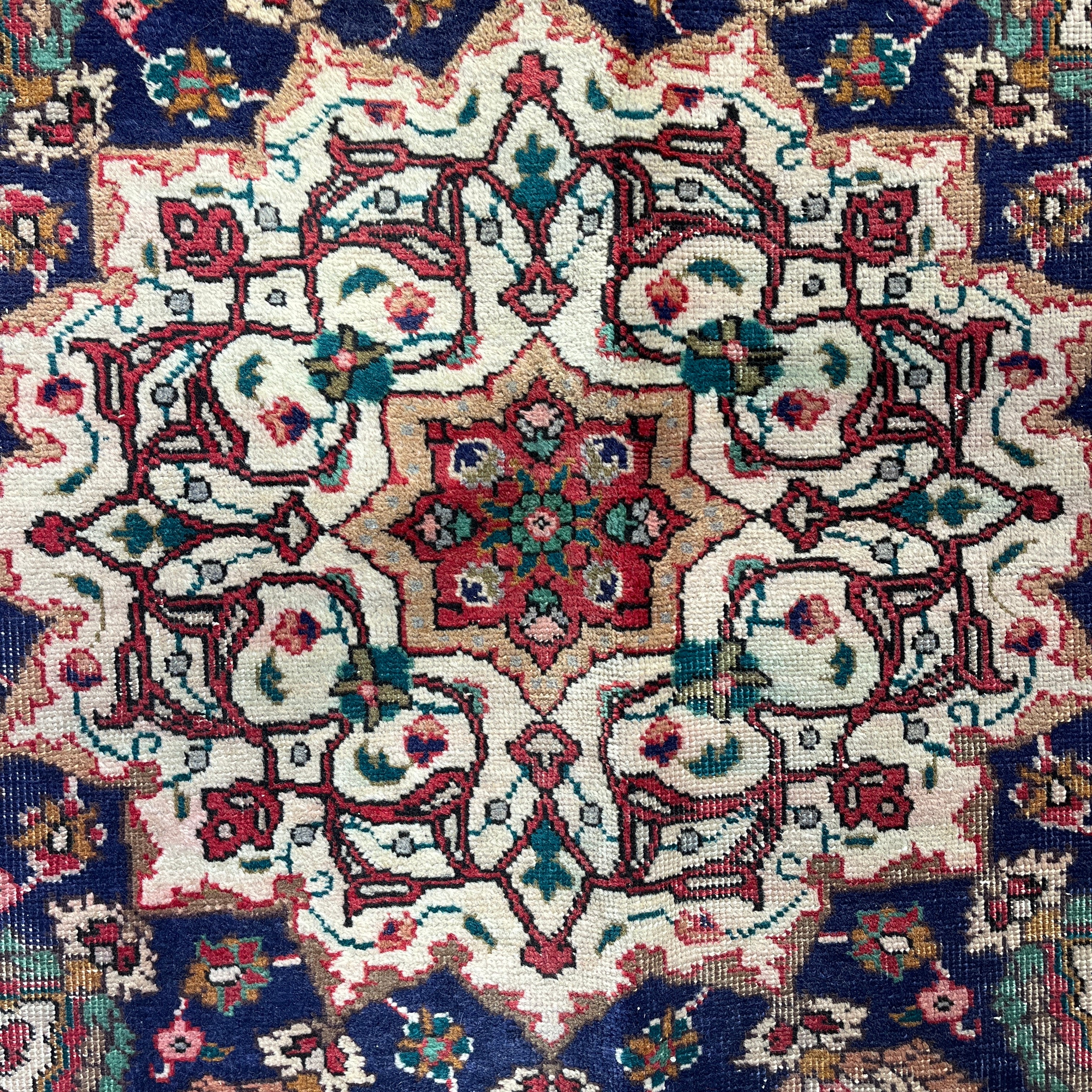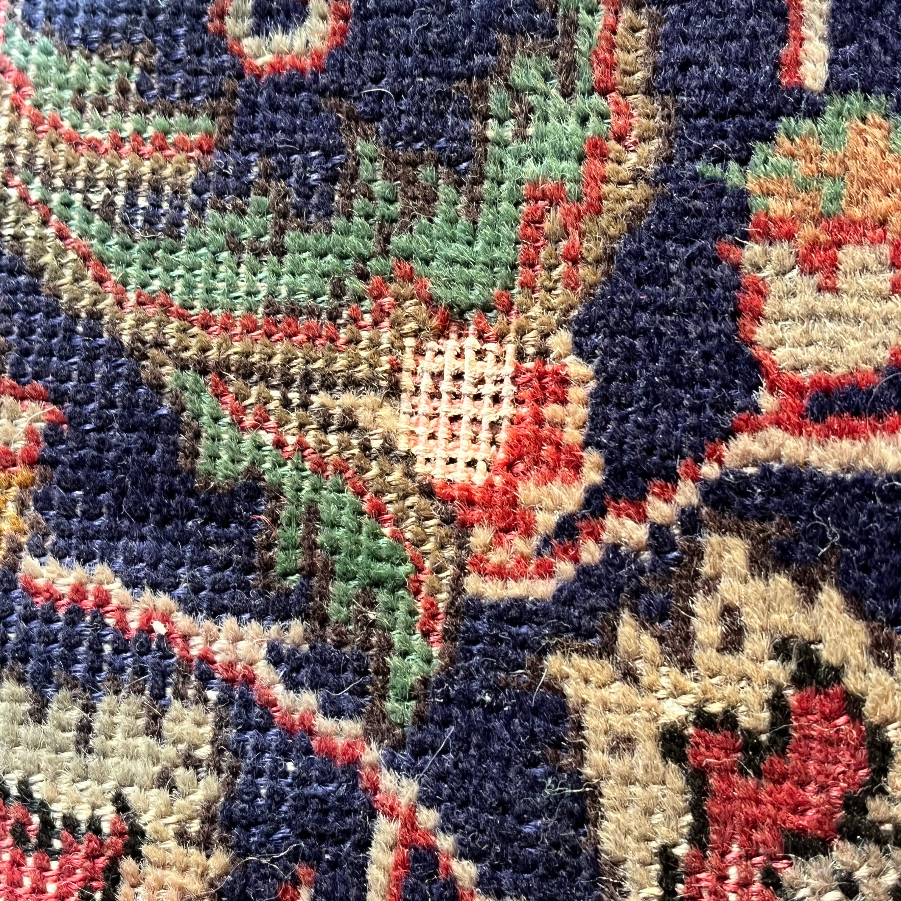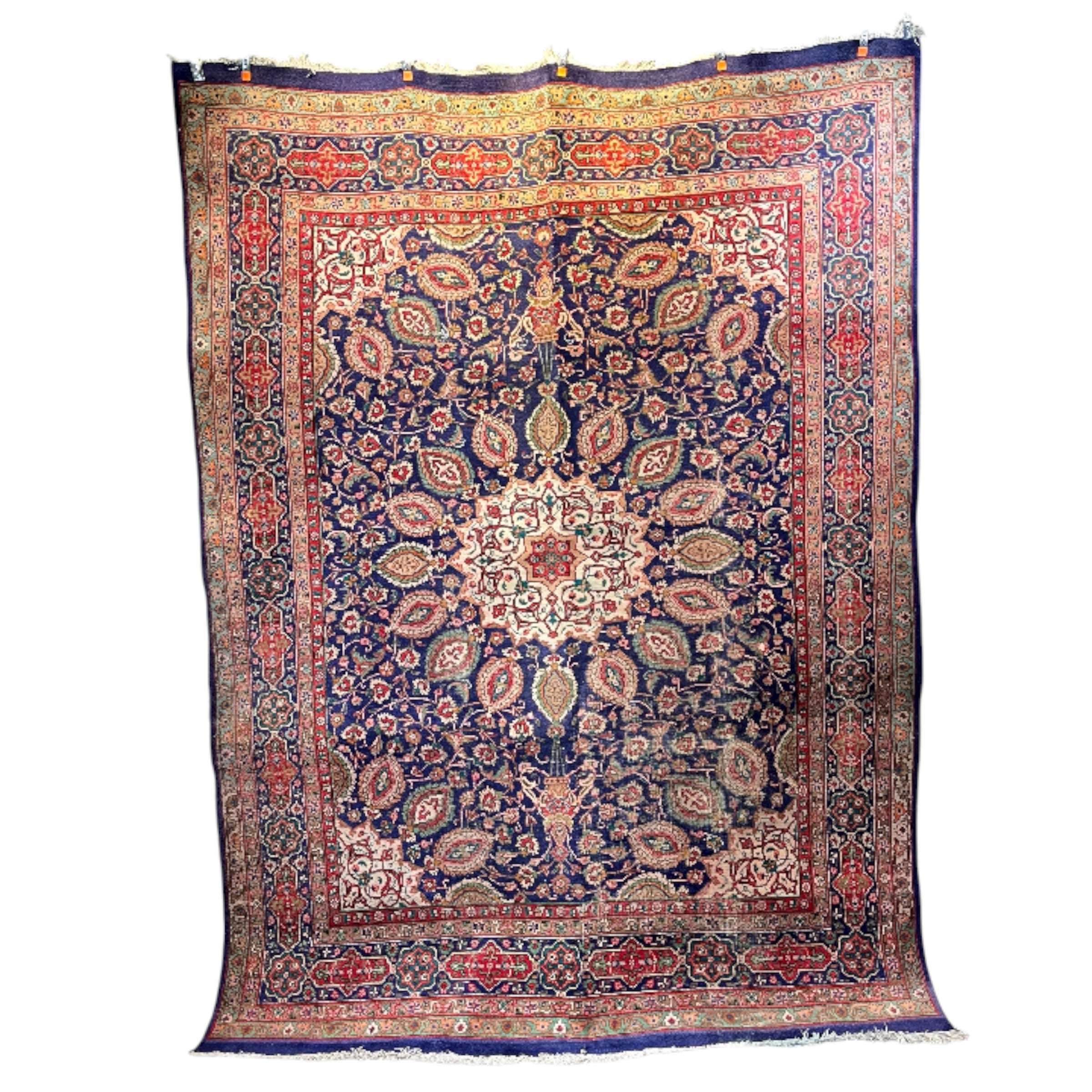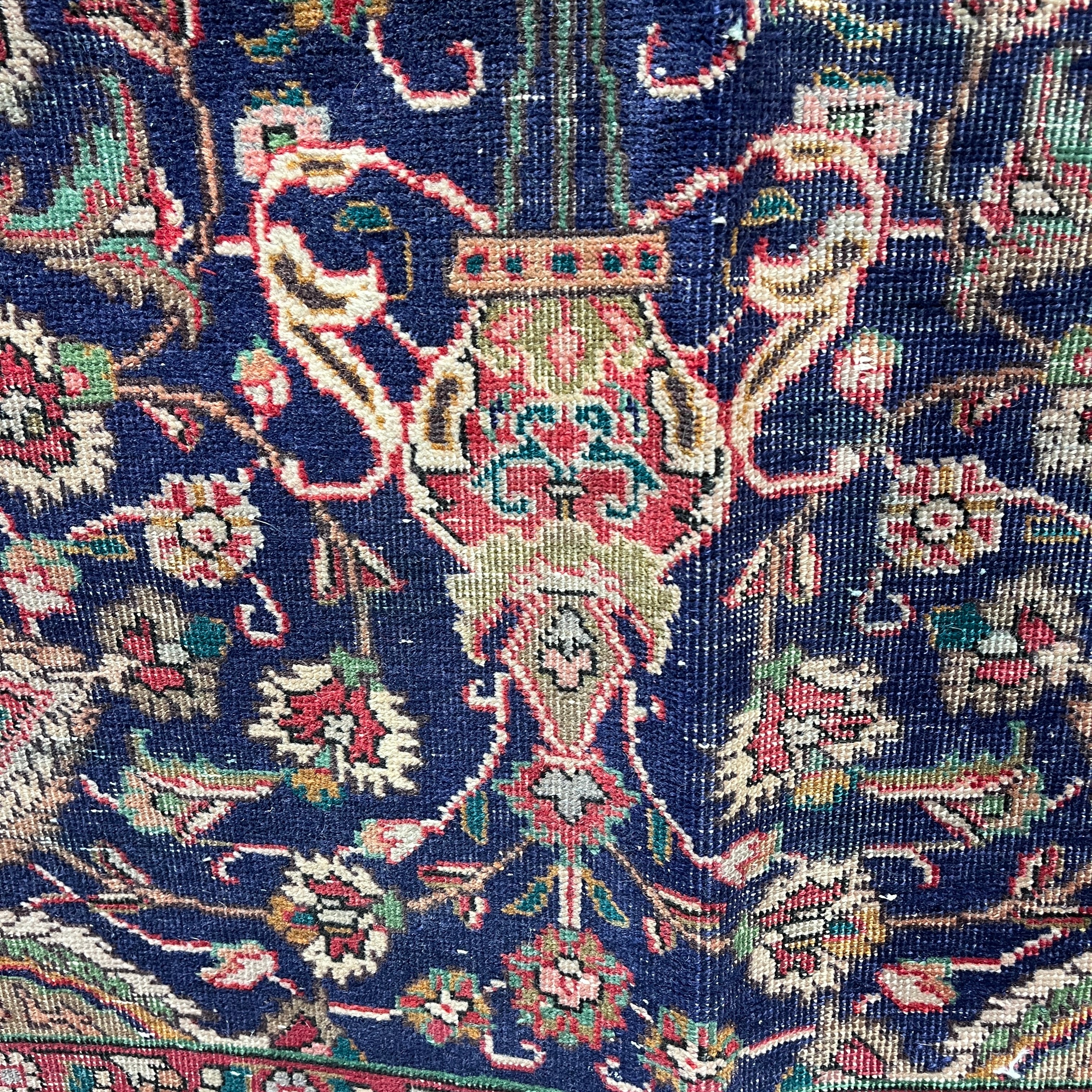 Espectacular alfombra Iraní de la región central, hecha de lana tejida y teñida a mano con tintes vegetales. La alfombra tiene un diseño de medallón floral en su centro, en el que predomina un tono de azul profundo que hace resaltar los decorados en motivos florales de su zona de "jardín", terminado en sus cuatro esquinas por un diseño geométrico color marfil. Las cenefas que bordean esta pieza, por su parte, son de color naranjo, azul, índigo y marfil, con motivos florales de colores.