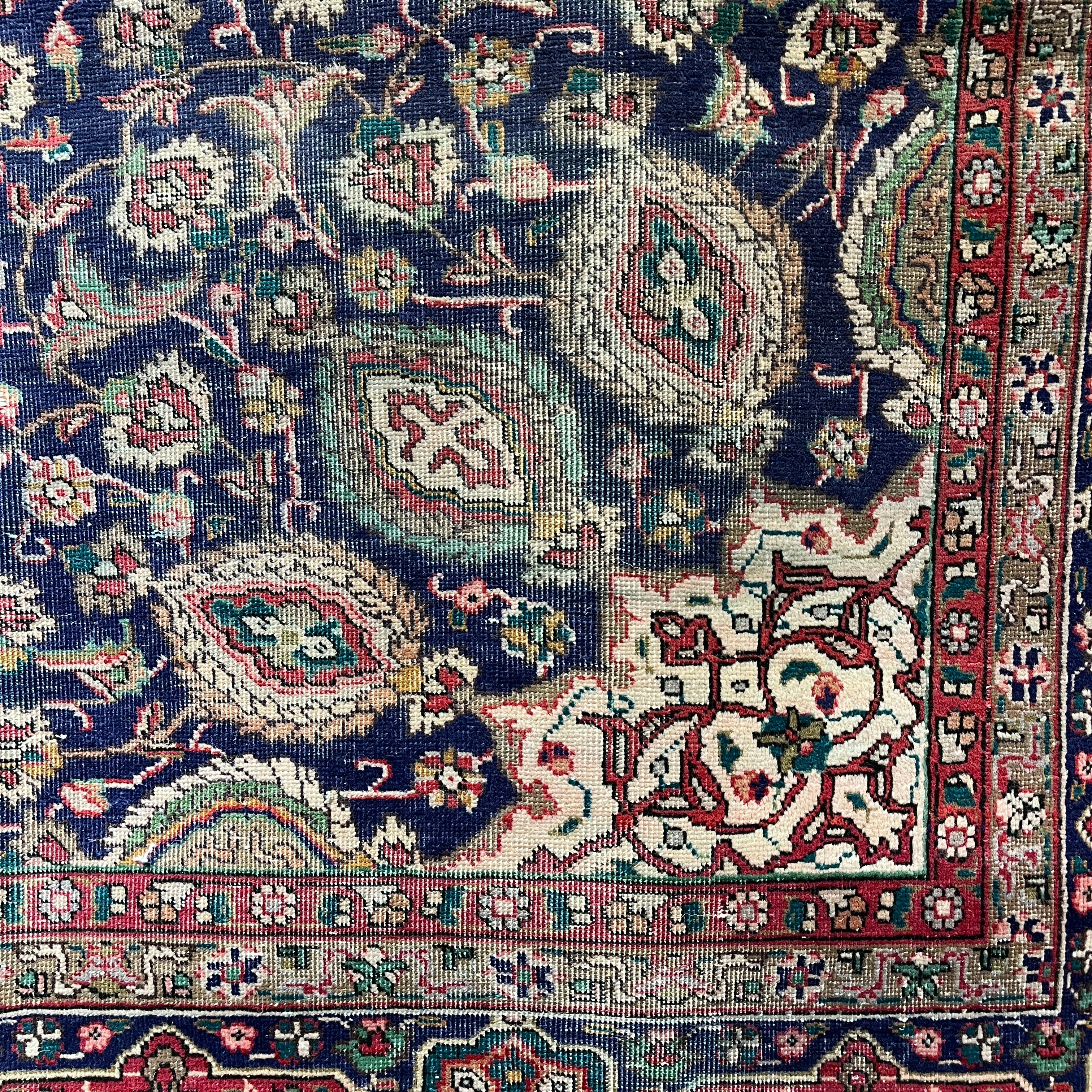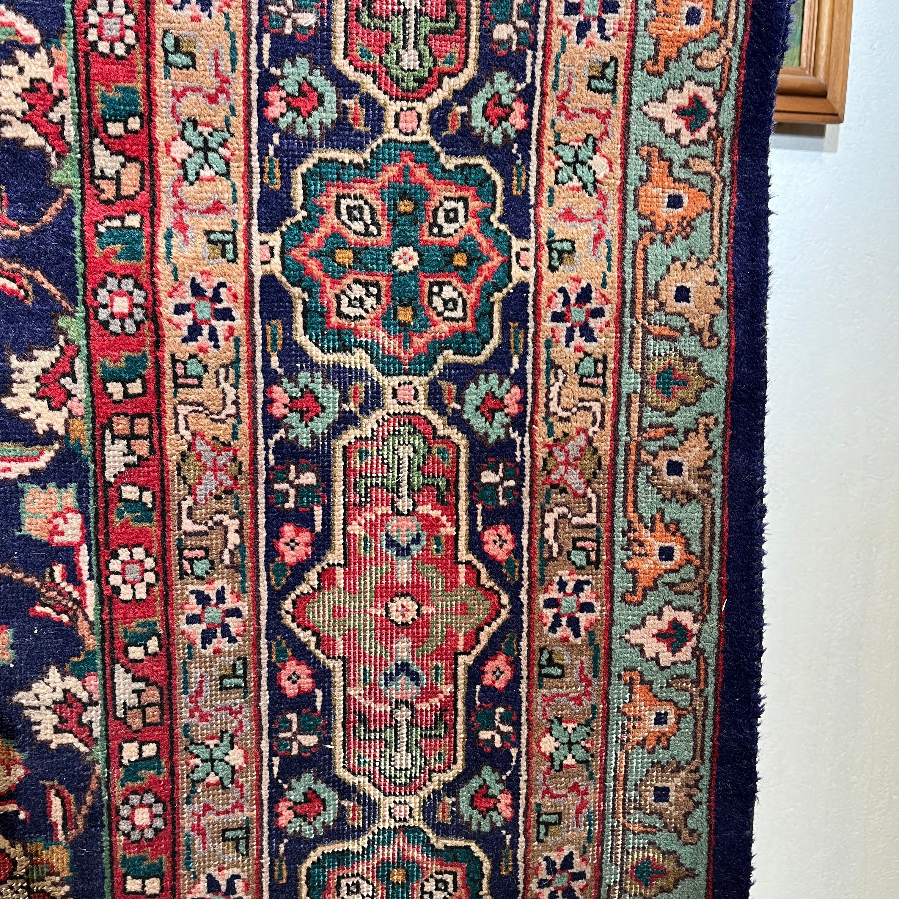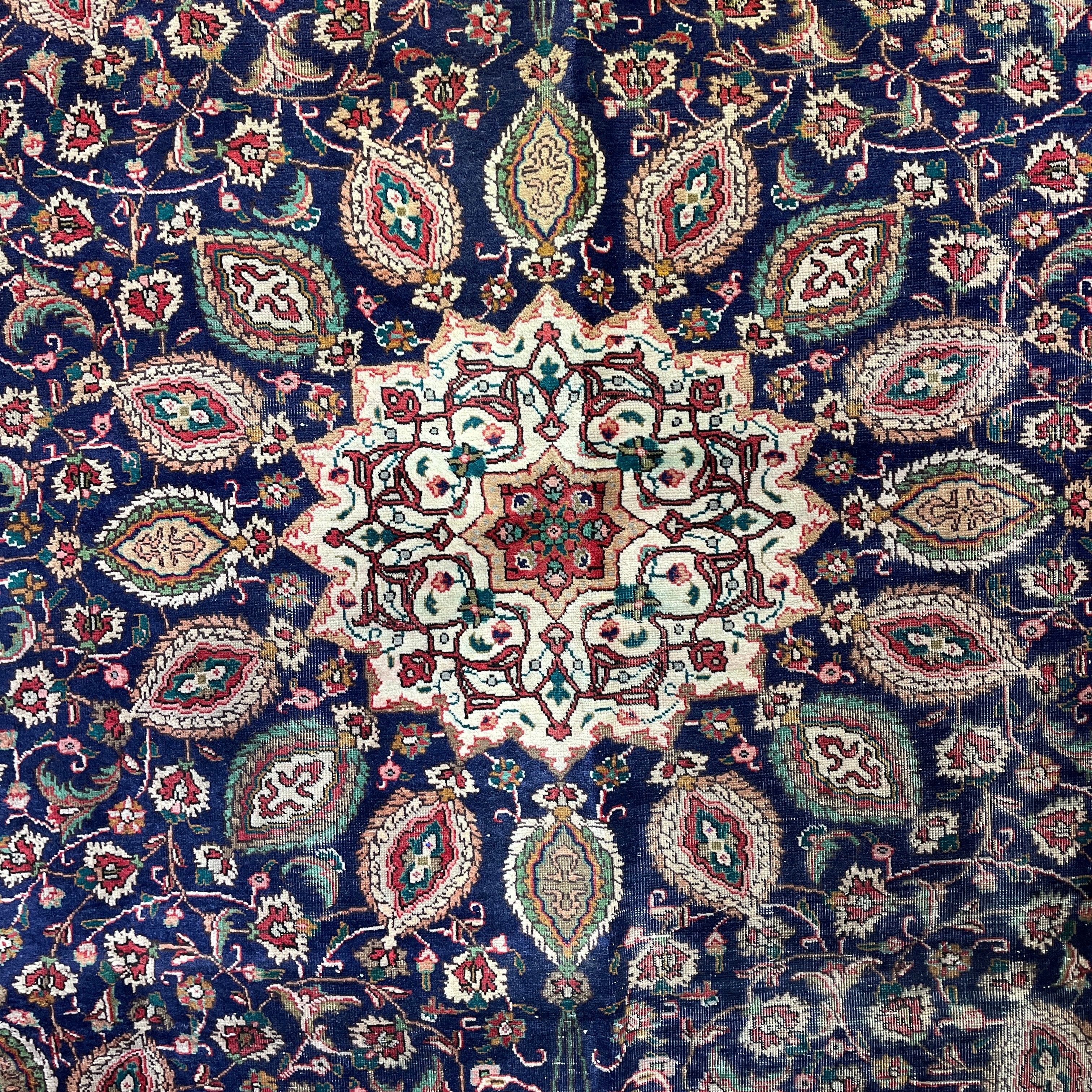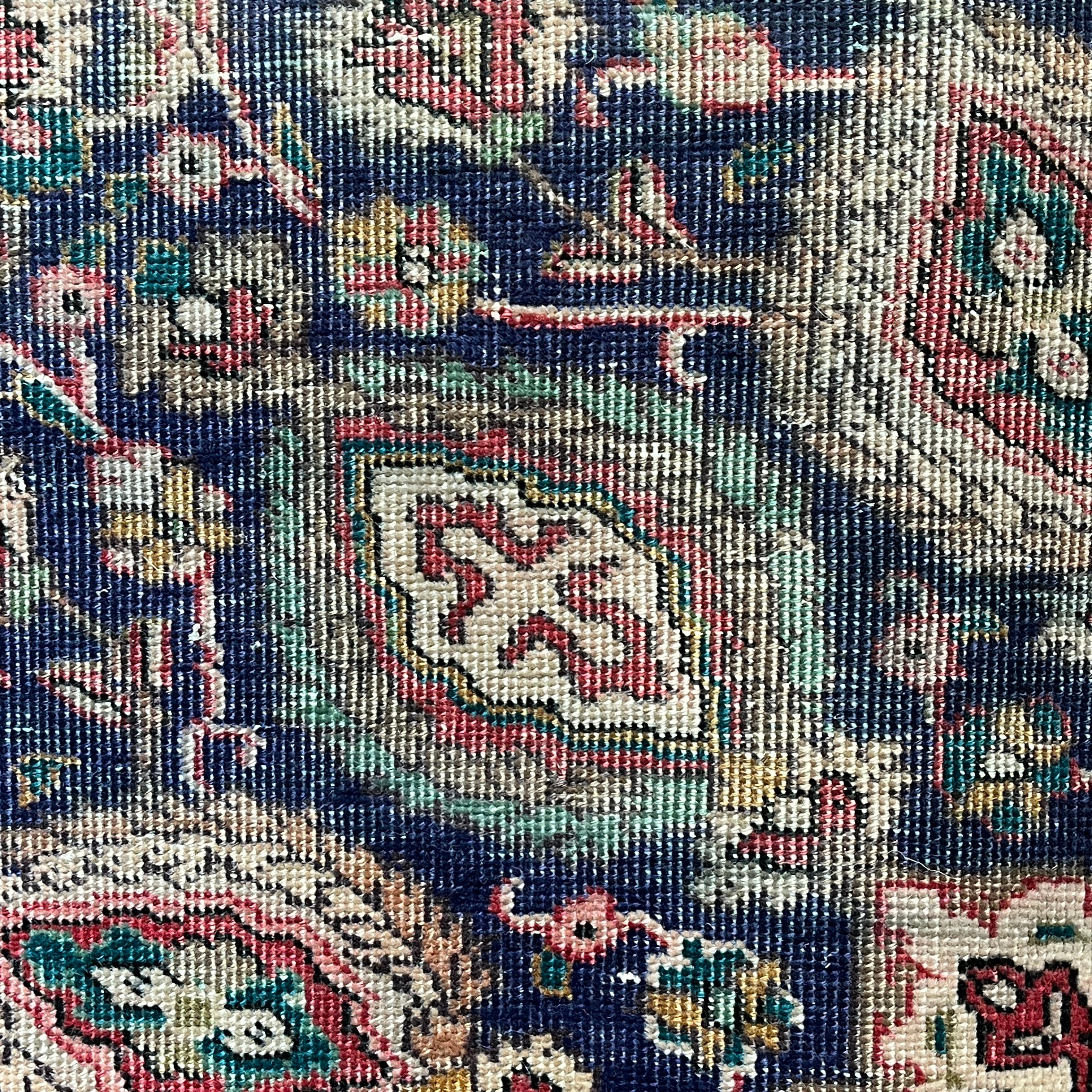 Espectacular alfombra Iraní de la región central, hecha de lana tejida y teñida a mano con tintes vegetales. La alfombra tiene un diseño de medallón floral en su centro, en el que predomina un tono de azul profundo que hace resaltar los decorados en motivos florales de su zona de "jardín", terminado en sus cuatro esquinas por un diseño geométrico color marfil. Las cenefas que bordean esta pieza, por su parte, son de color naranjo, azul, índigo y marfil, con motivos florales de colores.