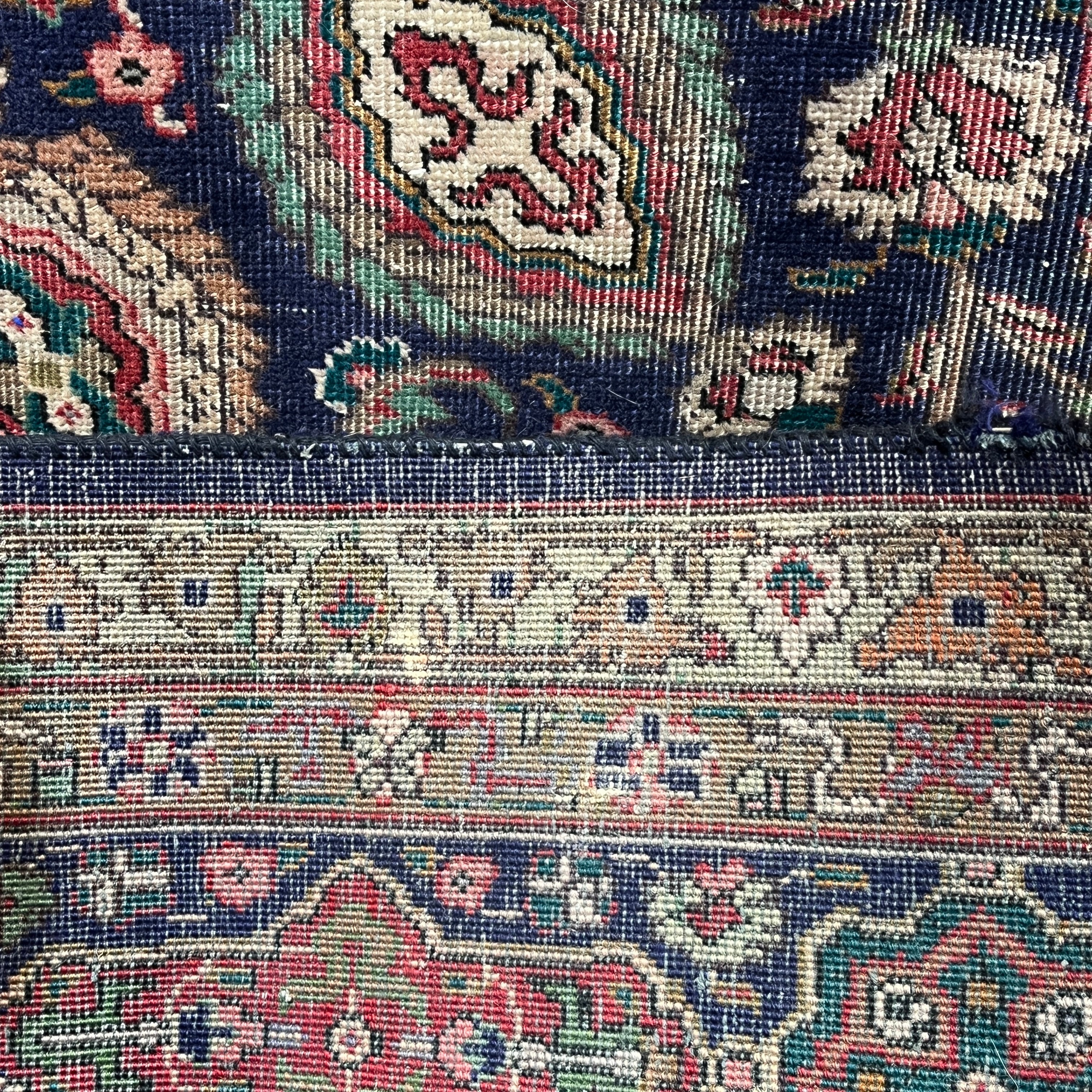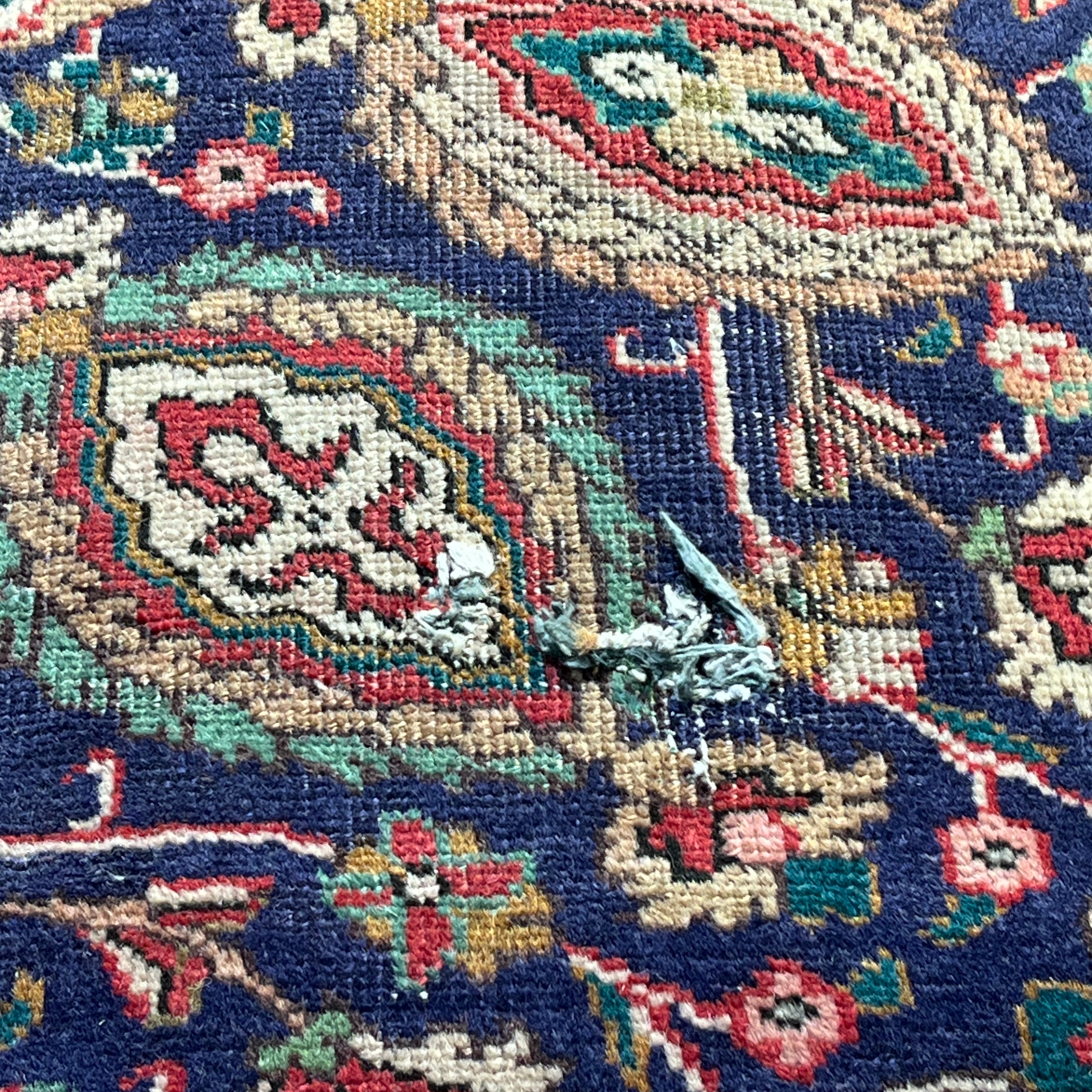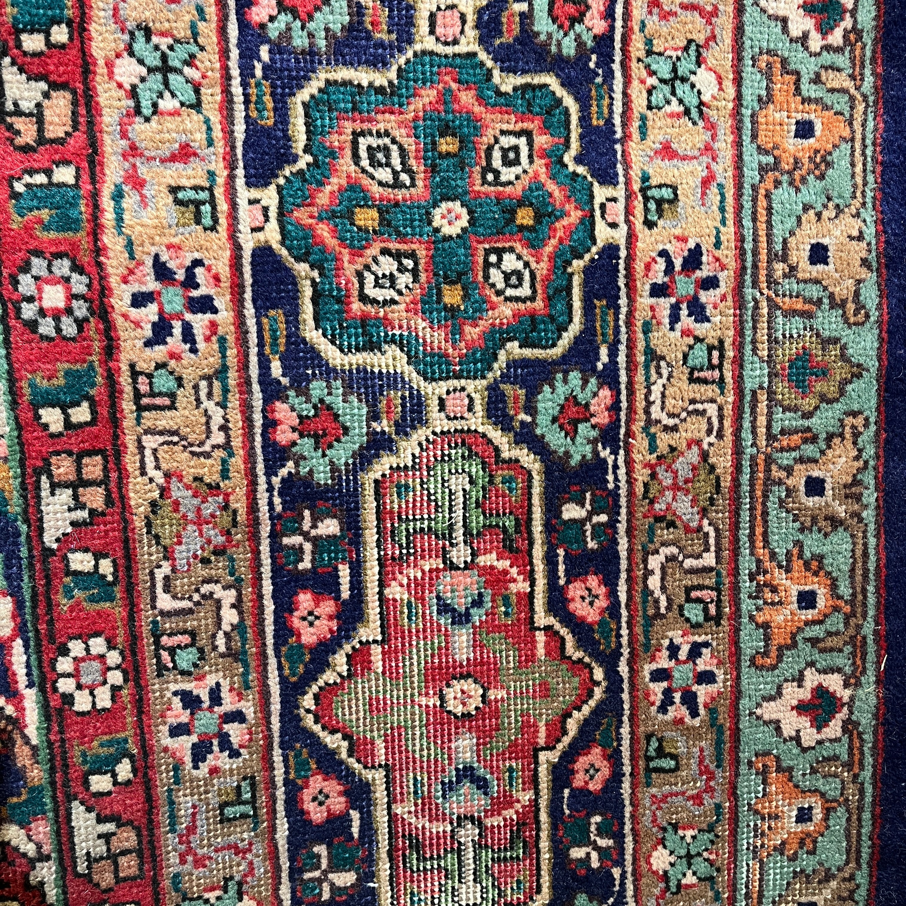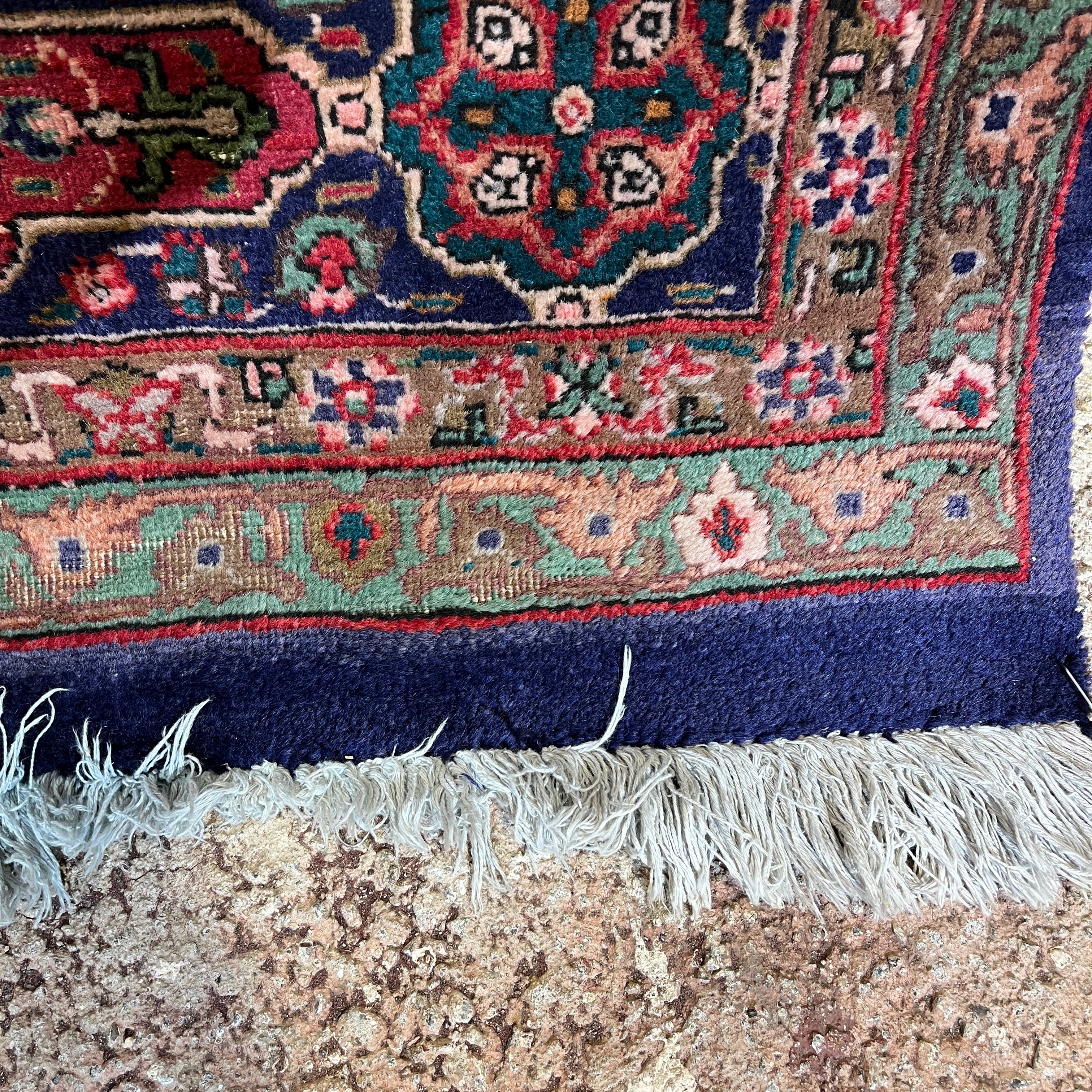 Espectacular alfombra Iraní de la región central, hecha de lana tejida y teñida a mano con tintes vegetales. La alfombra tiene un diseño de medallón floral en su centro, en el que predomina un tono de azul profundo que hace resaltar los decorados en motivos florales de su zona de "jardín", terminado en sus cuatro esquinas por un diseño geométrico color marfil. Las cenefas que bordean esta pieza, por su parte, son de color naranjo, azul, índigo y marfil, con motivos florales de colores.