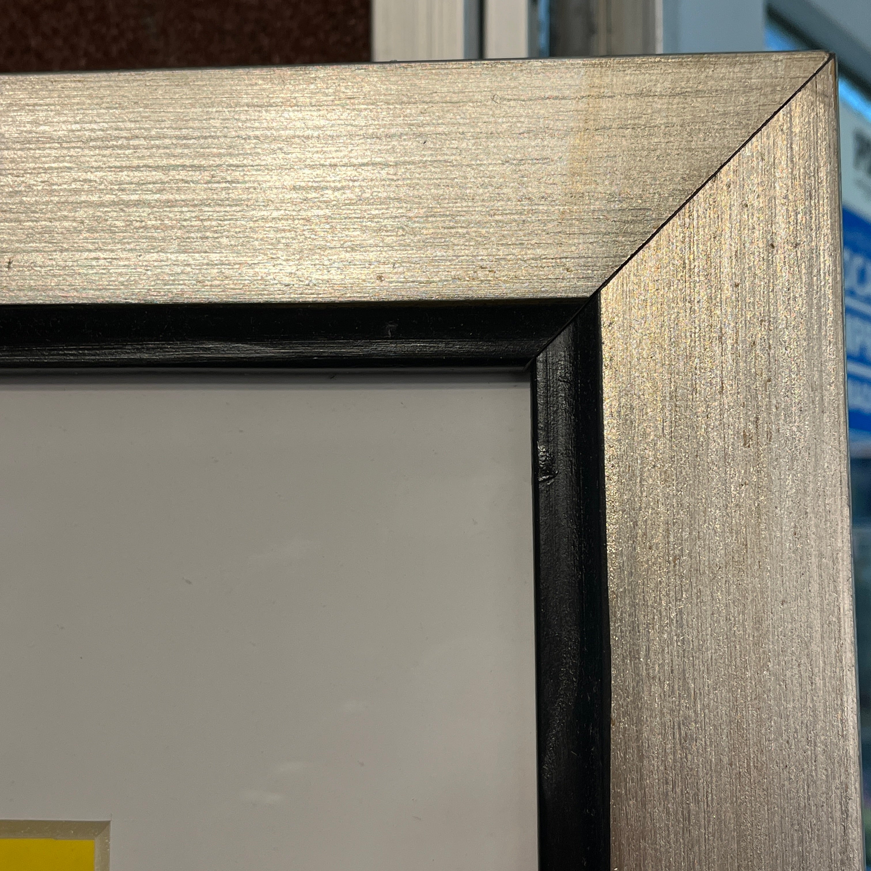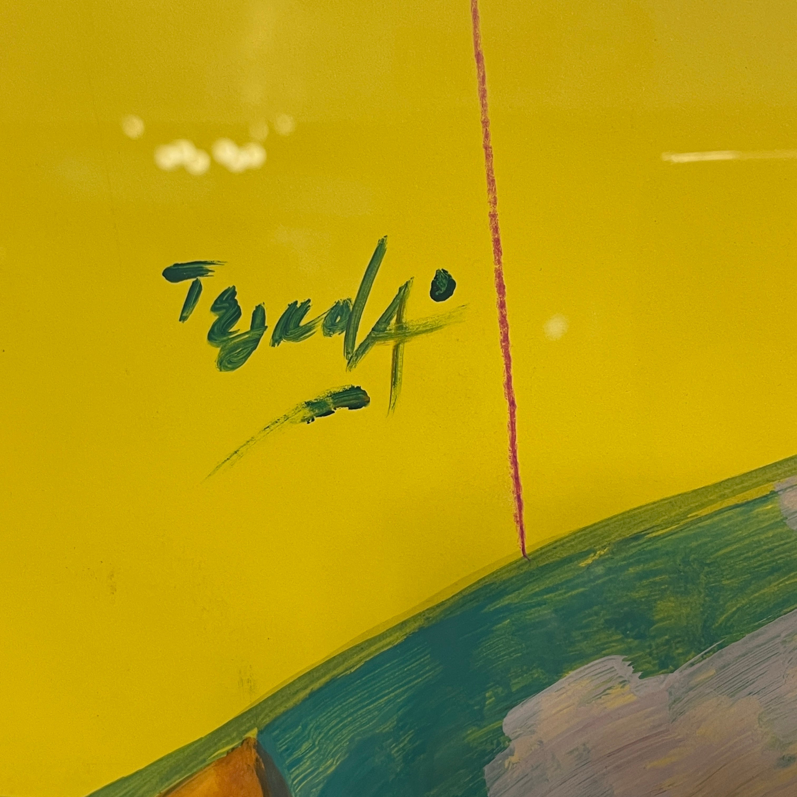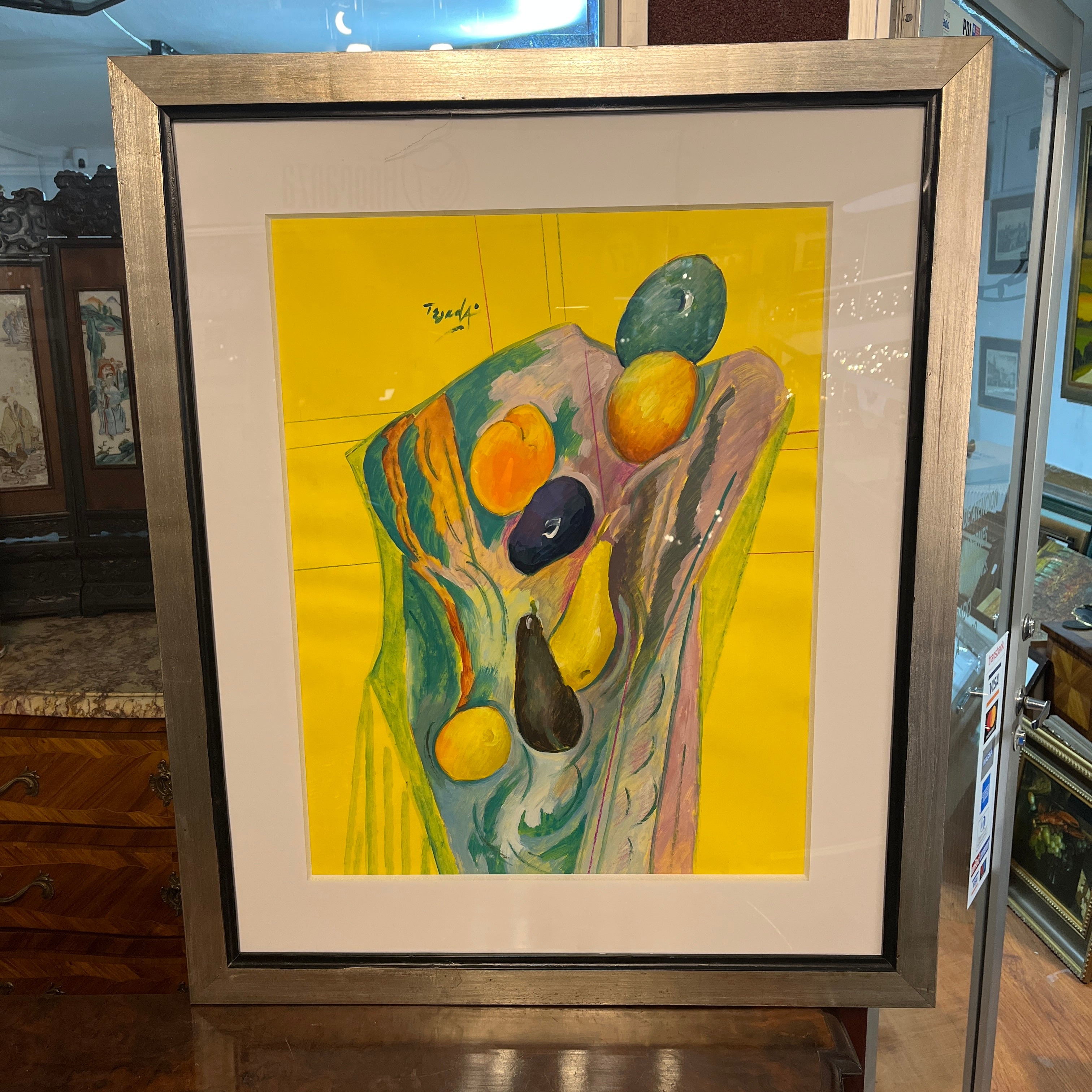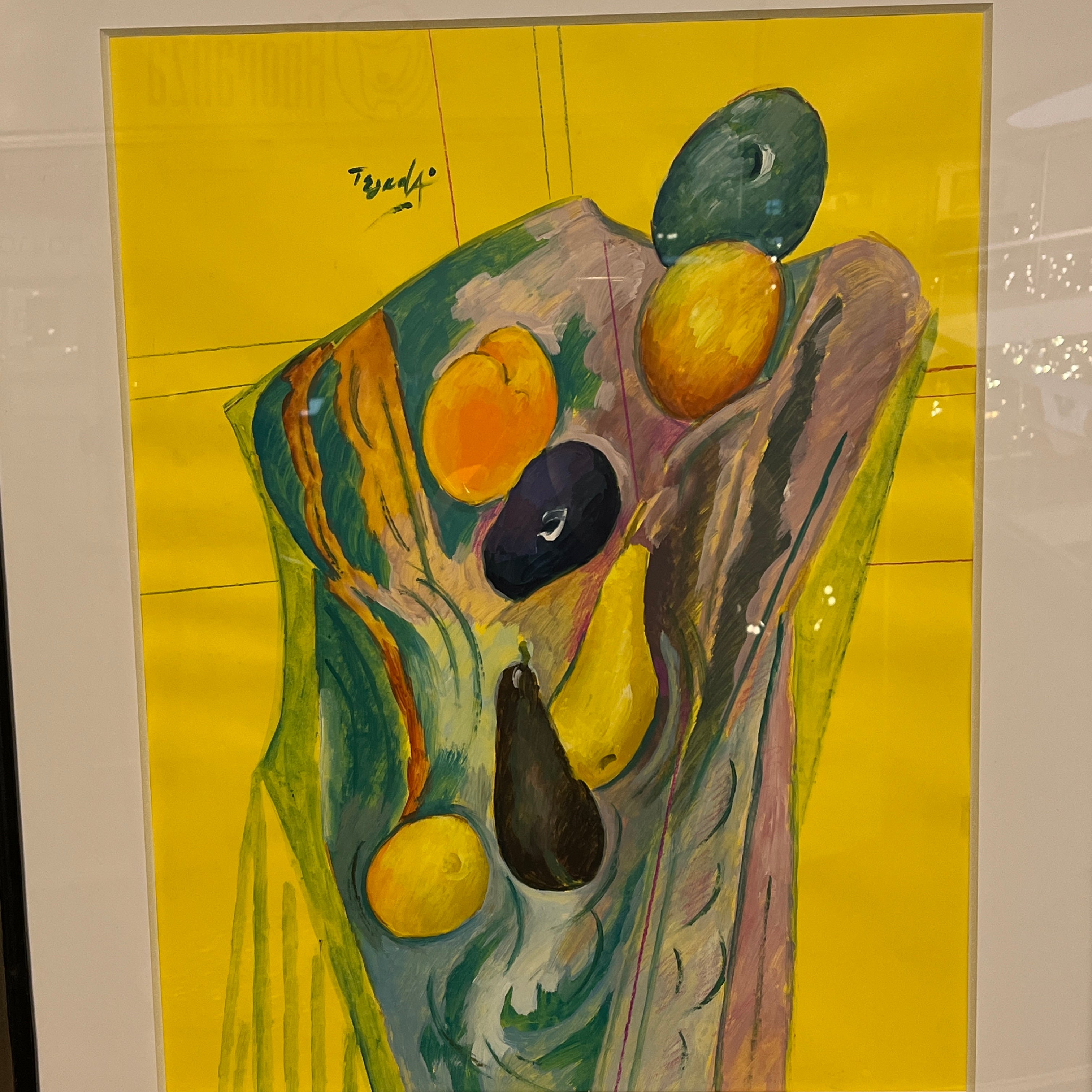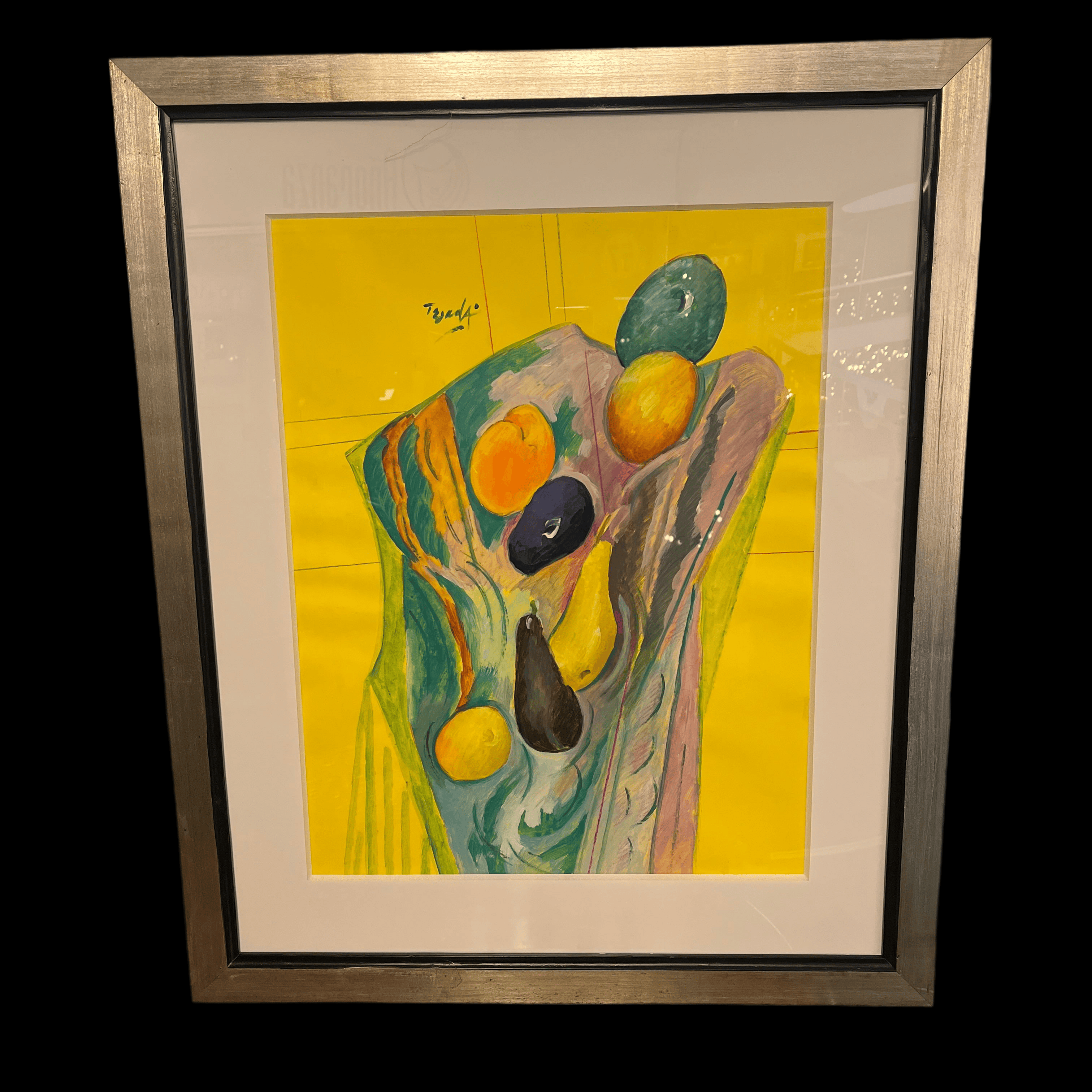 Óleo sobre papel del artista chileno Luis Tejada, representando un bodegón de frutas sobre un mantel  en tonos verdes y morados con un llamativo fondo amarillo. La obra es una interpretación del artista de una temática tan tradicional en la historia del arte, como es el bodegón, dándole su característica impronta de color y geometría. Otro elemento interesante es la proyección de líneas desde el dibujo, sugiriendo una especie de boceto o estudio de perspectiva existente debajo de la pintura. La obra está enmarcada en madera, de diseño sobrio y terminación plateada.