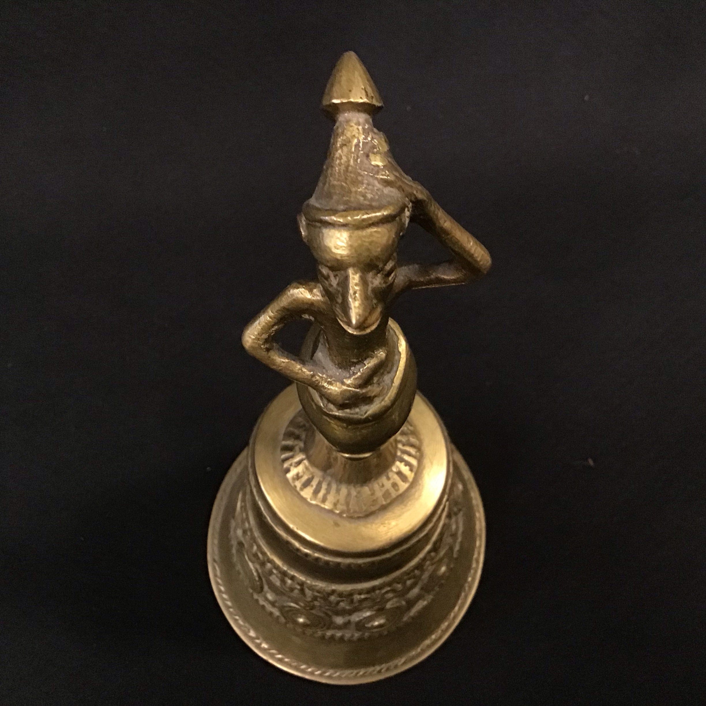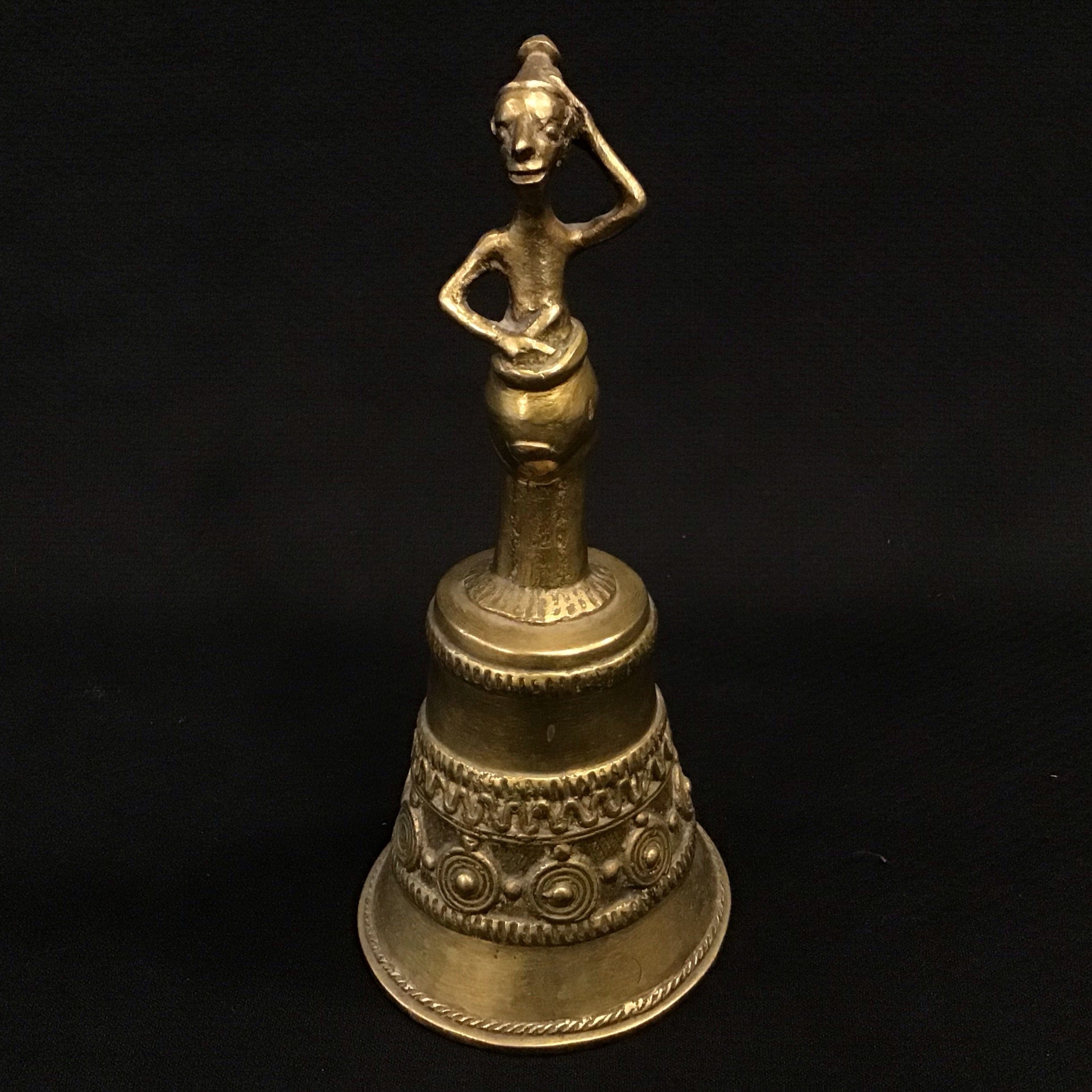 Campana de bronce con figura étnica en el mango. Cuenta con tallados geométricos en el cuerpo de la campana.