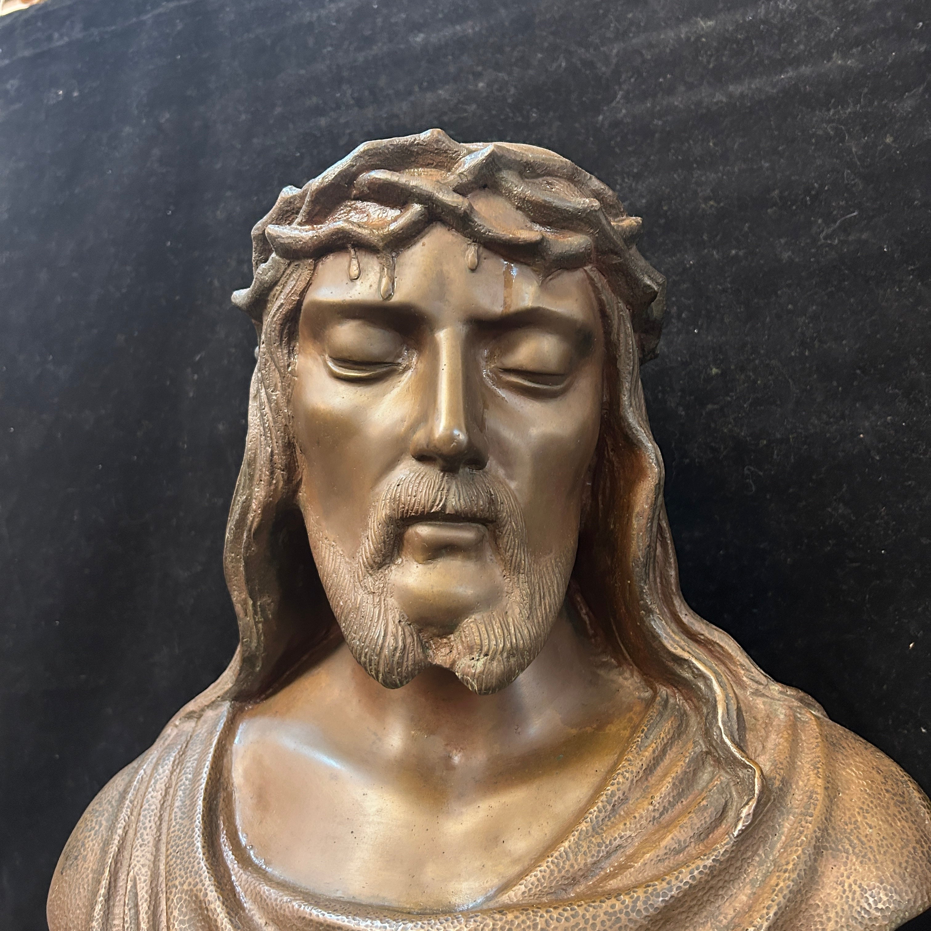 Emotivo busto de Cristo hecho en bronce con un rostro esculpido con detalles realistas. Sus ojos cerrados y rostro sereno choca con la corona de espinas y gotas que derrama por su frente. El busto trae en su base la inscripción: 'La beneficencia pública a Don Luís Lira Luco en reconocimiento de sus meritorios servicios, 1944'