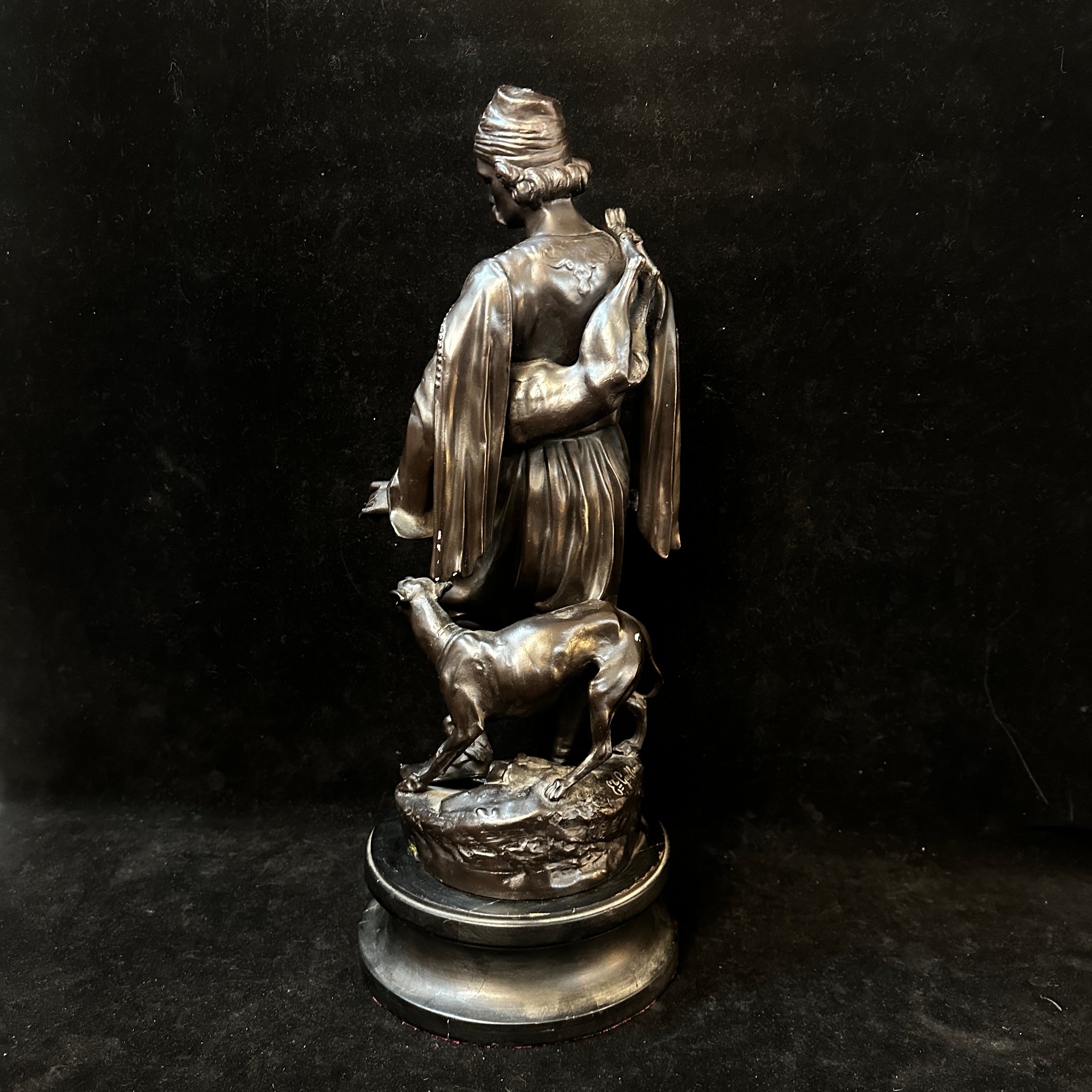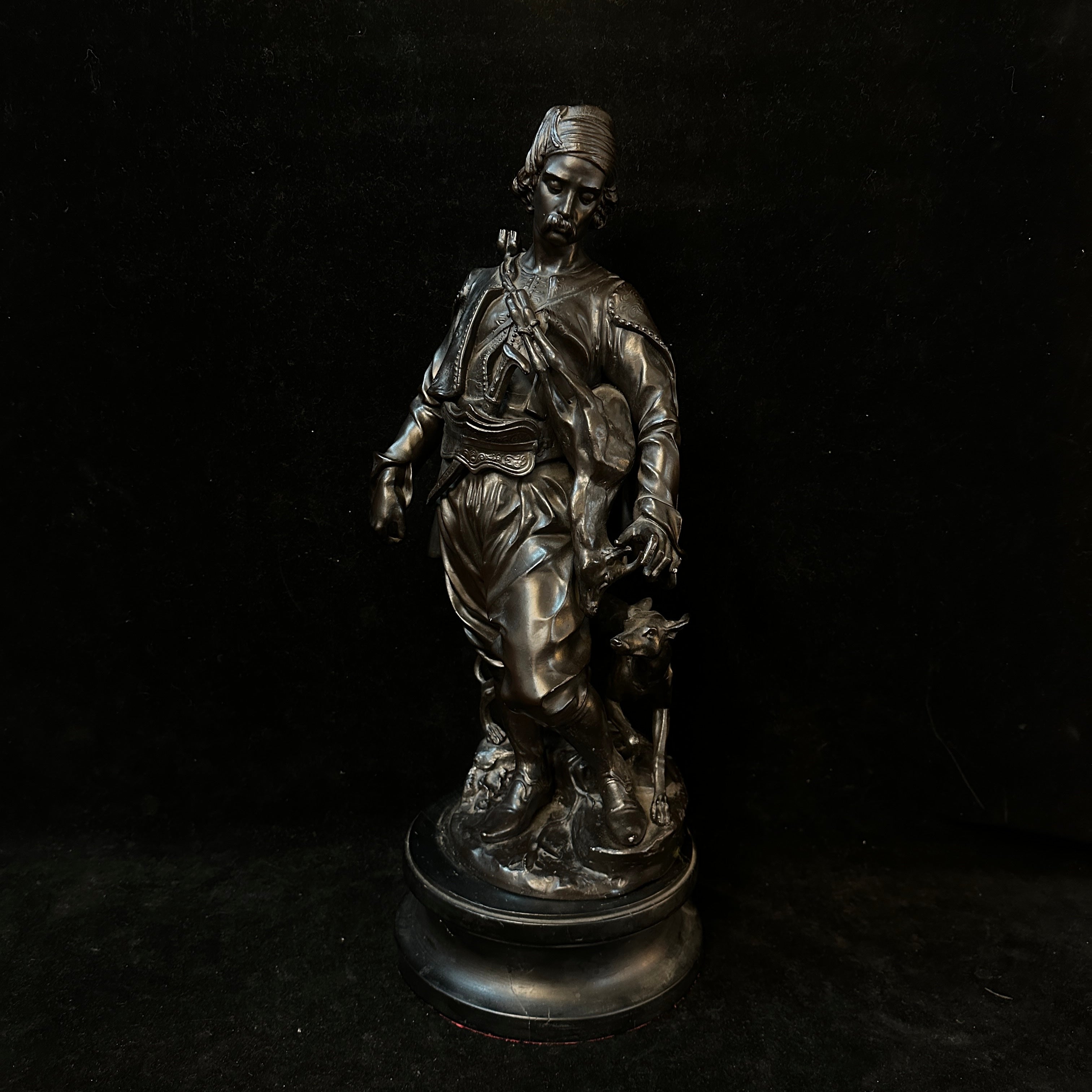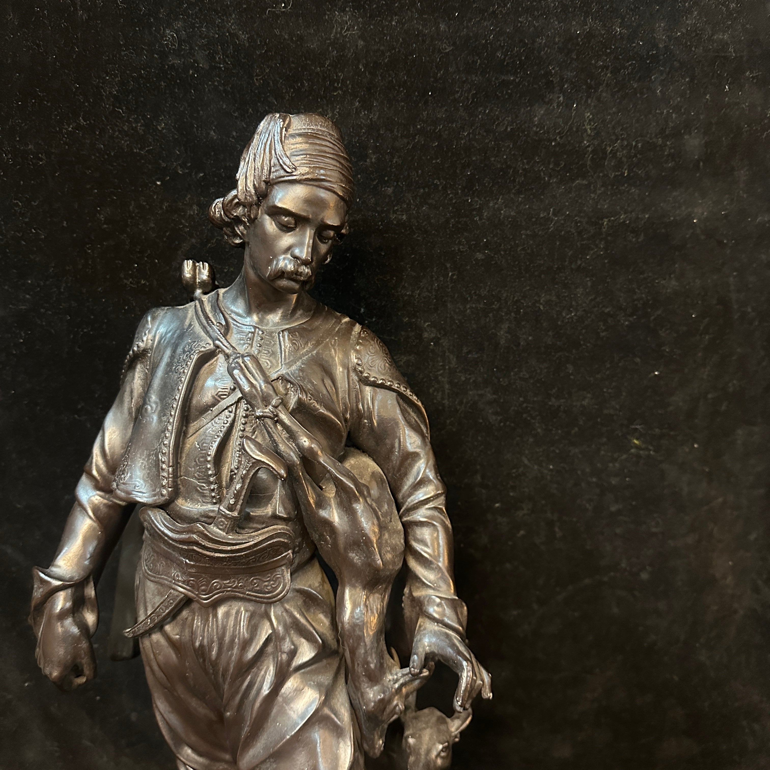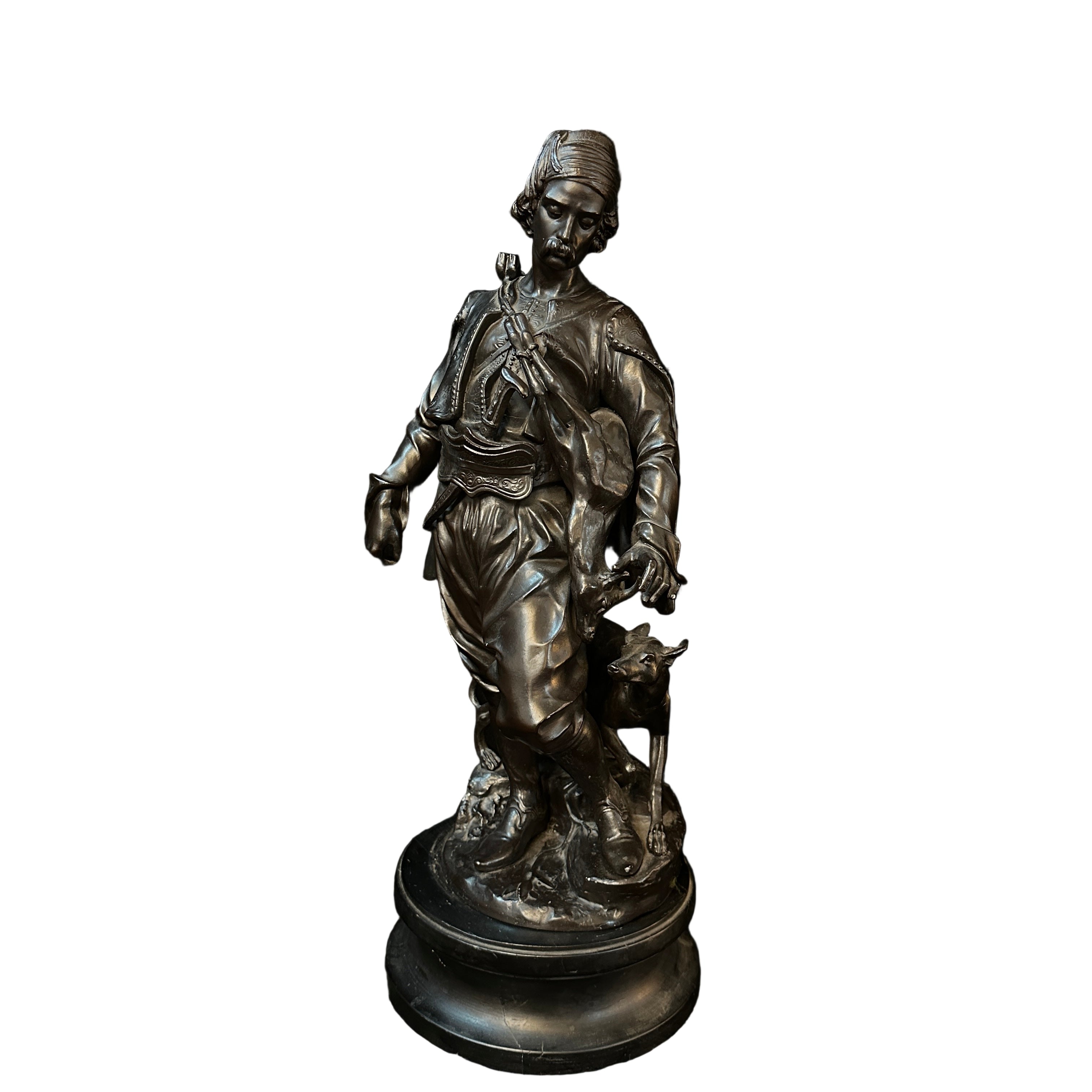 Imponente escultura de estaño de Émile-Coriolan Guillermin, escultor francés, que retrata a un cazador de Medio Oriente en movimiento, ataviado con vestimenta tradicional. Lleva una presa al hombro y camina junto a su perro, en una escena inspirada en los viajes de Guillemin a Oriente Medio y al norte de África para crear obras que reflejaban características antropológicas de las culturas locales.