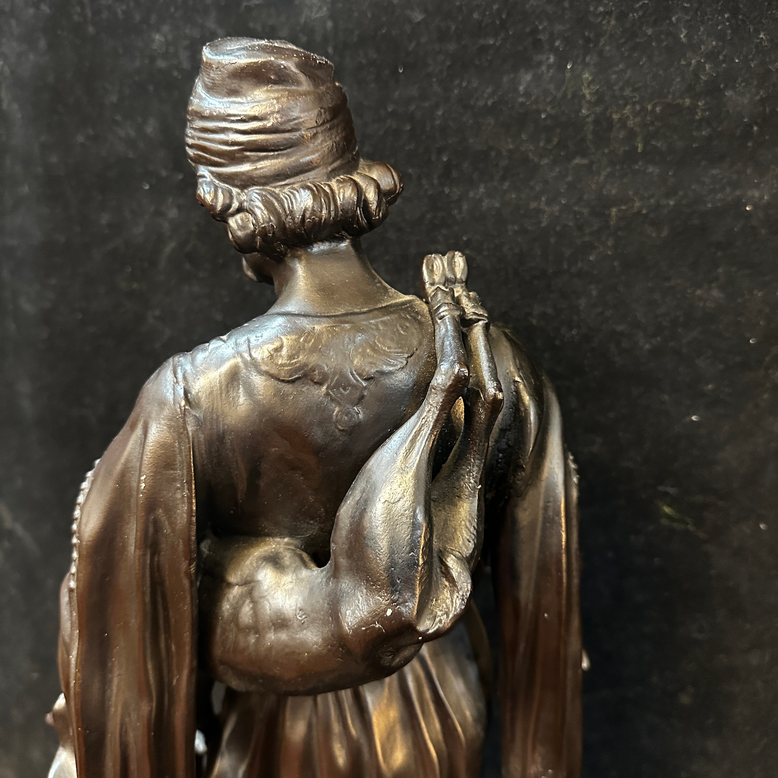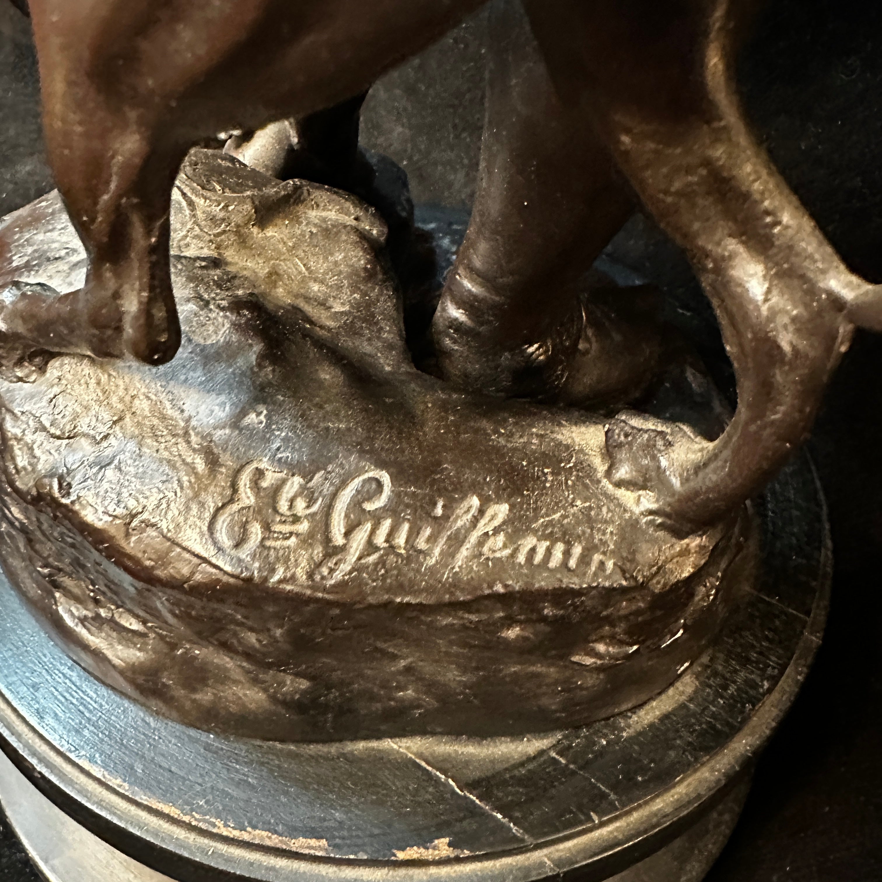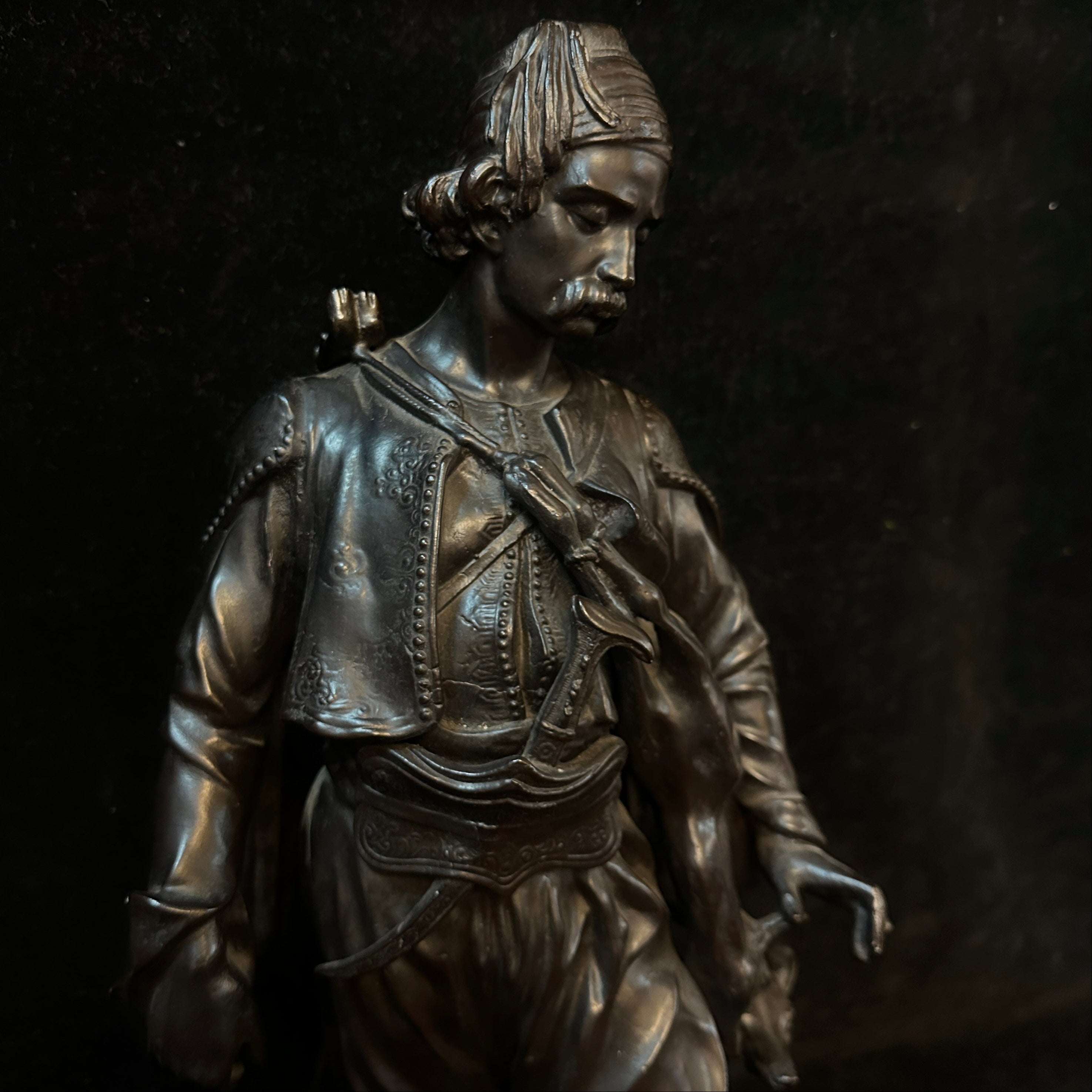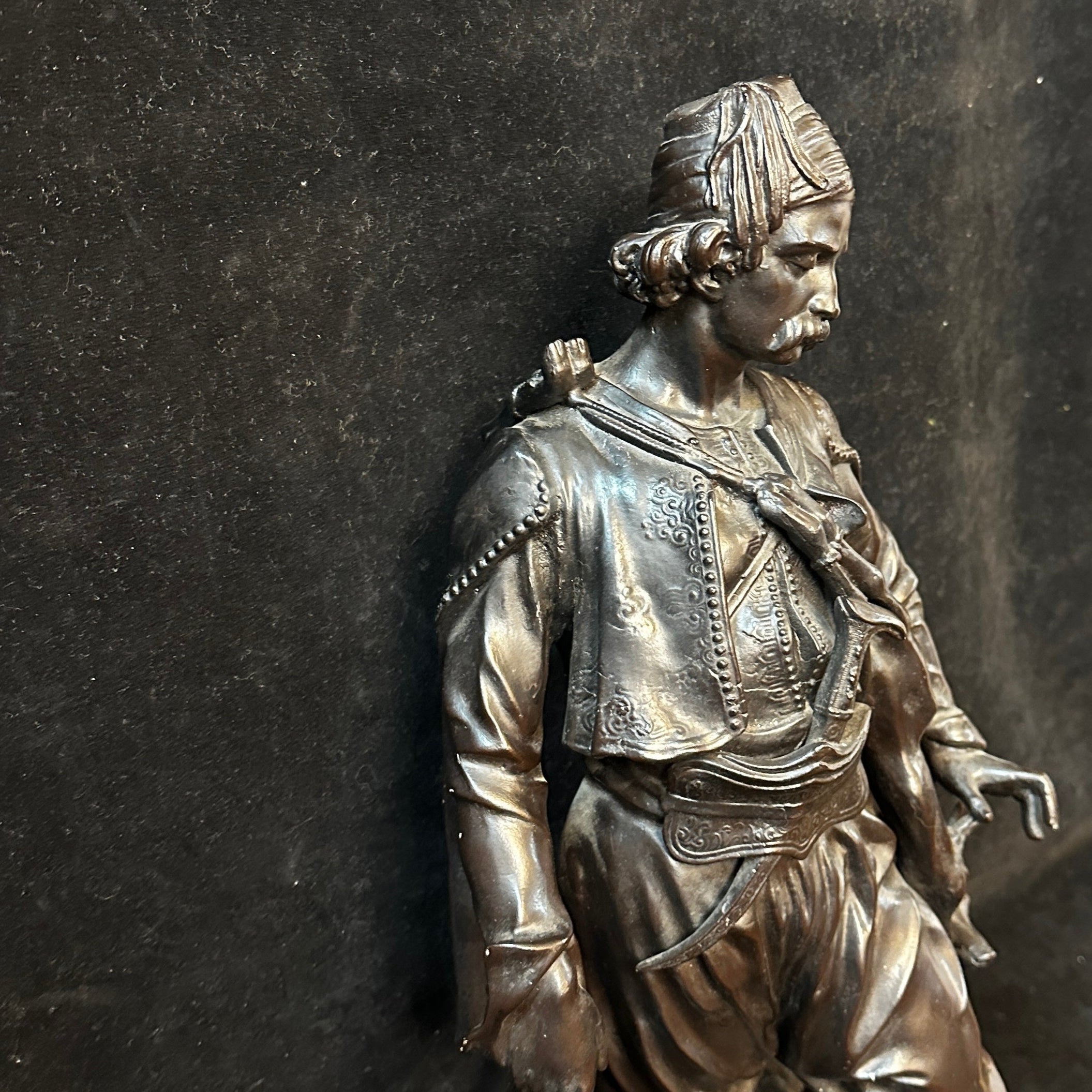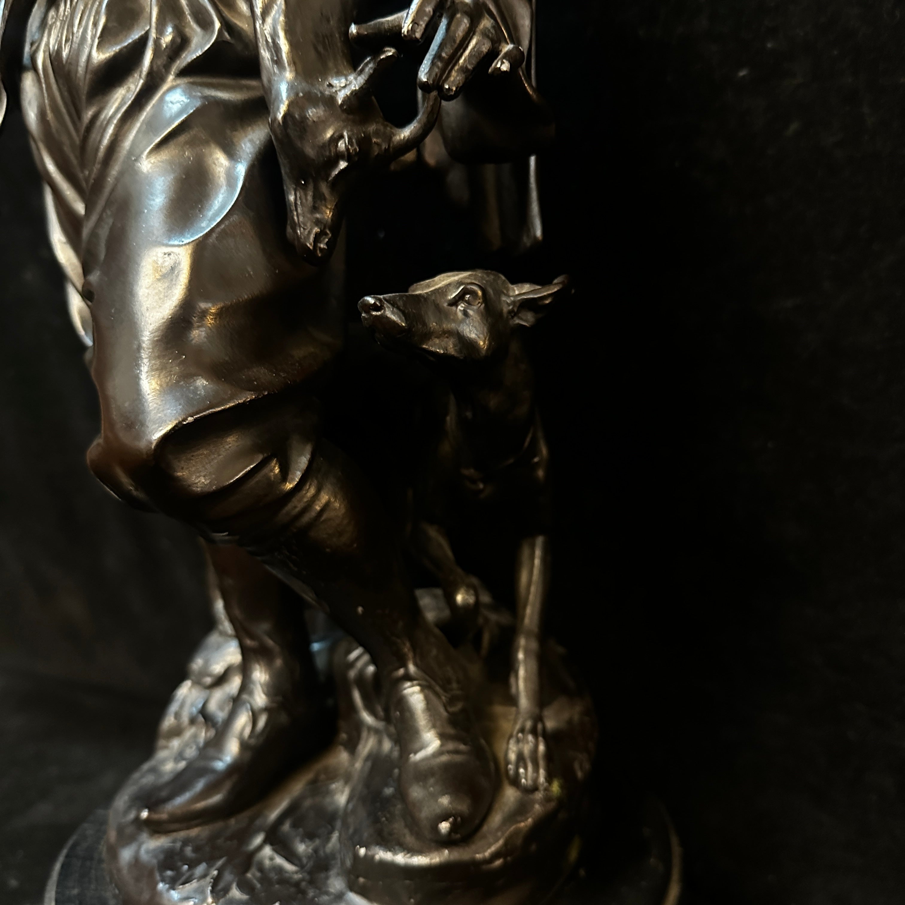 Imponente escultura de estaño de Émile-Coriolan Guillermin, escultor francés, que retrata a un cazador de Medio Oriente en movimiento, ataviado con vestimenta tradicional. Lleva una presa al hombro y camina junto a su perro, en una escena inspirada en los viajes de Guillemin a Oriente Medio y al norte de África para crear obras que reflejaban características antropológicas de las culturas locales.