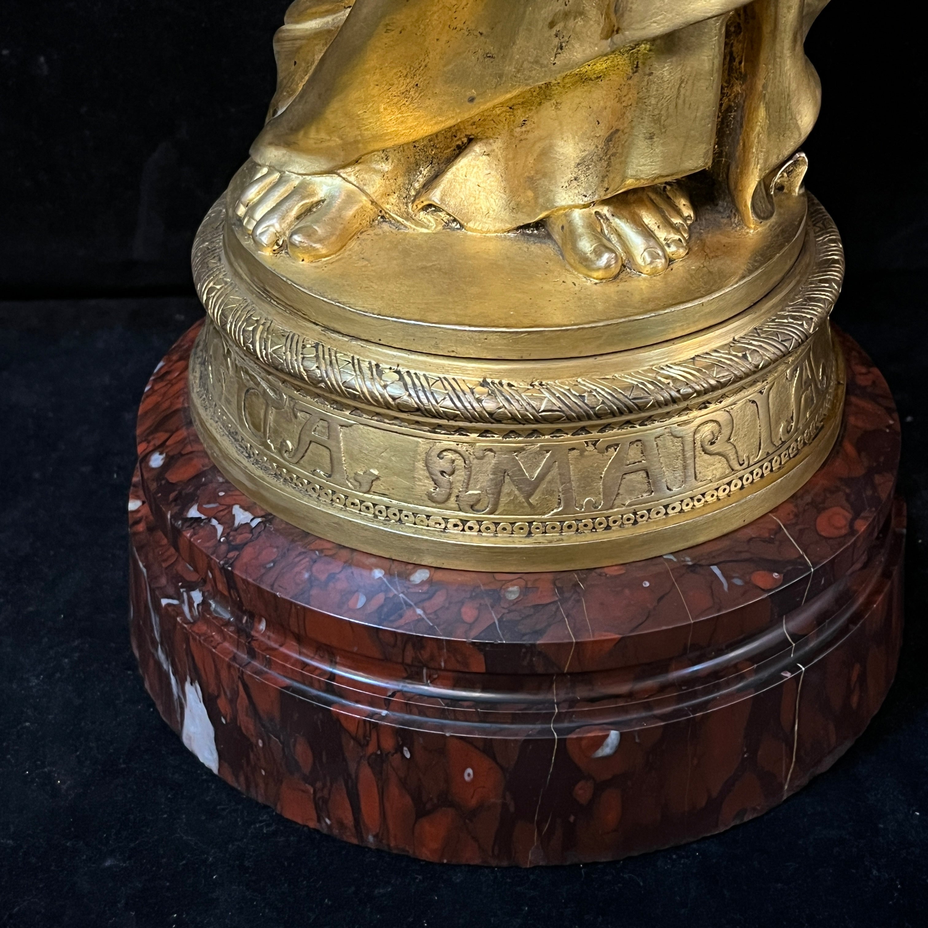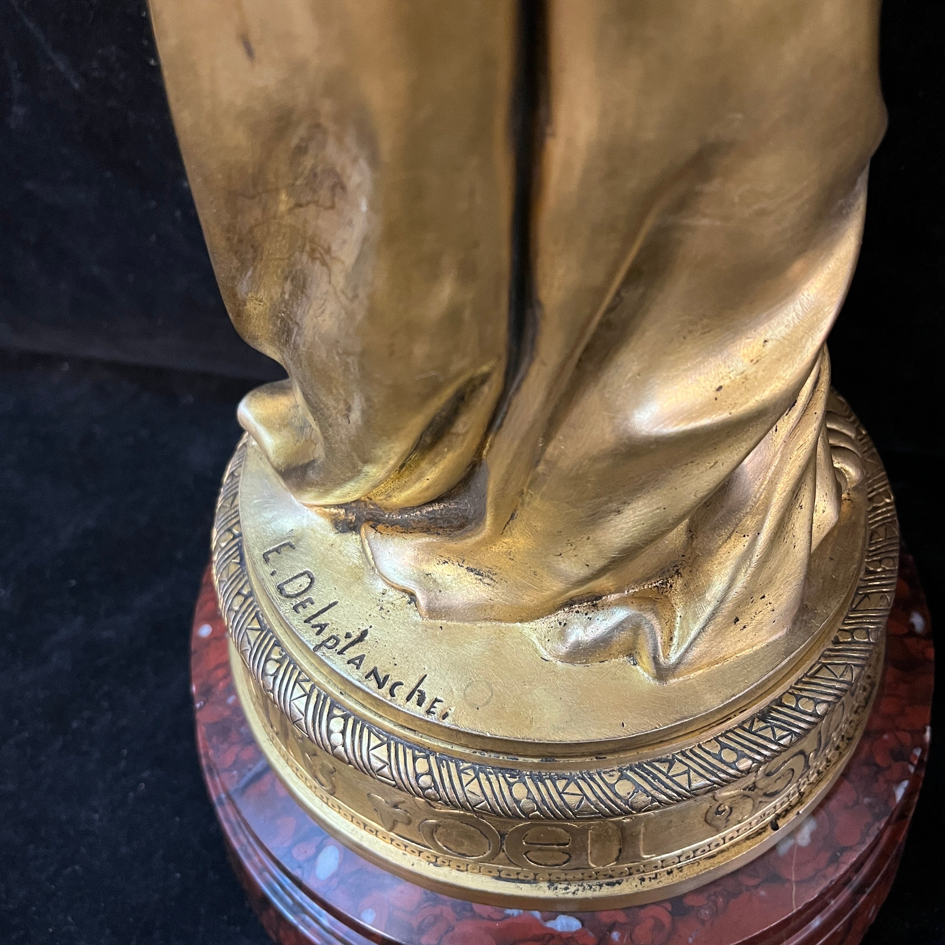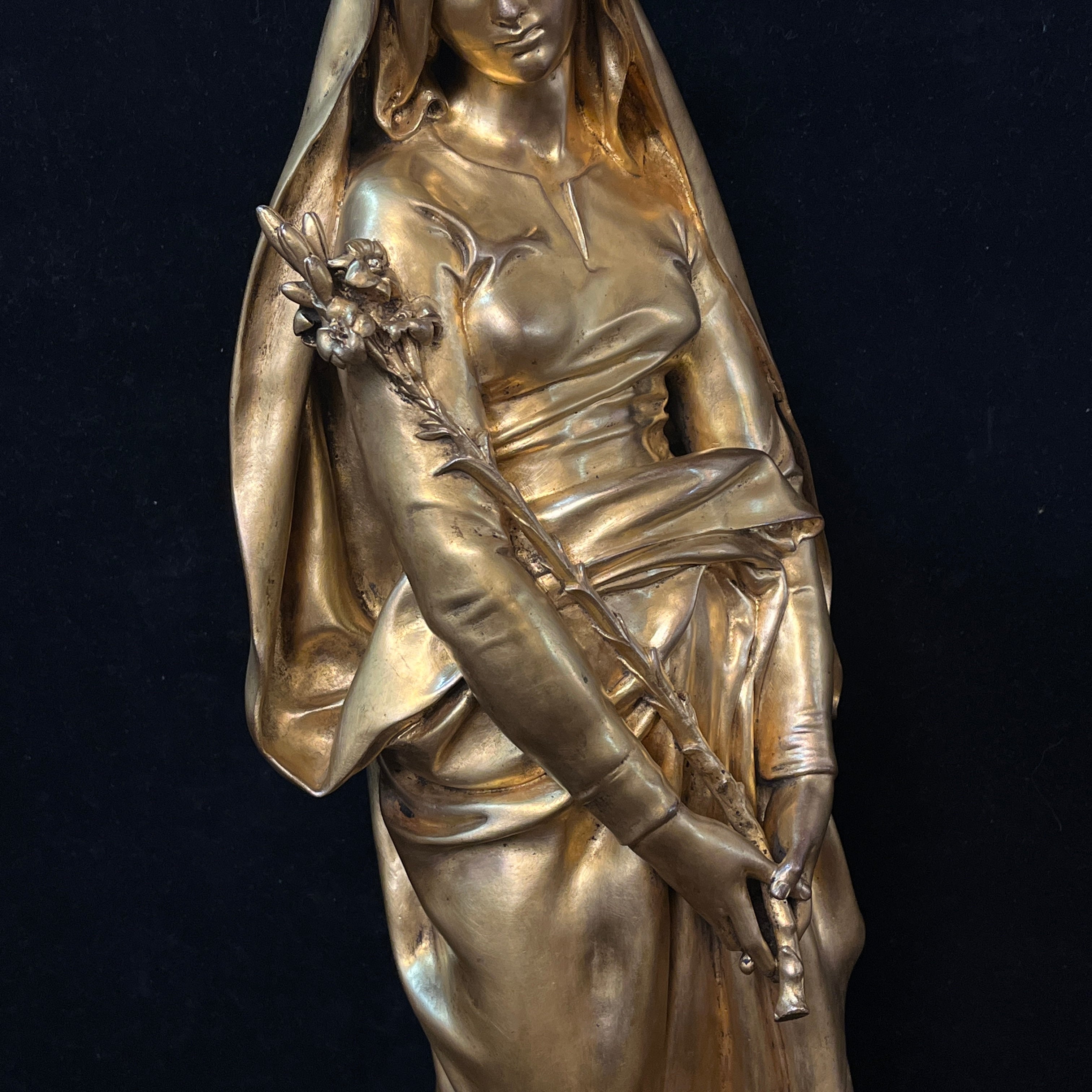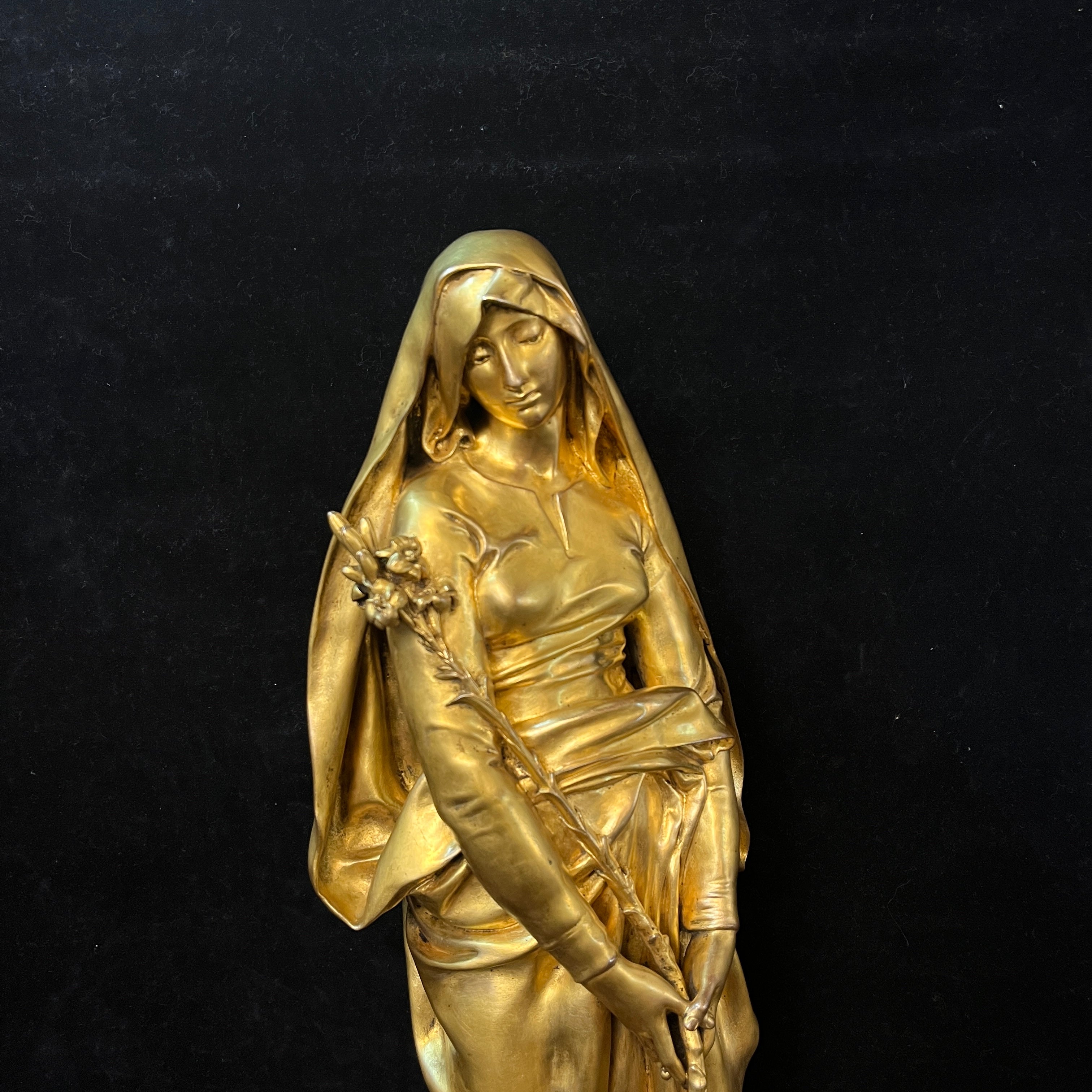Impactante escultura de bronce con base mármol de origen francés circa 1870, firmada por Eugène Delaplanche (1836-1891), reconocido escultor en la Francia del siglo XIX. Esta magnífica obra representa a una virgen, vestida con su manto de exhibersntes pliegues y con un ramo de lirios en sus manos. El gesto de la virgen es de una profunda sensibilidad y demuestra el gran oficio del artista en la manipulación del material para lograr las textura y caída de la tela. Su base es de mármol rojizo, con vetas negras y blancas. Un poco más arriba se lee “Santa Maria Mater”.