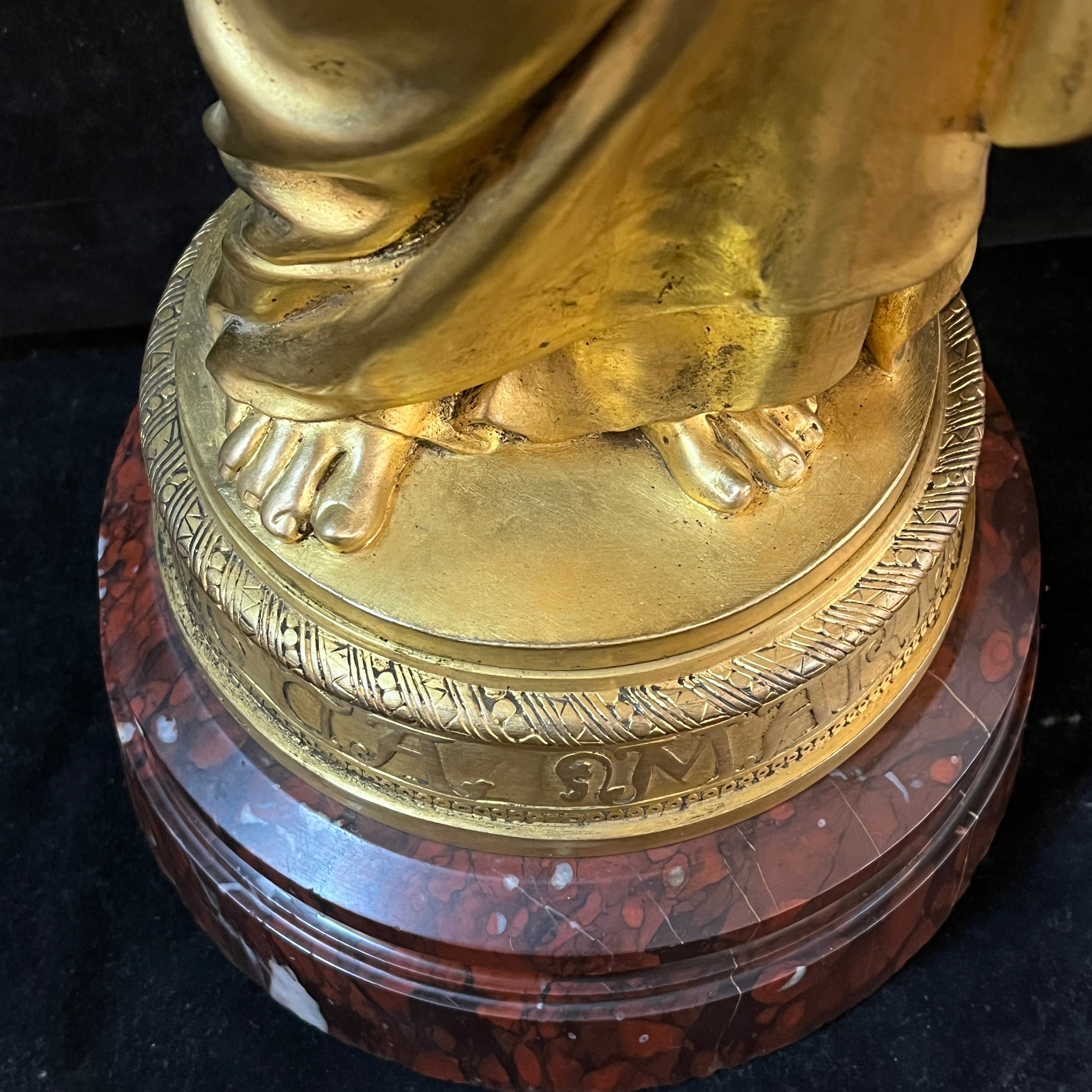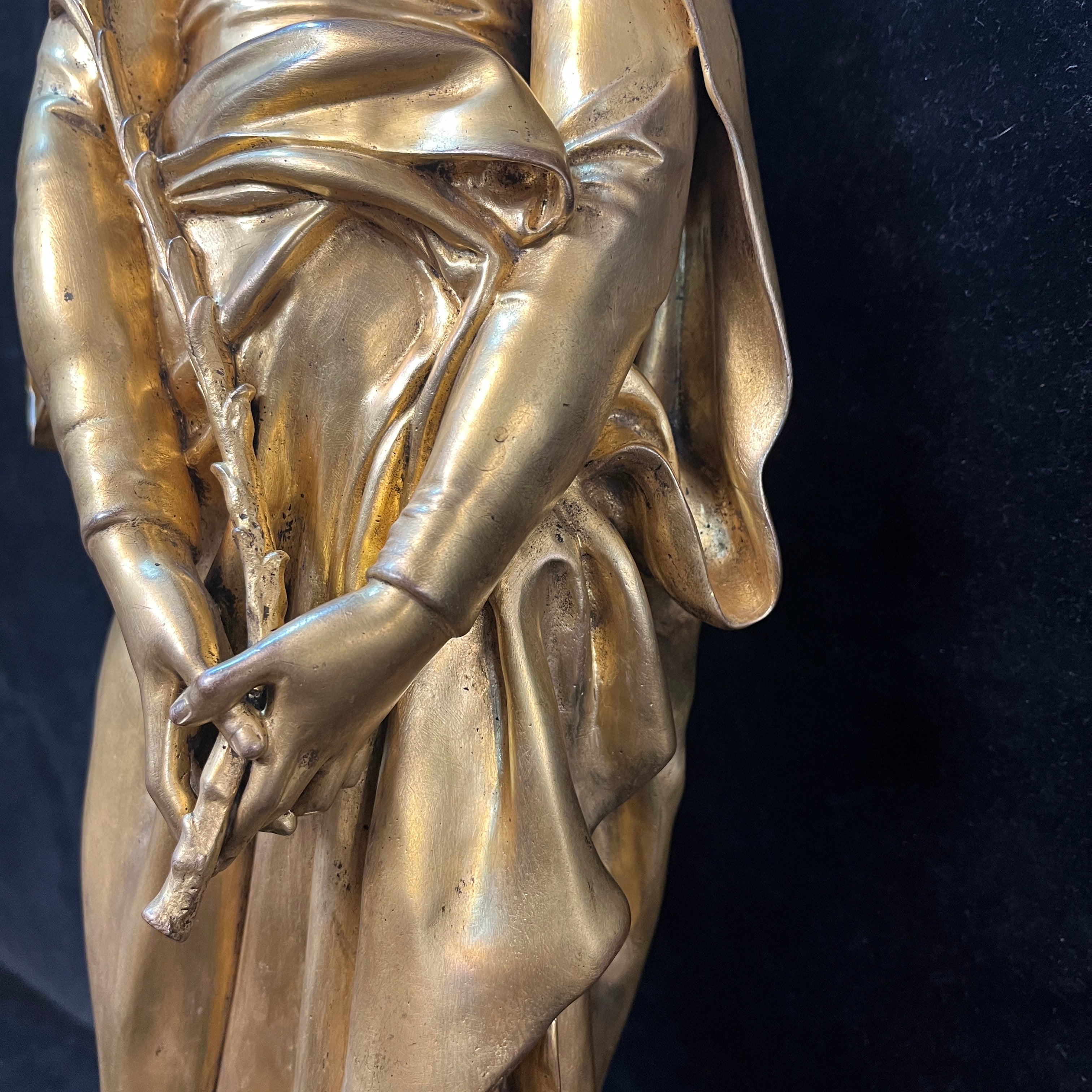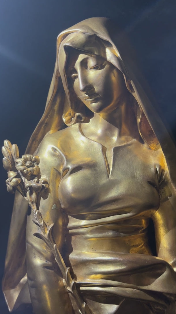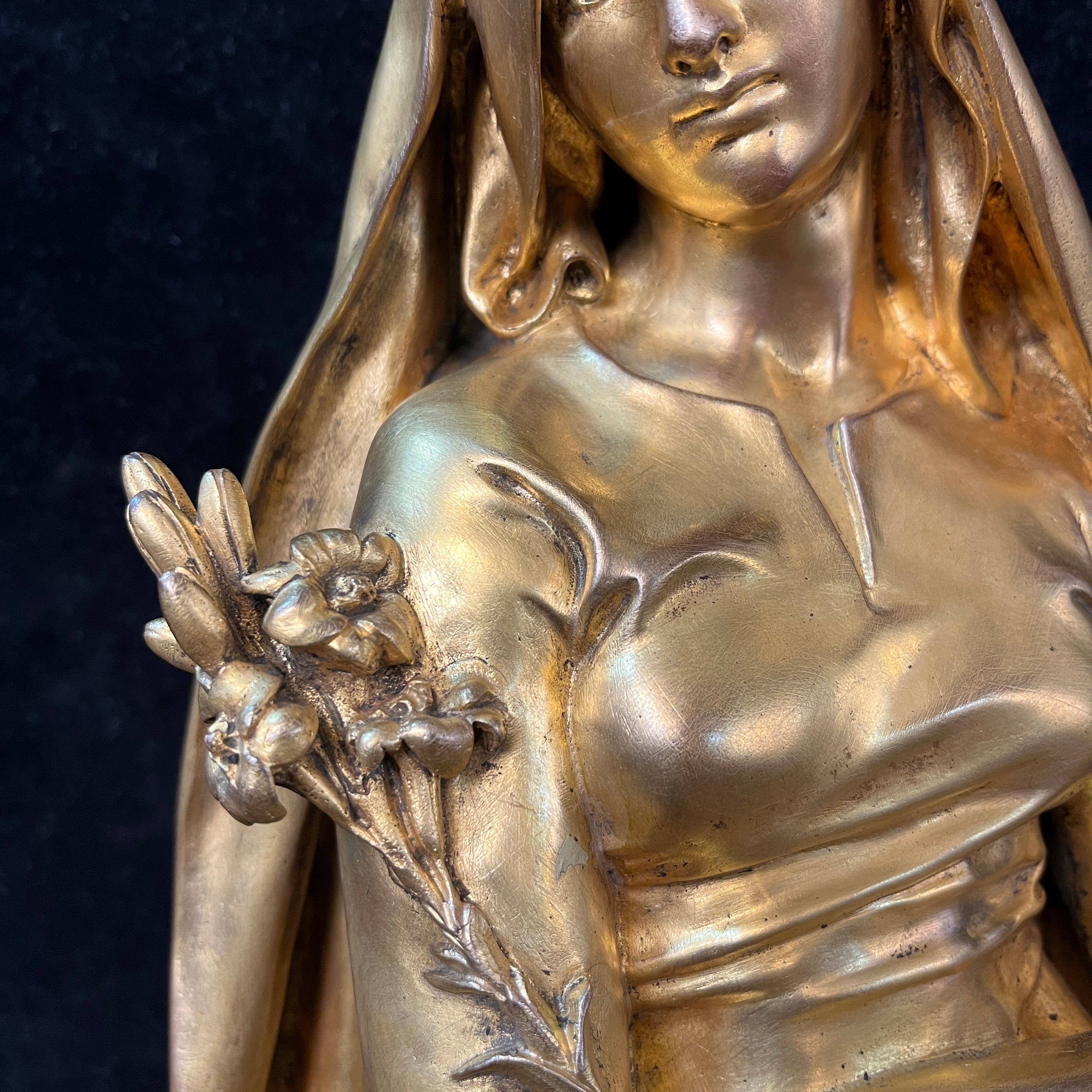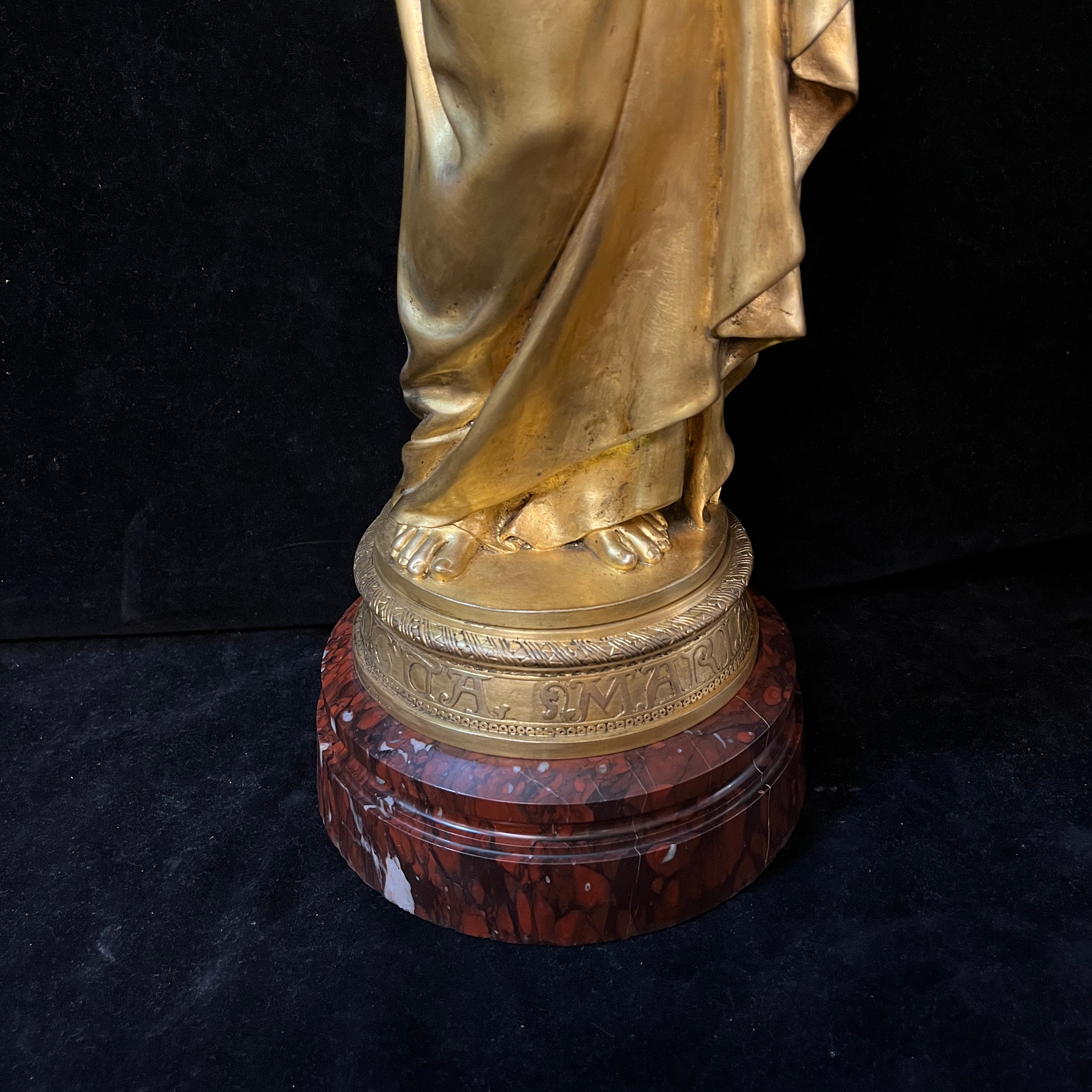 Impactante escultura de bronce con base mármol de origen francés circa 1870, firmada por Eugène Delaplanche (1836-1891), reconocido escultor en la Francia del siglo XIX. Esta magnífica obra representa a una virgen, vestida con su manto de exhibersntes pliegues y con un ramo de lirios en sus manos. El gesto de la virgen es de una profunda sensibilidad y demuestra el gran oficio del artista en la manipulación del material para lograr las textura y caída de la tela. Su base es de mármol rojizo, con vetas negras y blancas. Un poco más arriba se lee “Santa Maria Mater”.