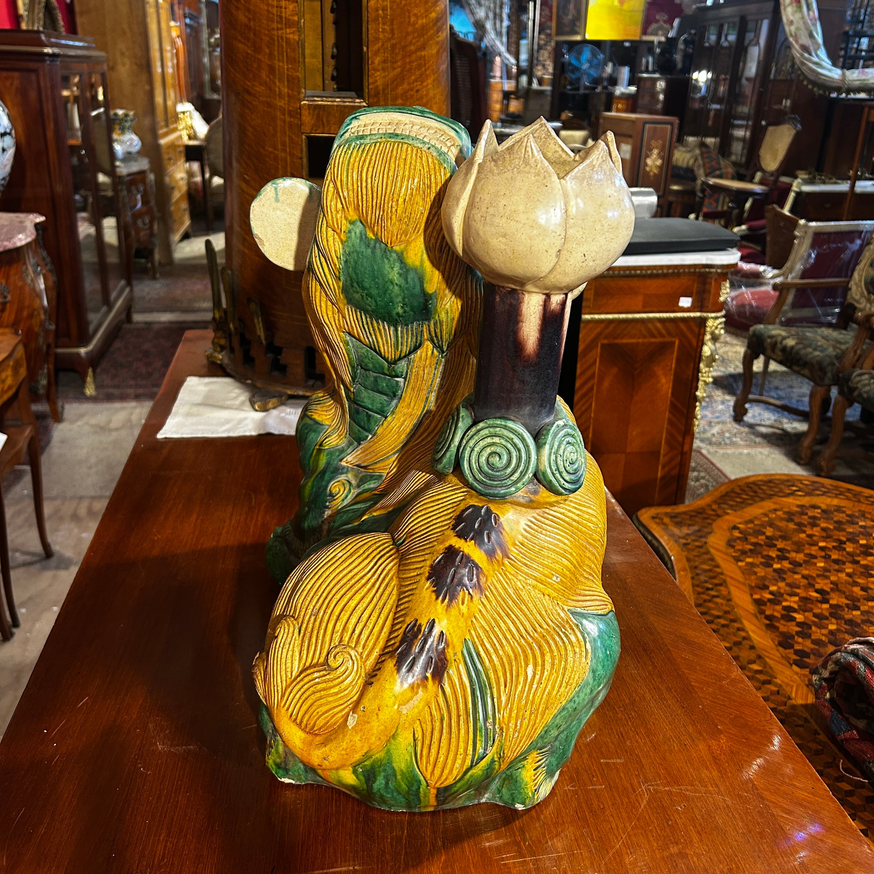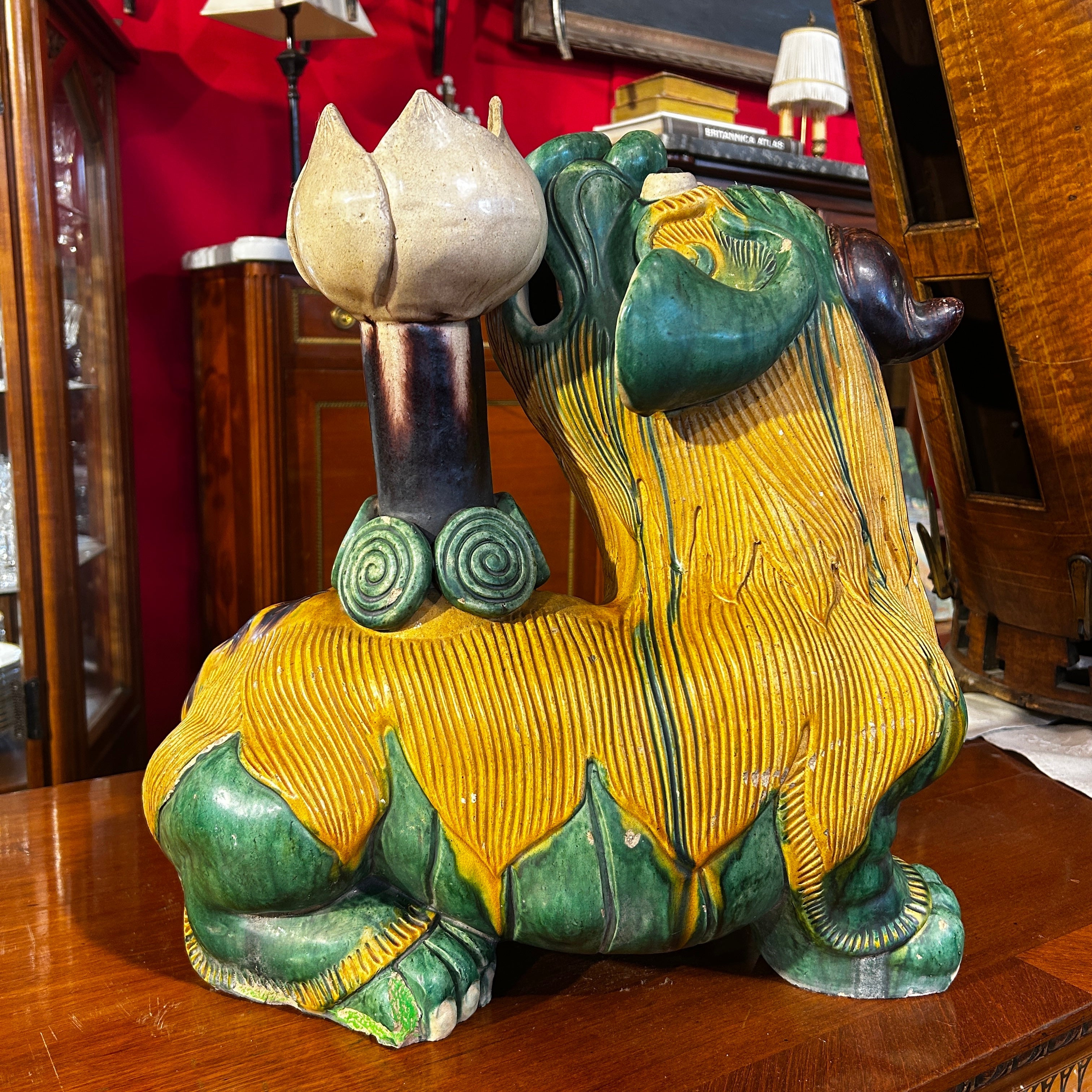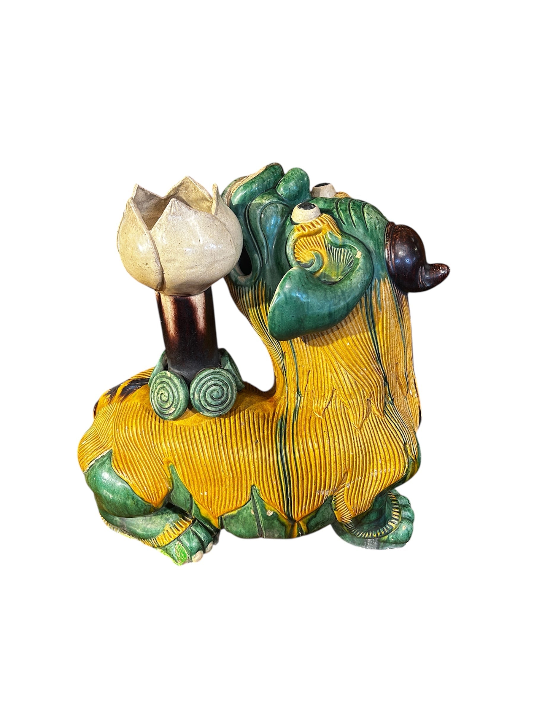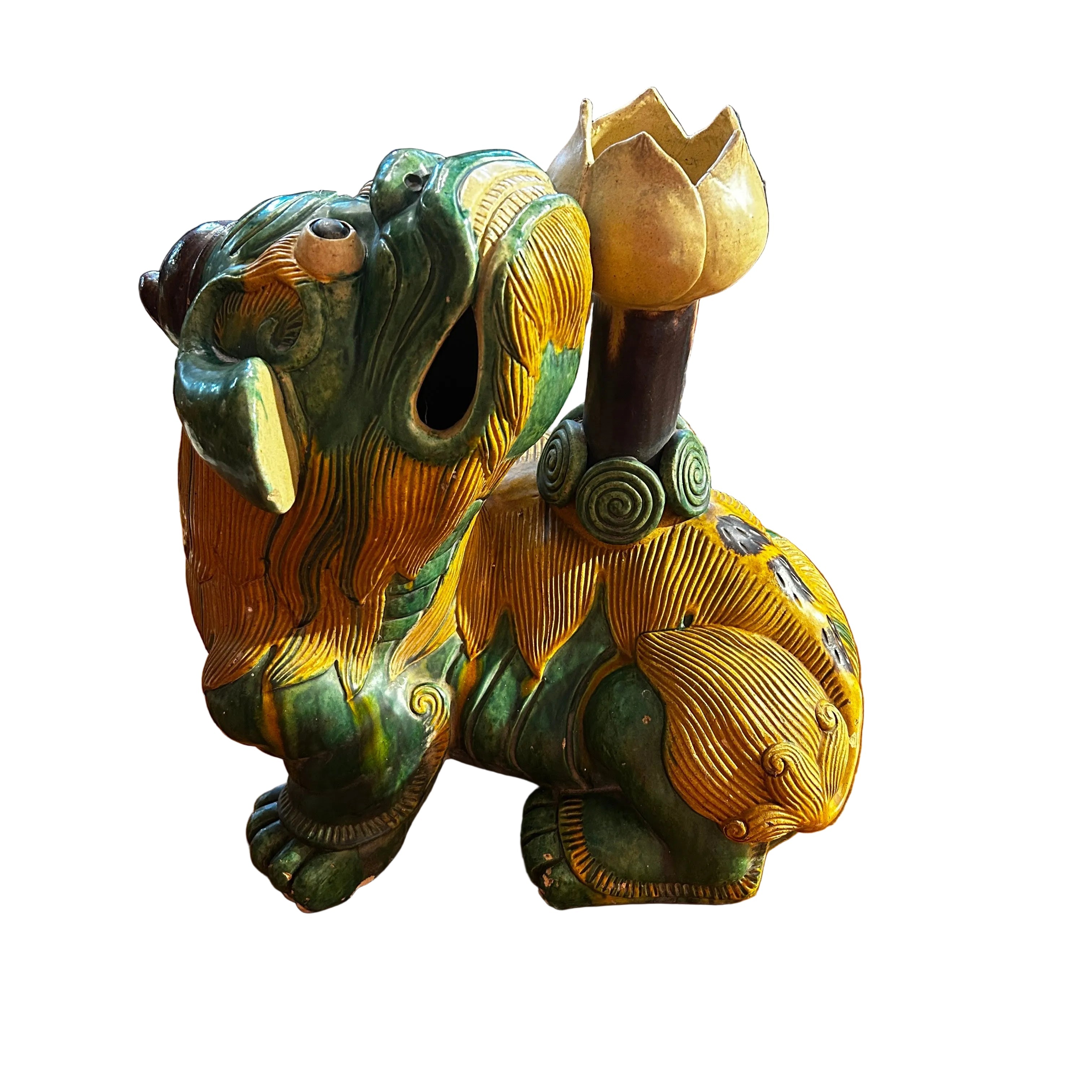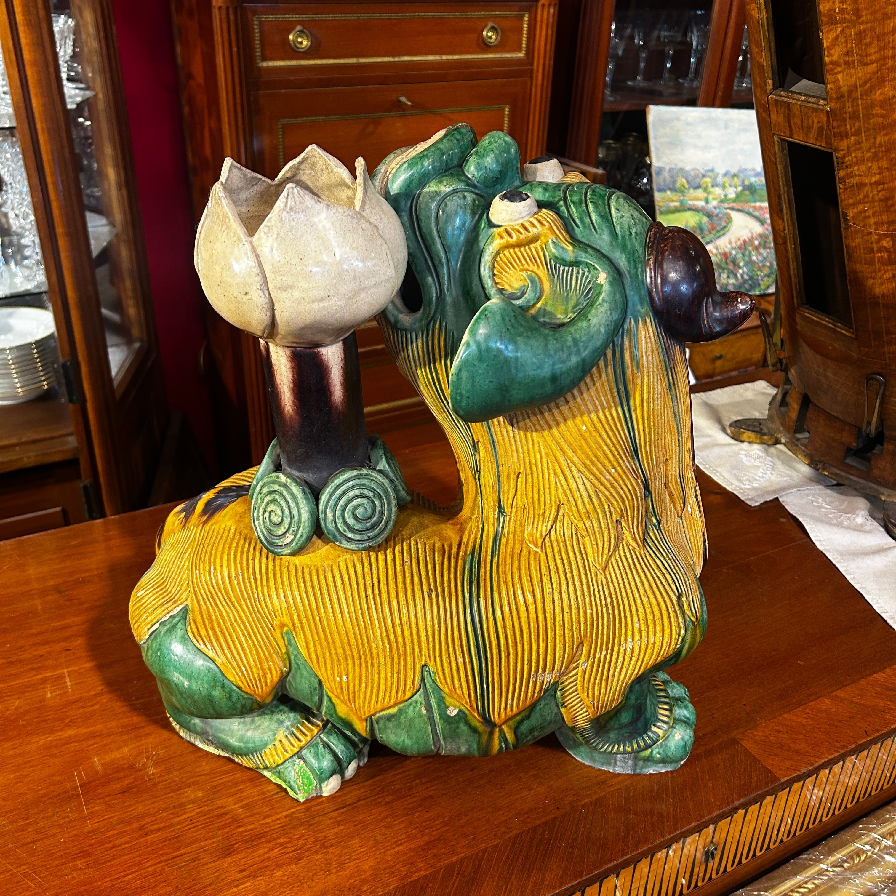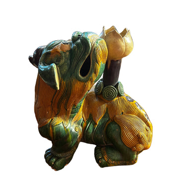 Figura cerámica esmaltada china perro Fo con flor de loto